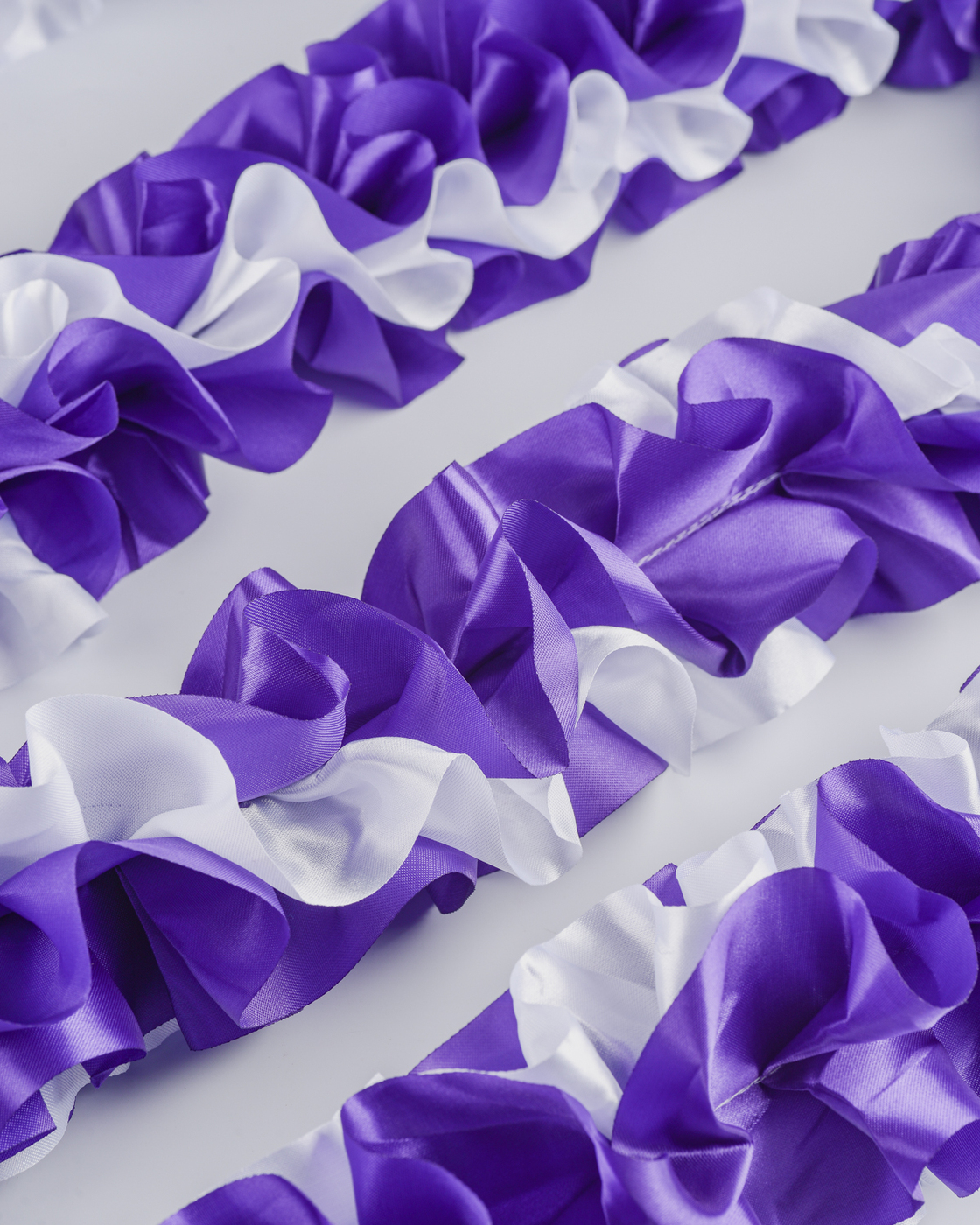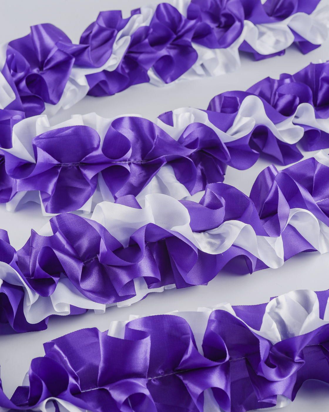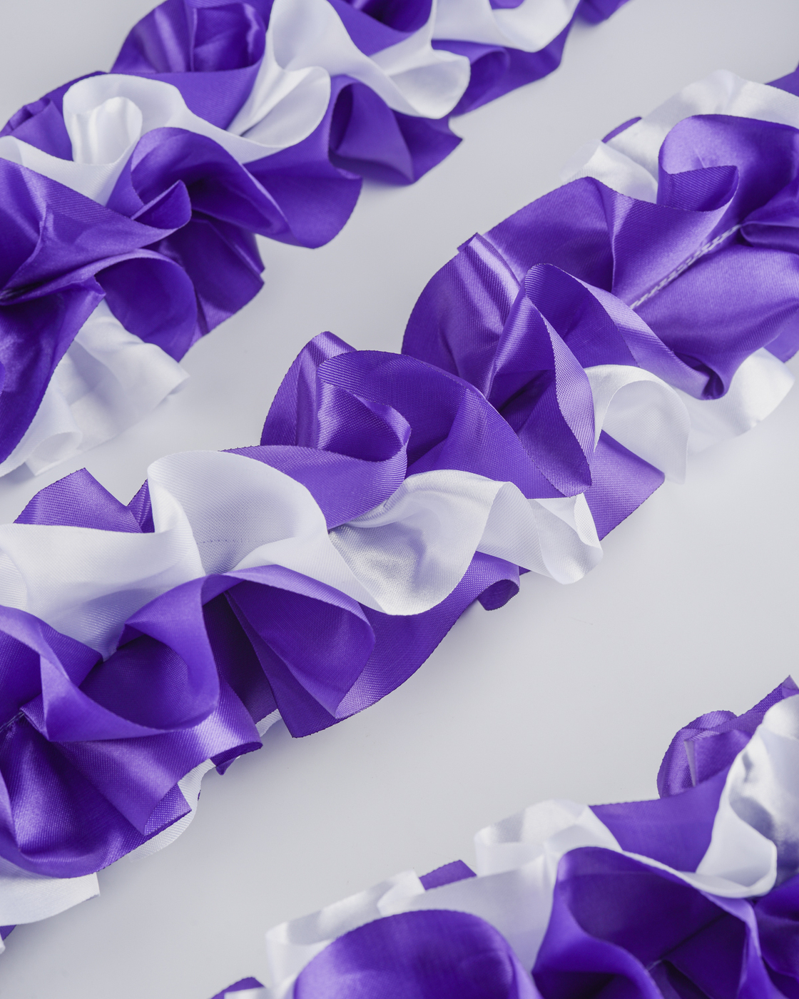 Двухцветная лента - рюш в фиолетовых и белых оттенках, из атласной ленты на капот свадебного авто, 3 метра