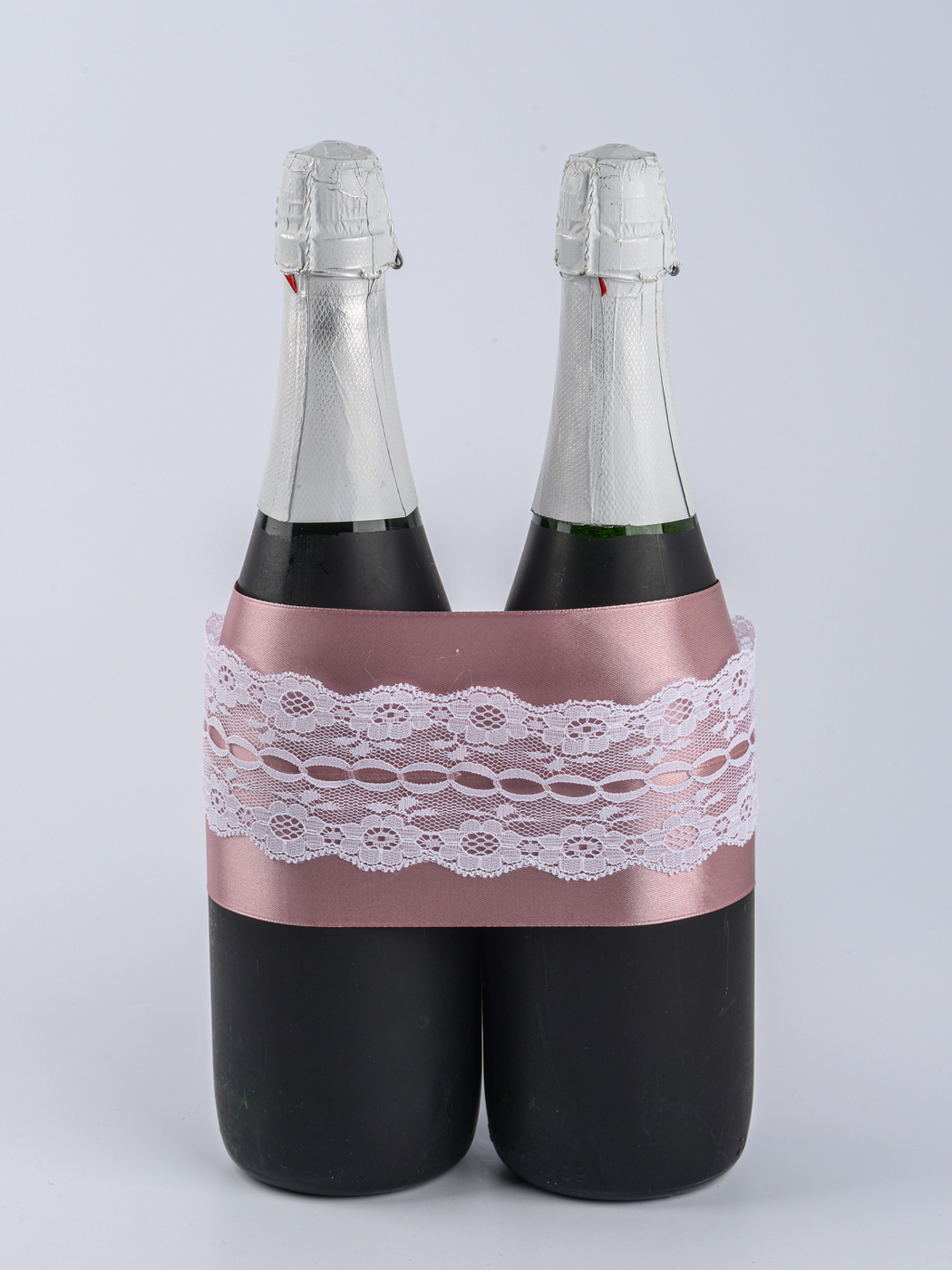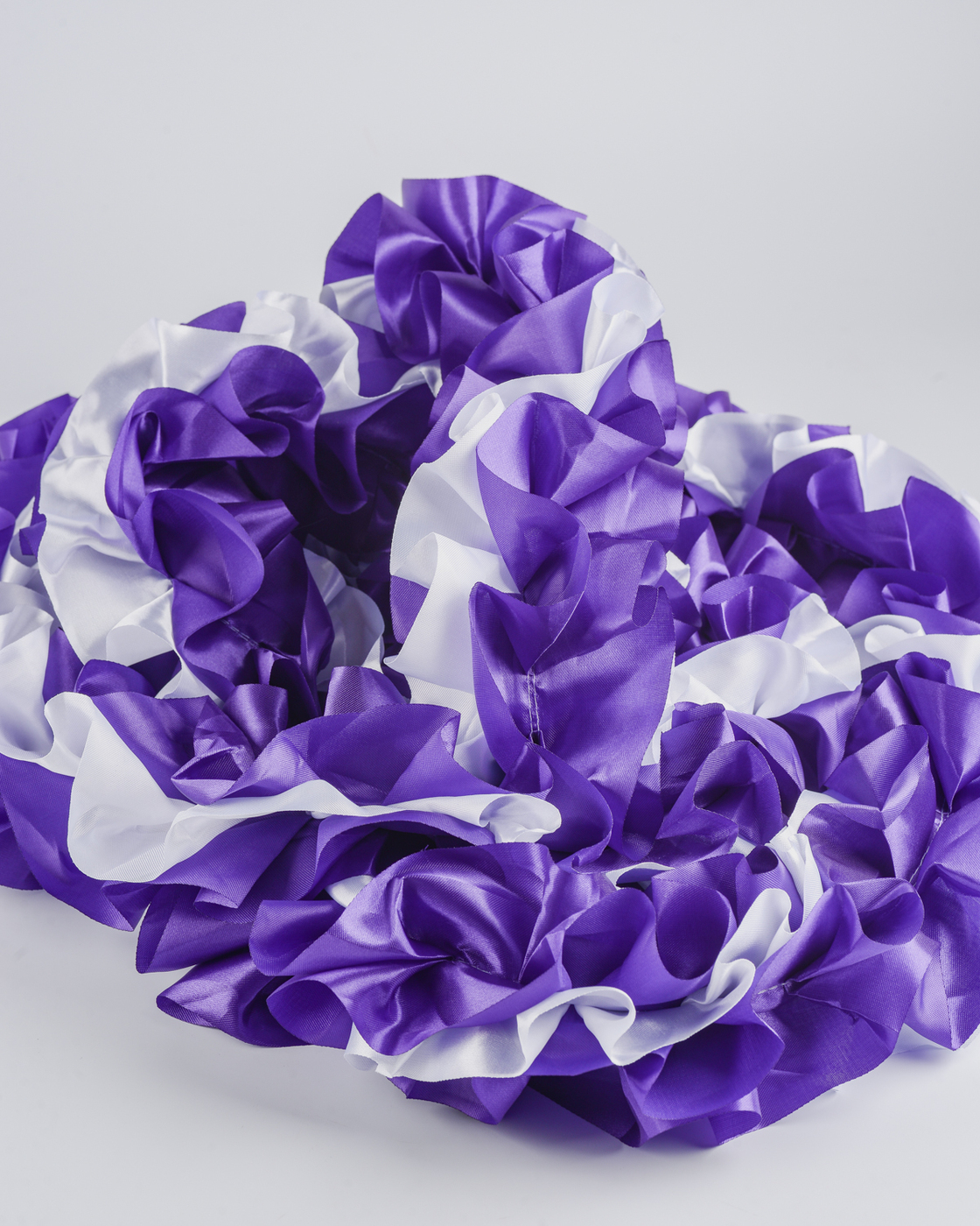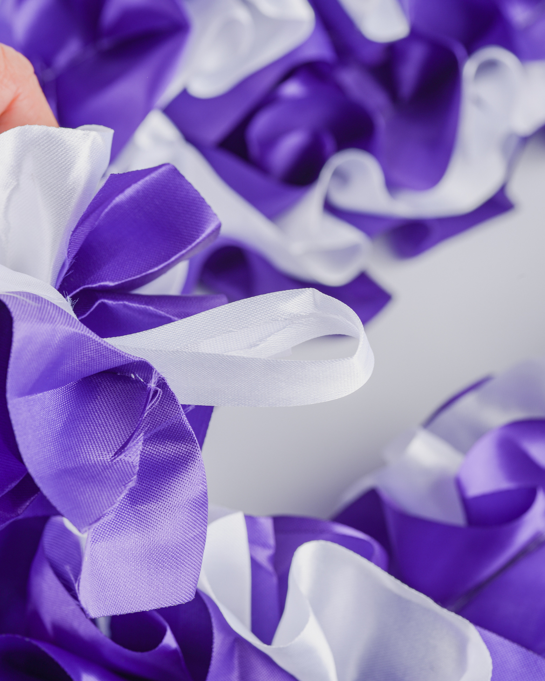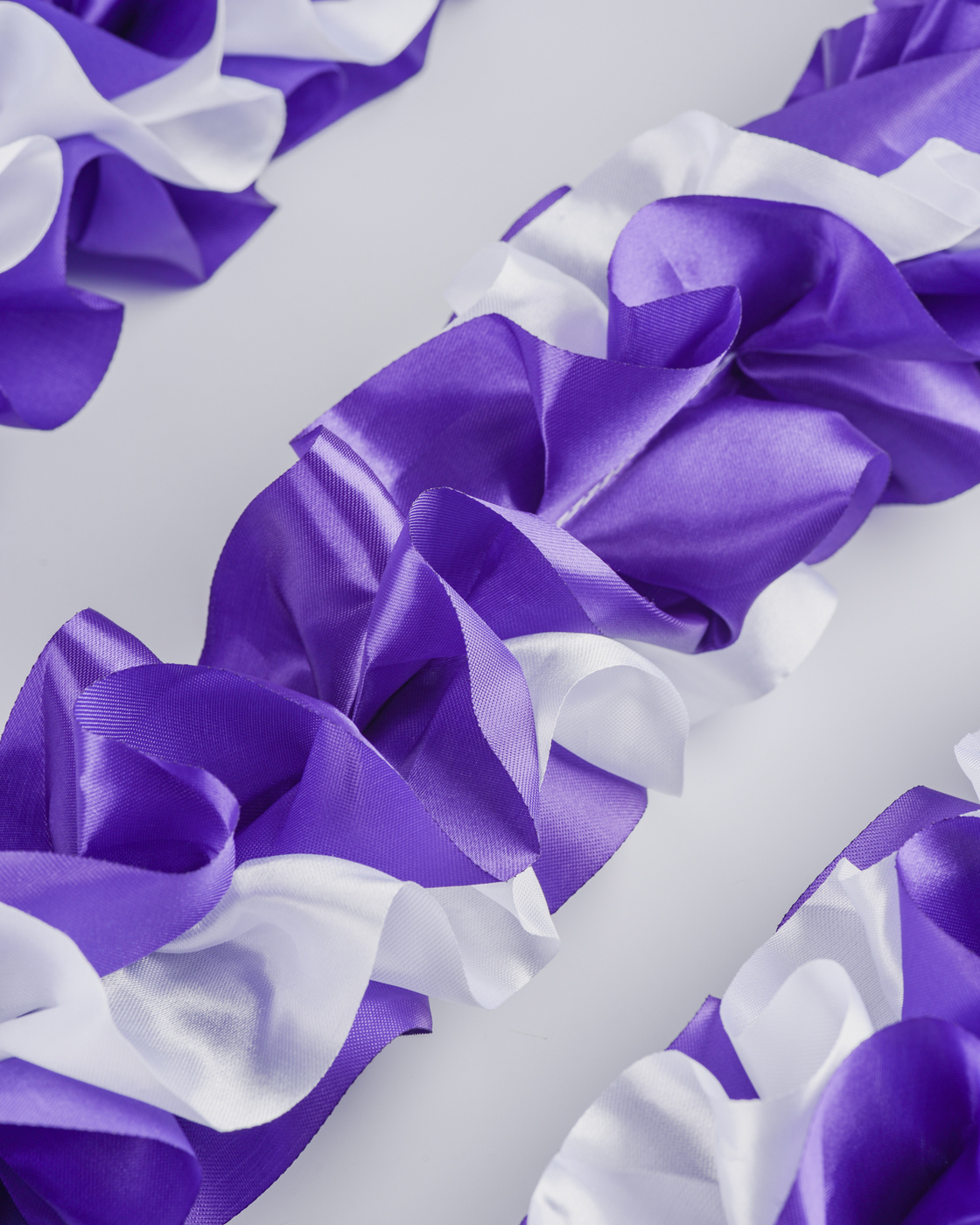 Двухцветная лента - рюш в фиолетовых и белых оттенках, из атласной ленты на капот свадебного авто, 3 метра
