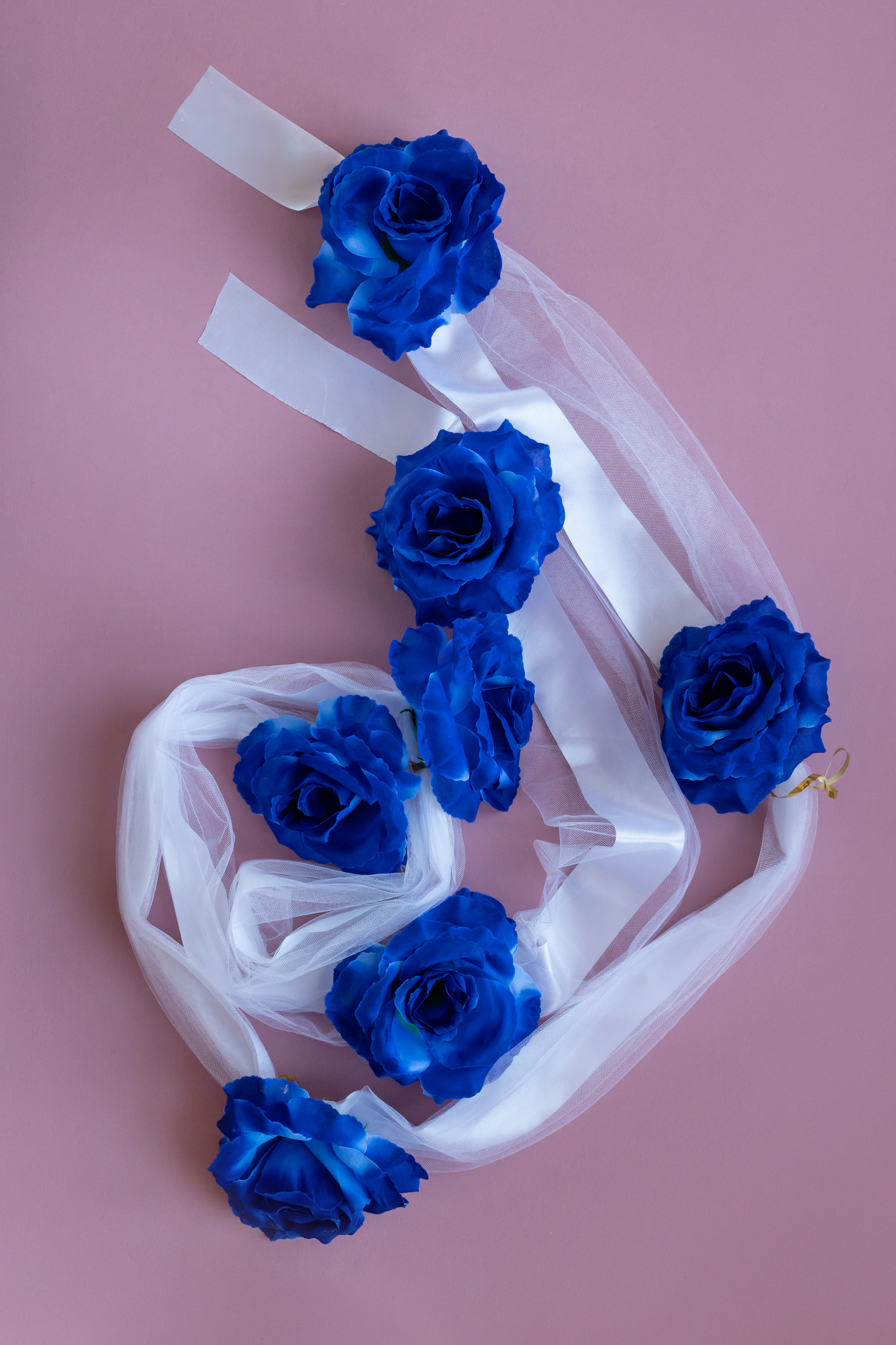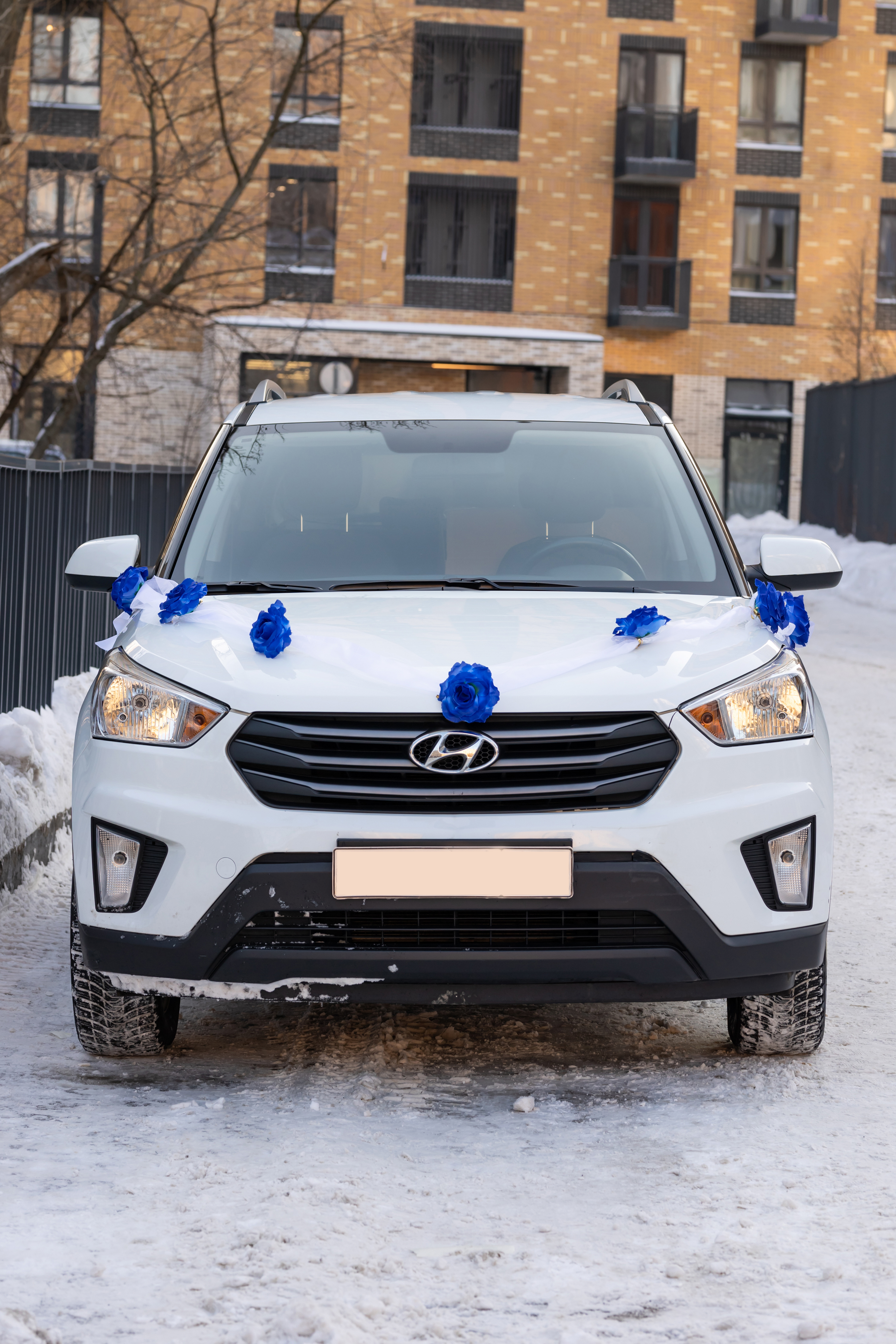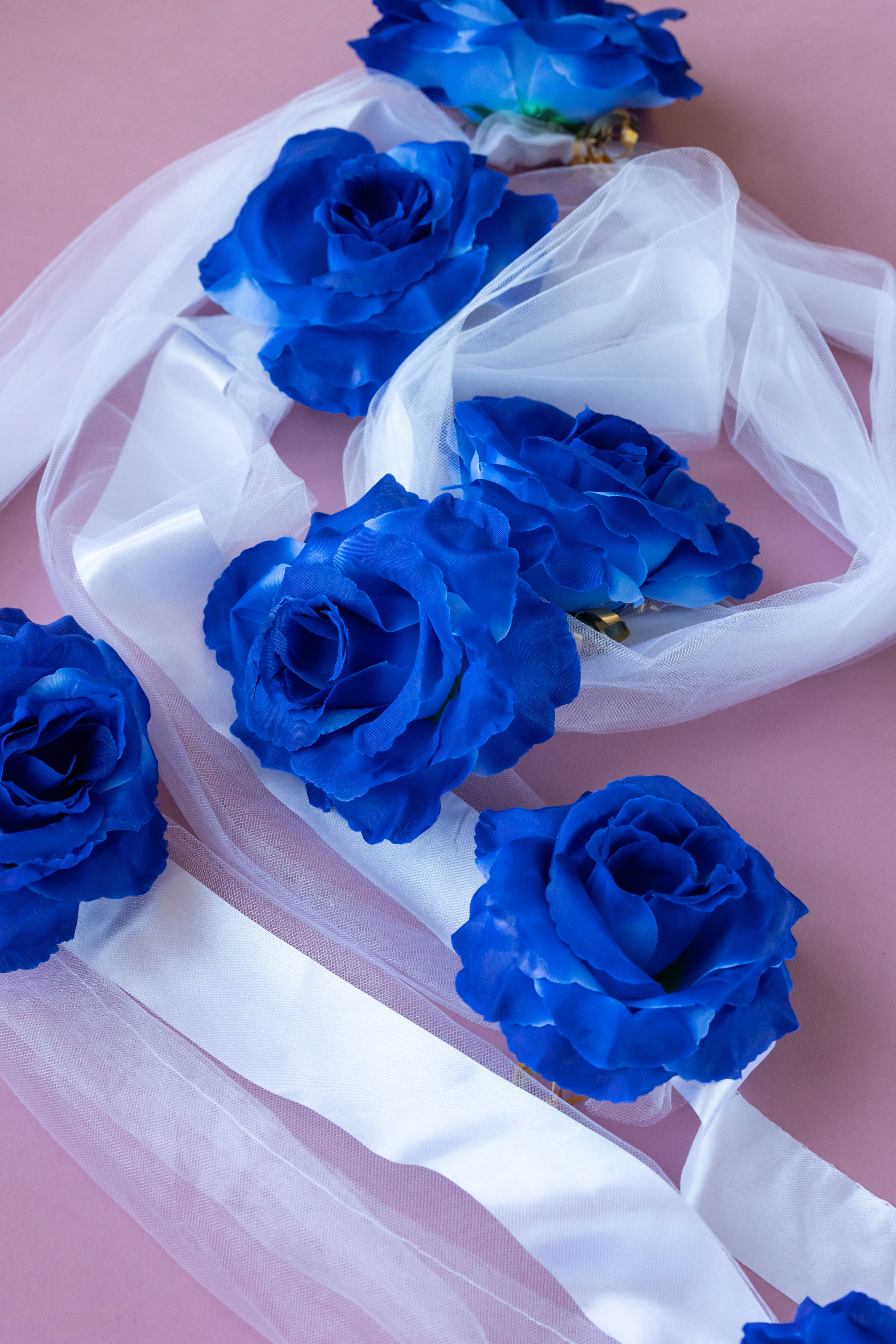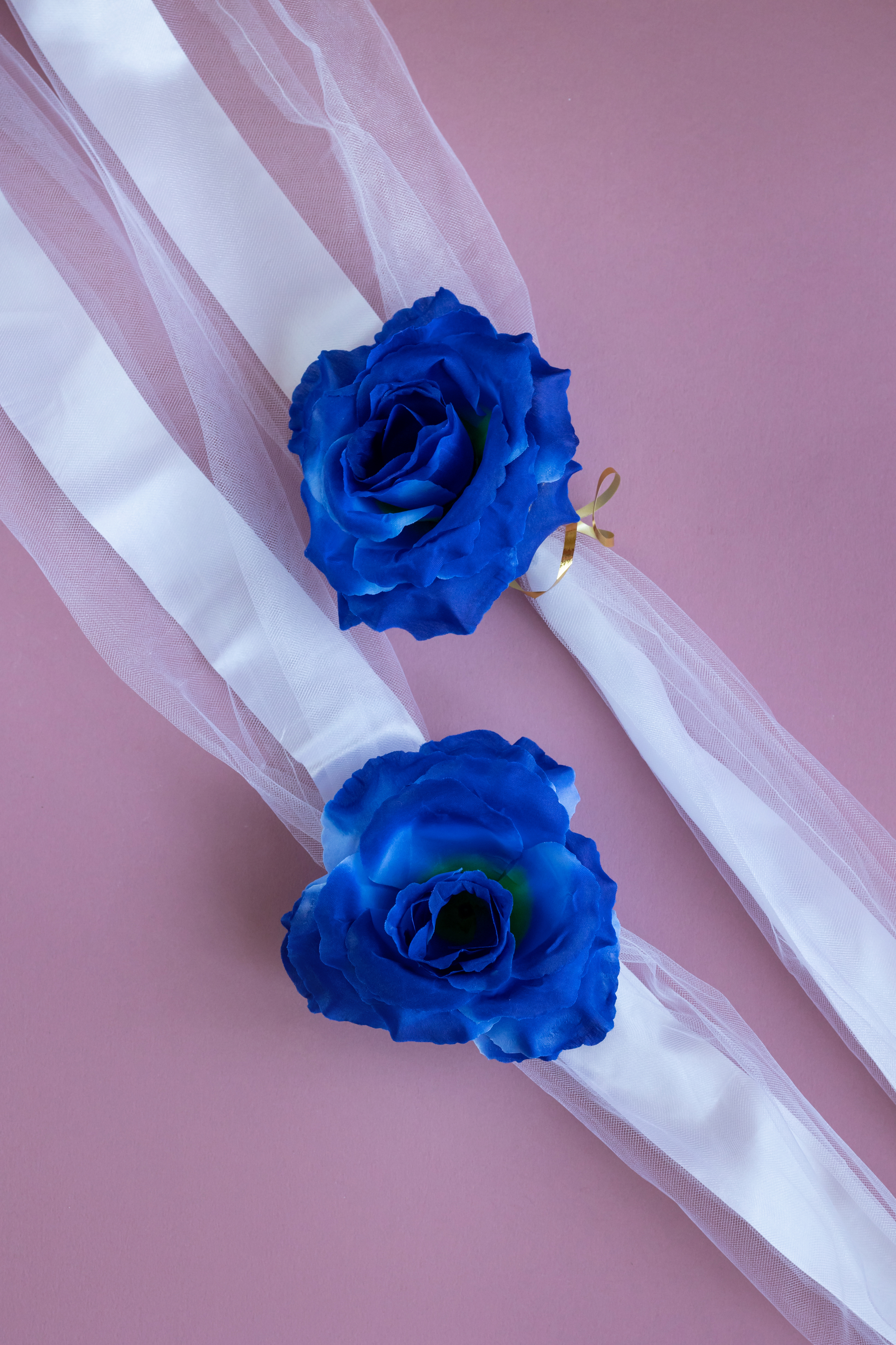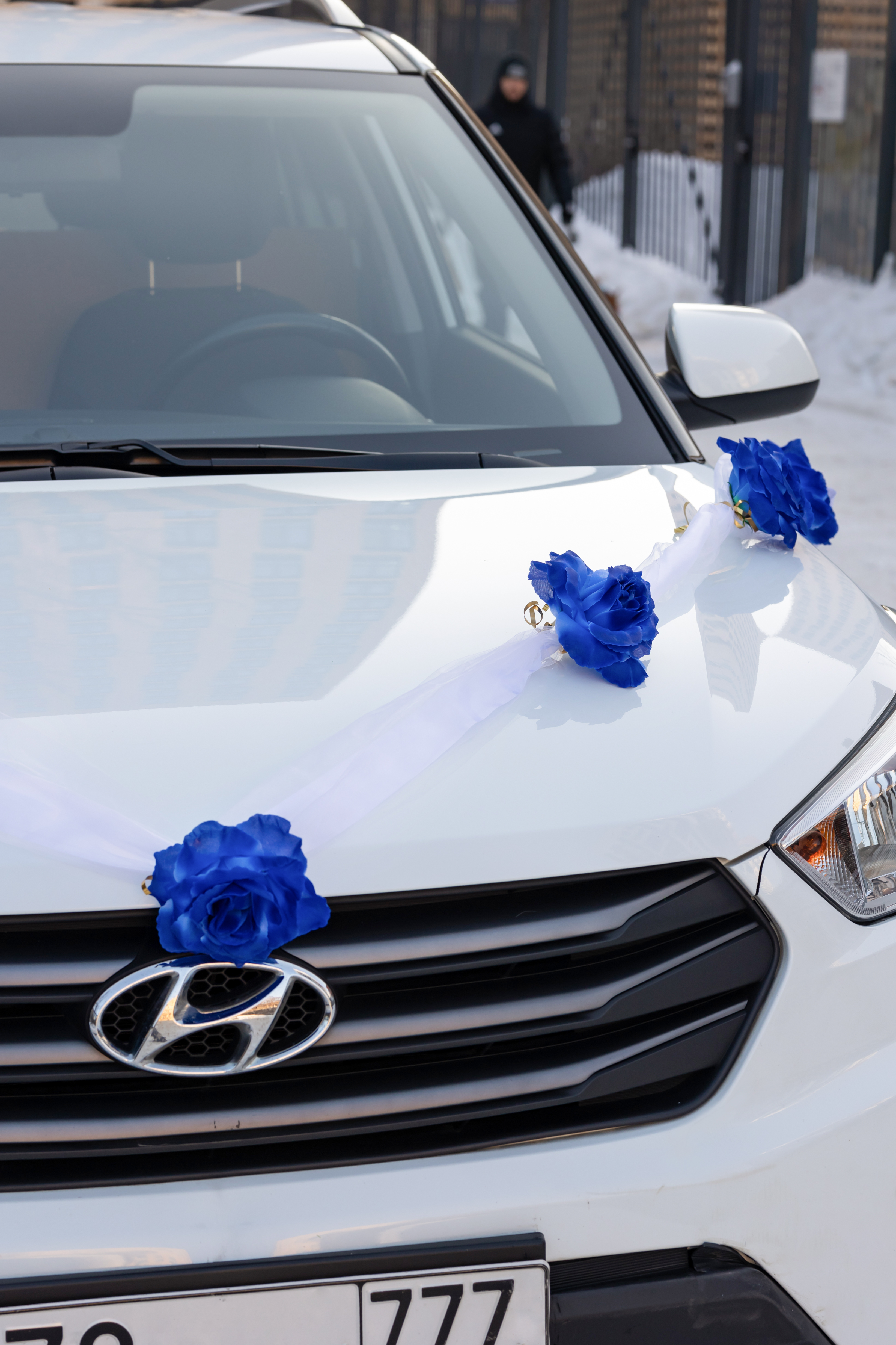 Белая лента на капот для декора свадебного кортежа молодых "Синие розы" из белого фатина, с цветами и листочками из текстиля