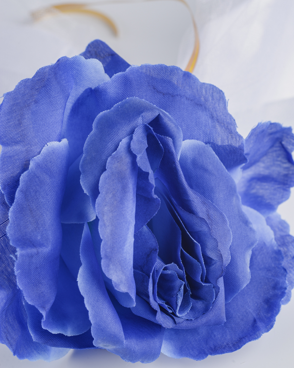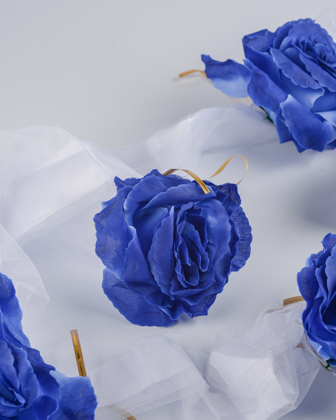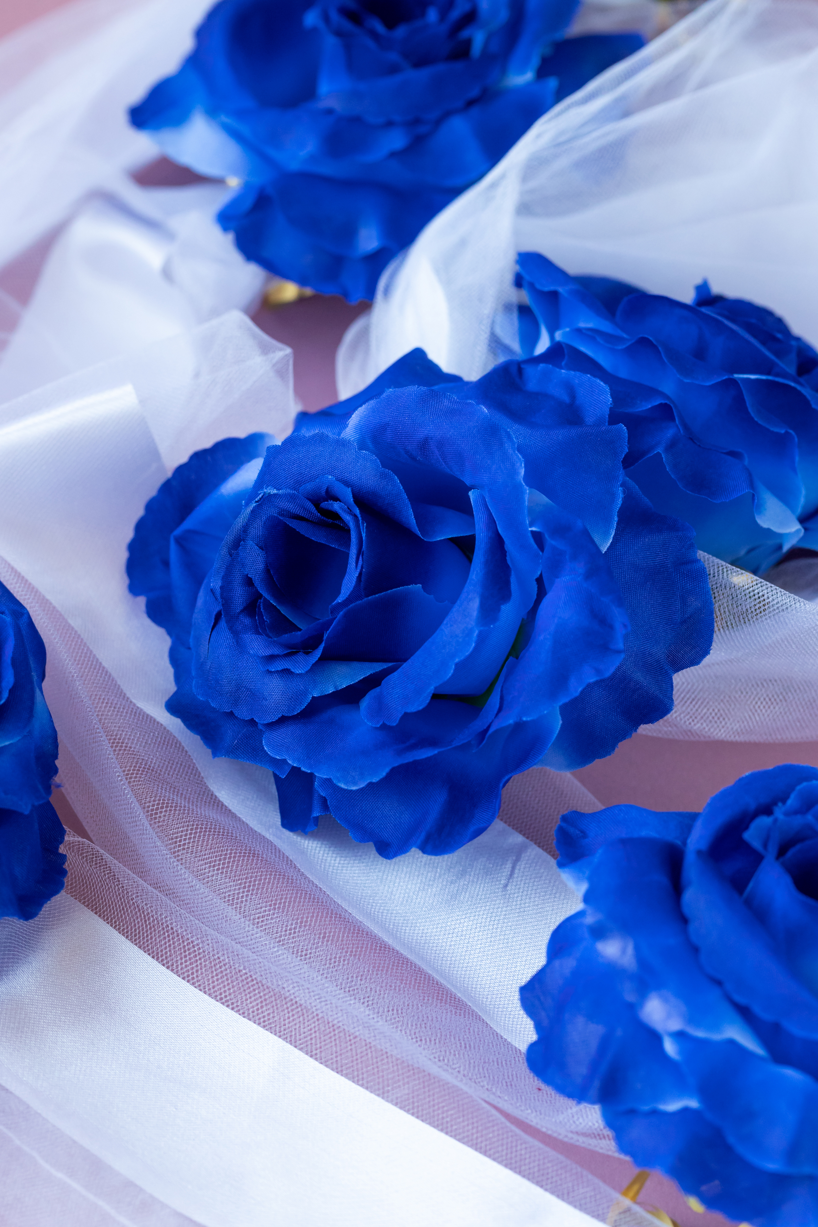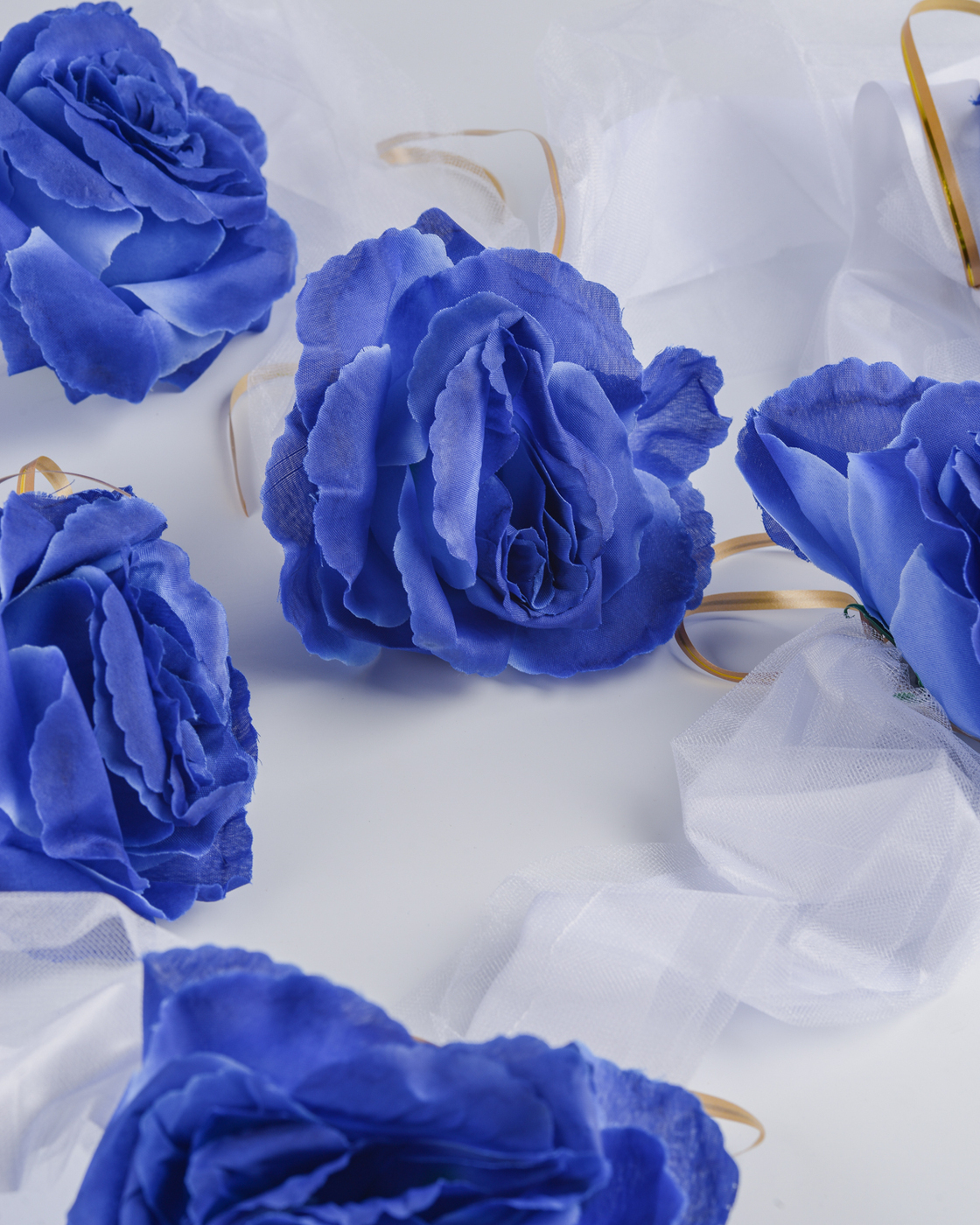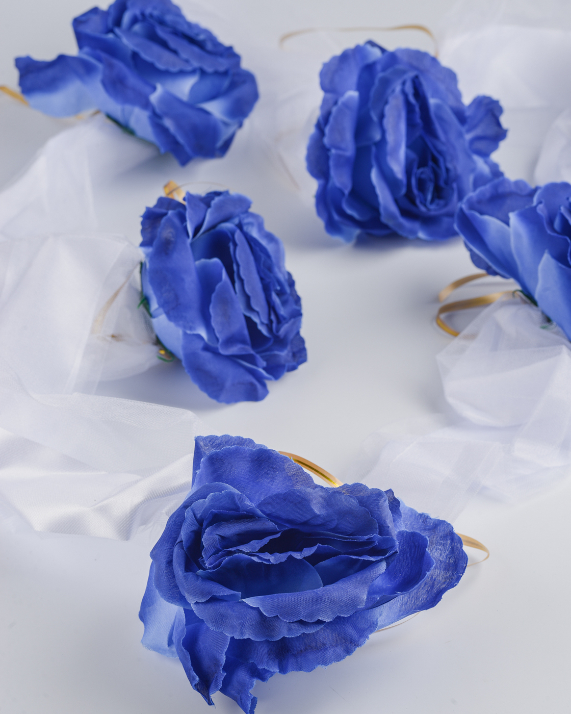 Белая лента на капот для декора свадебного кортежа молодых "Синие розы" из белого фатина, с цветами и листочками из текстиля