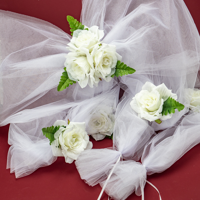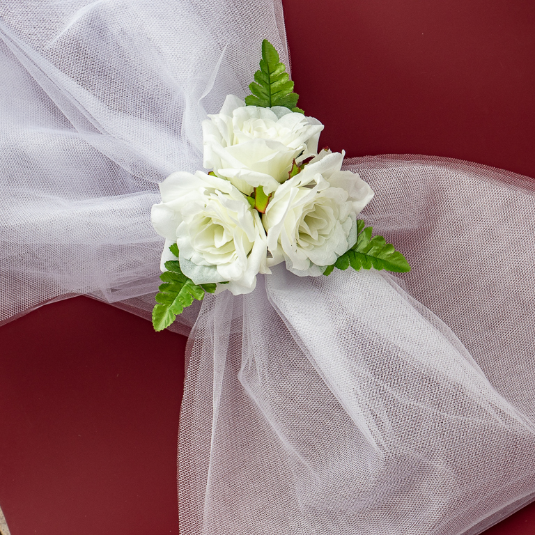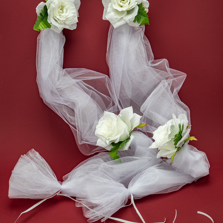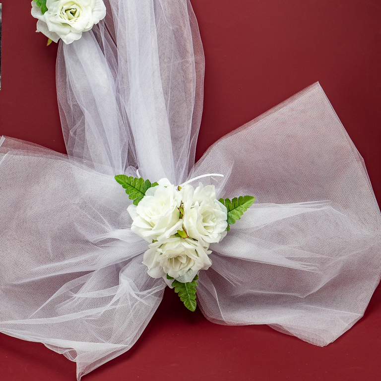 Свадебная лента на капот авто молодоженов из белого фатина с пышными бутонами и зелеными листочками папоротника