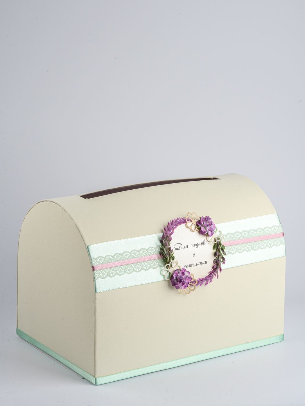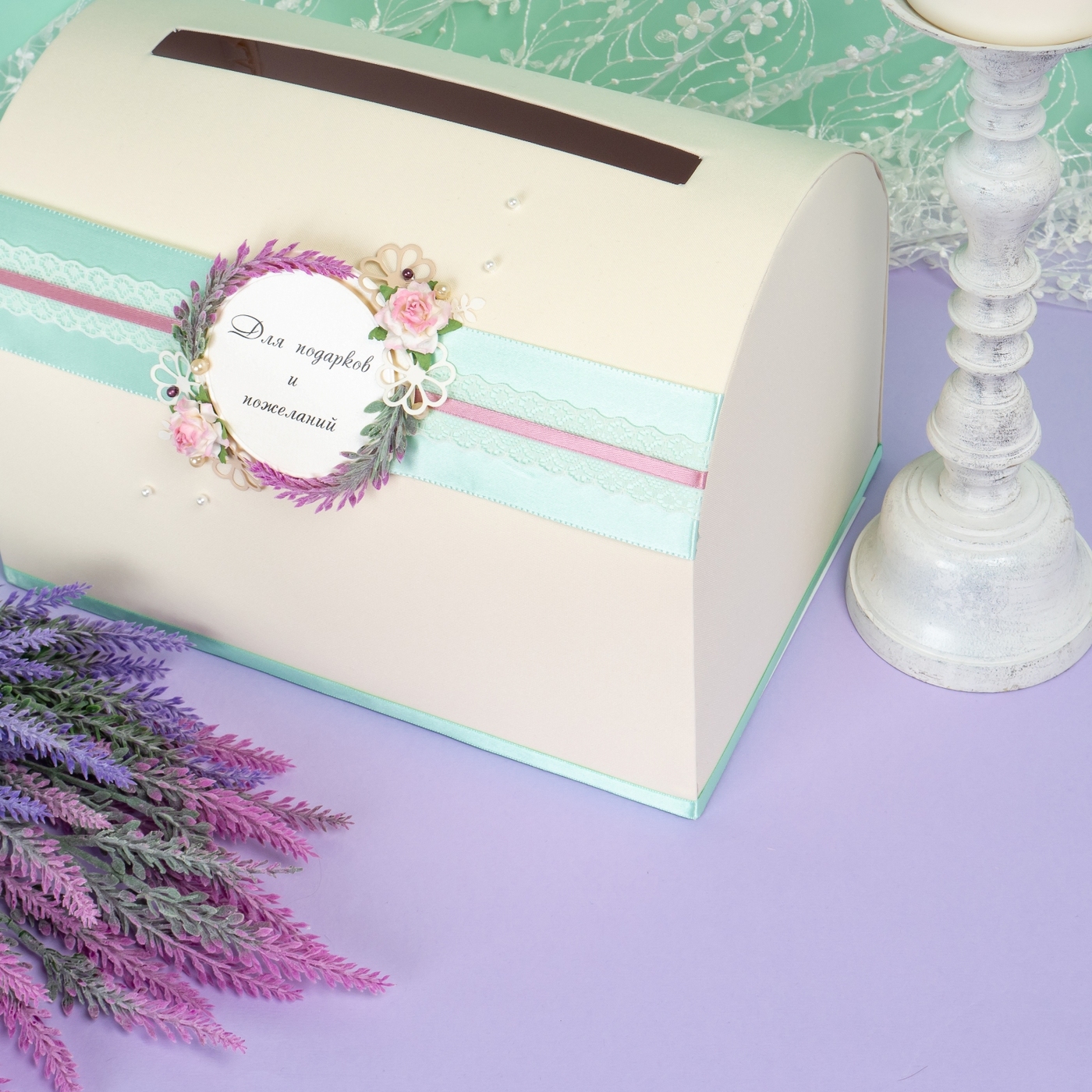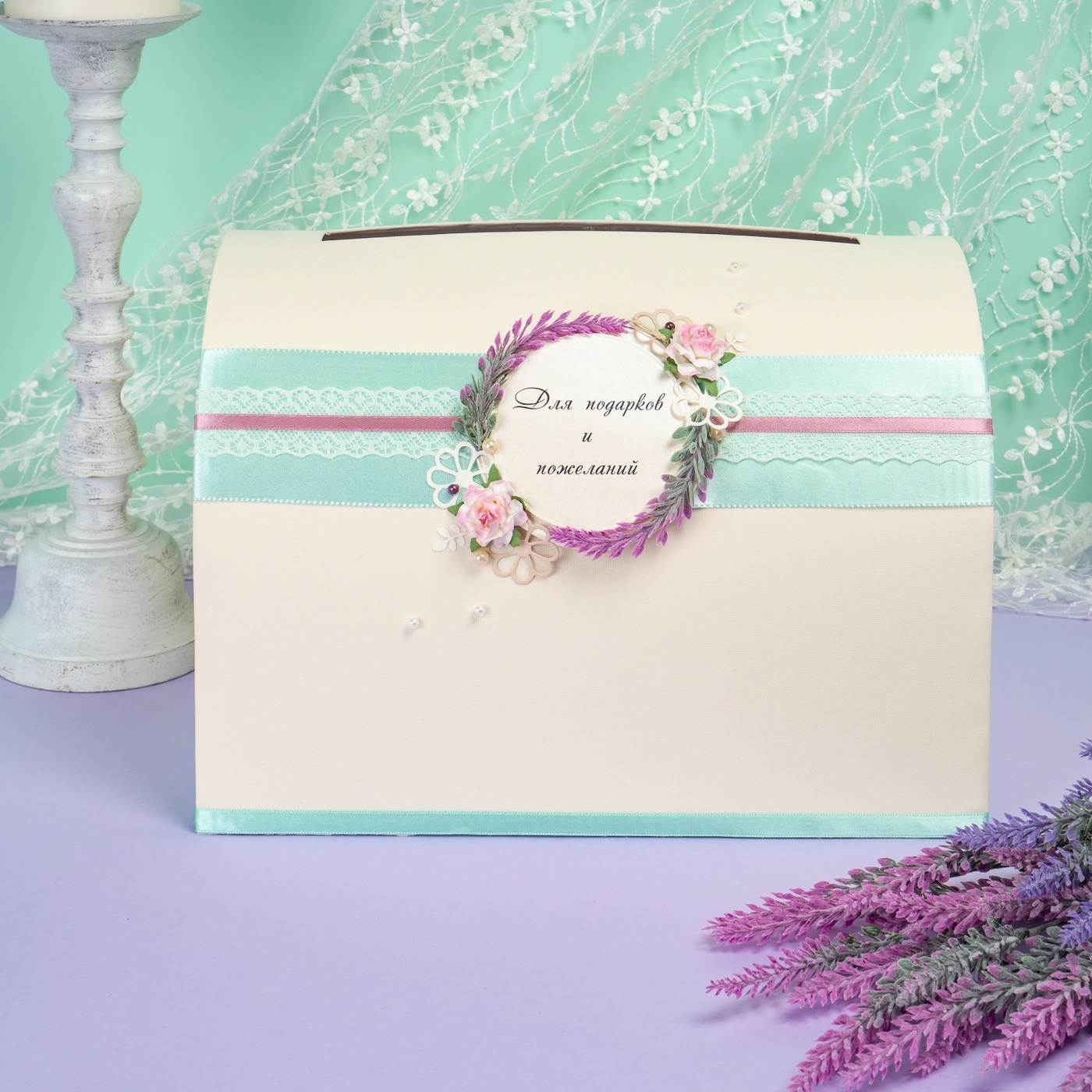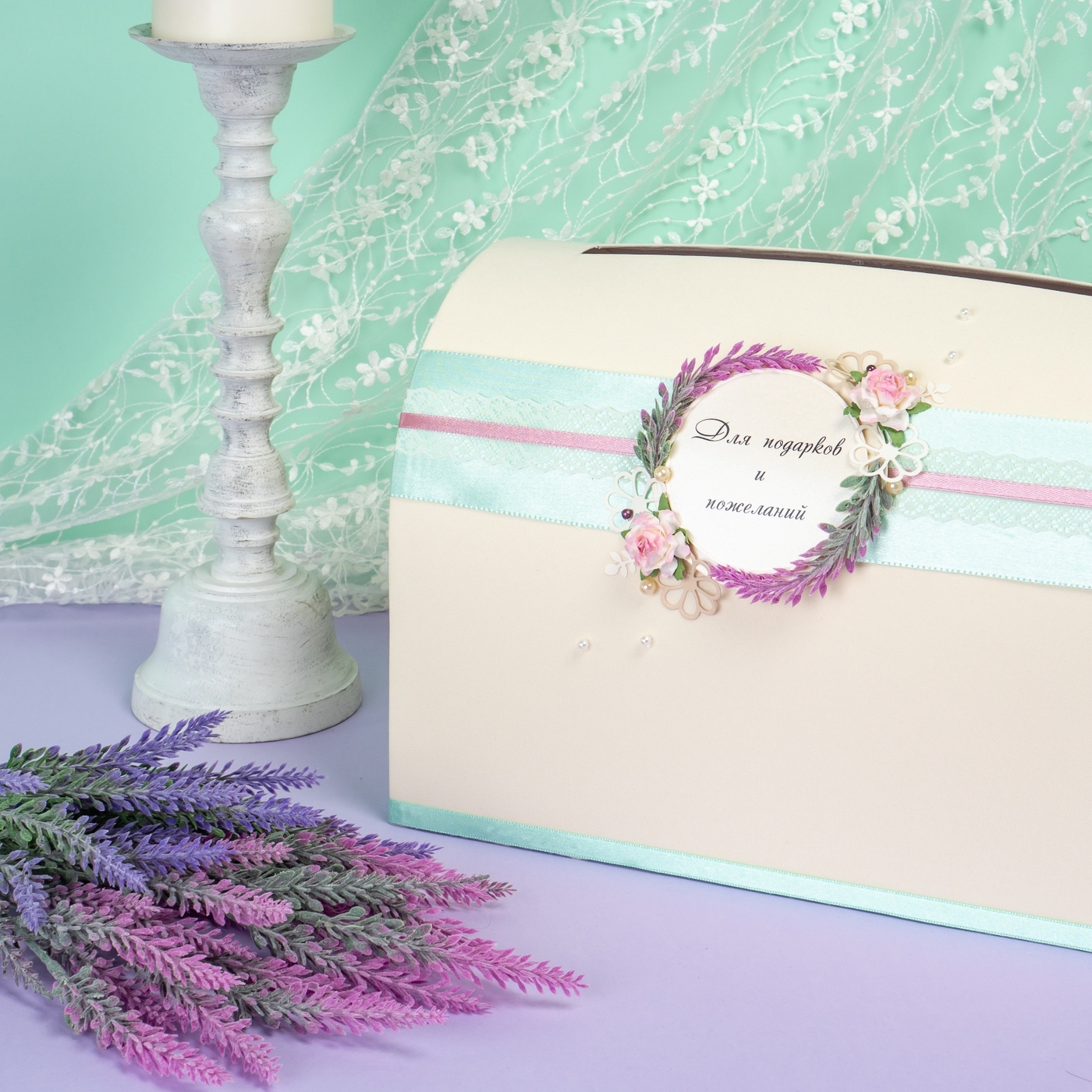 Свадебный сундучок для подарков молодоженам с бирюзовым декором, сиреневой лавандой и нежными розами
