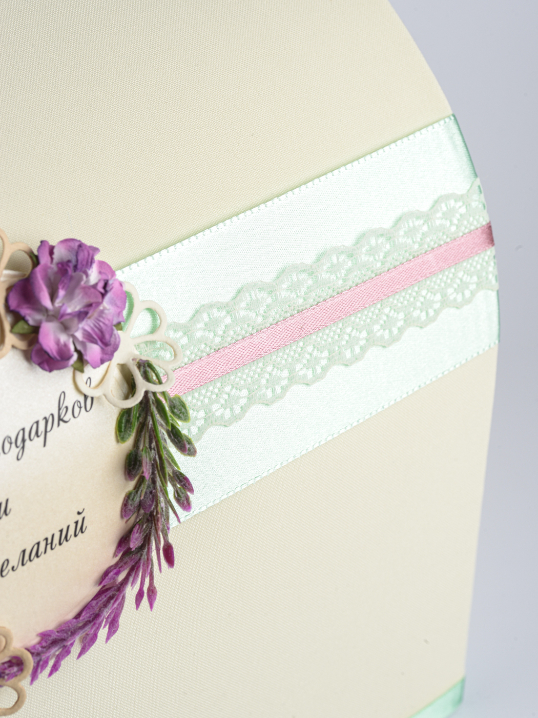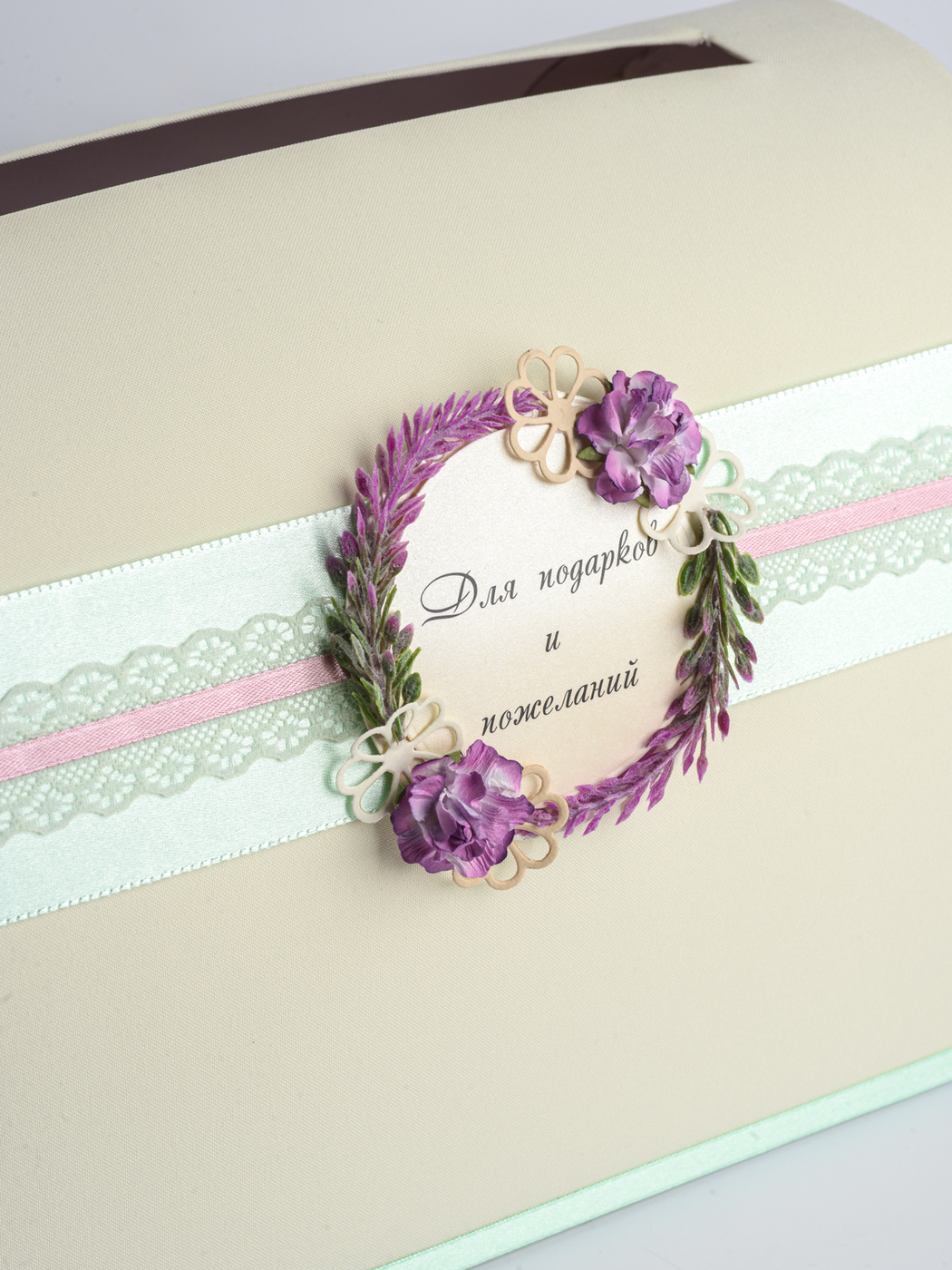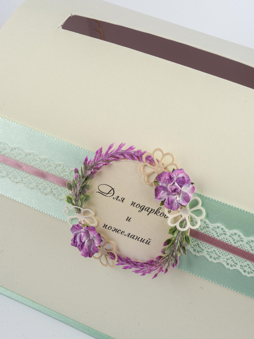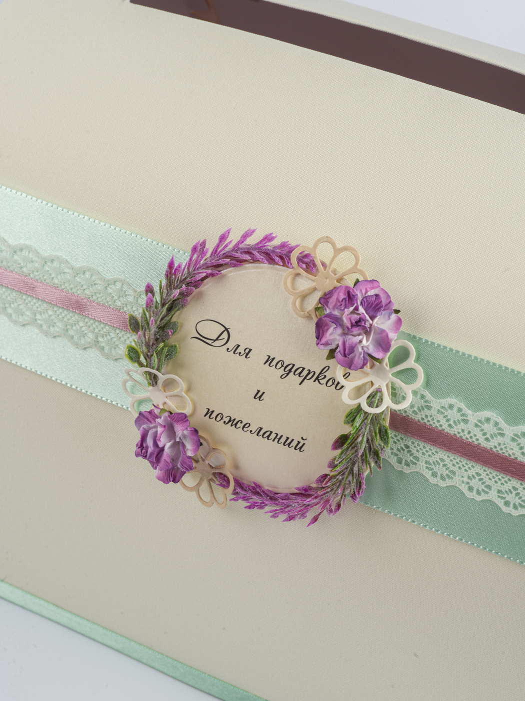 Свадебный сундучок для подарков молодоженам с бирюзовым декором, сиреневой лавандой и нежными розами