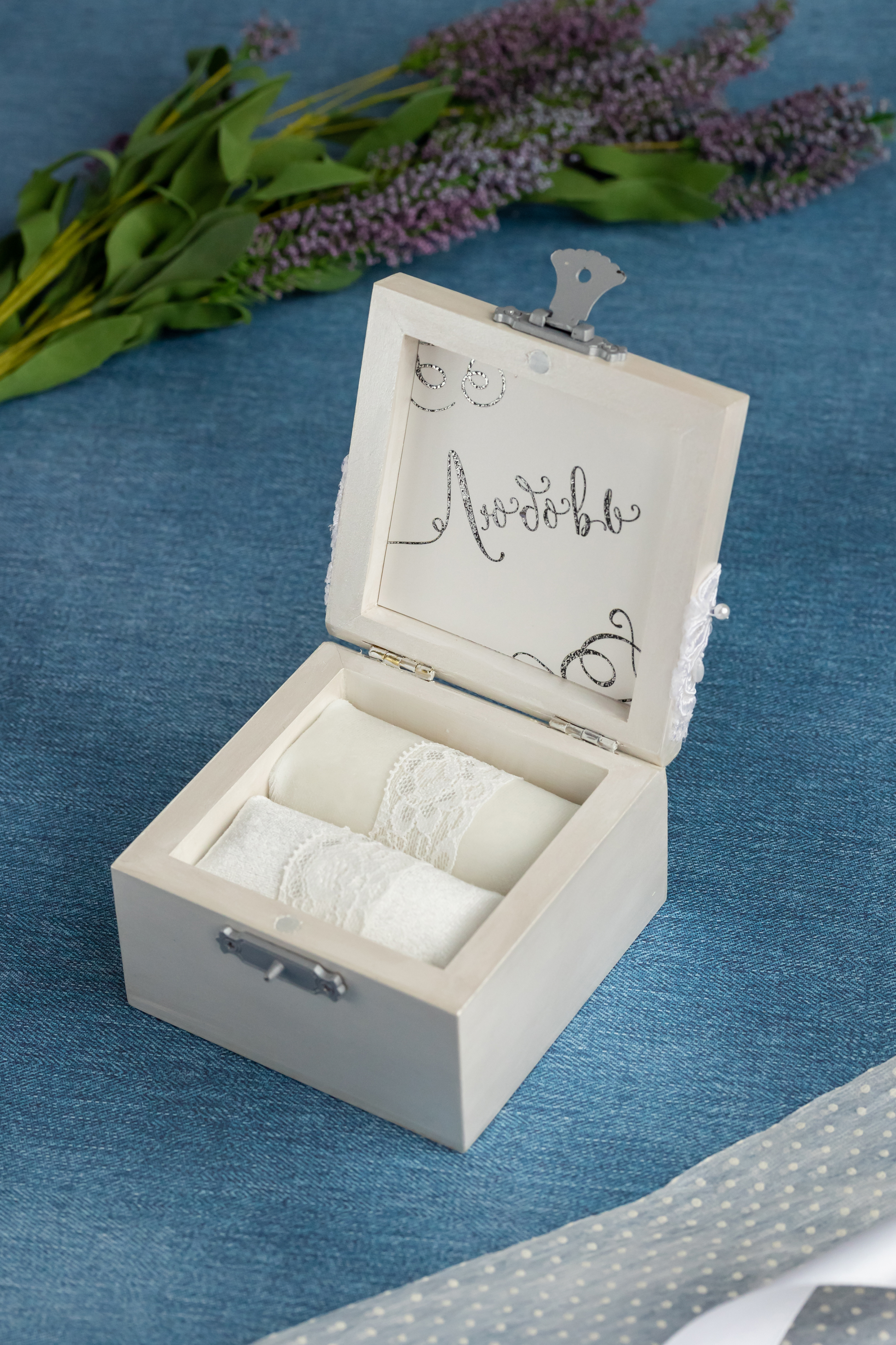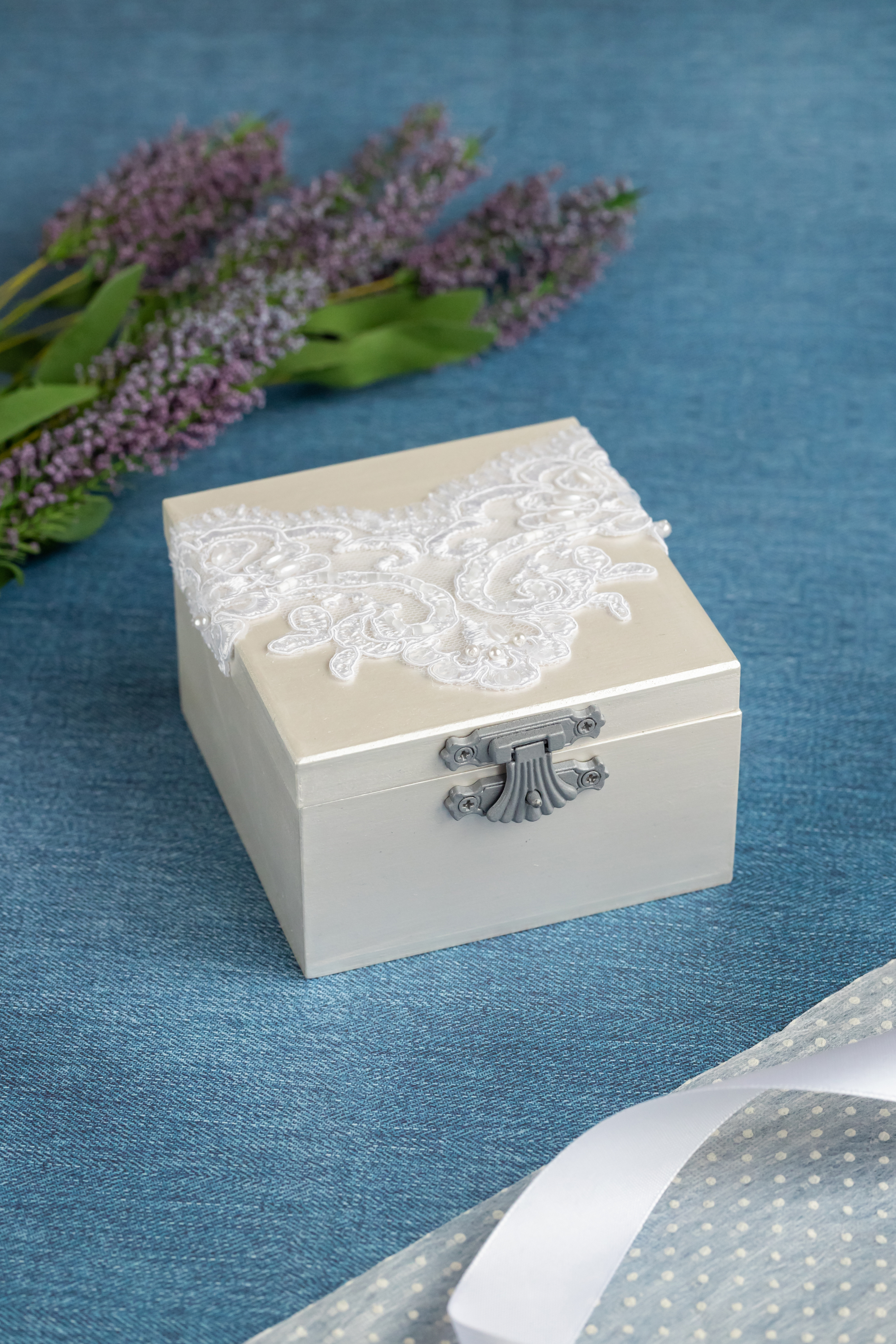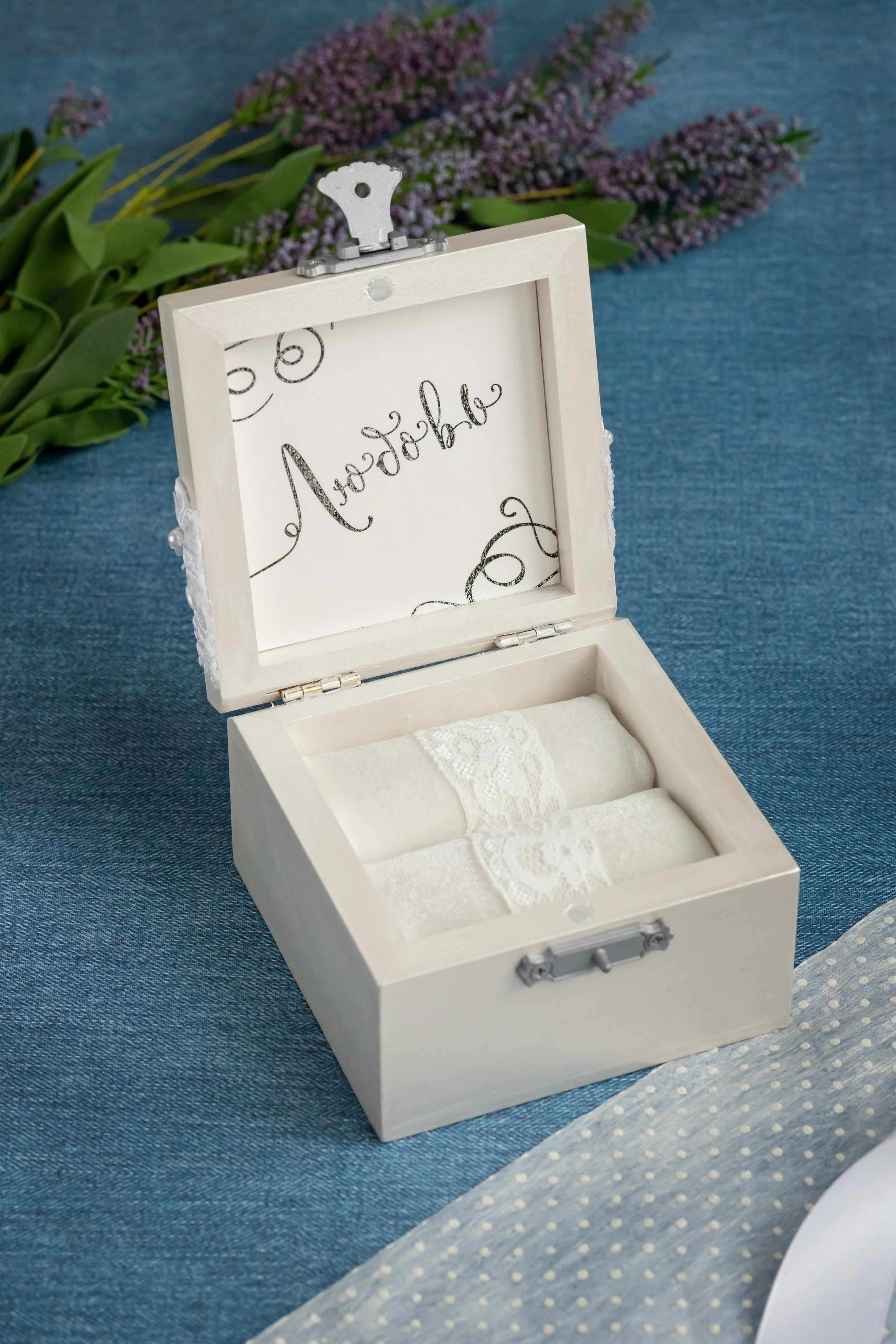 Свадебная шкатулка для обручальных колец белого цвета с кружевом и мягкой подушечкой из атласа
