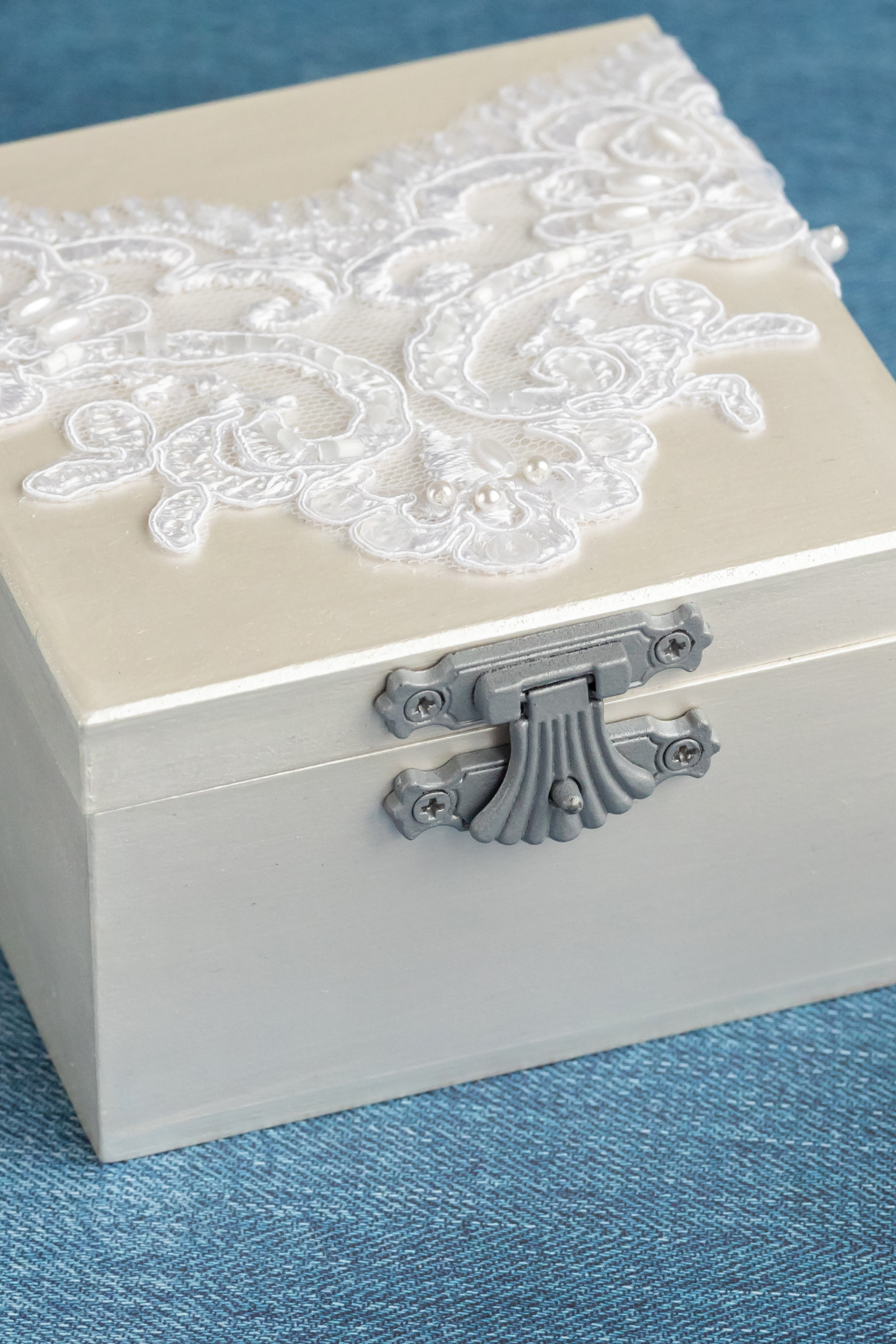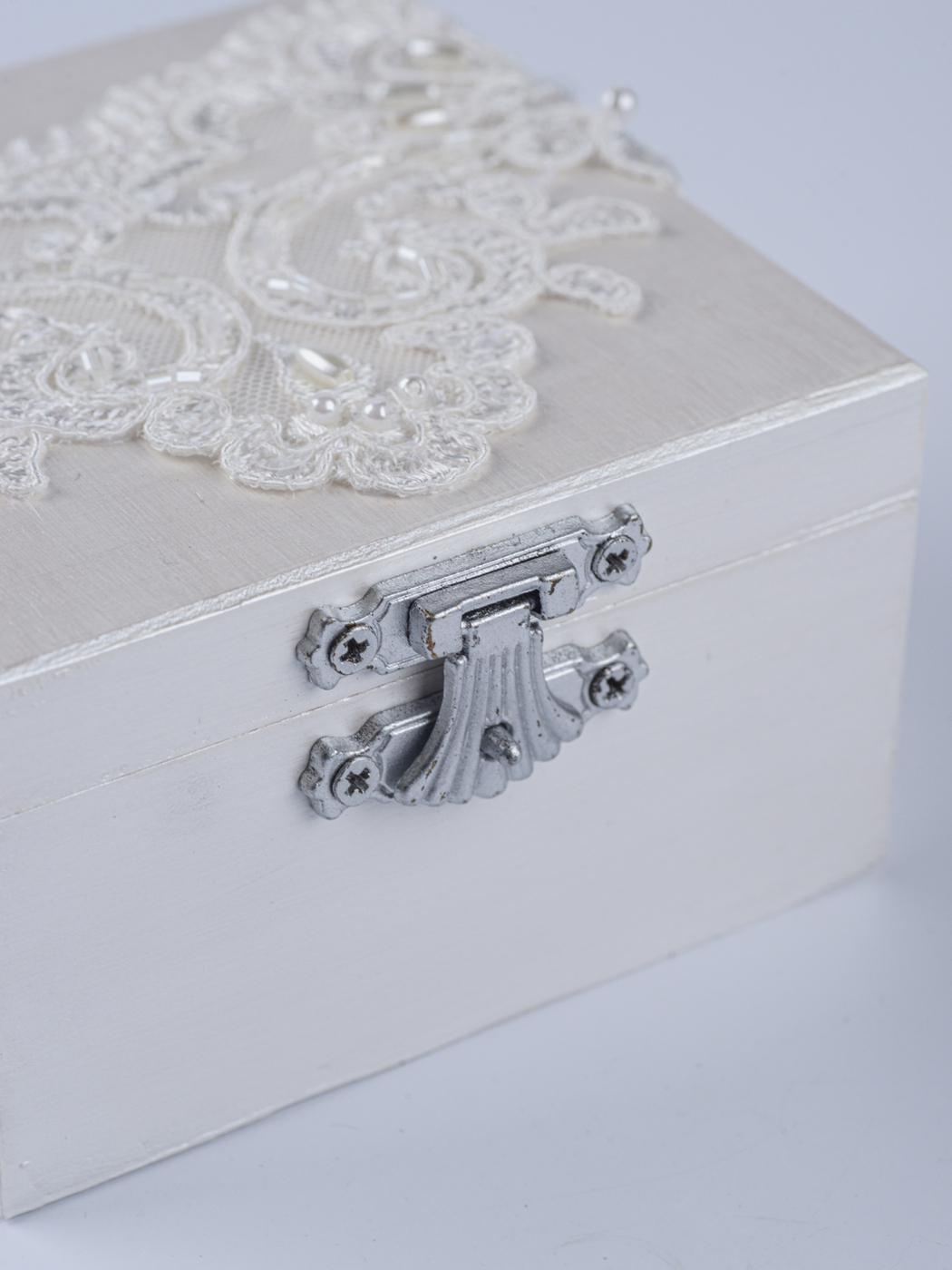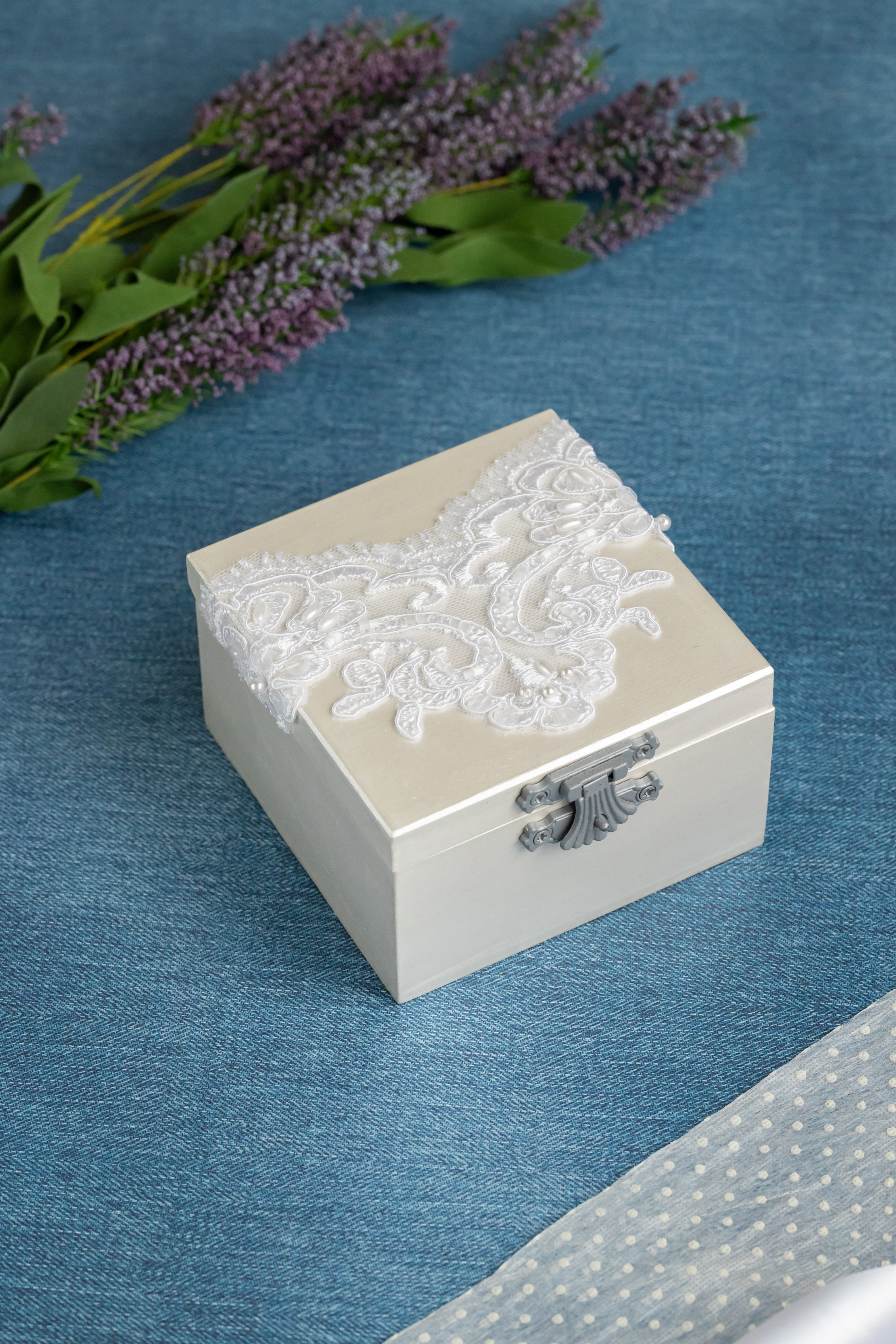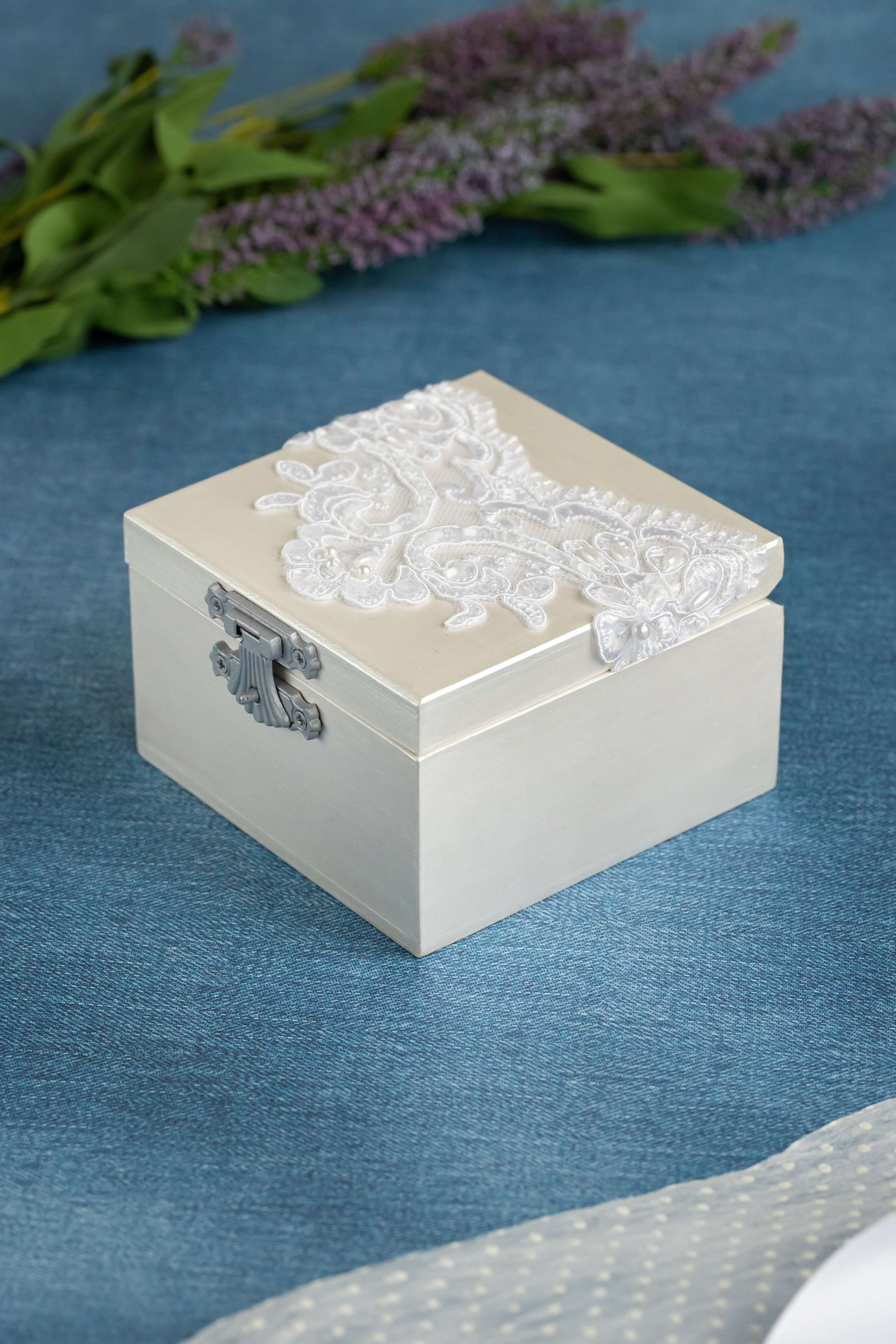 Свадебная шкатулка для обручальных колец белого цвета с кружевом и мягкой подушечкой из атласа
