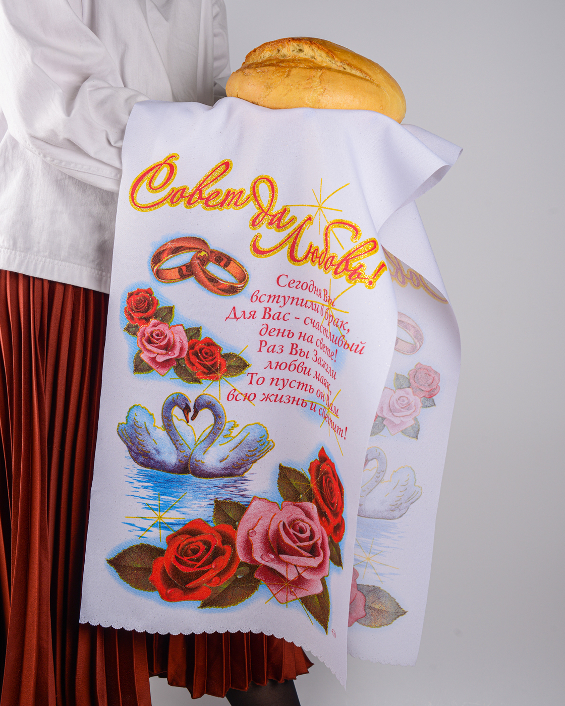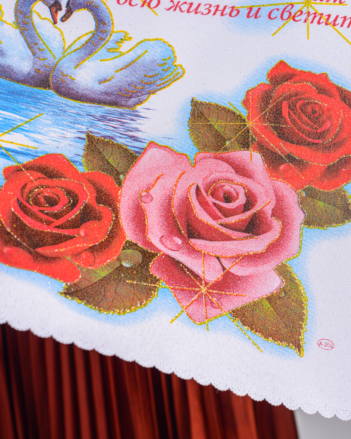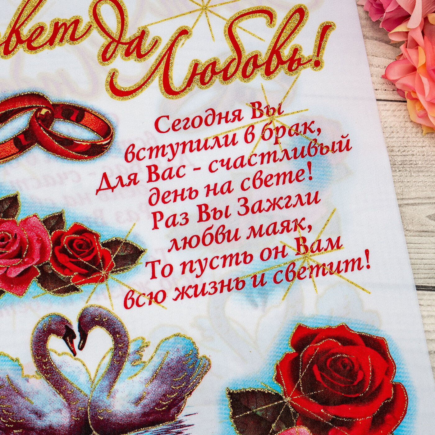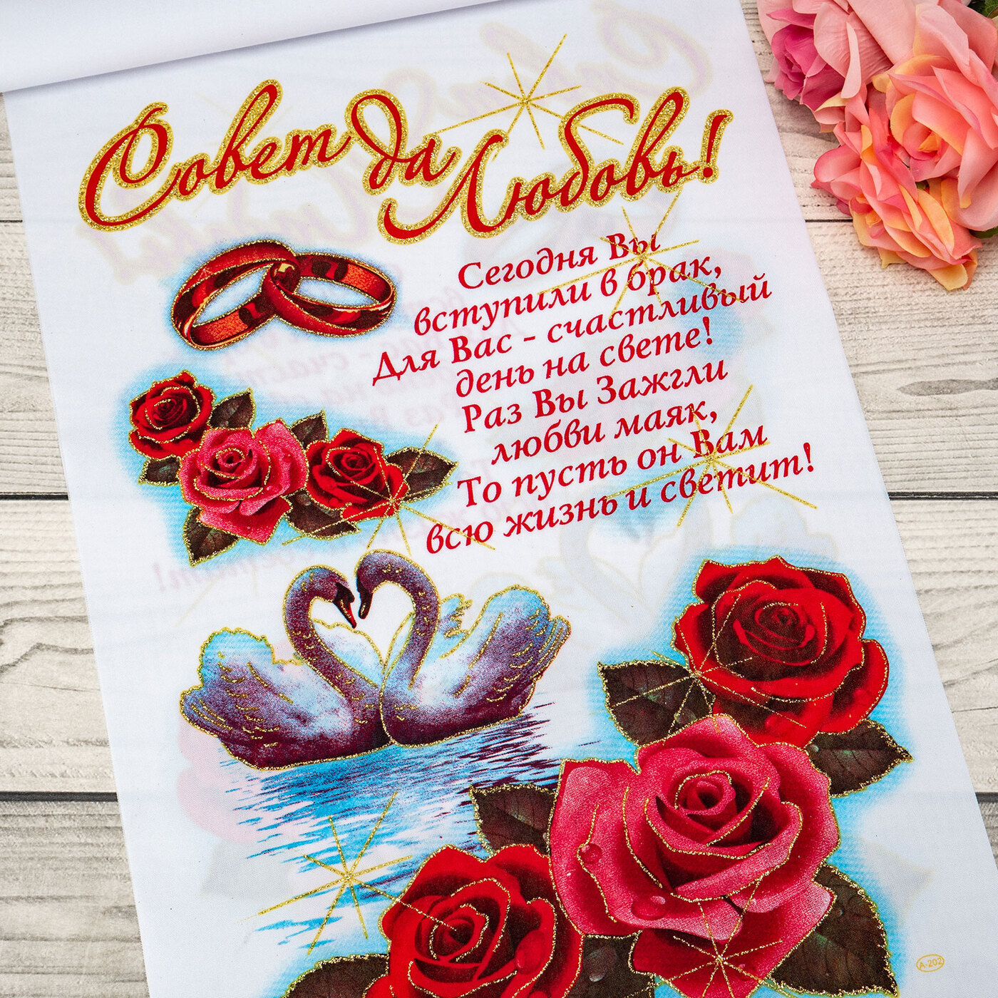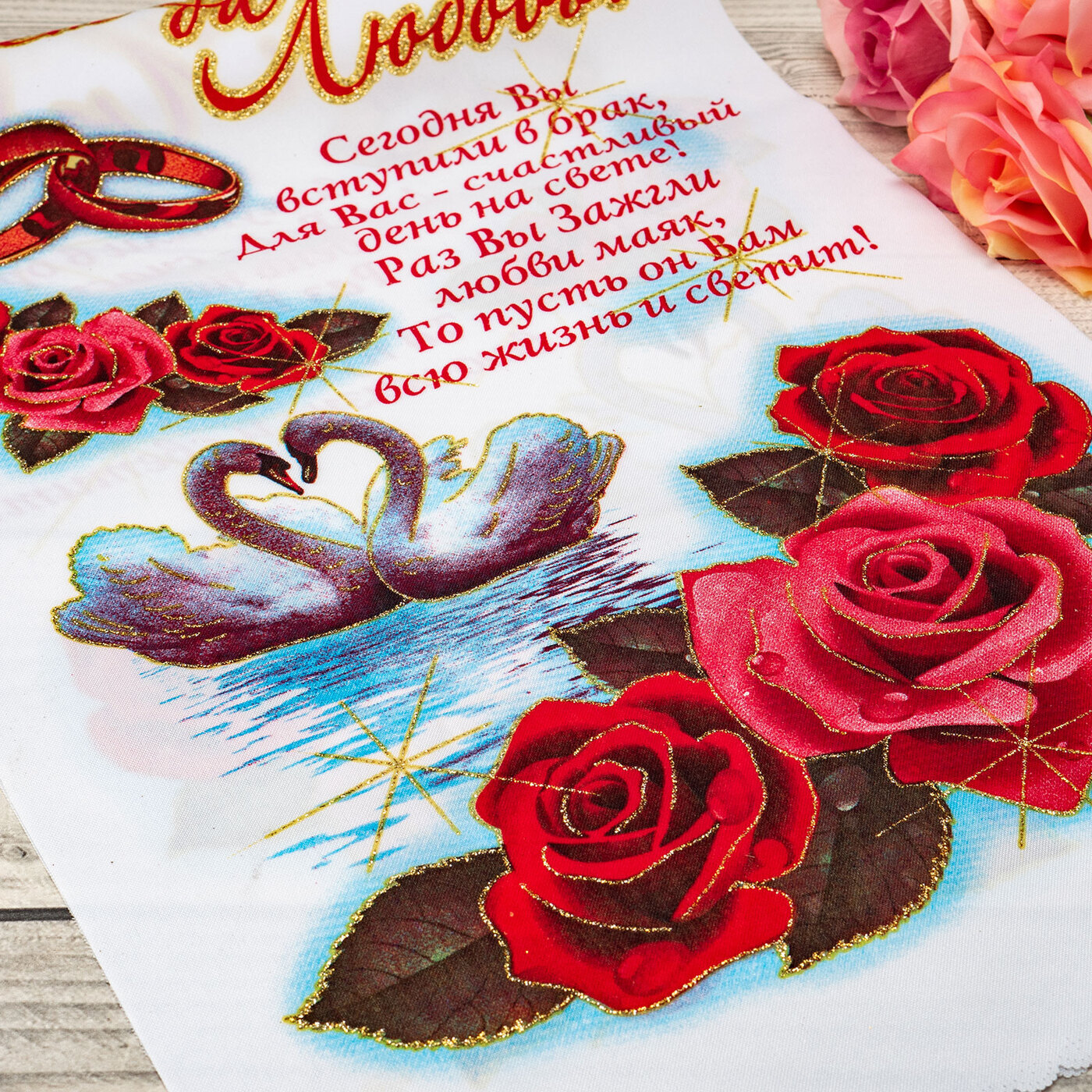 Свадебный рушник для каравая новобрачных и венчания "Совет да любовь" со стихотворением, красными розами и лебедями