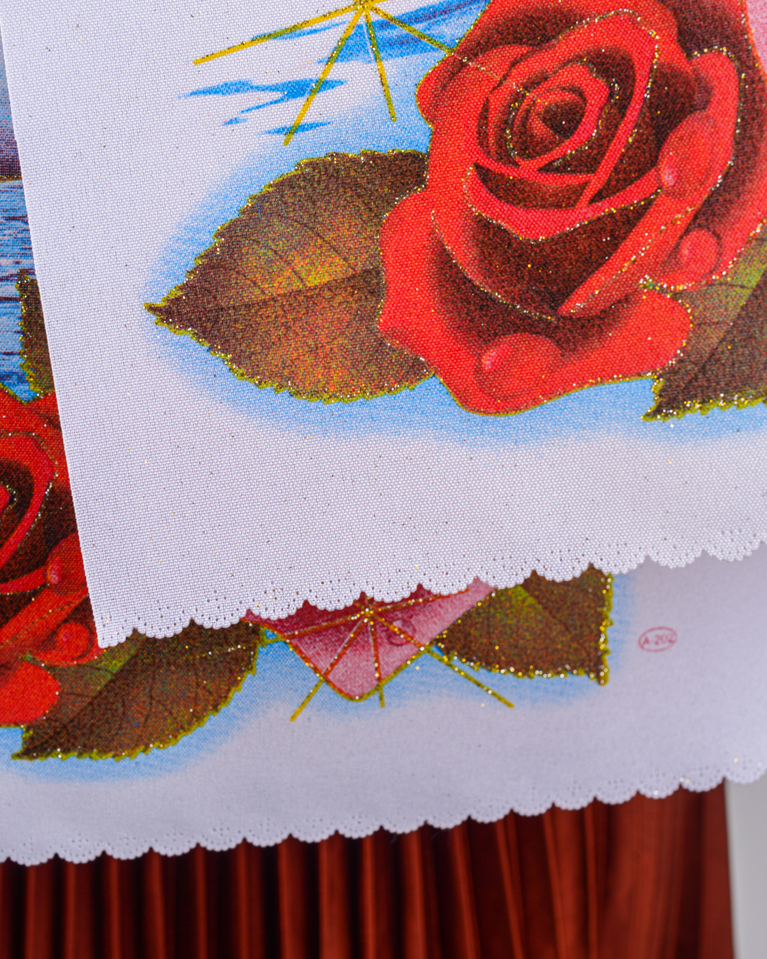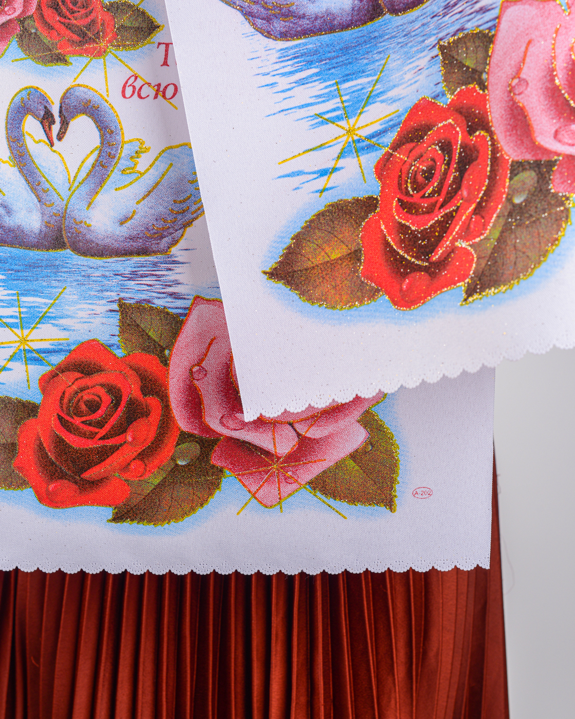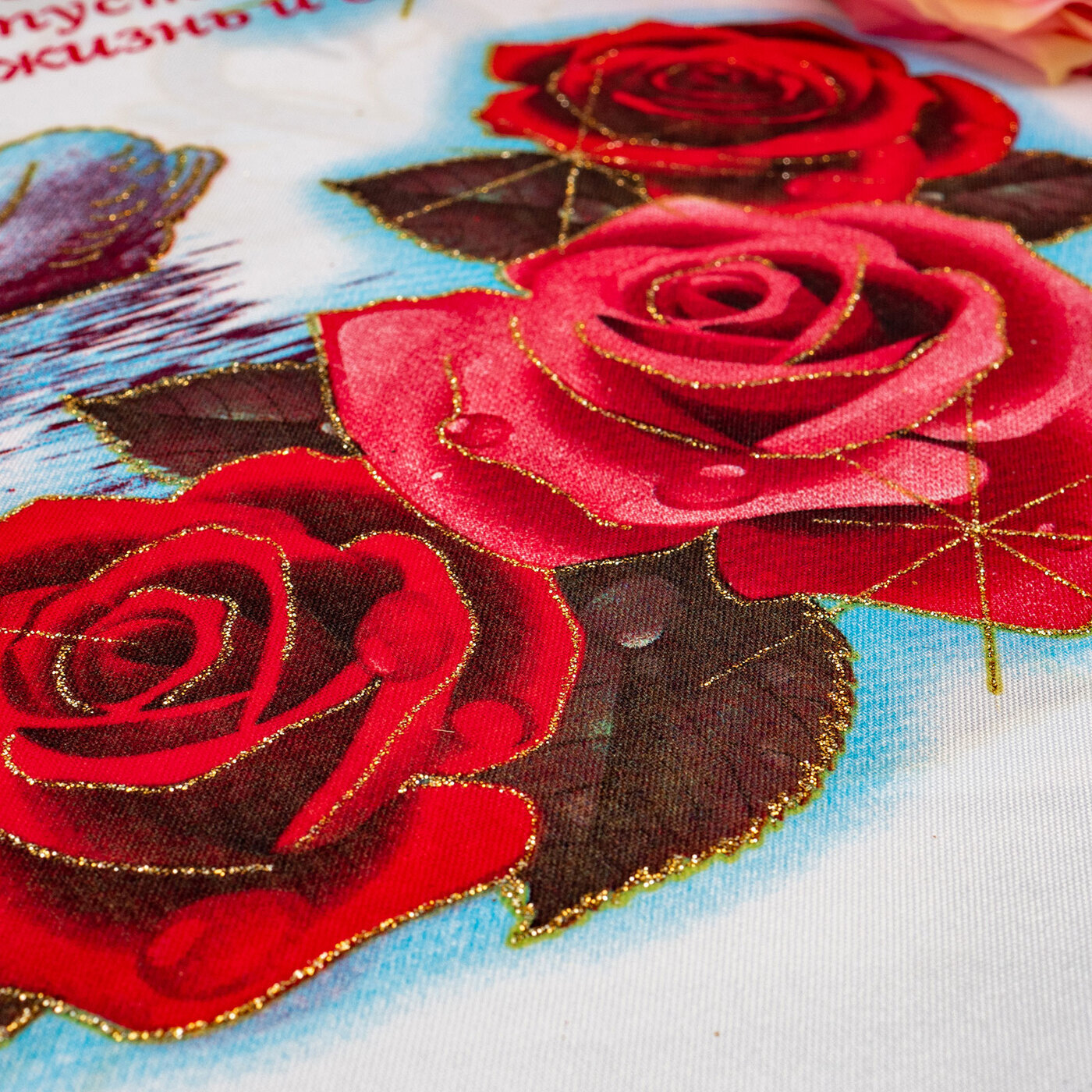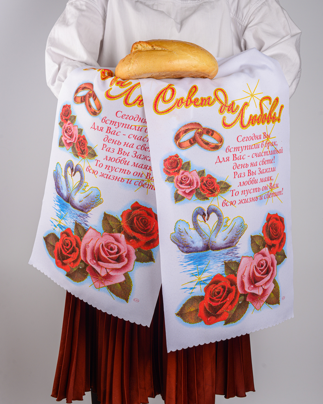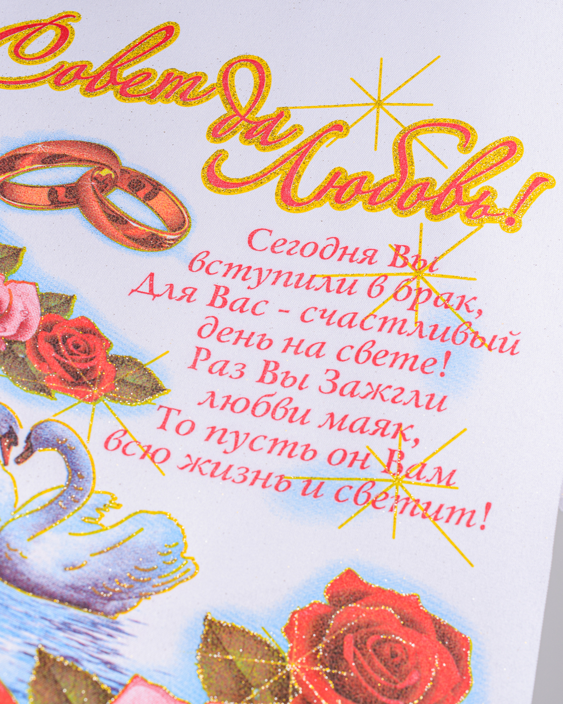 Свадебный рушник для каравая новобрачных и венчания "Совет да любовь" со стихотворением, красными розами и лебедями