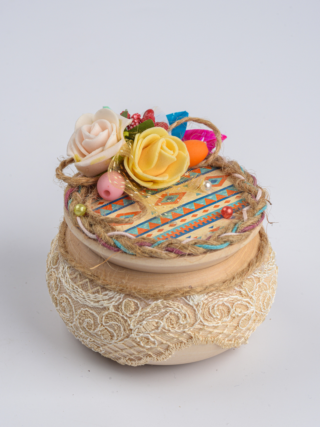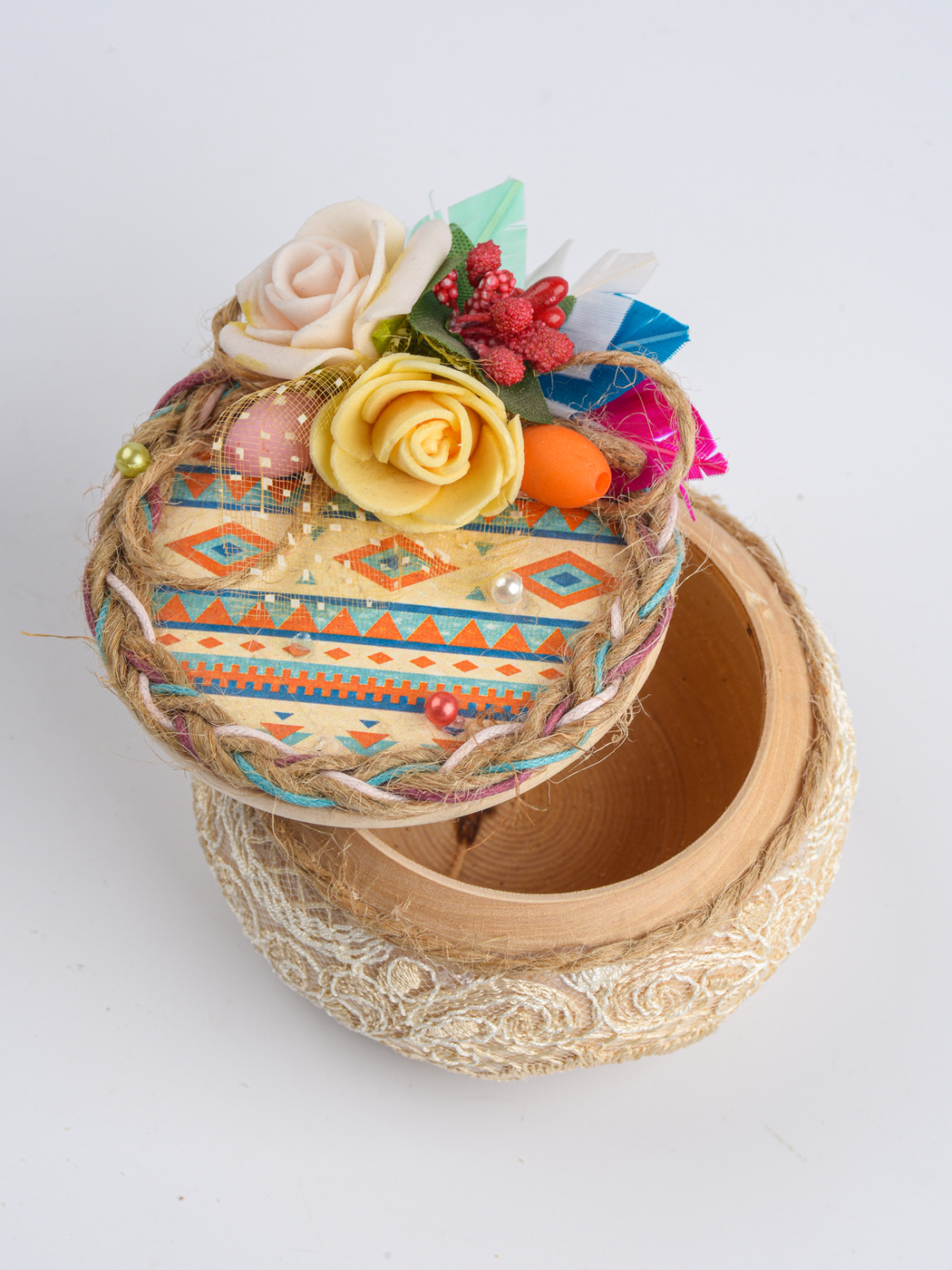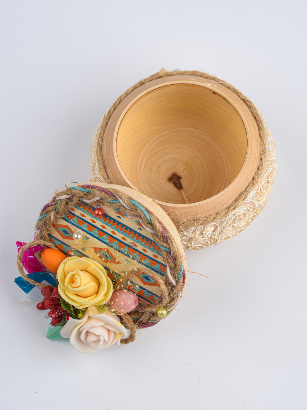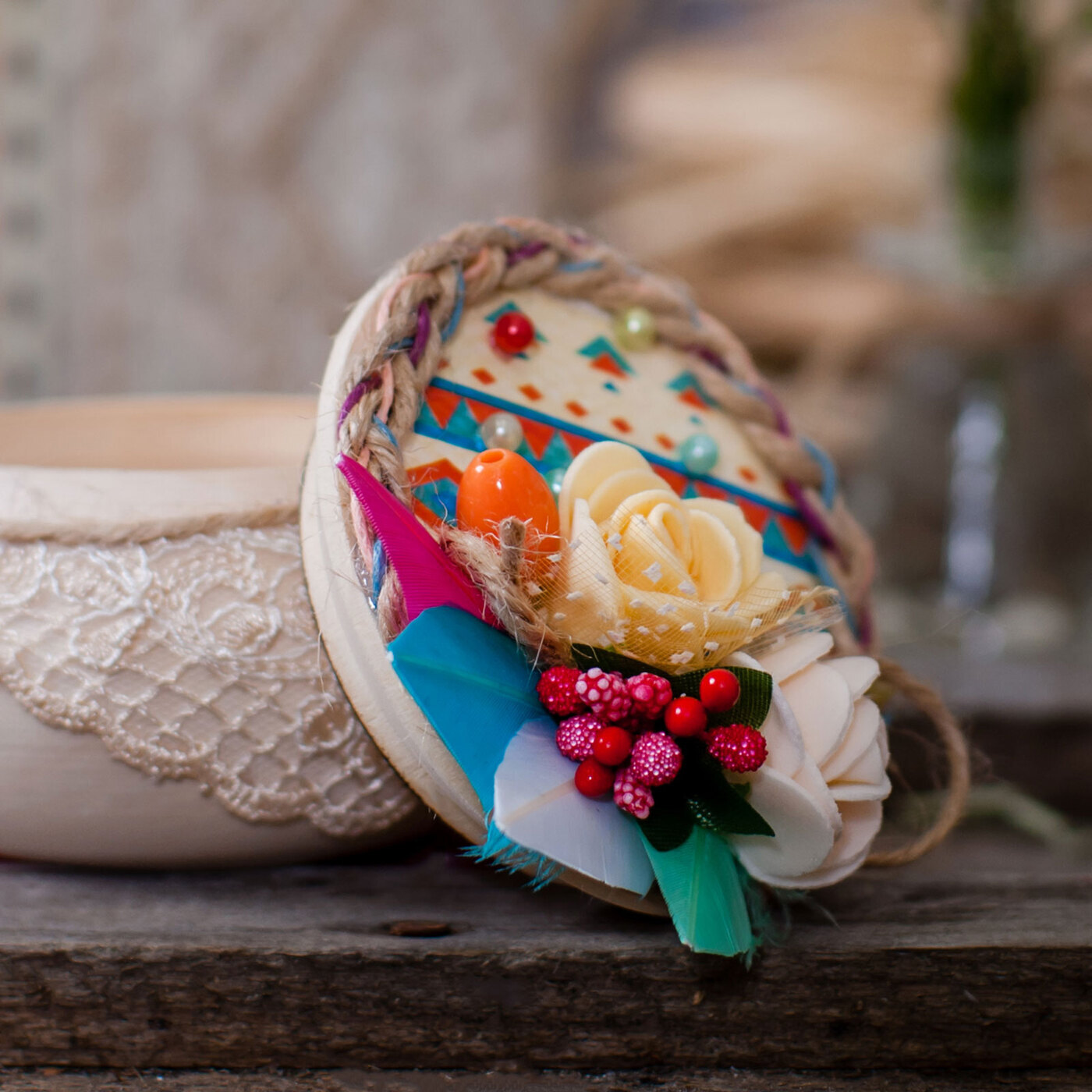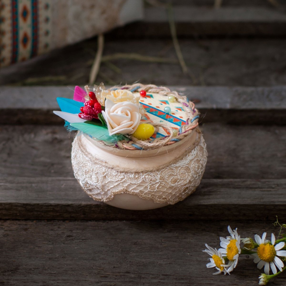 Большая деревянная солонка для свадебного каравая "Бохо" с бежевым кружевом и этническим декором ручной работы