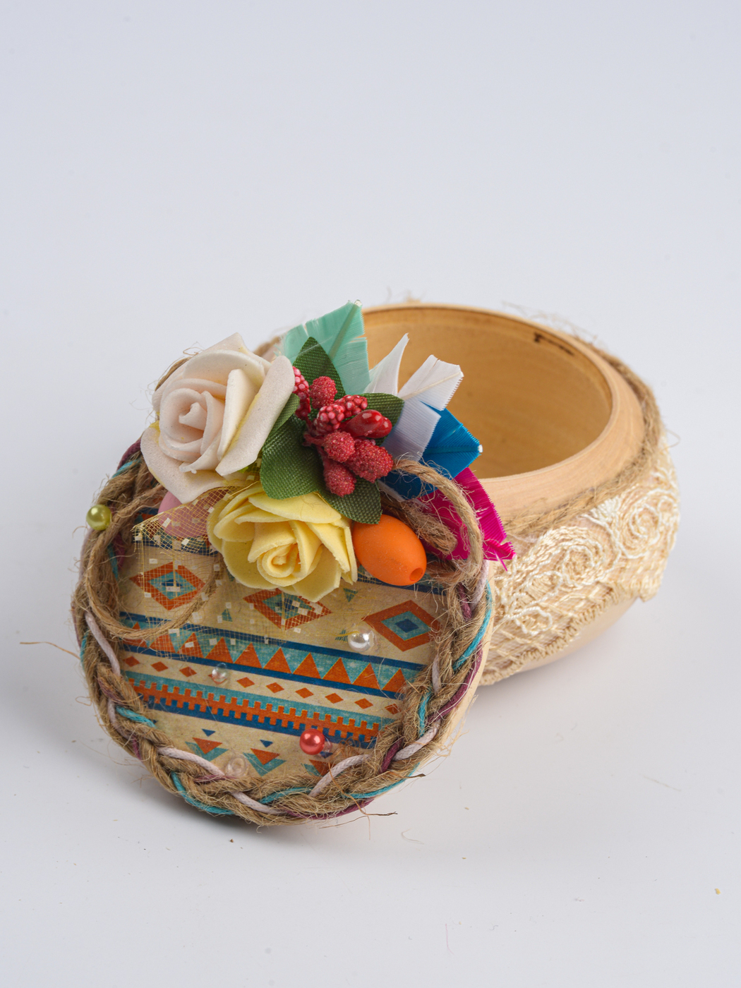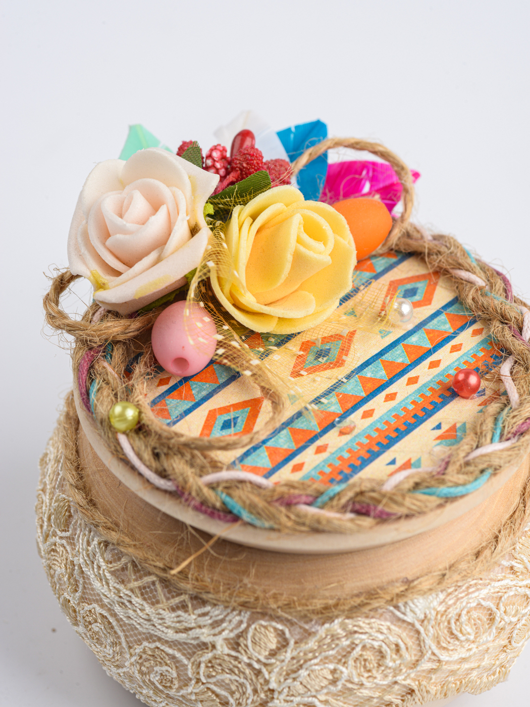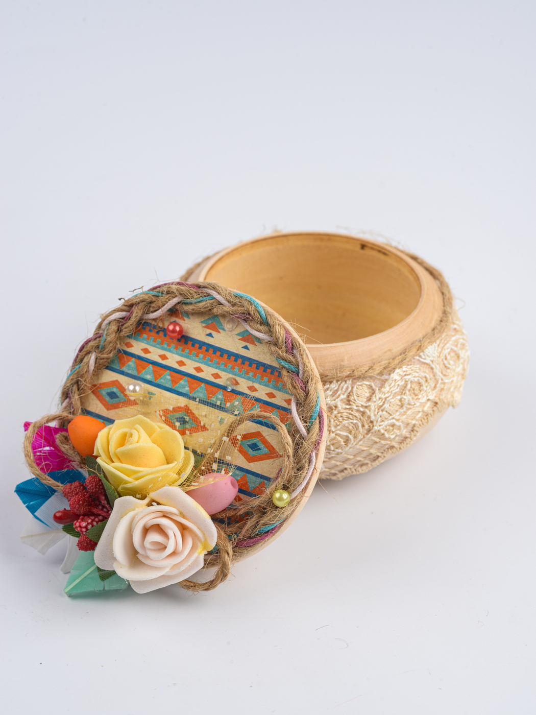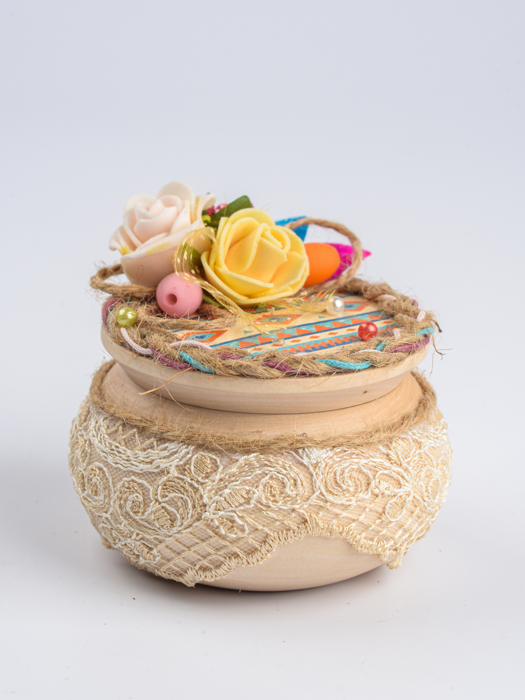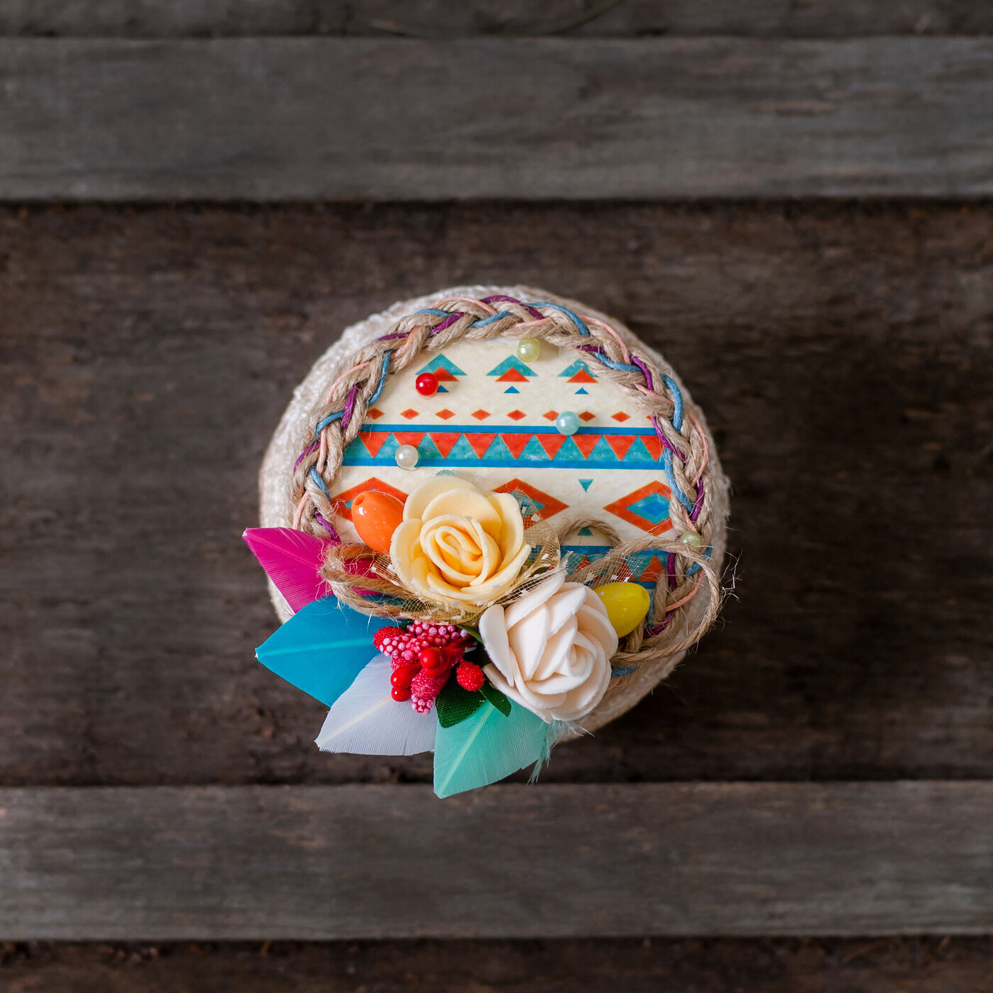 Большая деревянная солонка для свадебного каравая "Бохо" с бежевым кружевом и этническим декором ручной работы