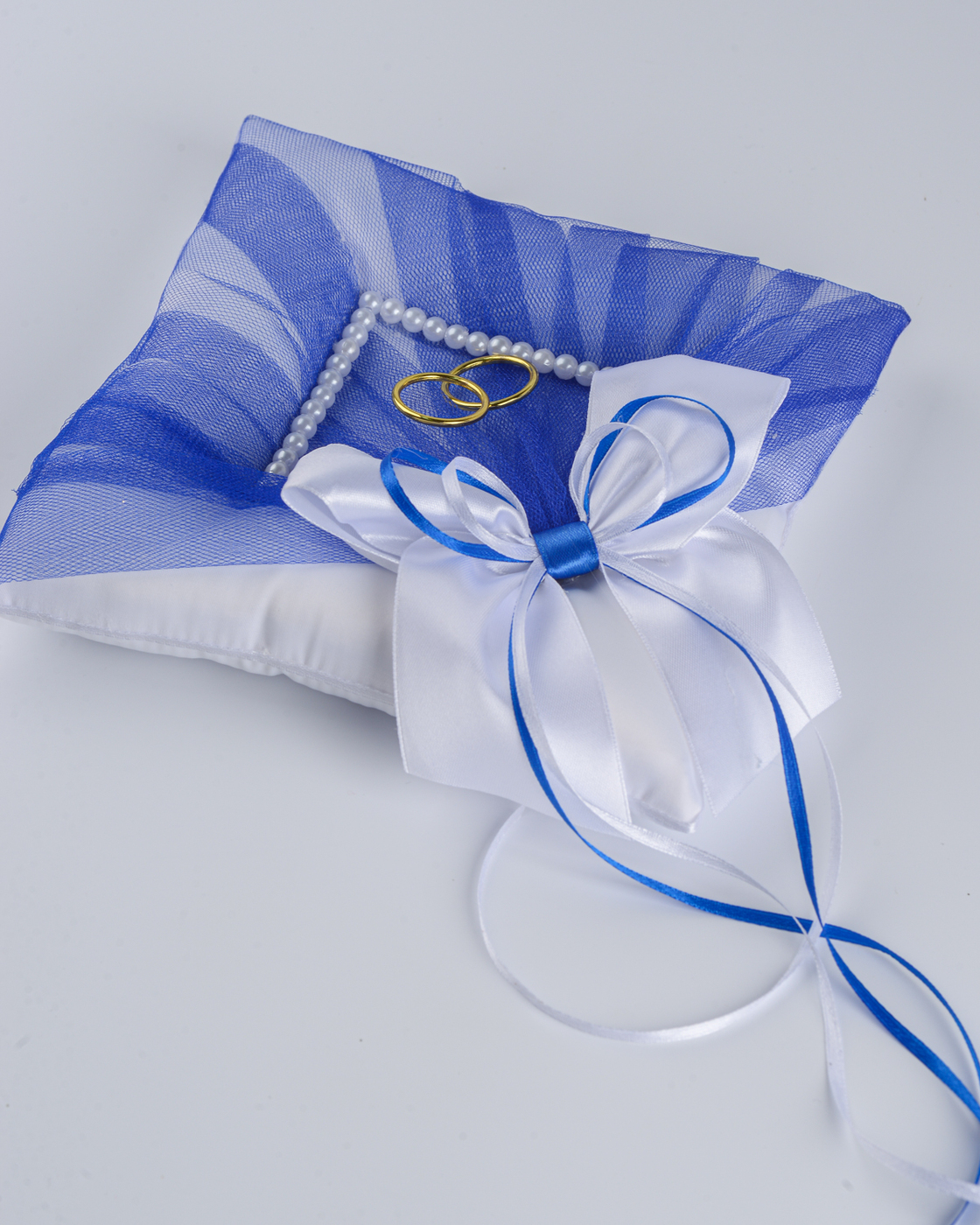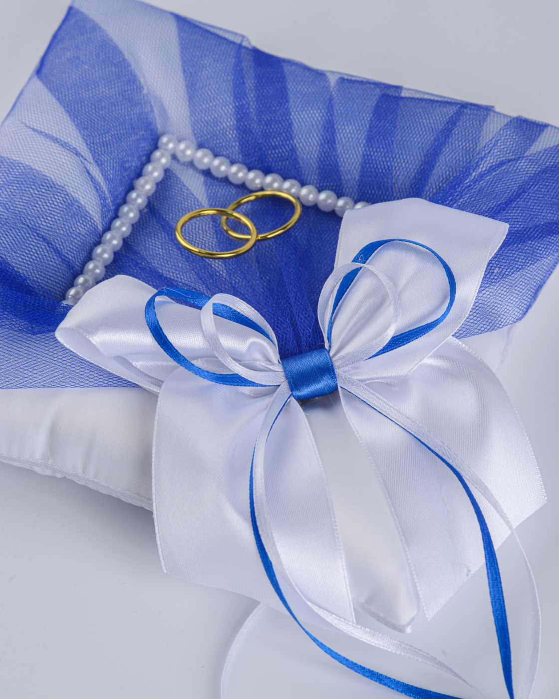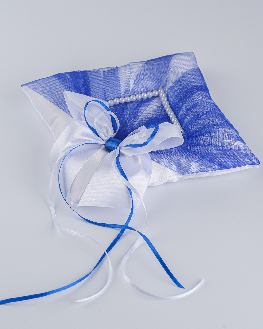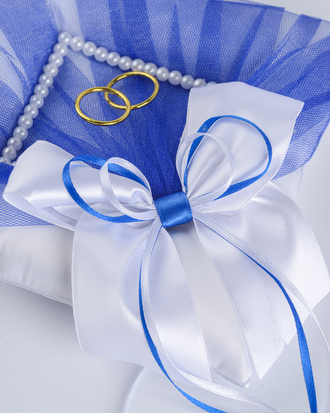 Свадебная подушечка для обручальных колец "Амелия" из белого атласа с бантом и декором из синего фатина и жемчужных бусин