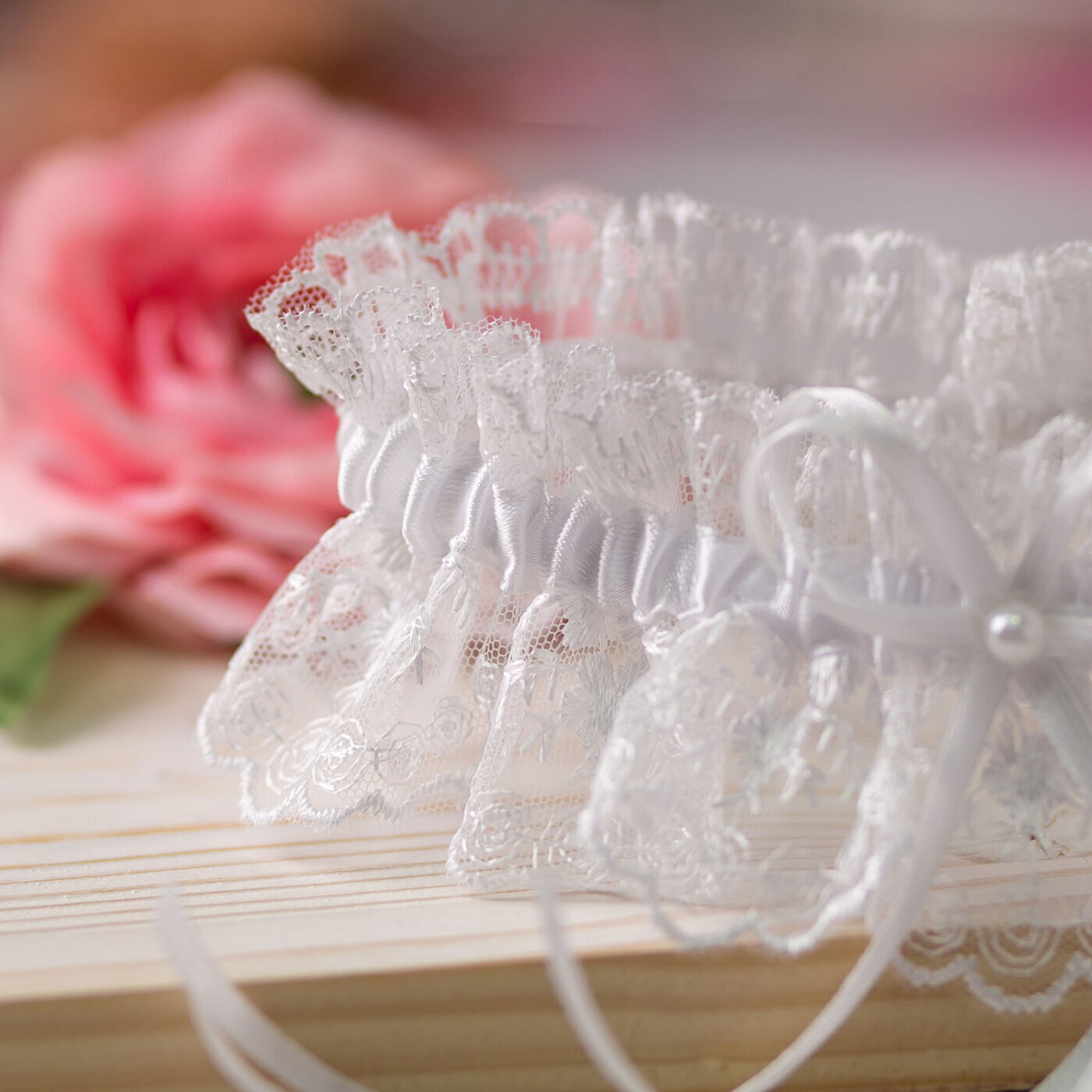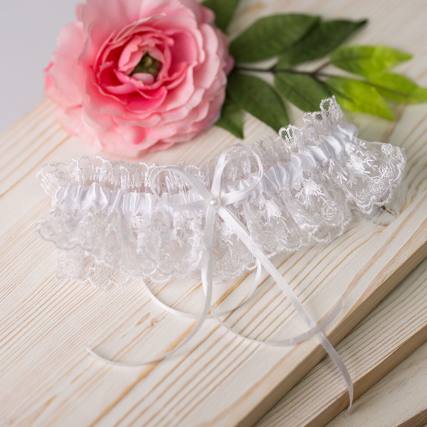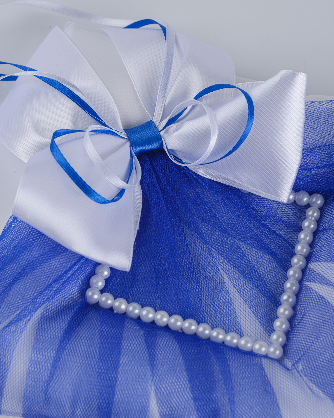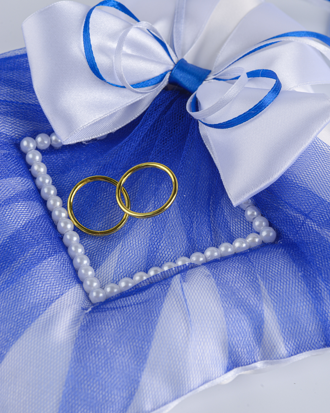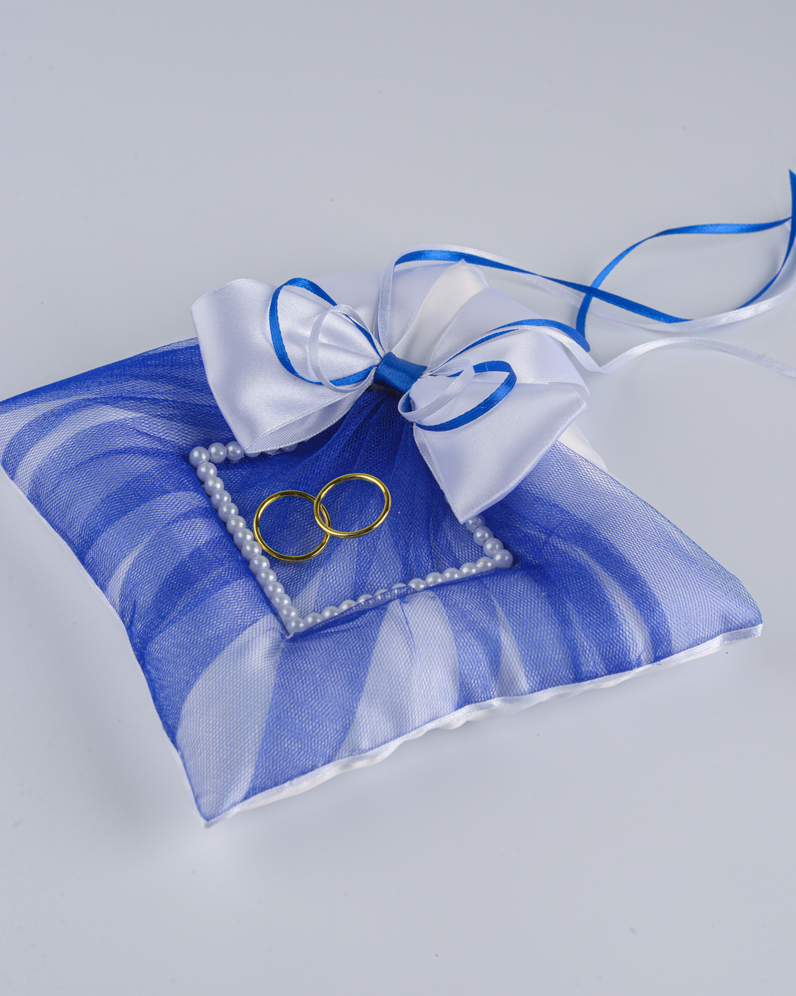 Свадебная подушечка для обручальных колец "Амелия" из белого атласа с бантом и декором из синего фатина и жемчужных бусин