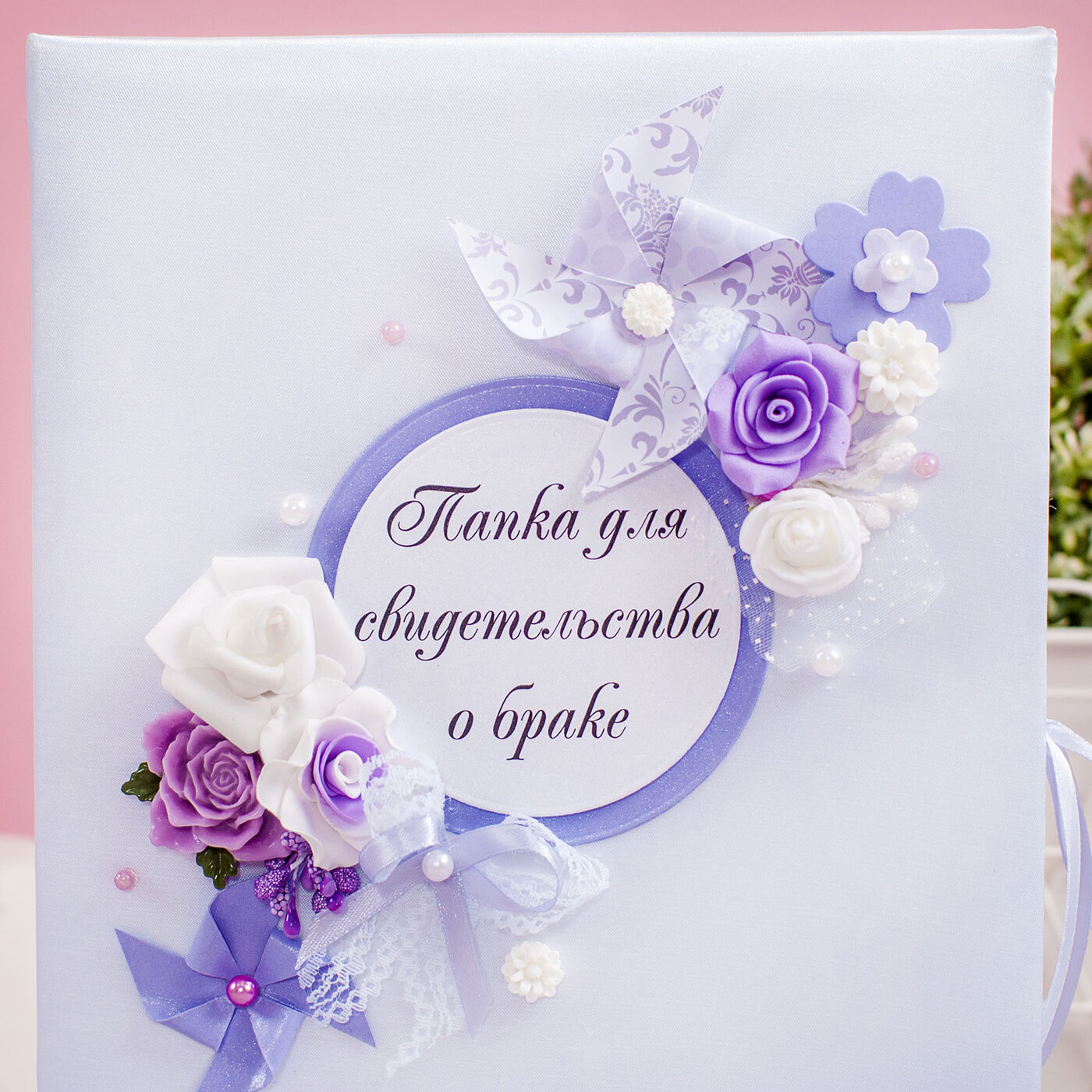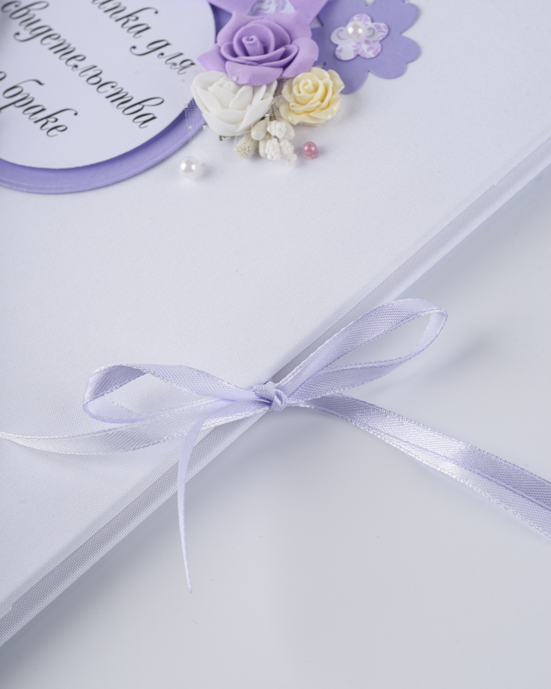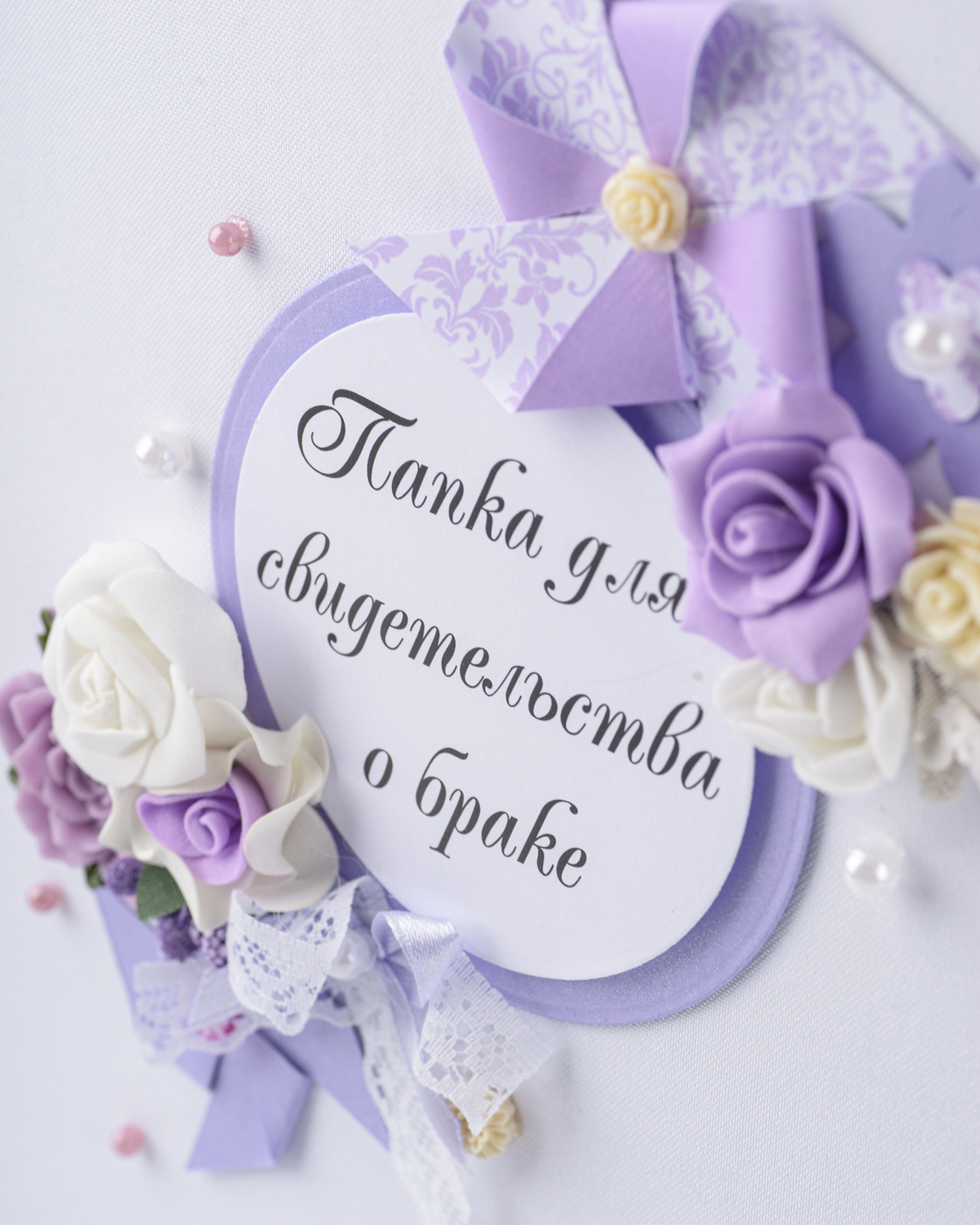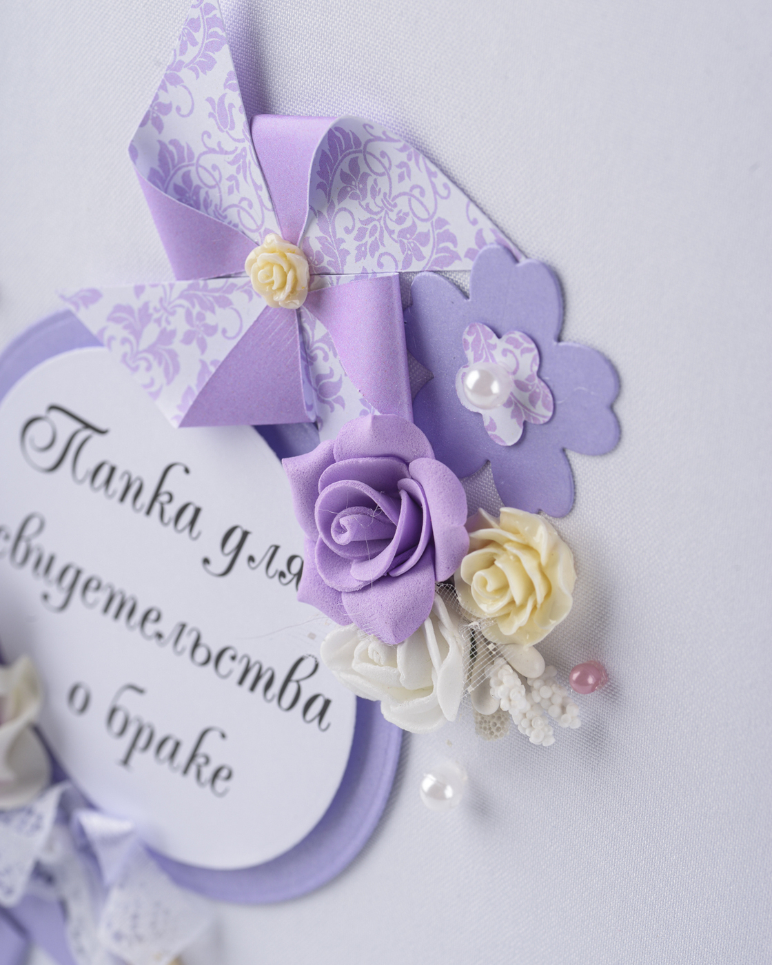 Папка для свидетельства о браке "Сюита" с белыми и сиреневыми розами из латекса, ветрячками, белым кружевом и жемчужными бусинами