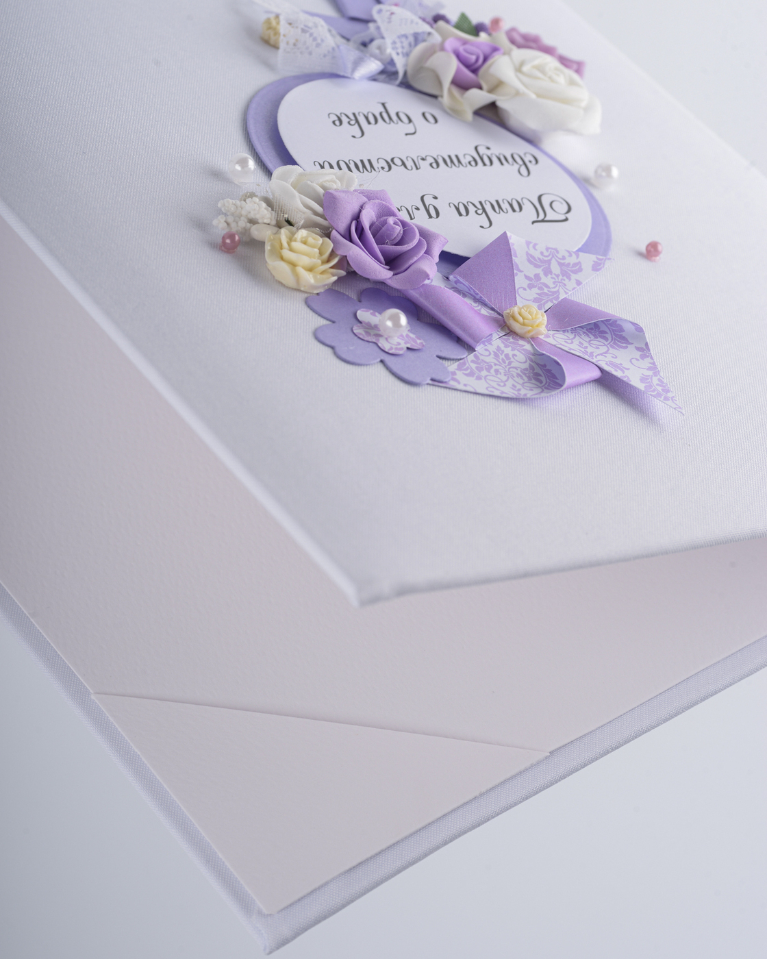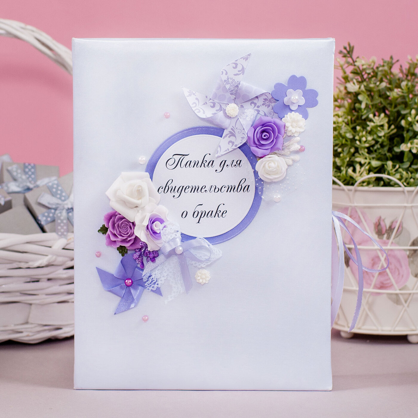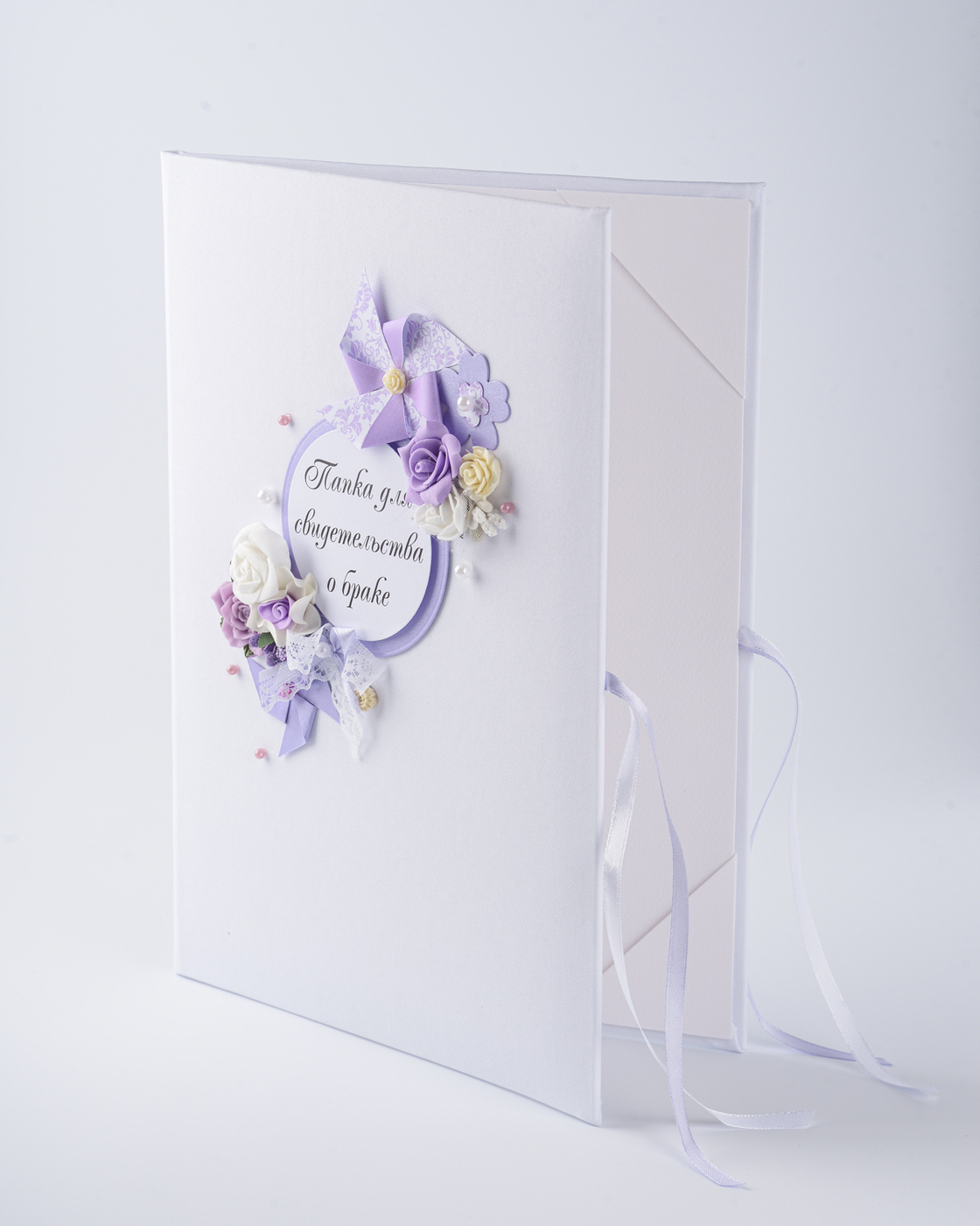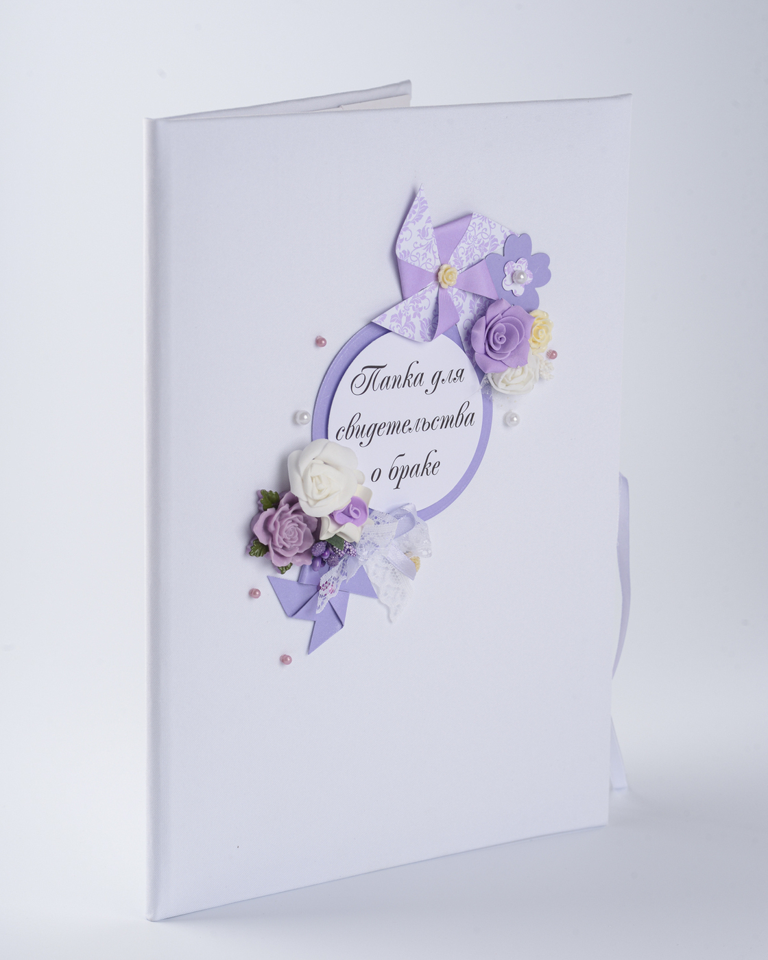 Папка для свидетельства о браке "Сюита" с белыми и сиреневыми розами из латекса, ветрячками, белым кружевом и жемчужными бусинами