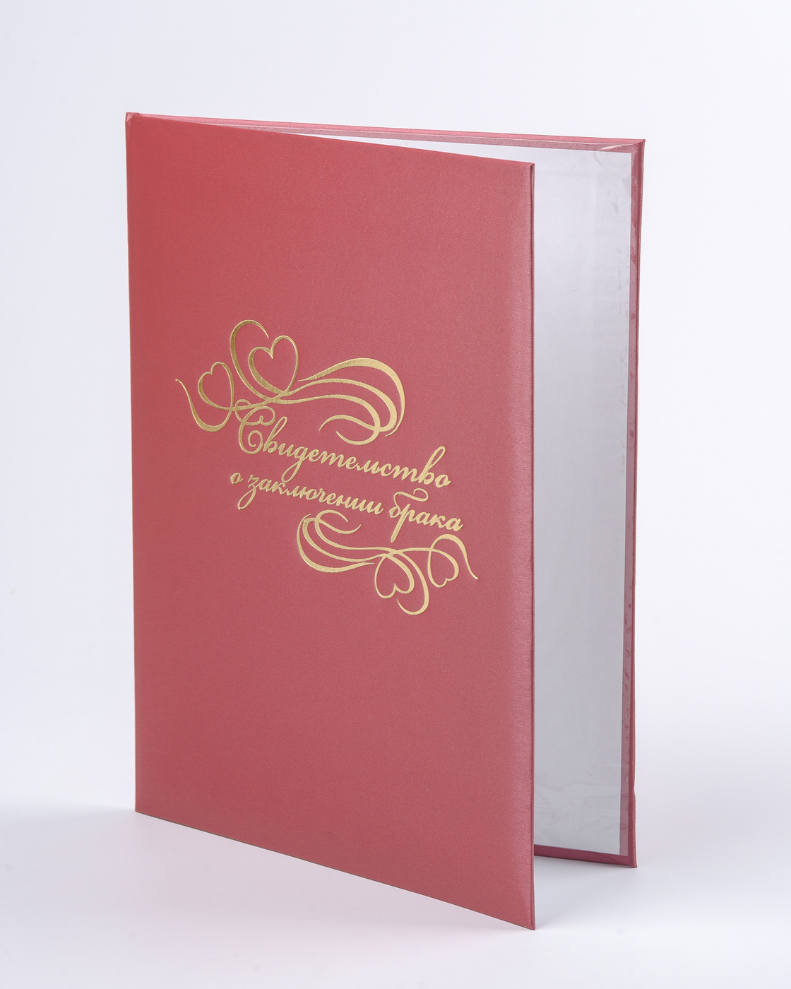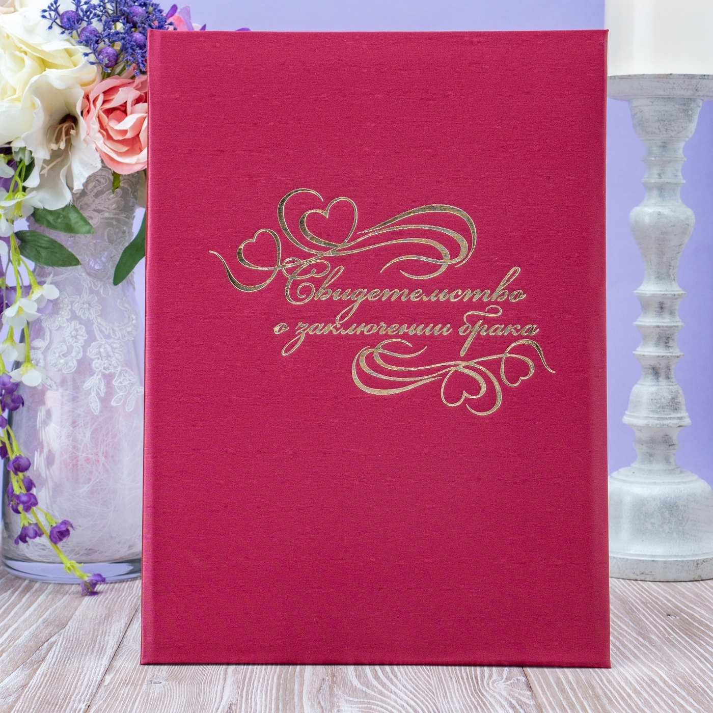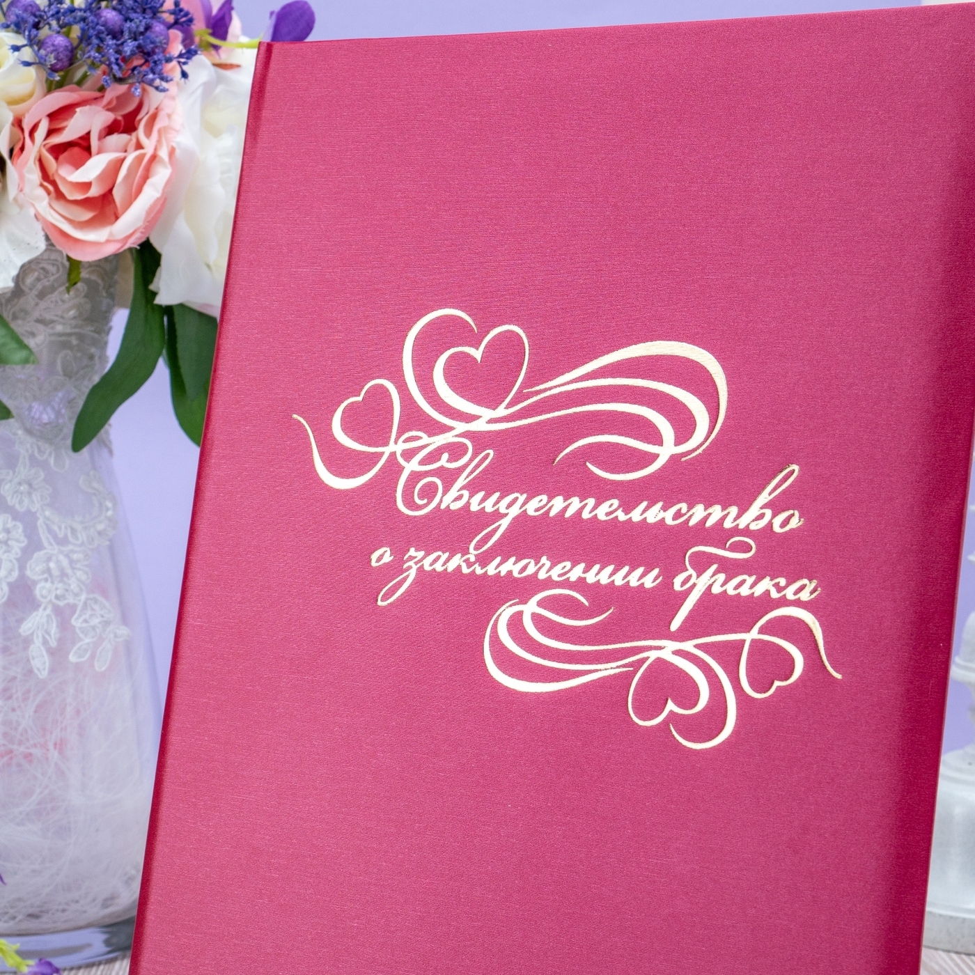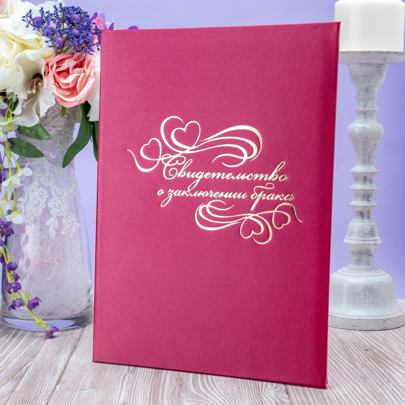 Яркая папка для свидетельства о браке вишневого цвета в твердом переплете с золотой надписью на обложке и ажурными вензелями