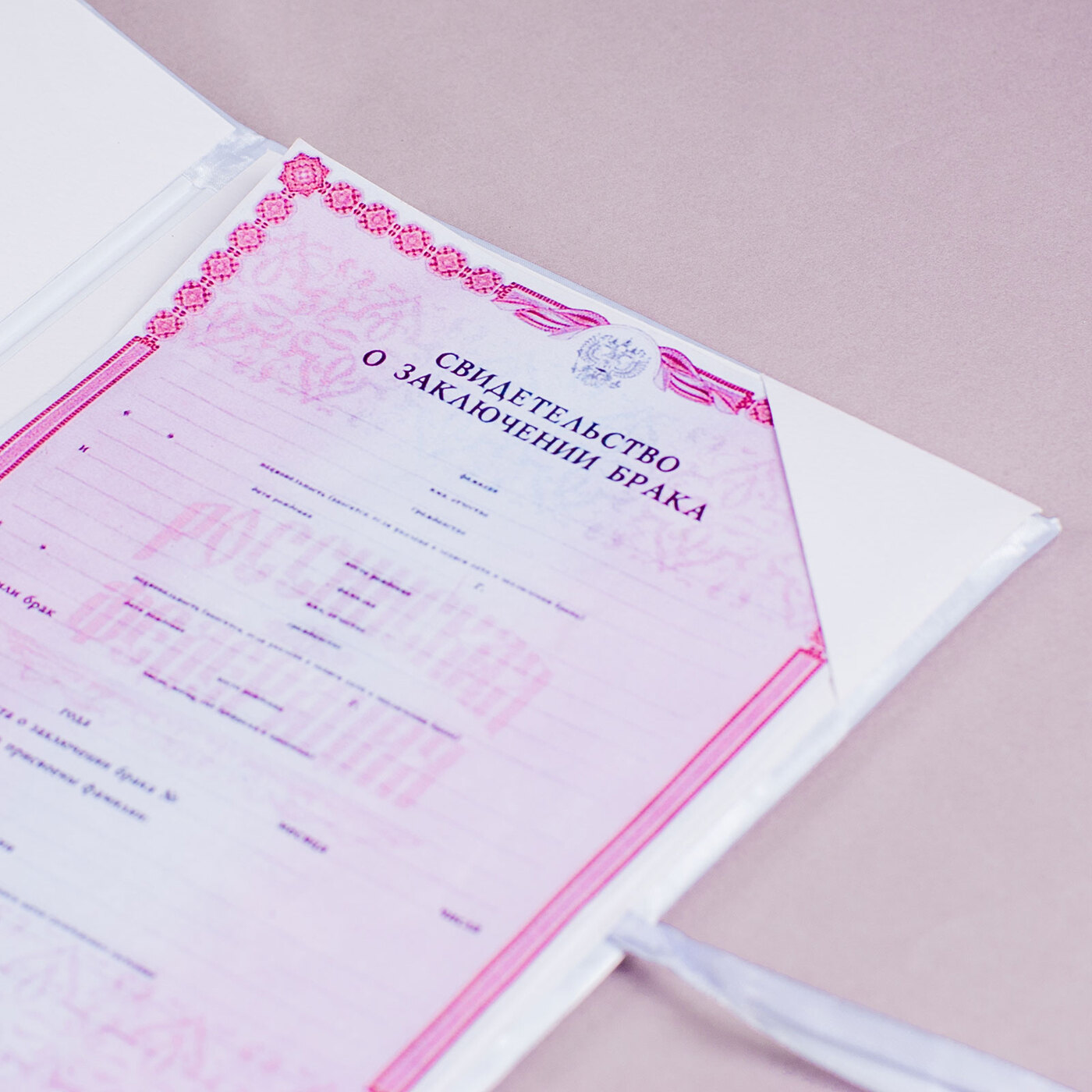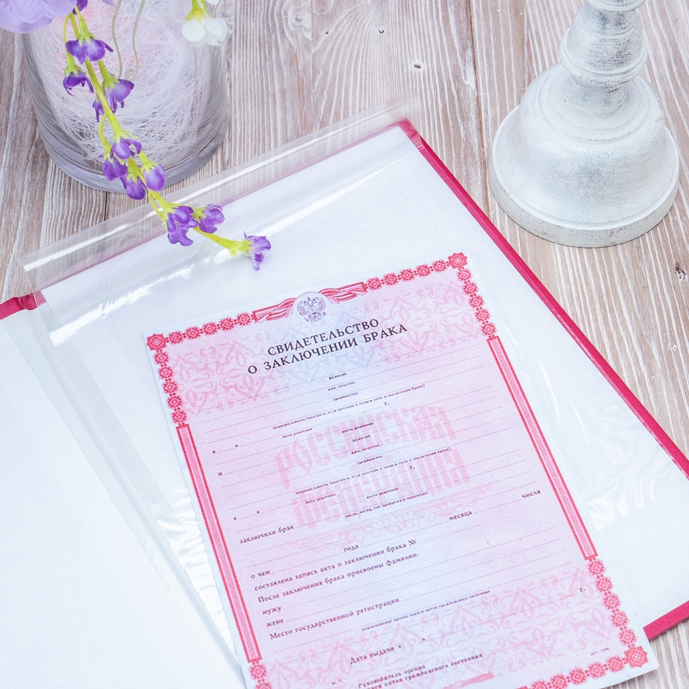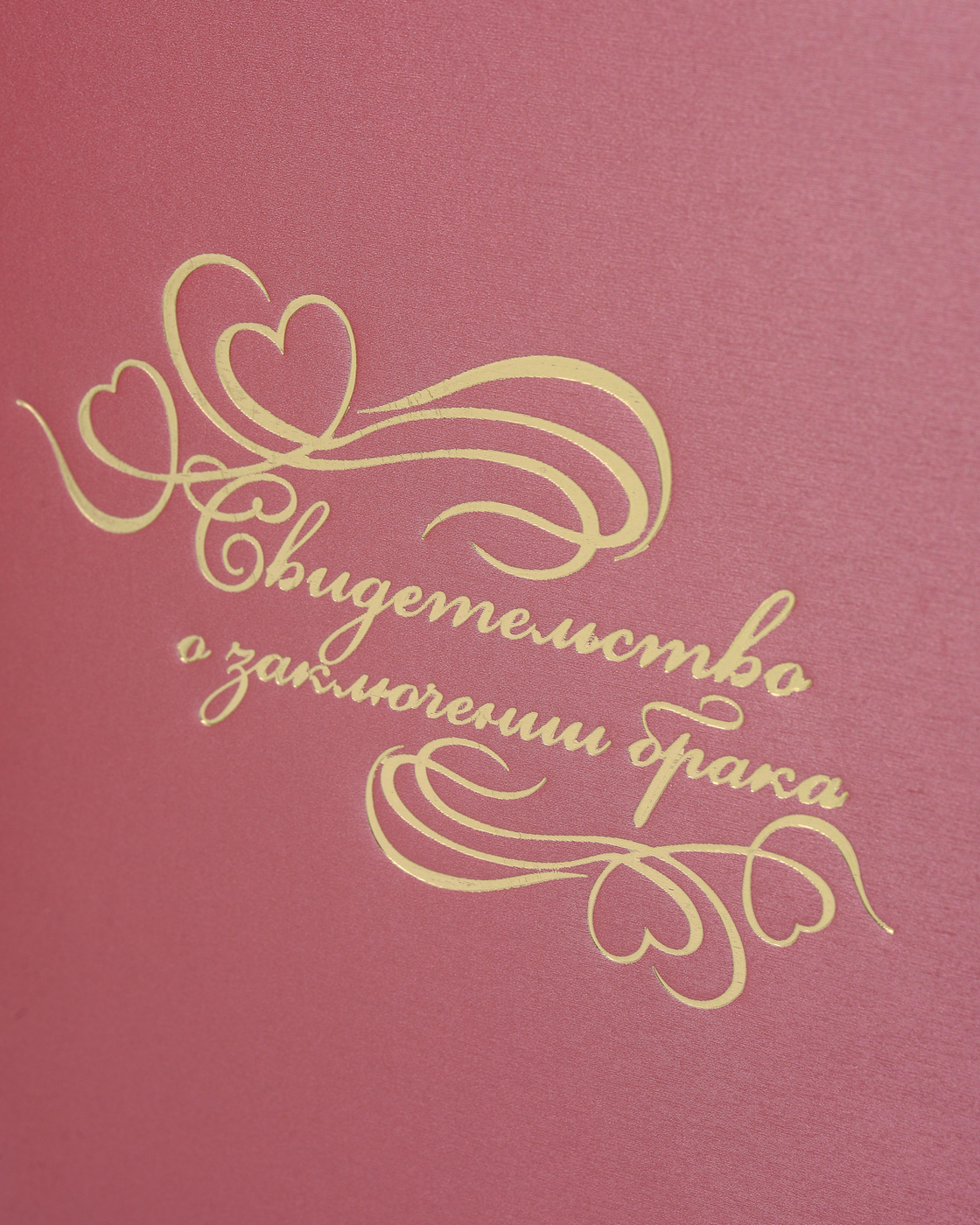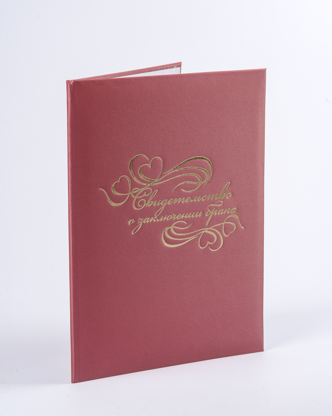 Яркая папка для свидетельства о браке вишневого цвета в твердом переплете с золотой надписью на обложке и ажурными вензелями
