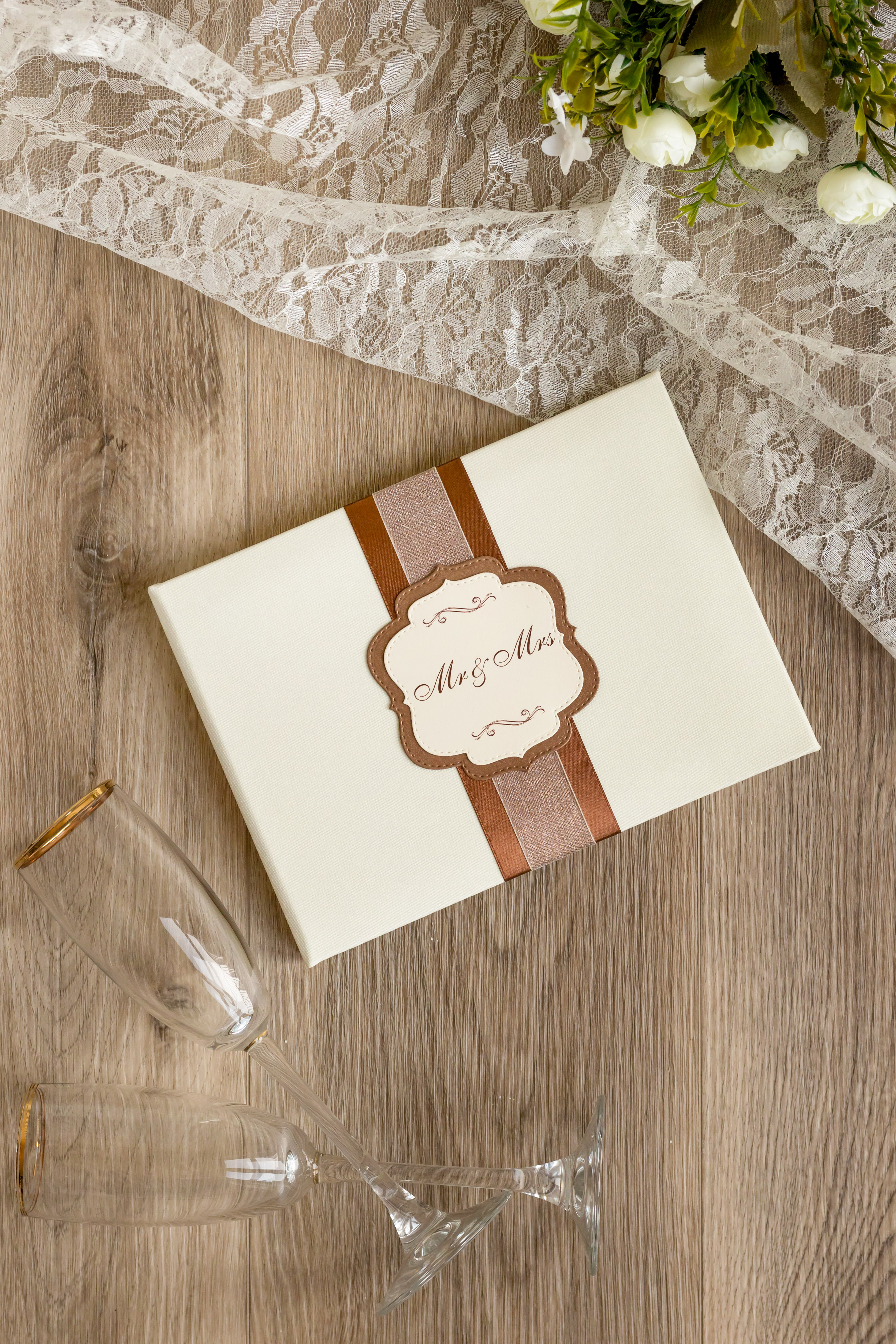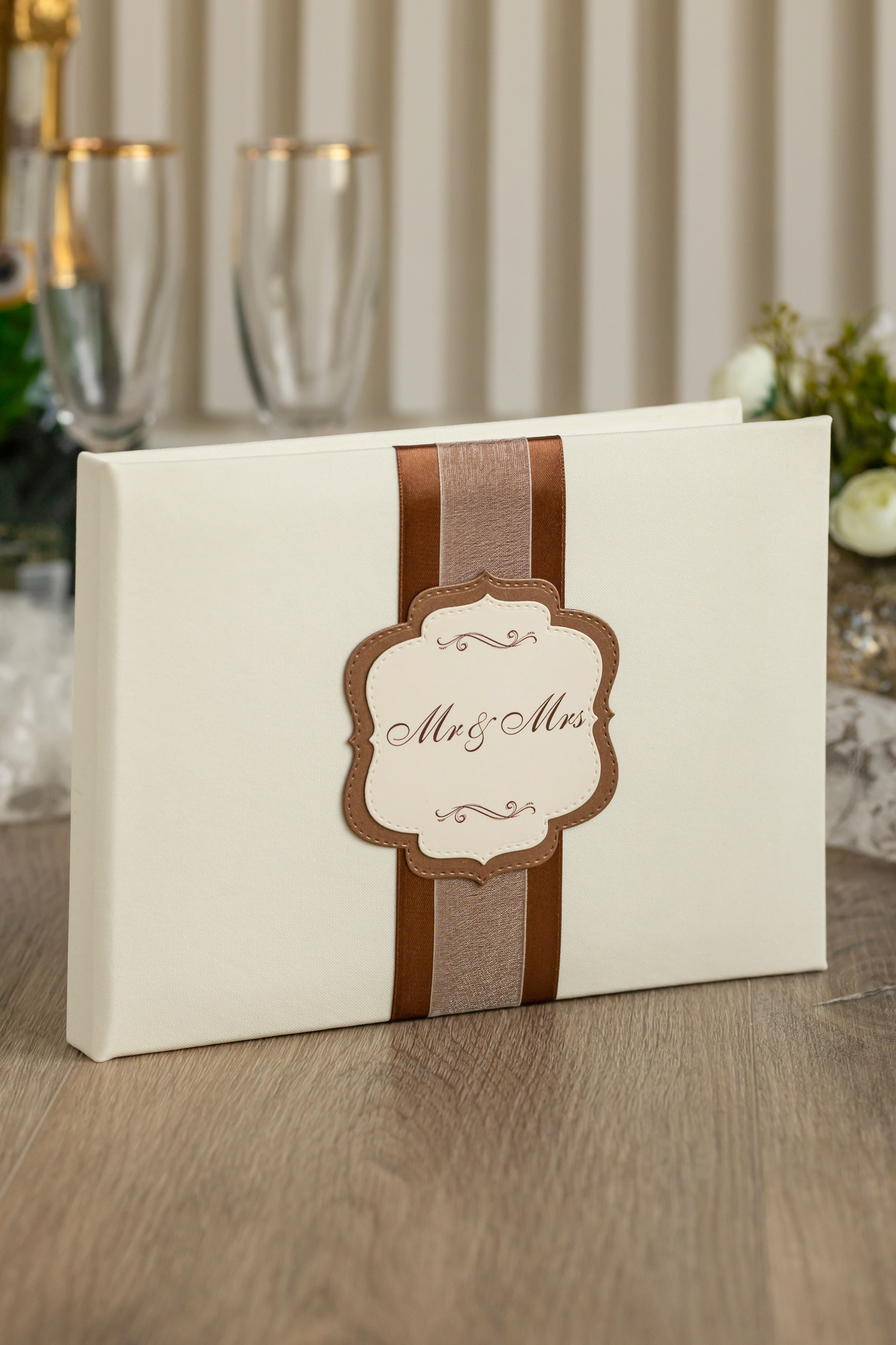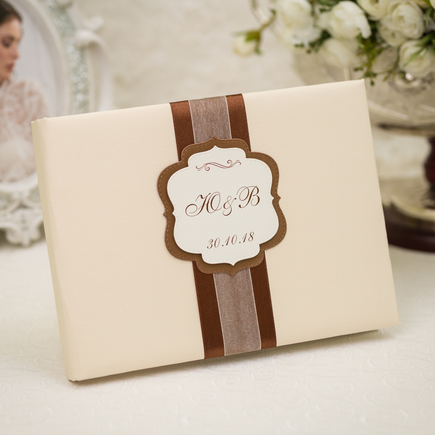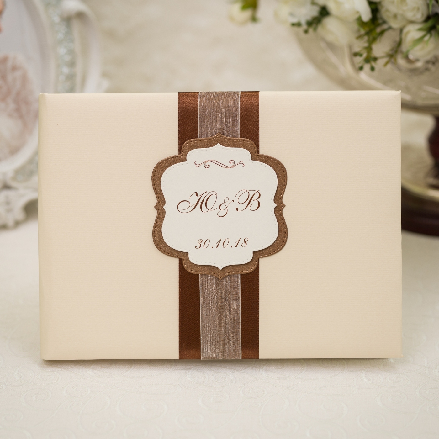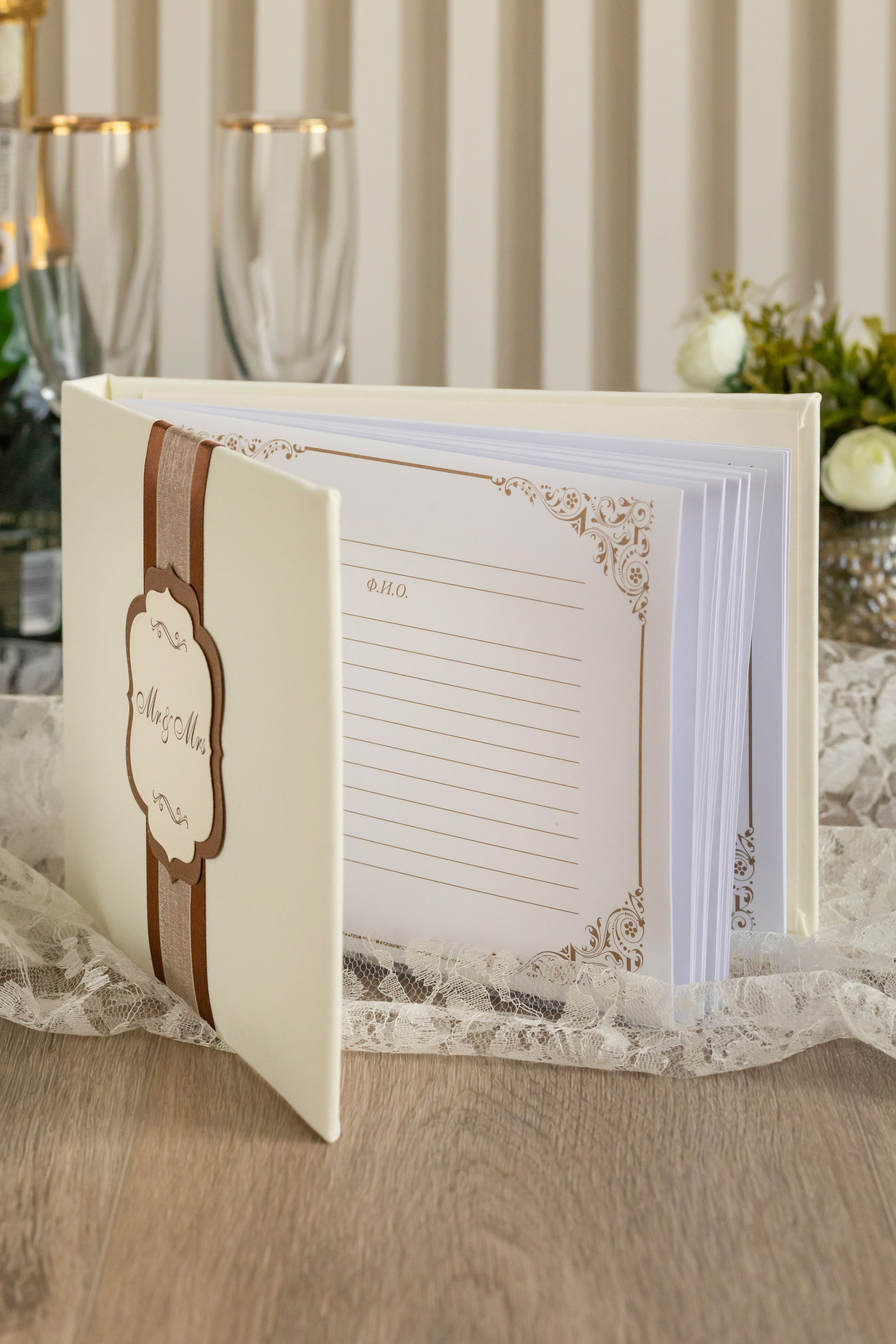 Книга свадебных пожеланий "Французская ваниль" цвета слоновой кости с коричневой лентой из атласа и фигурной табличкой на обложке