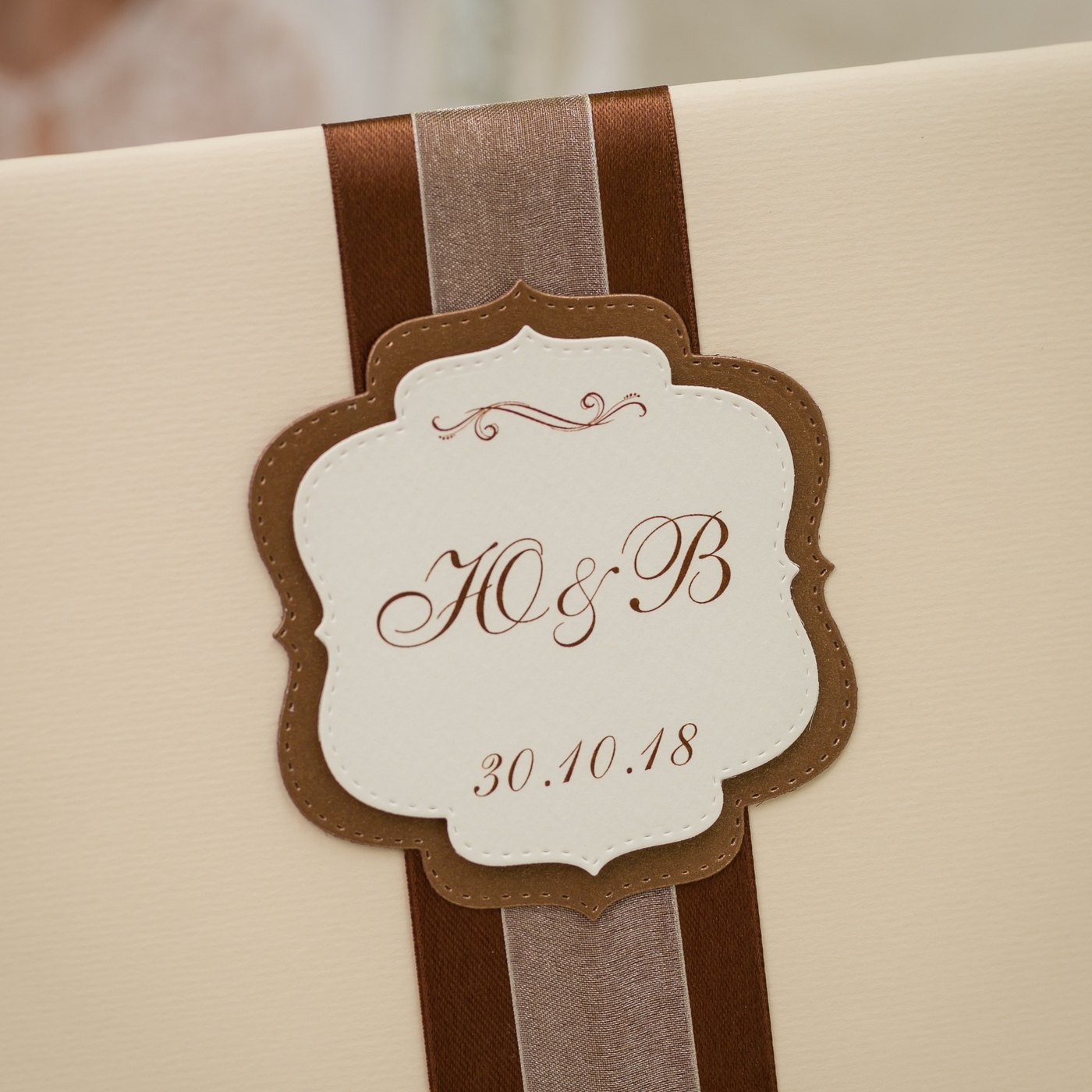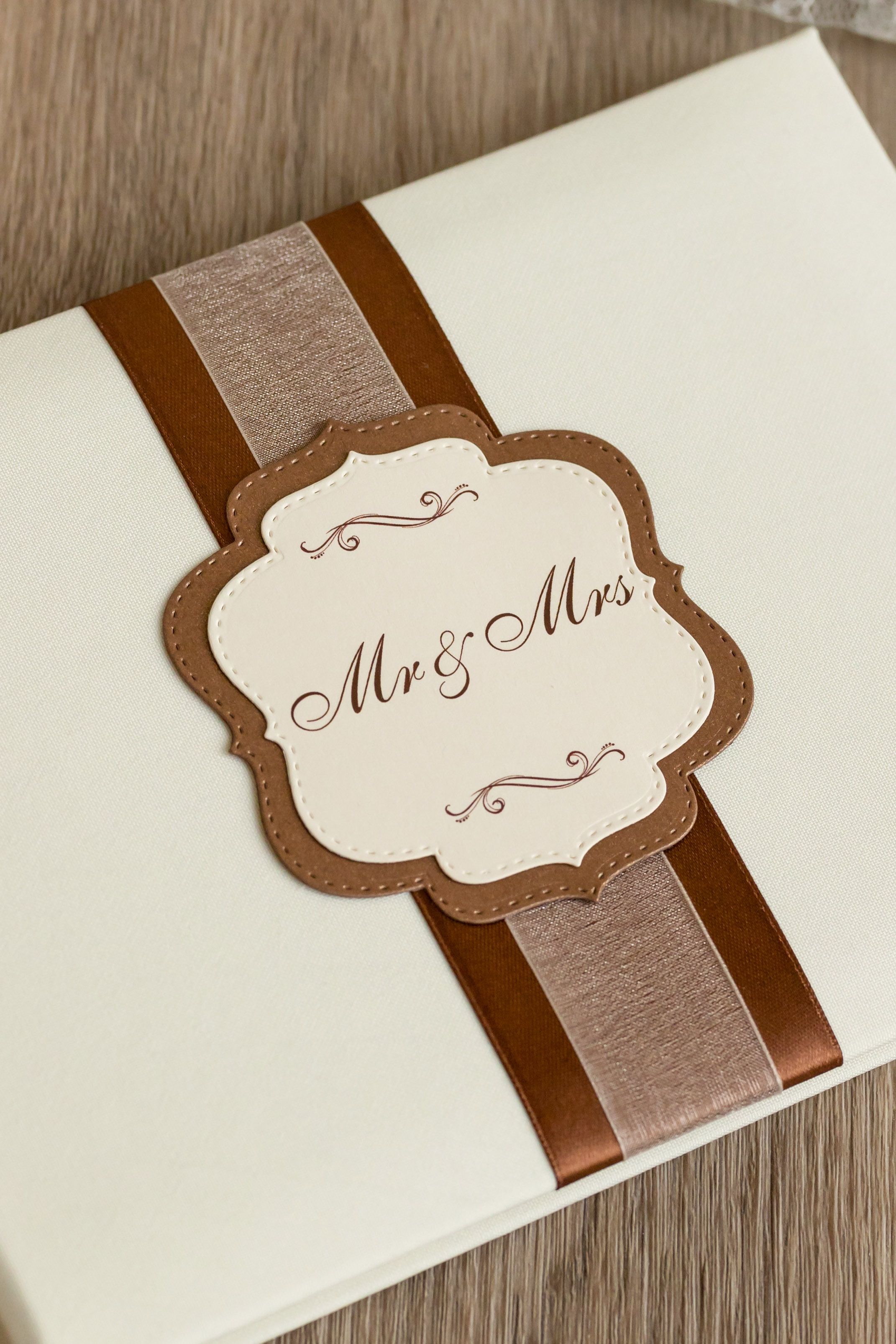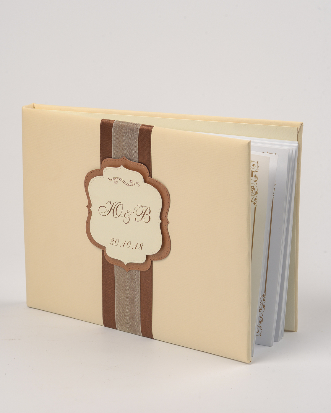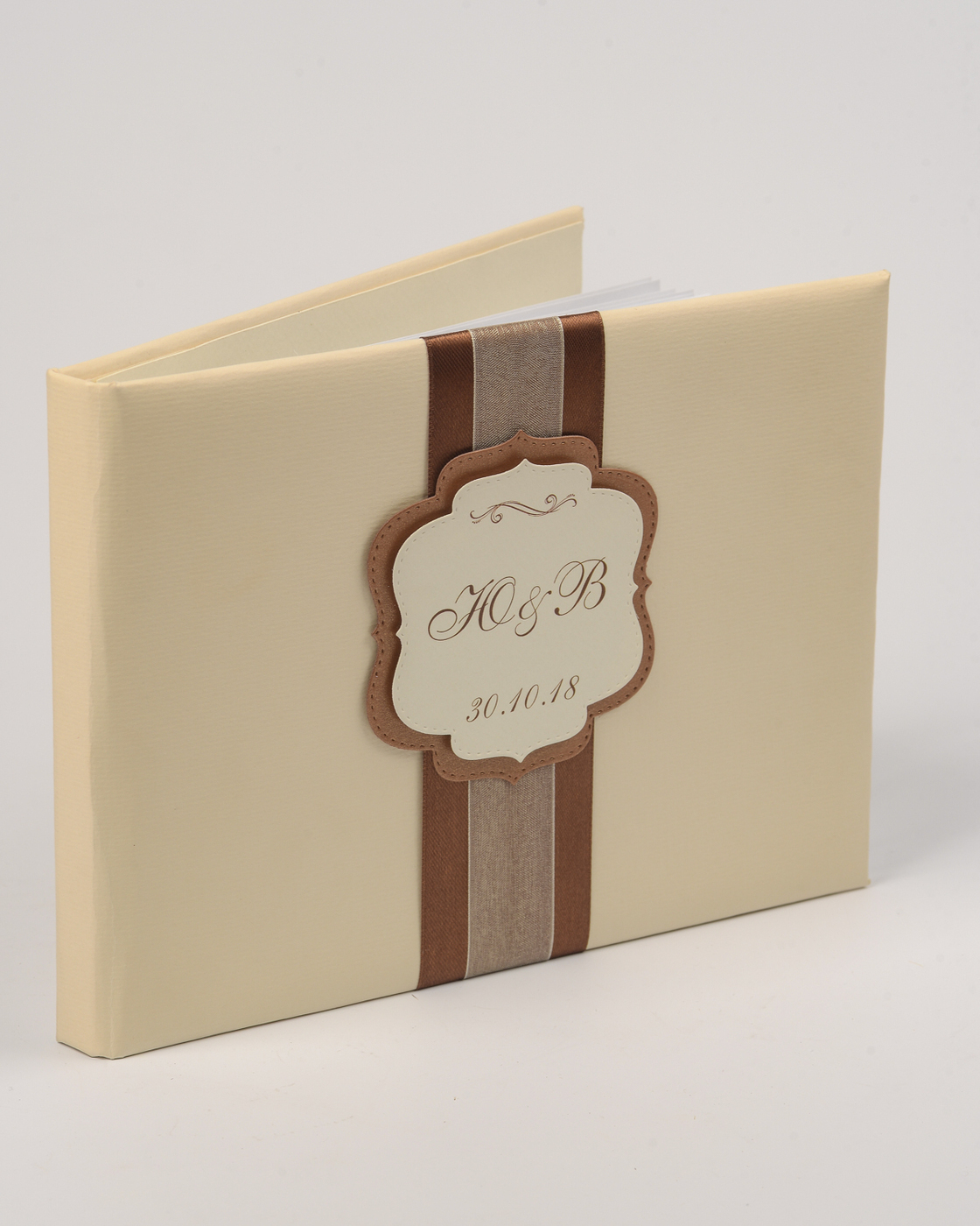 Книга свадебных пожеланий "Французская ваниль" цвета слоновой кости с коричневой лентой из атласа и фигурной табличкой на обложке