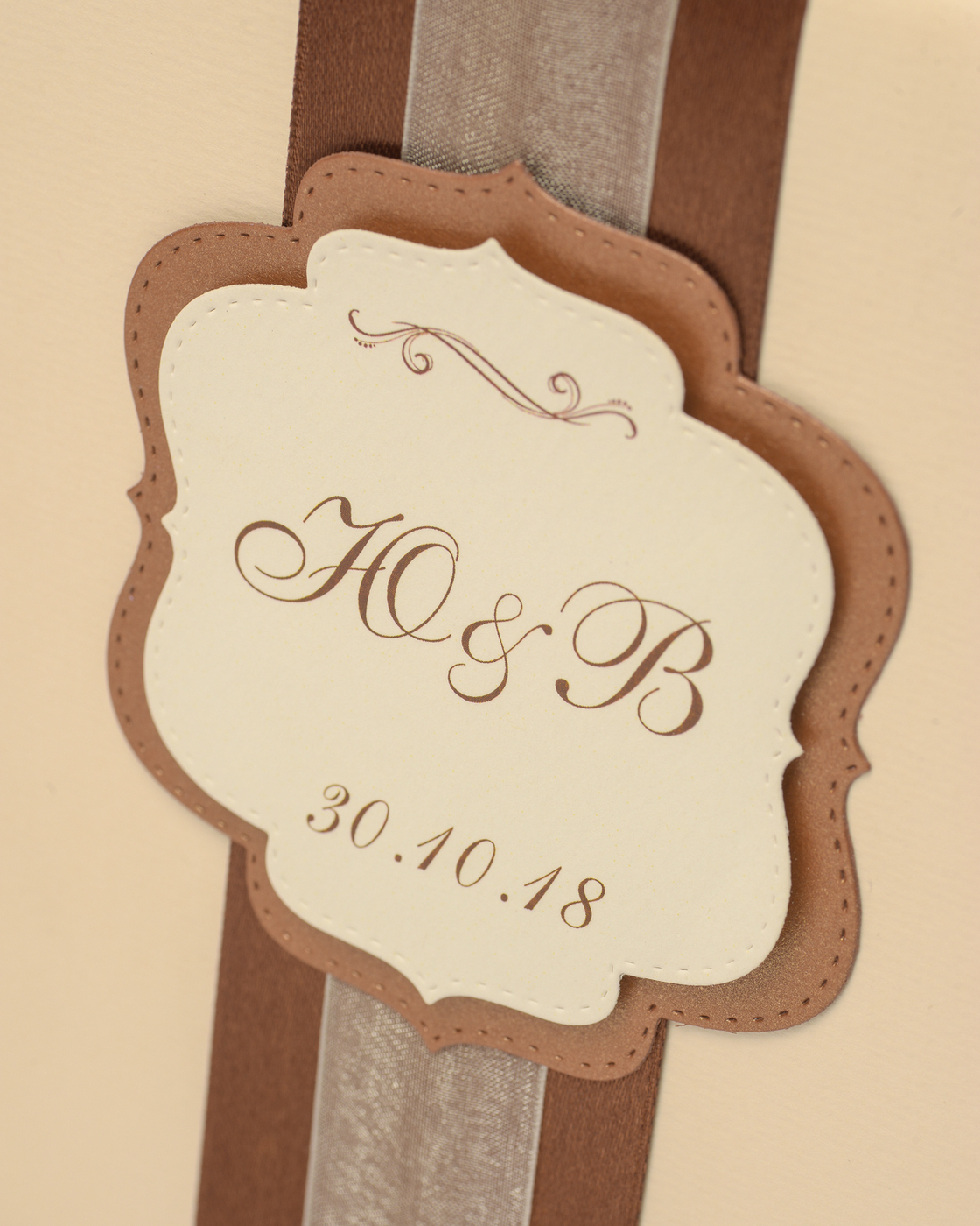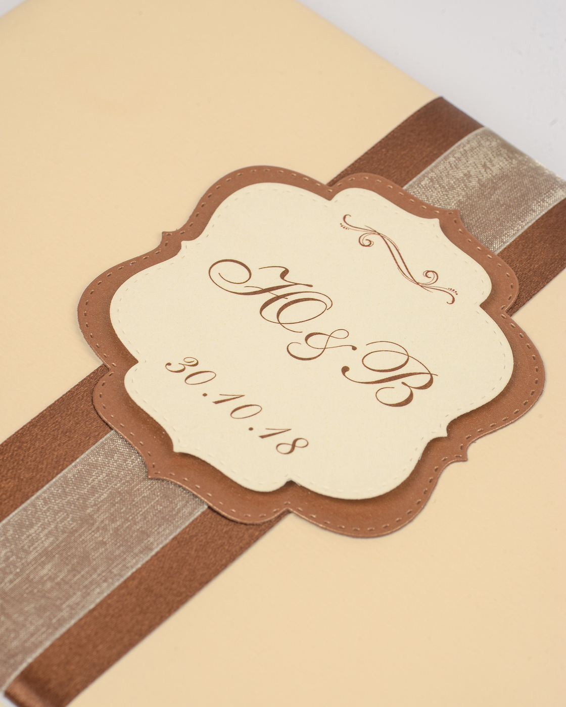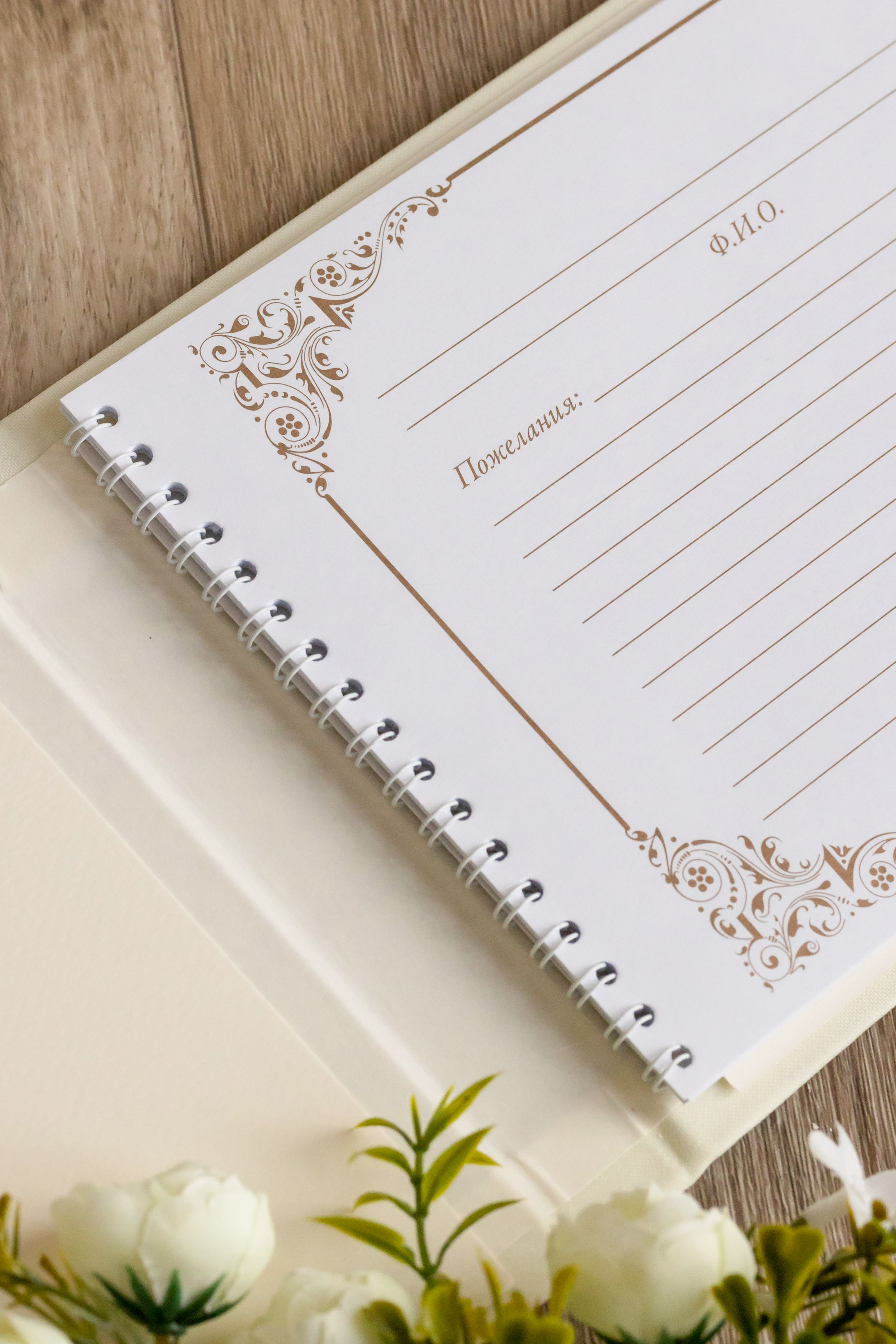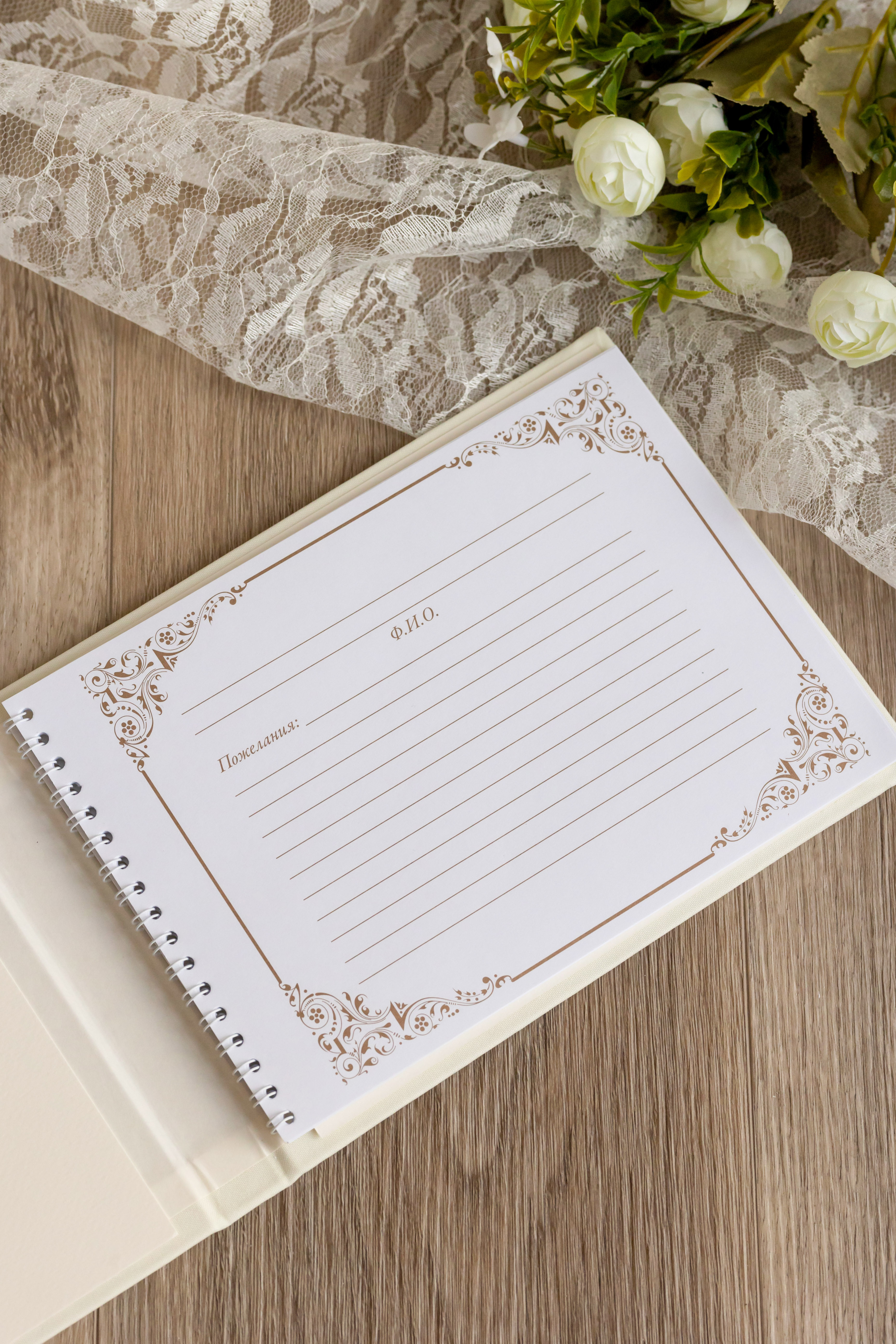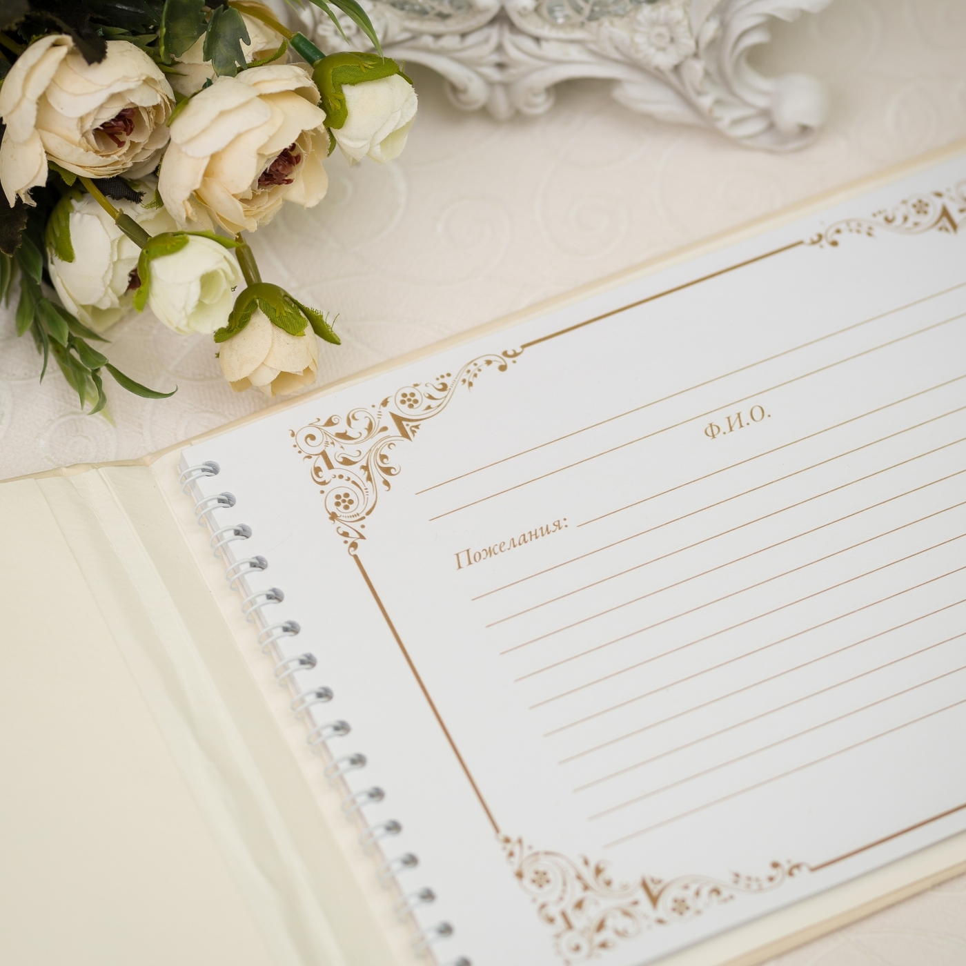 Книга свадебных пожеланий "Французская ваниль" цвета слоновой кости с коричневой лентой из атласа и фигурной табличкой на обложке