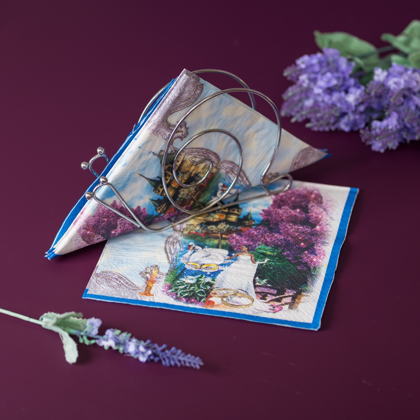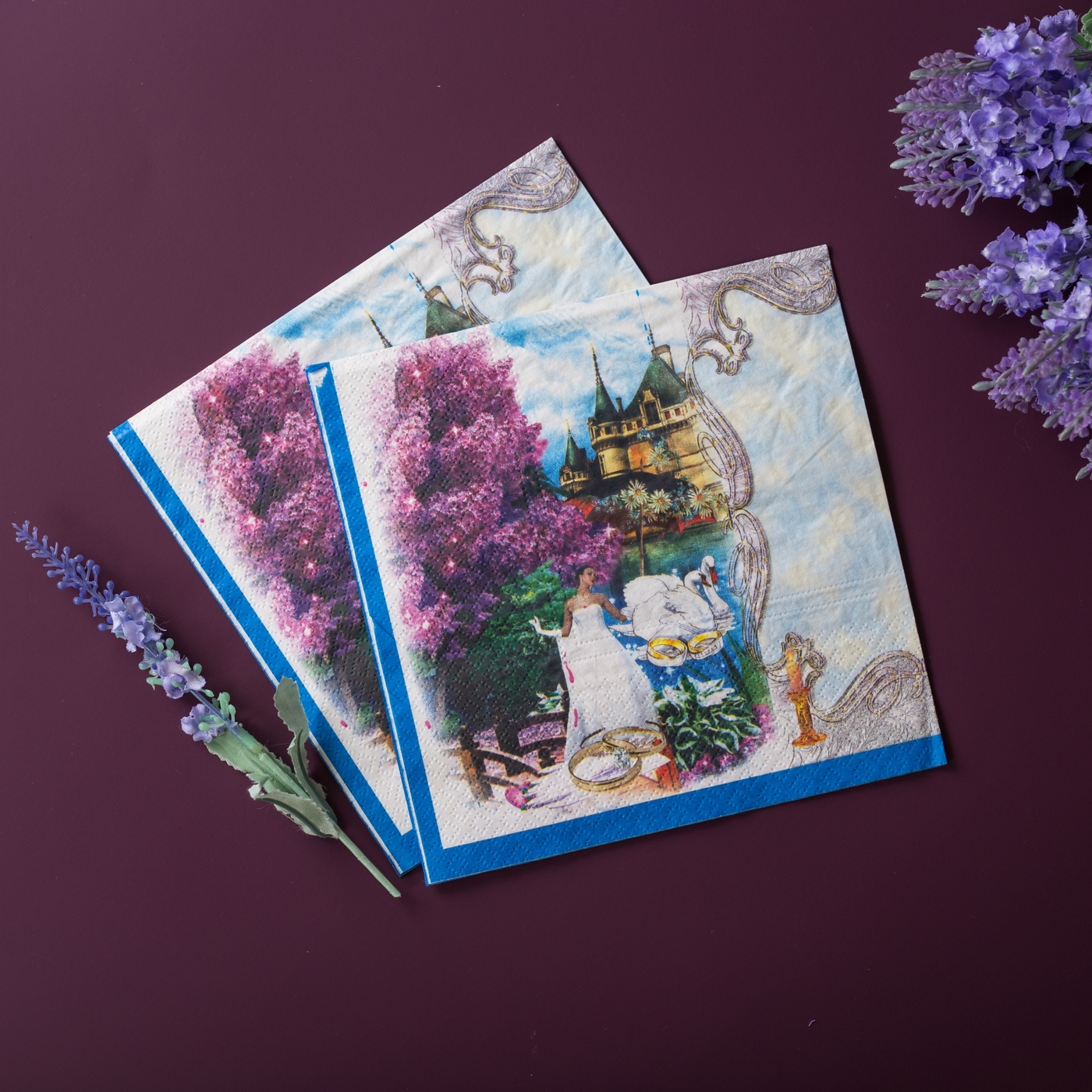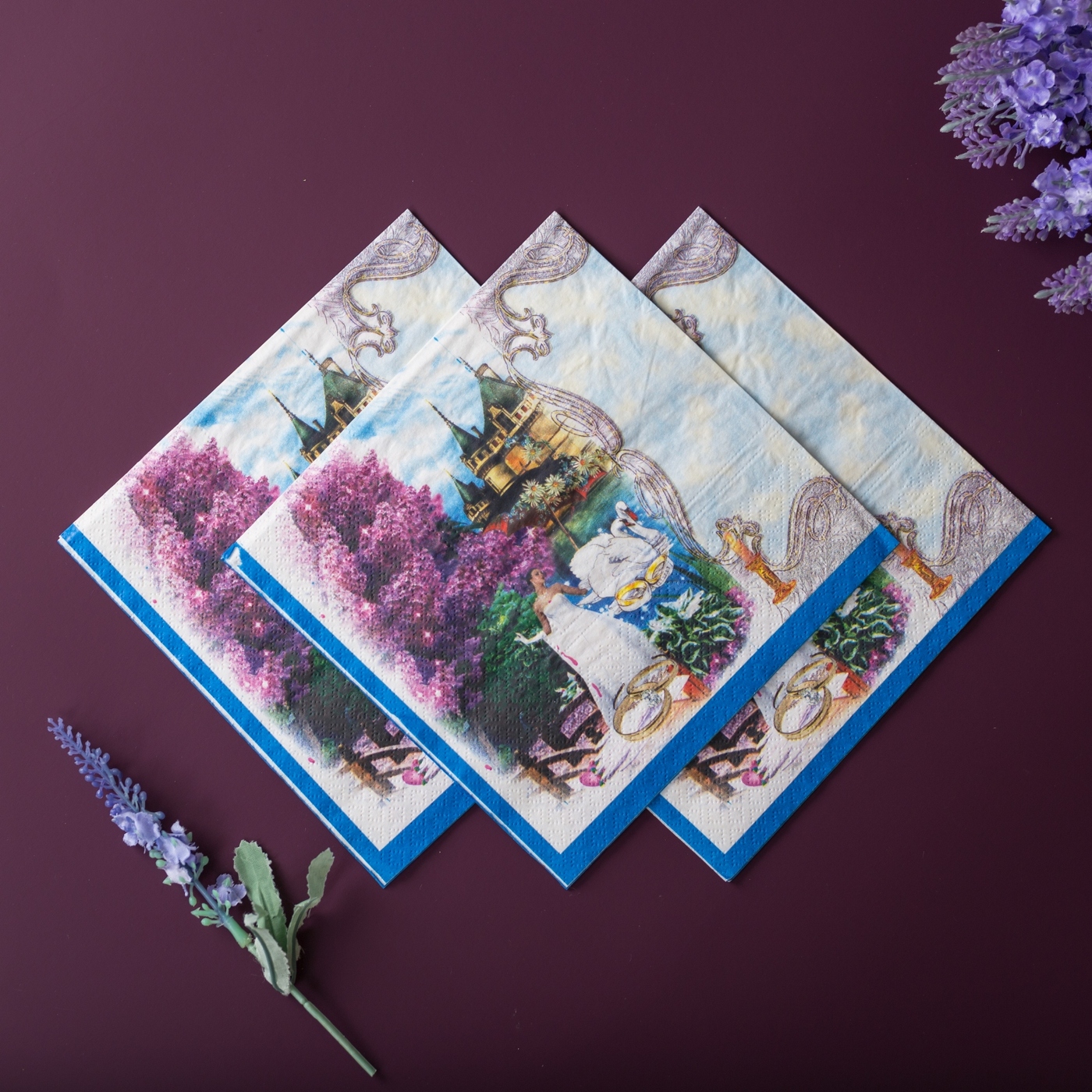 Салфетки праздничные "Свадьба во Флоренции" в лавандовых тонах, с рисунком замка, невесты, белых лебедей и кольцами, 3 пачки