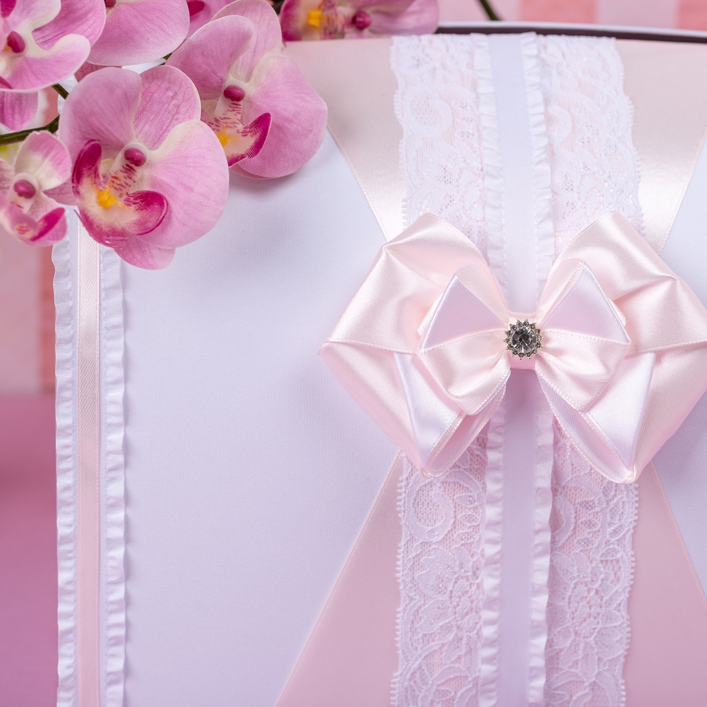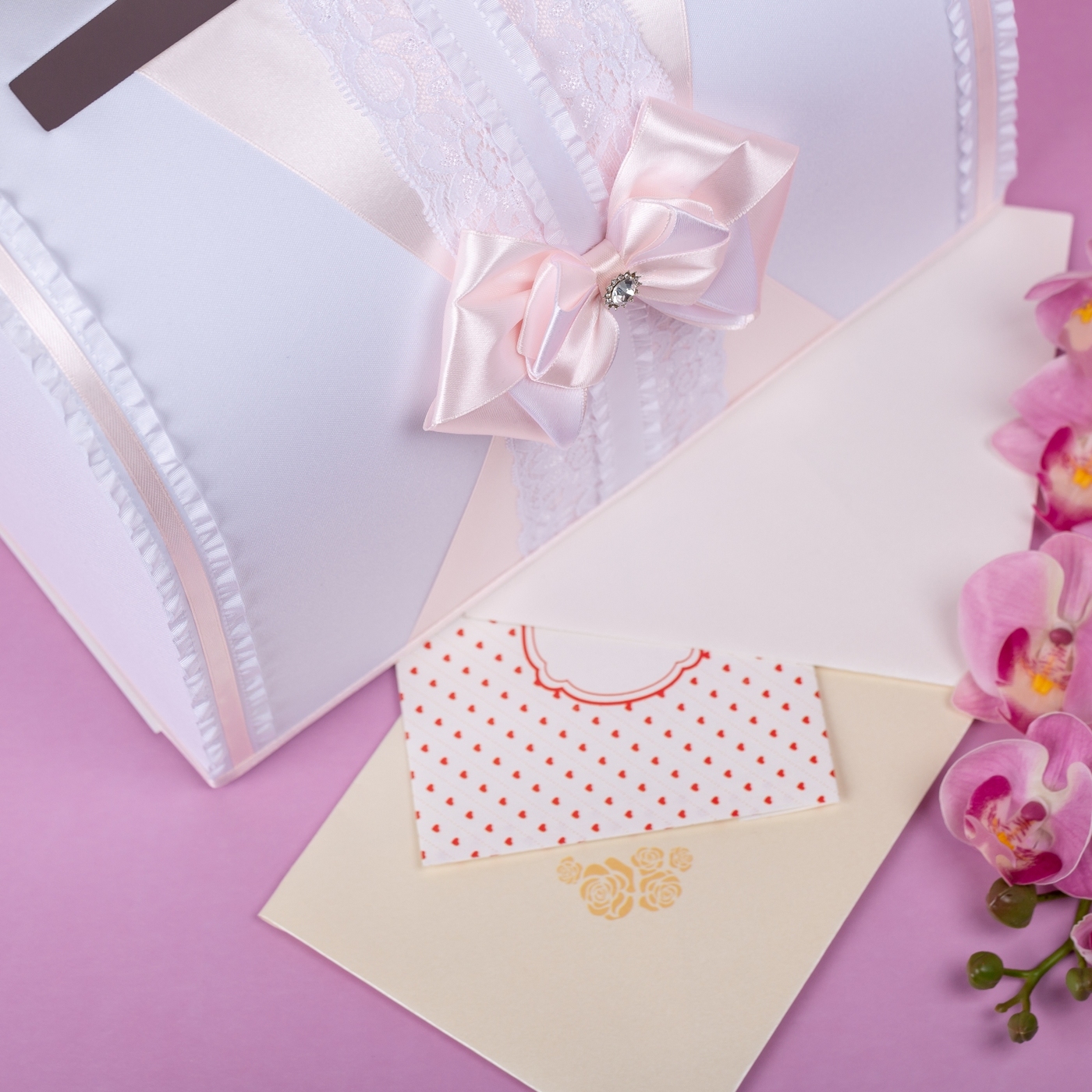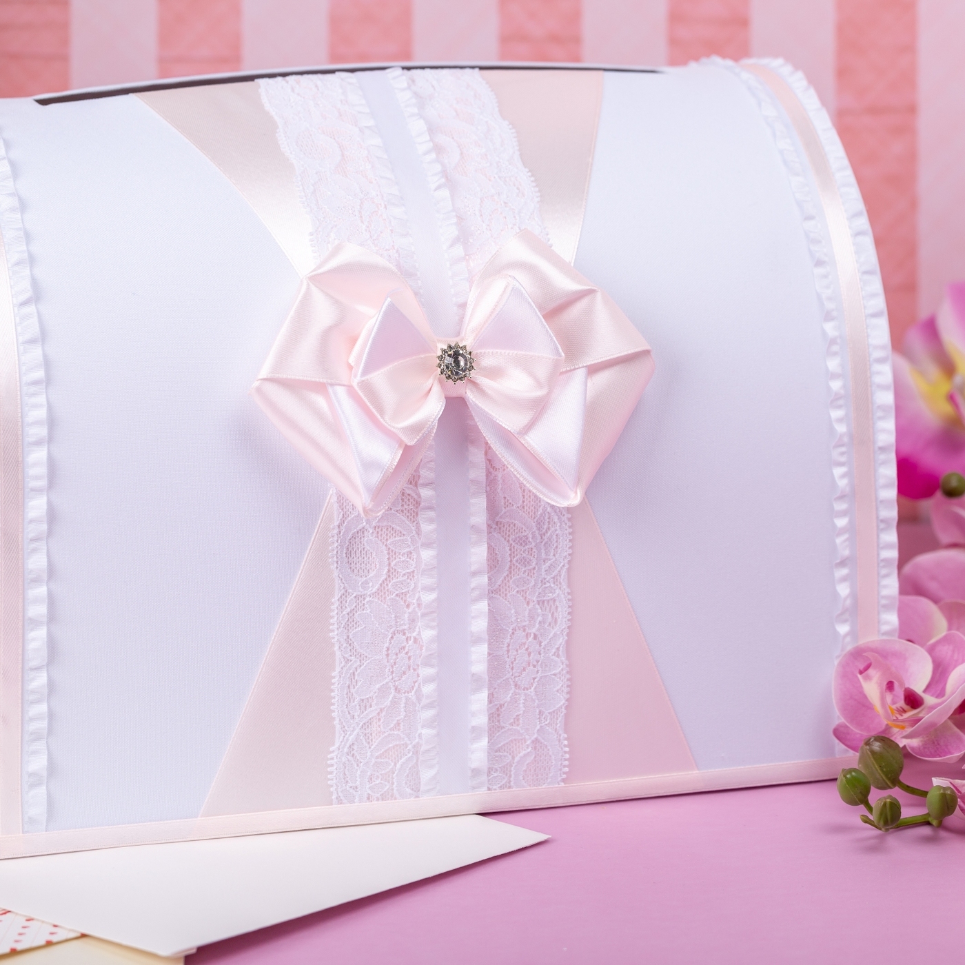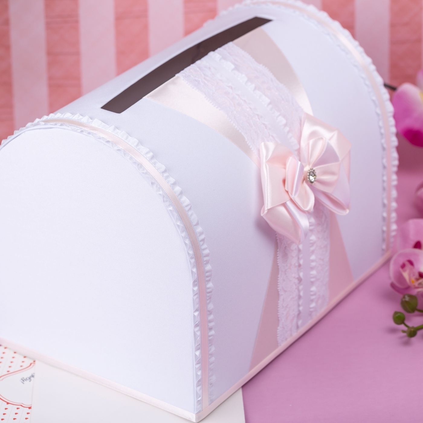 Стильный сундучок для денег на свадьбу "Нежность" со светлым розовым бантом из атласа, белым кружевом и тесьмой