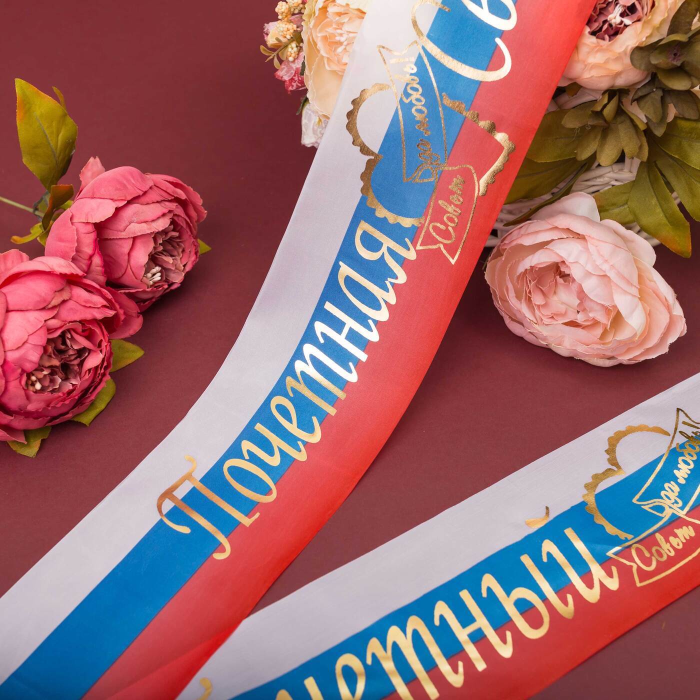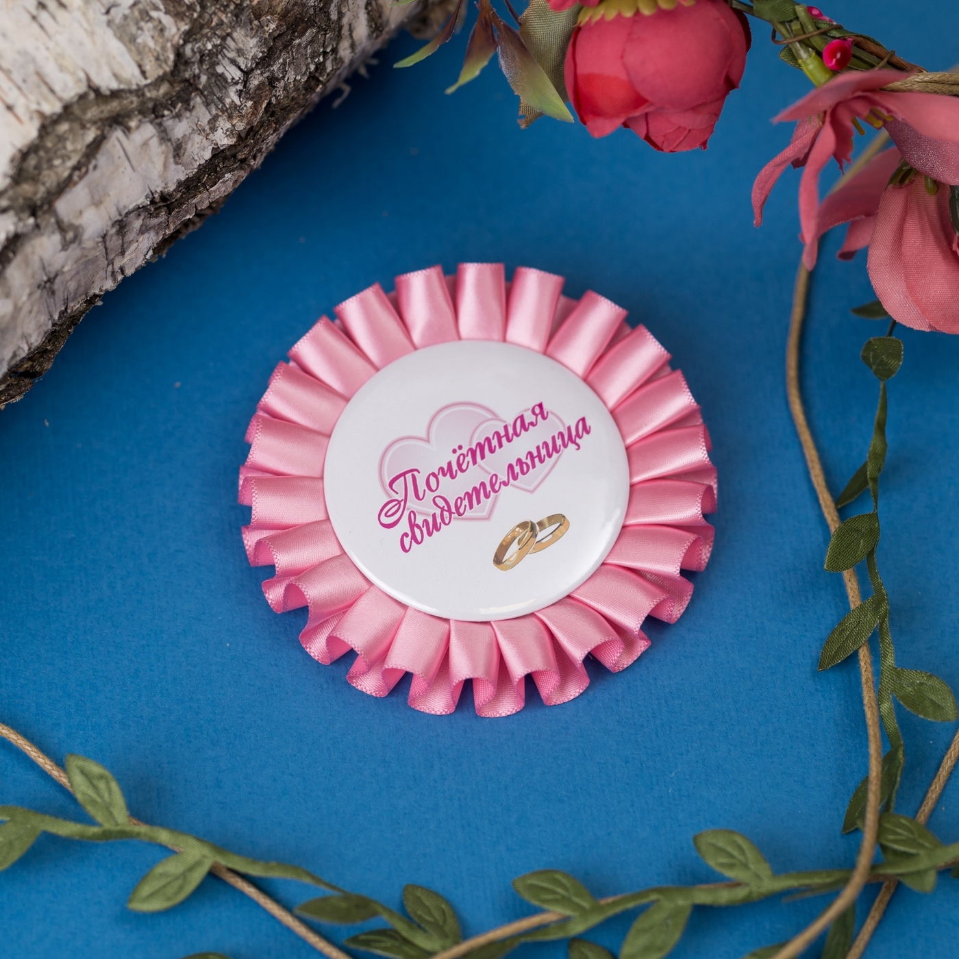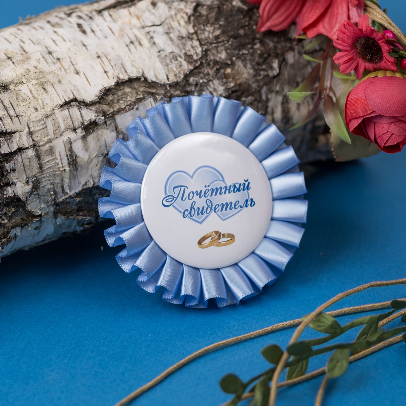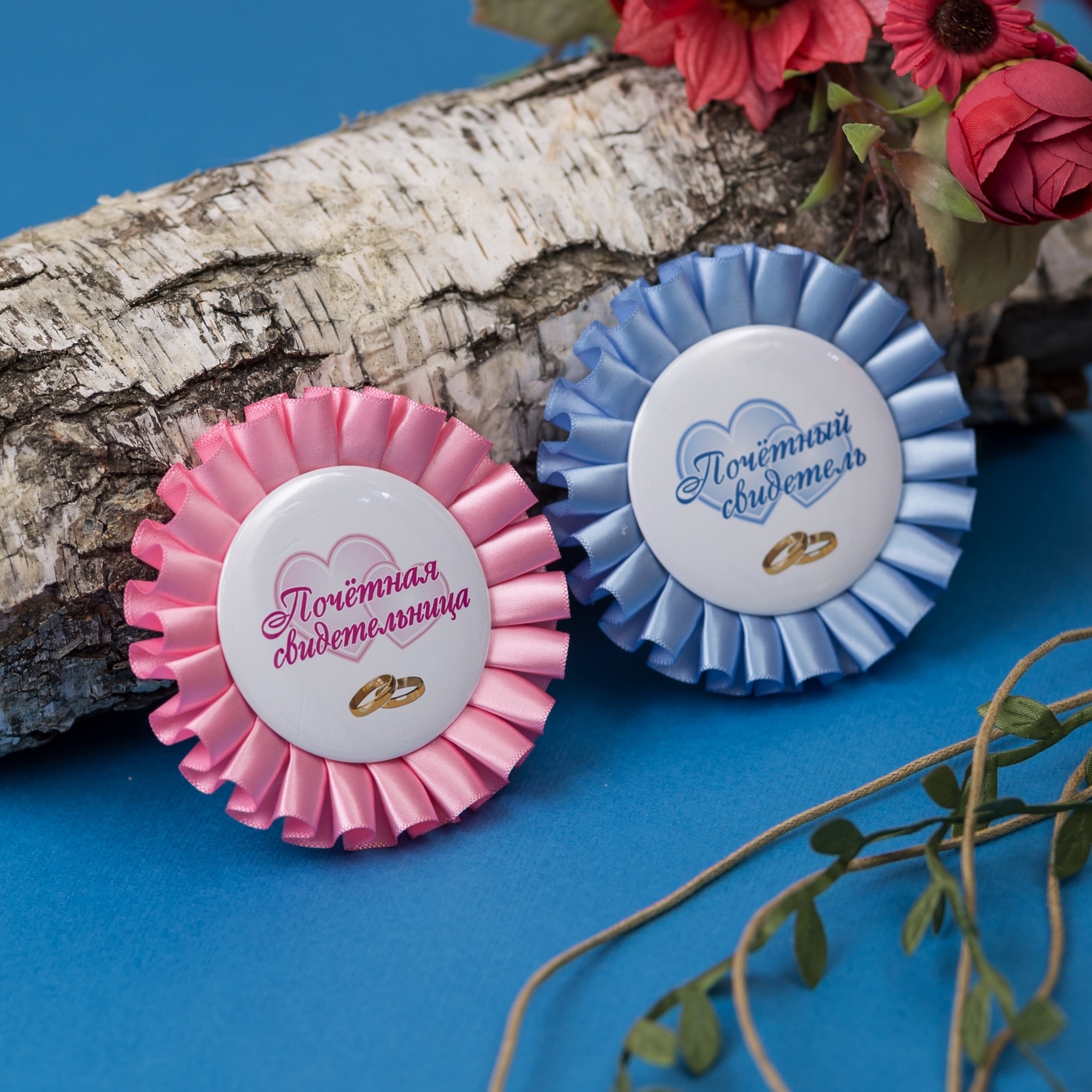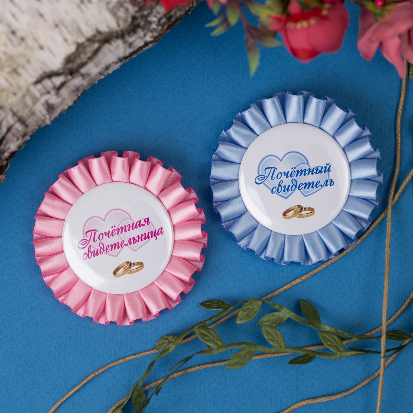 Романтичные медали - розетки для свидетелей на свадьбу из розовой и голубой атласной ленты, 2 штуки