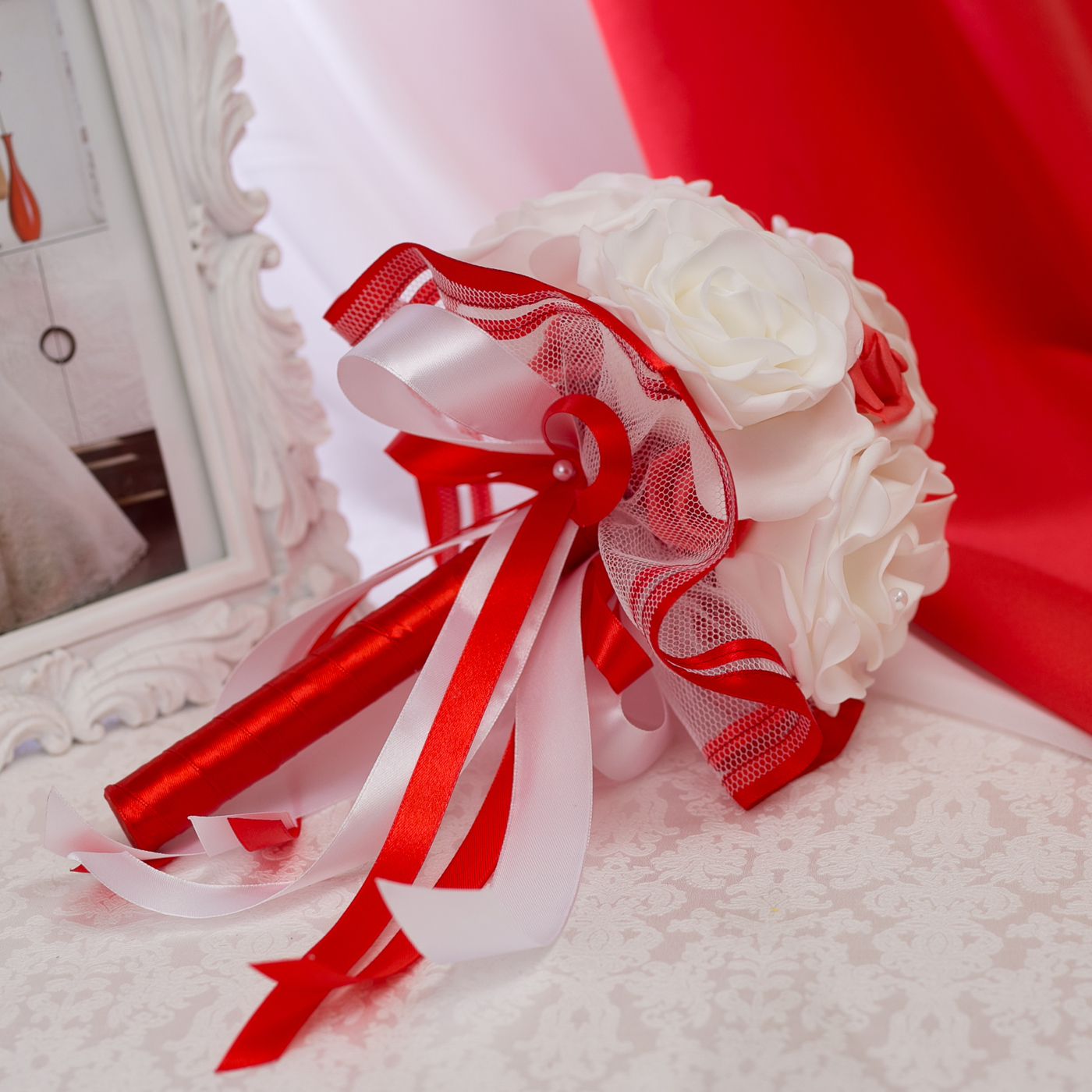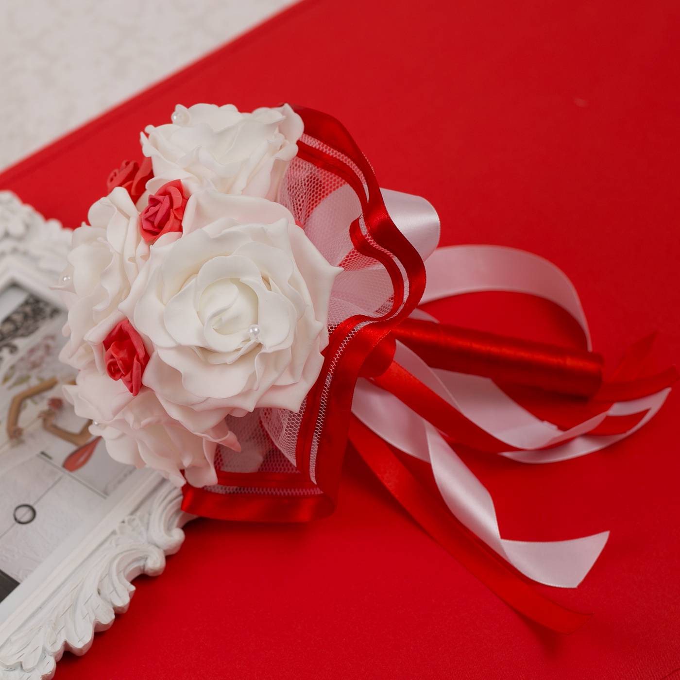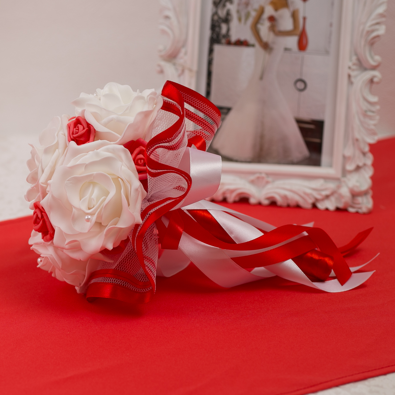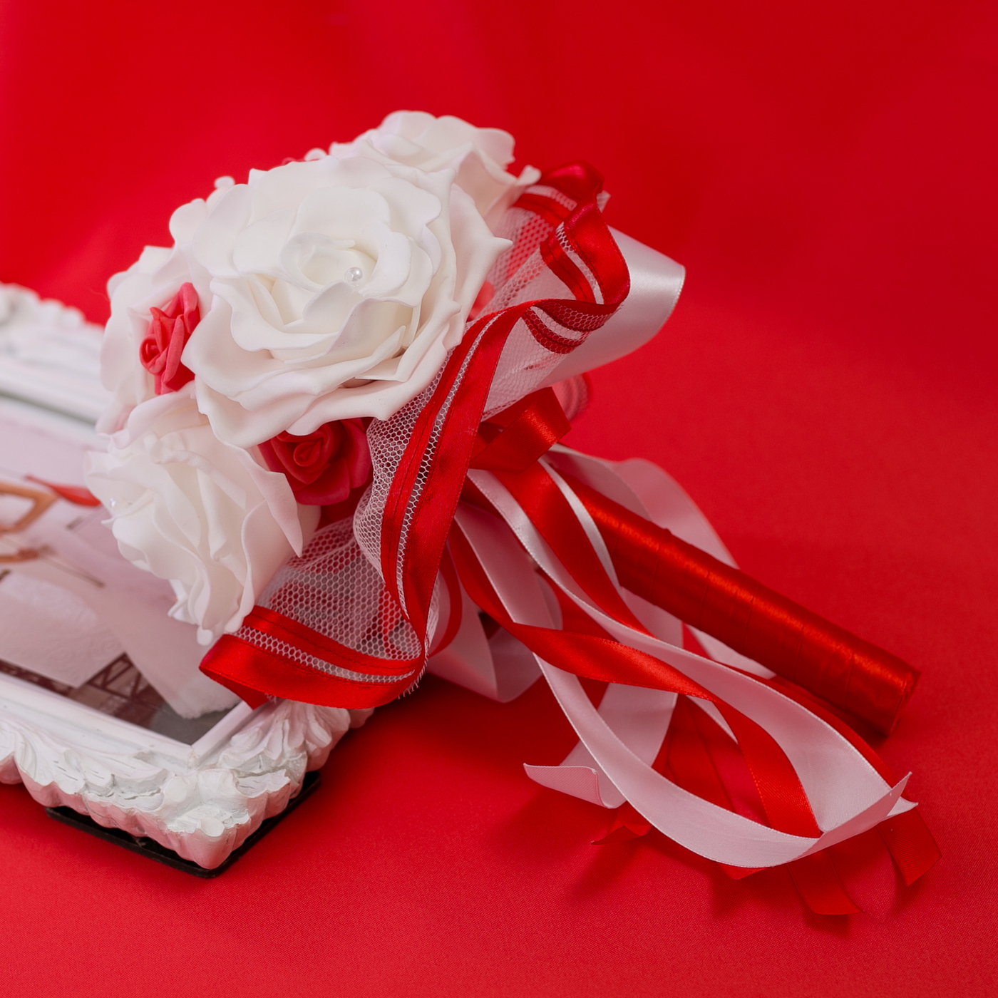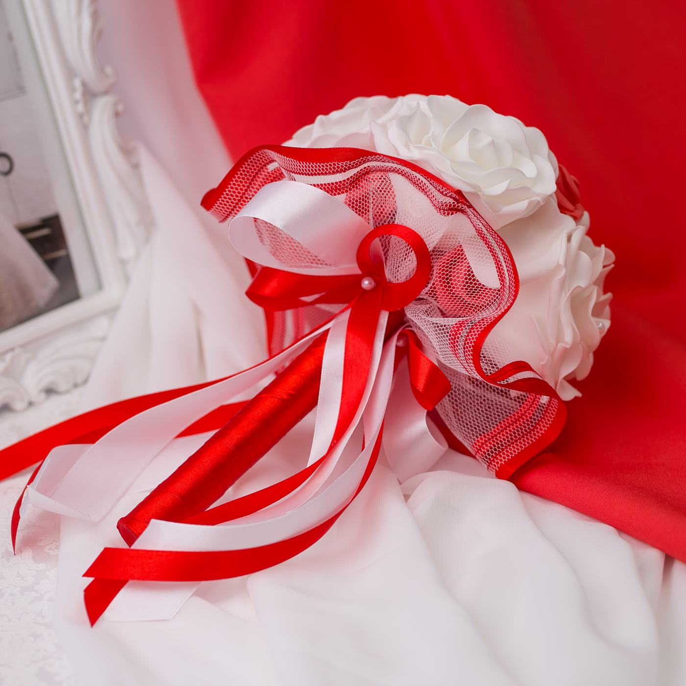 Второй букет невесты на свадебное торжество "Красный стиль" из латексных роз молочного оттенка, белого фатина и красных ленточек из атласа