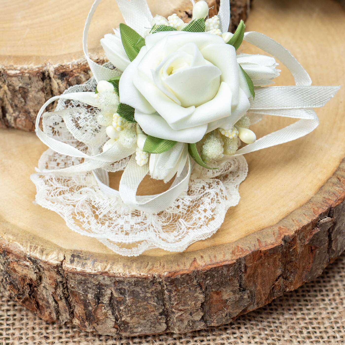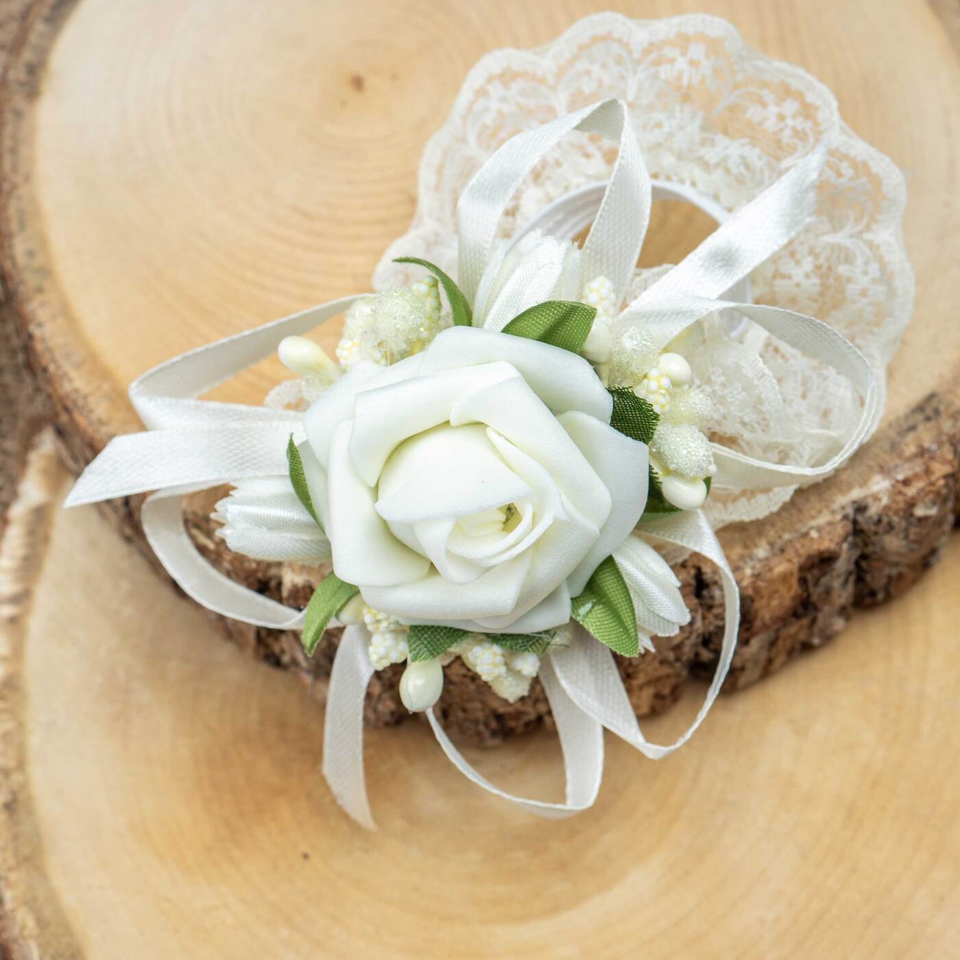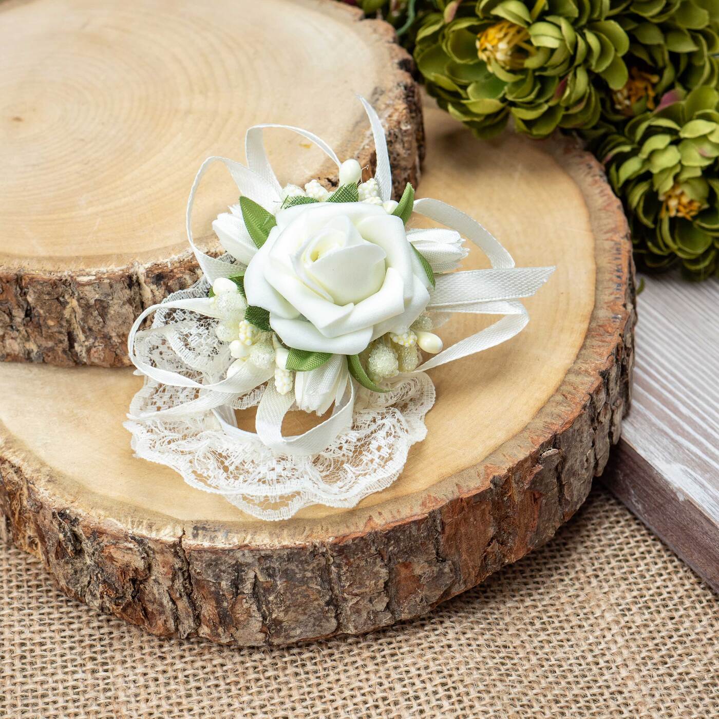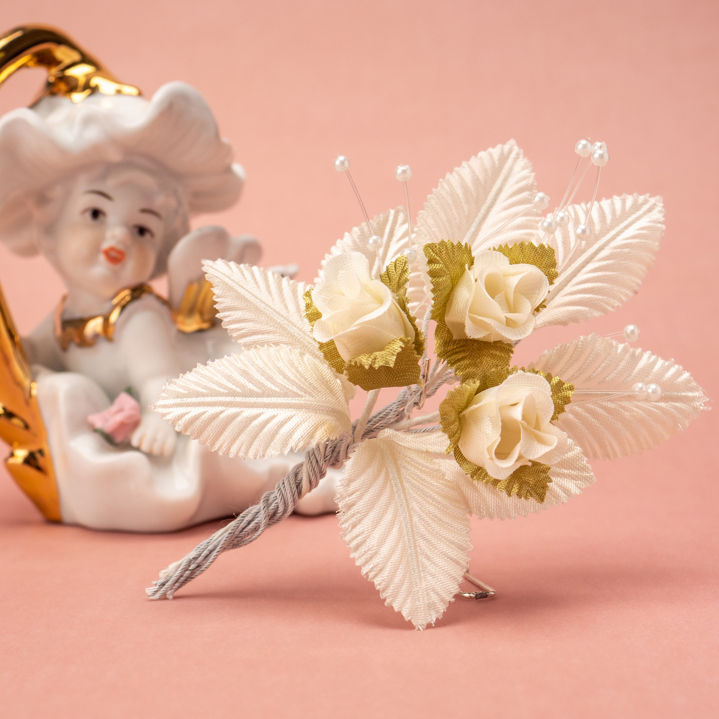 Бутоньерка в петлицу пиджака с розами цвета айвори, перламутровым бисером и зелеными гофрированными листочками