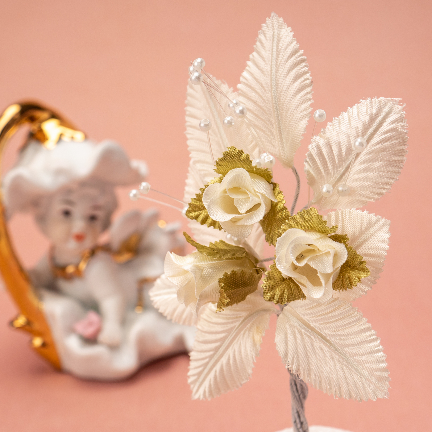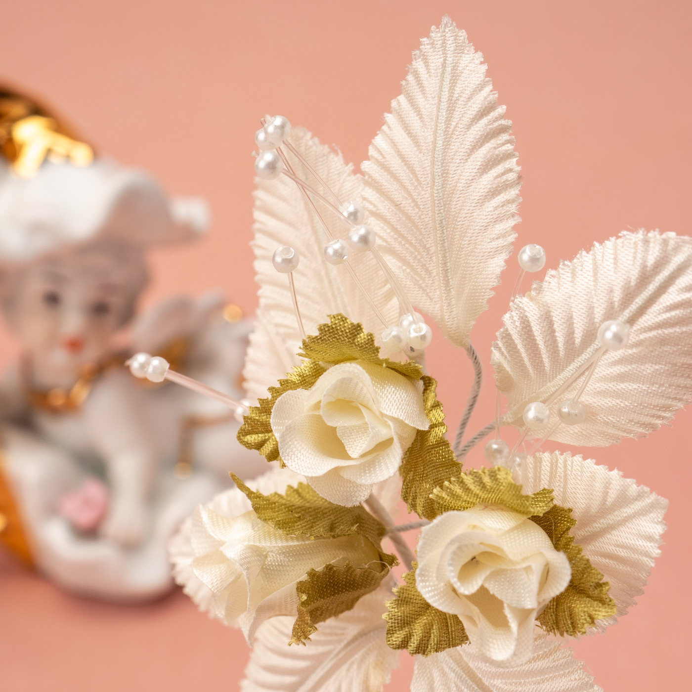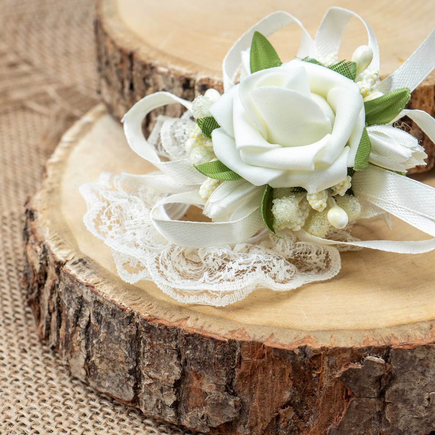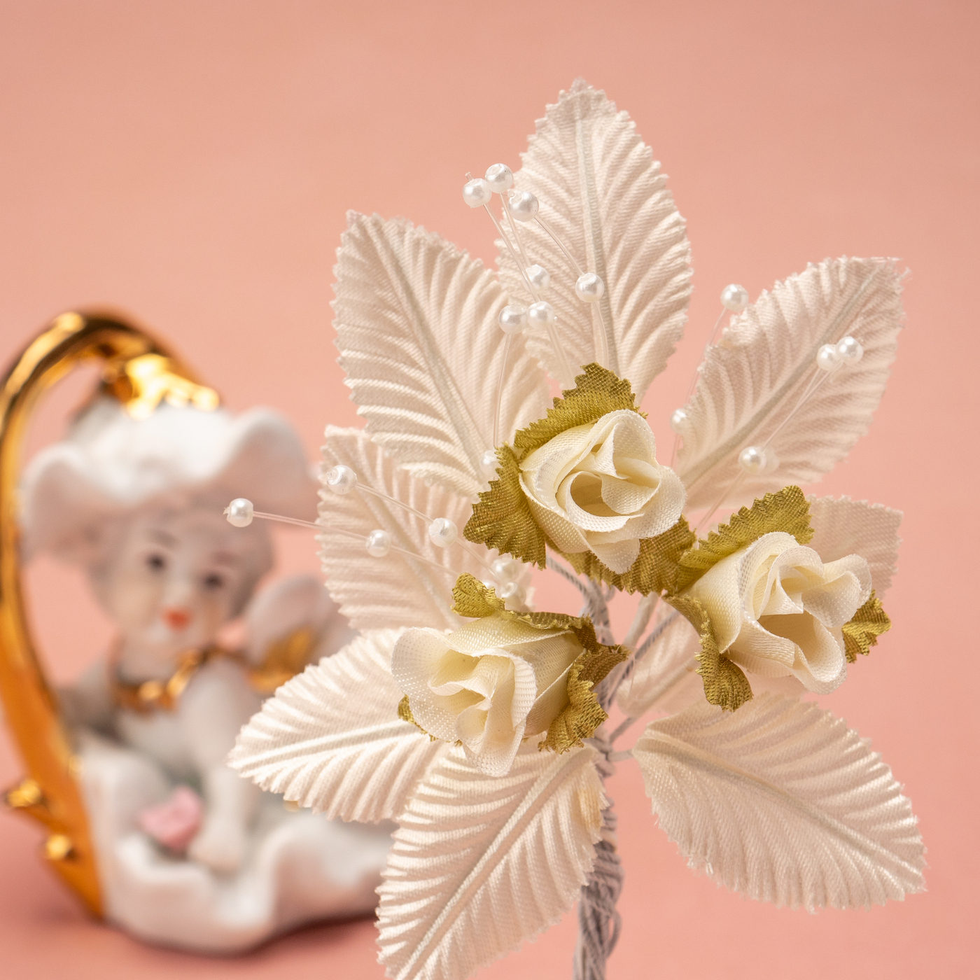 Бутоньерка в петлицу пиджака с розами цвета айвори, перламутровым бисером и зелеными гофрированными листочками