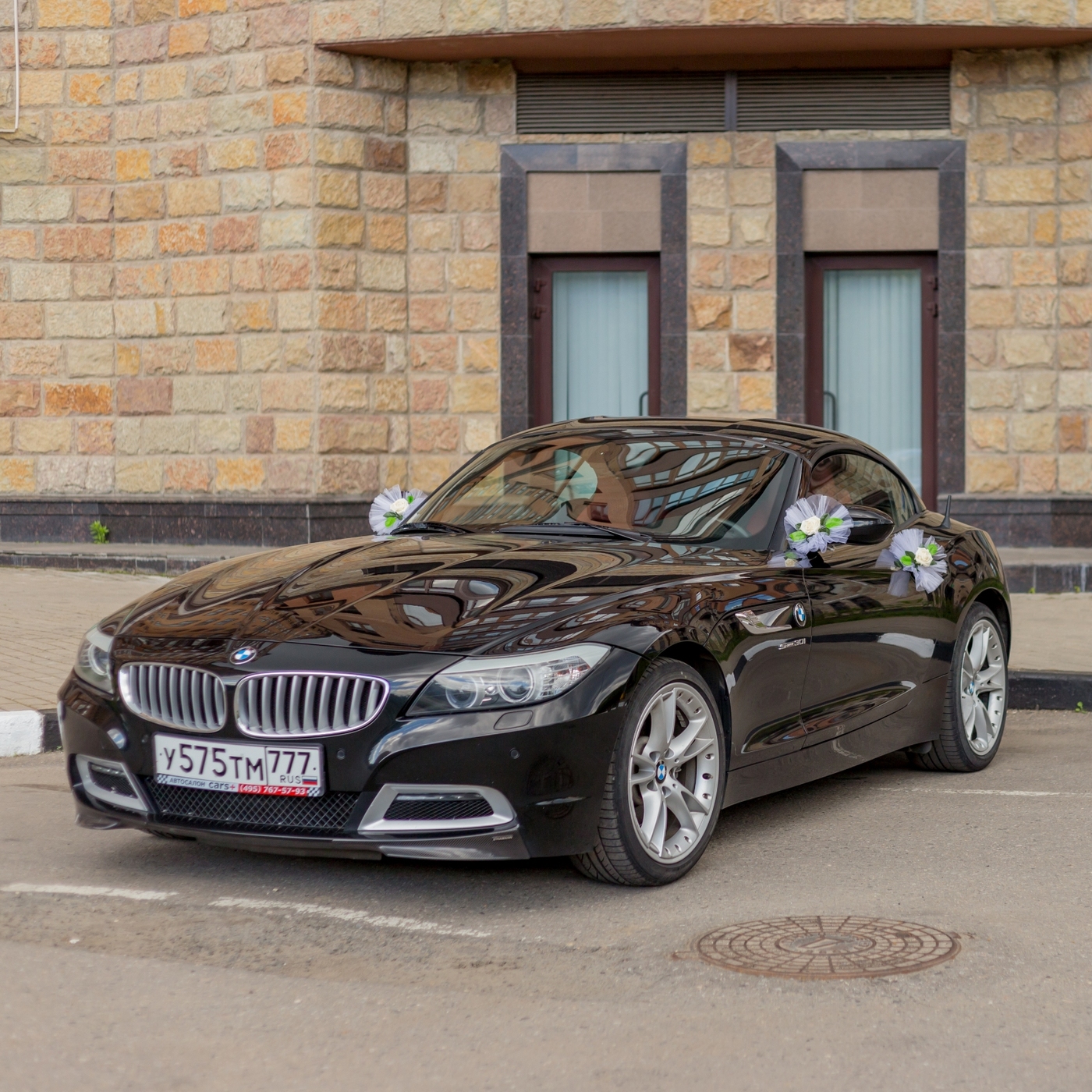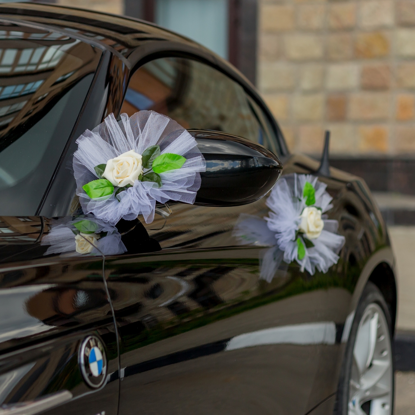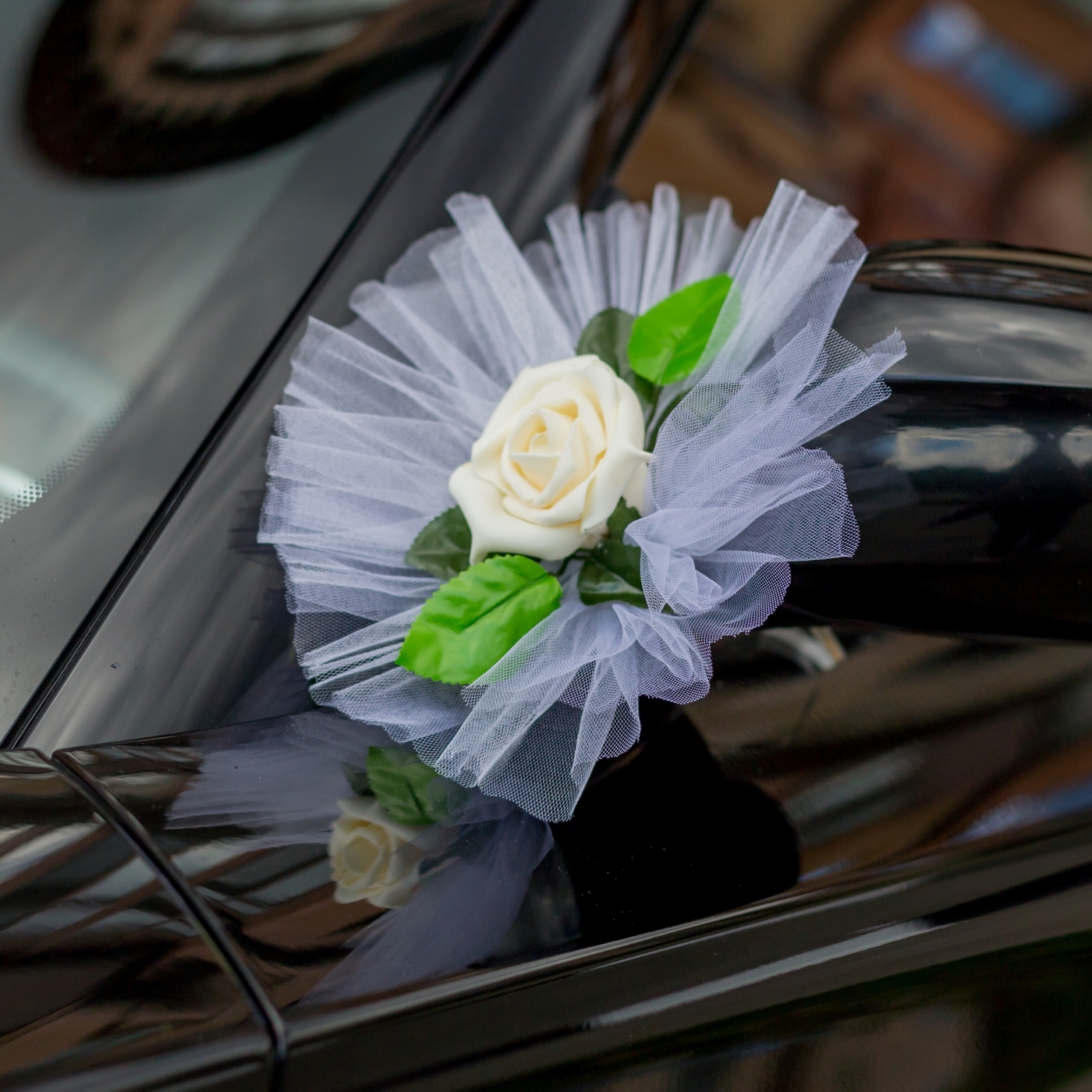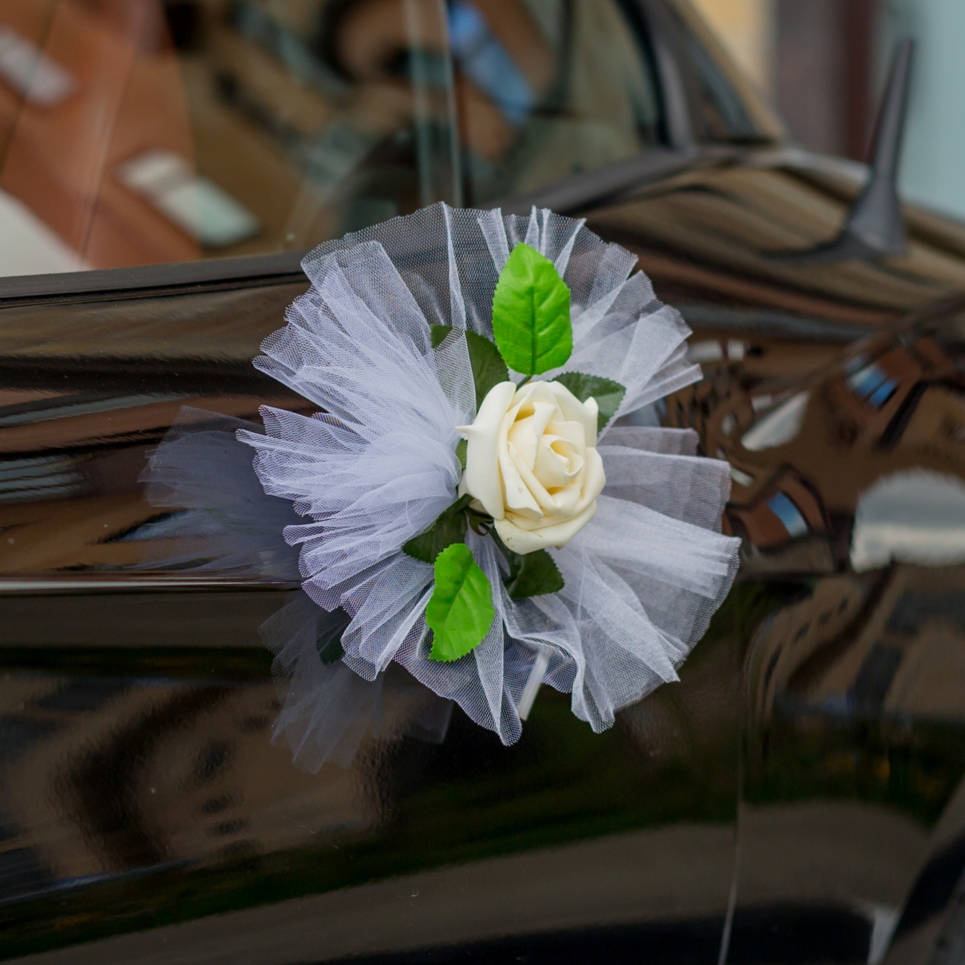 Украшение банты на свадебную машину молодоженов с розой айвори в нежной фатиновой драпировке, в наборе 2 штуки
