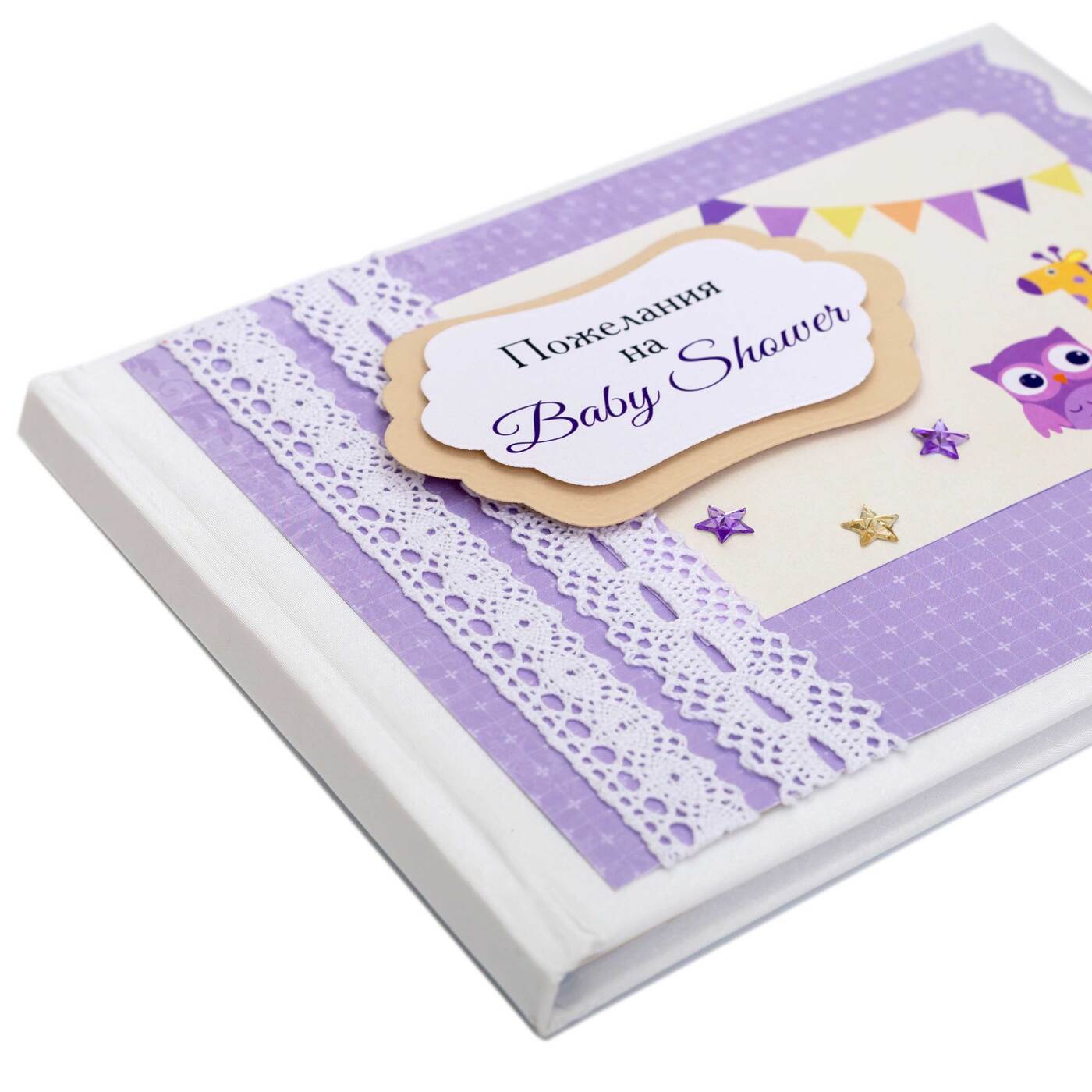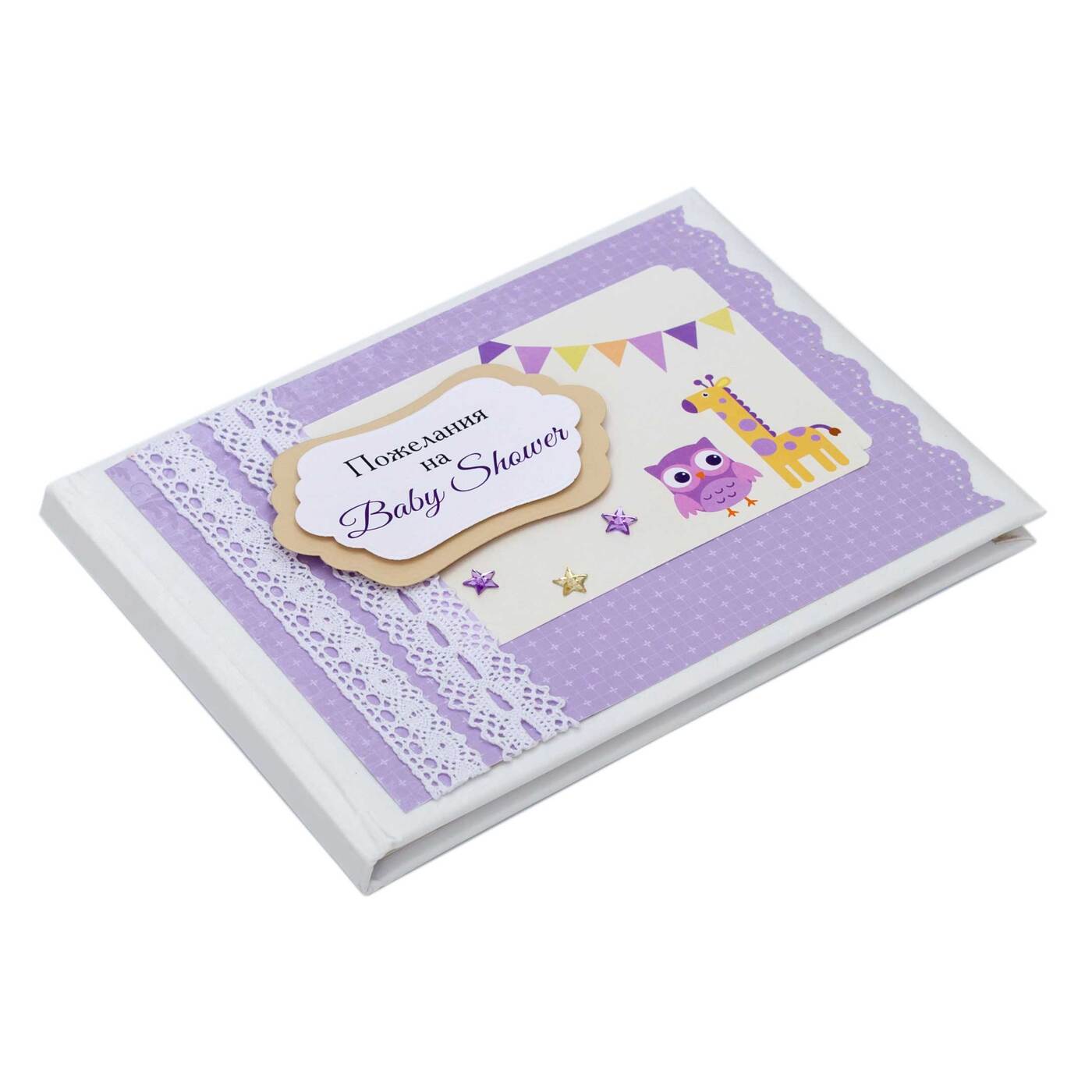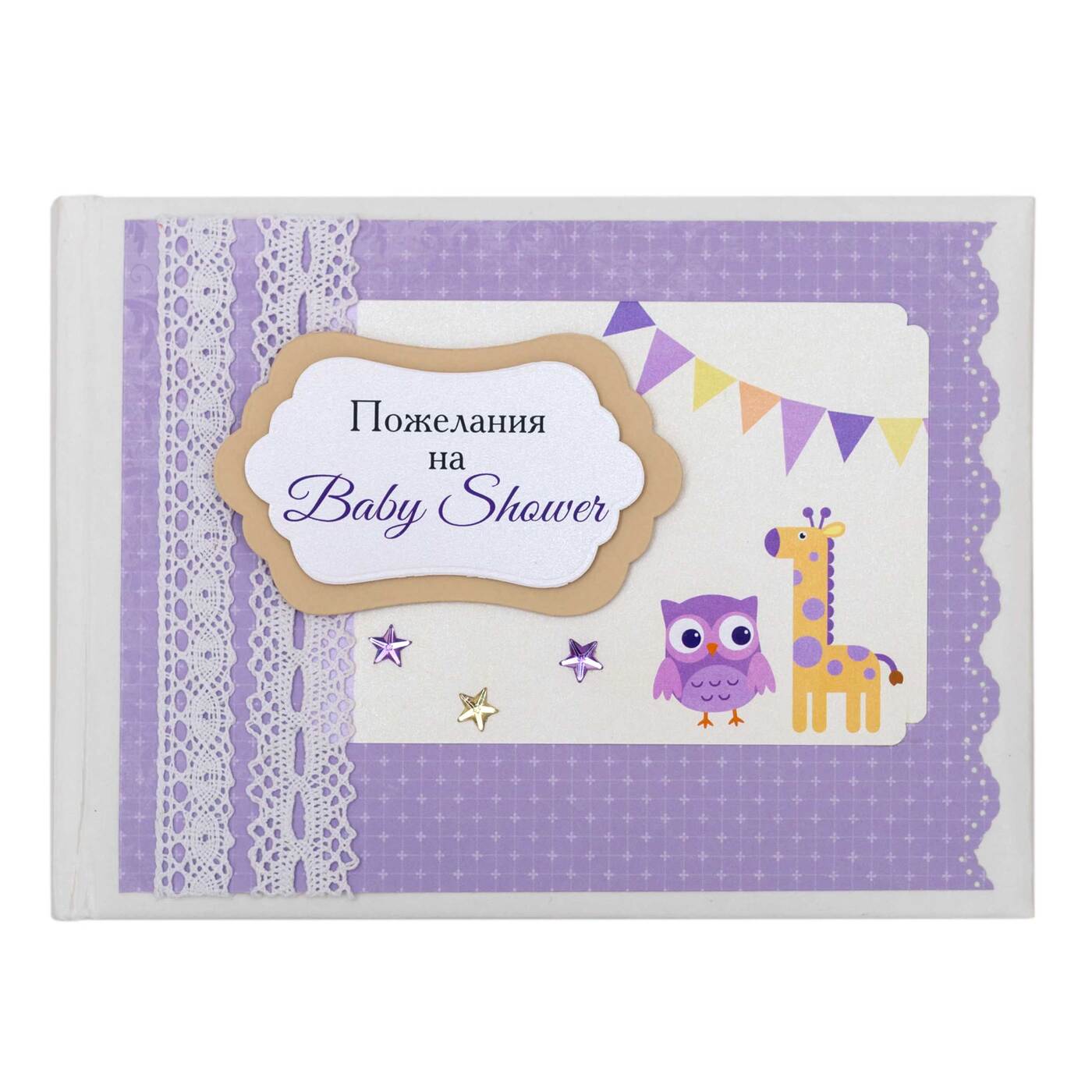 Стильная книга пожеланий на baby shower "Наша радость" в подарок будущим родителям, в сиреневых тонах с белым кружевом и веселыми рисунками