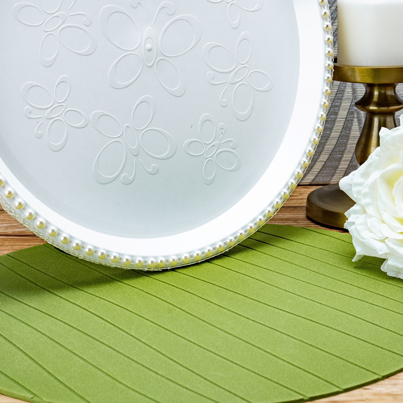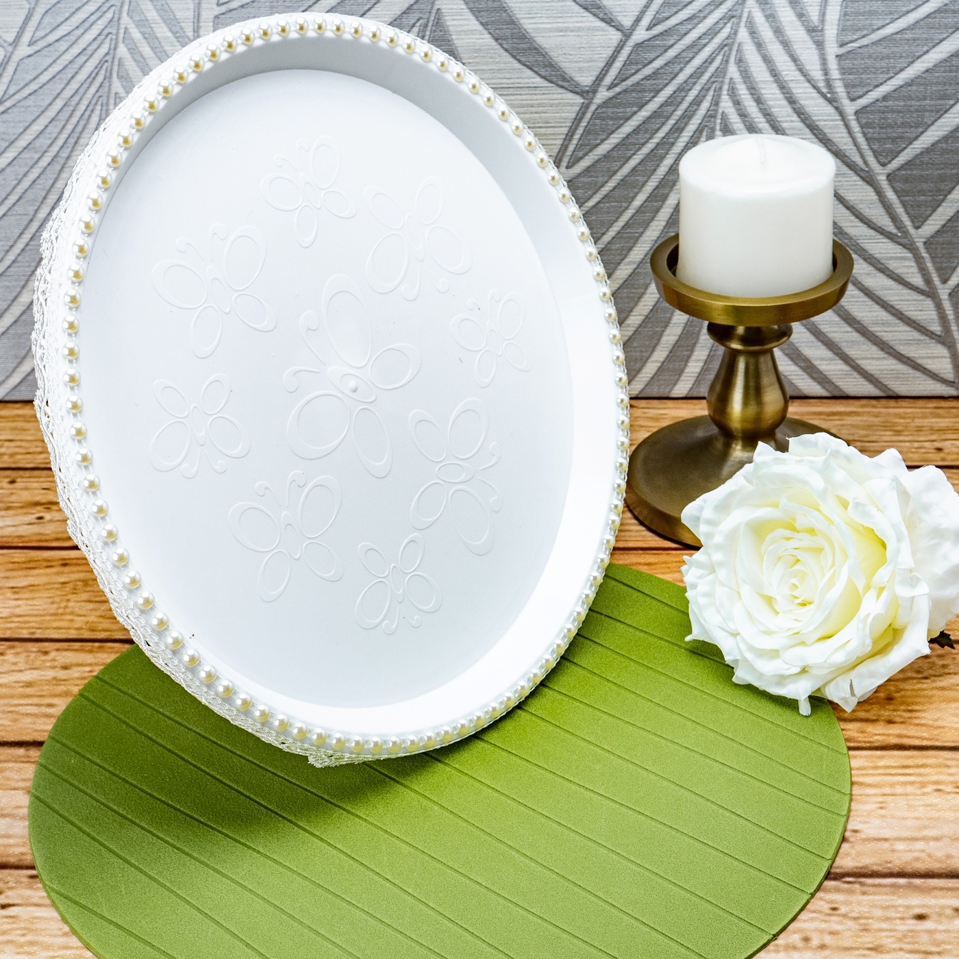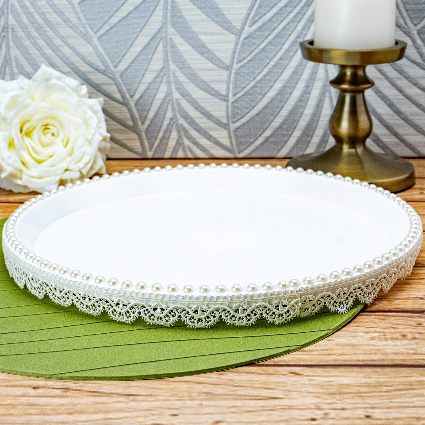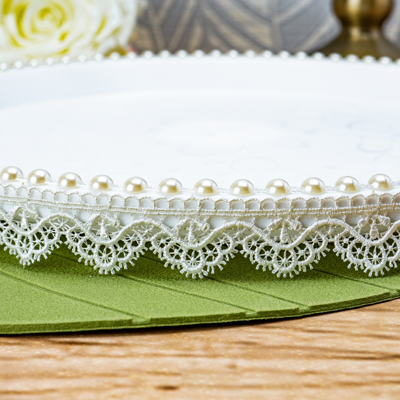 Красивый поднос для свадебного каравая с жемчужными бусинами и кружевом айвори для хлебосольной встречи молодоженов из ЗАГСа