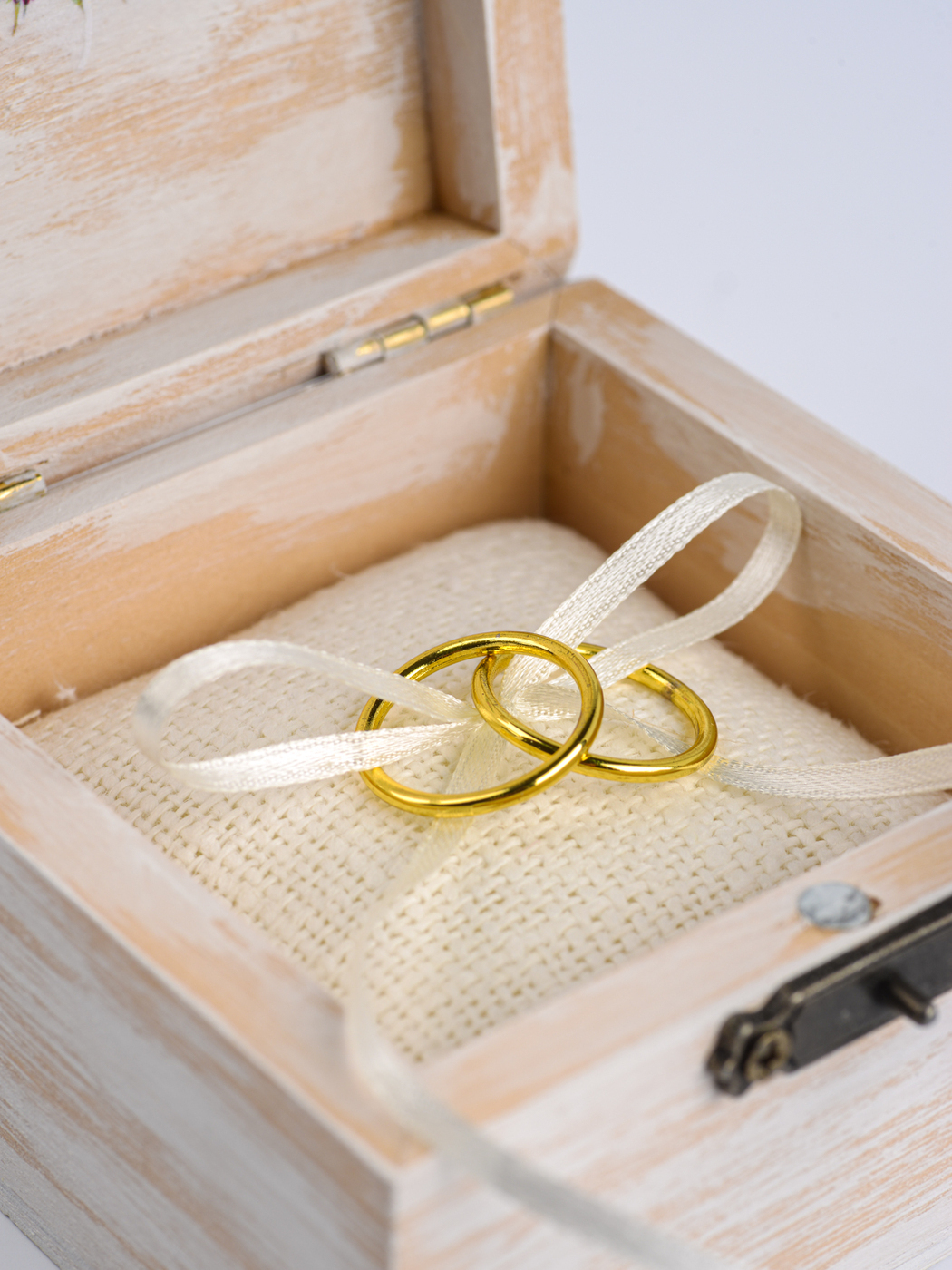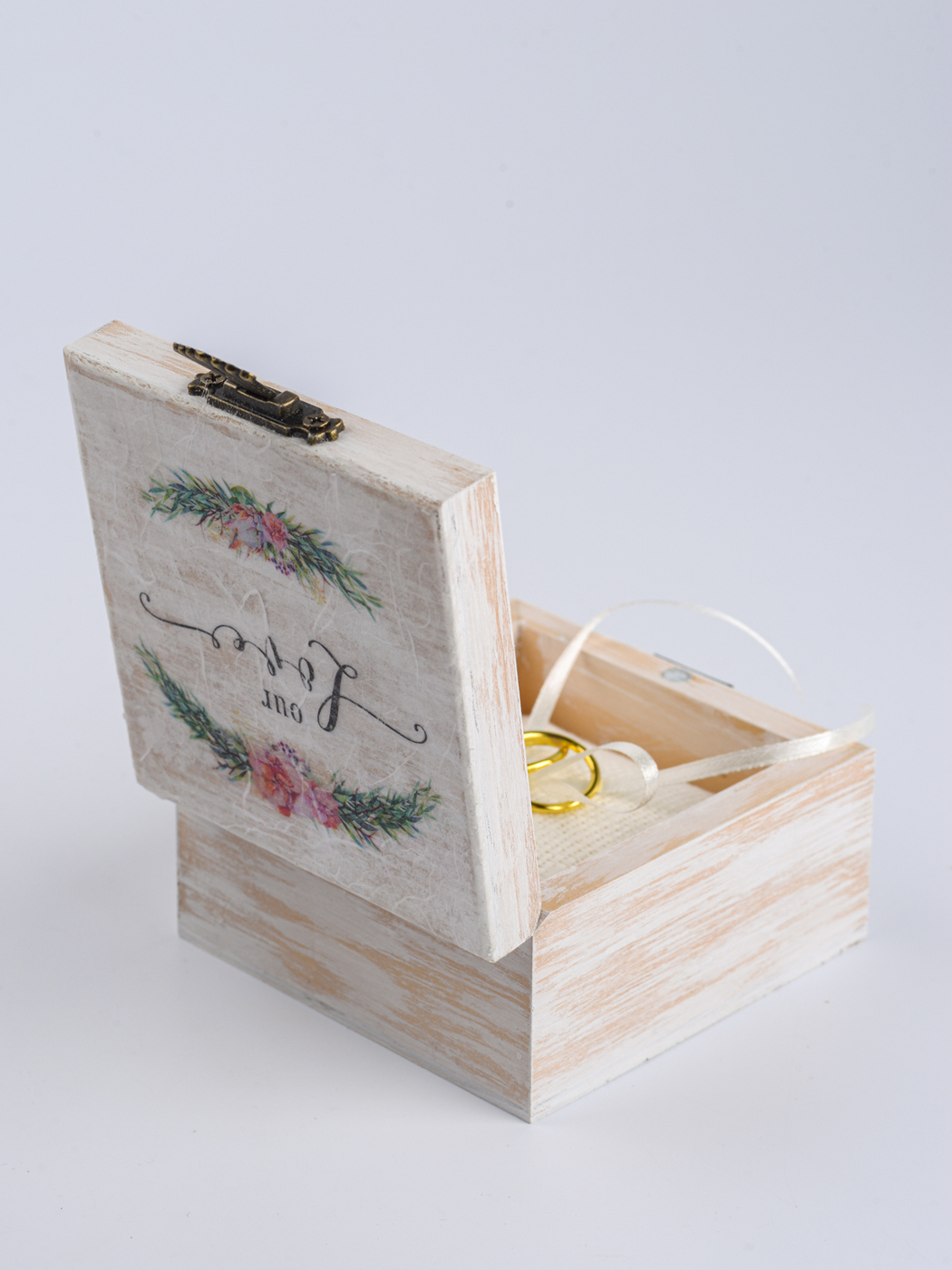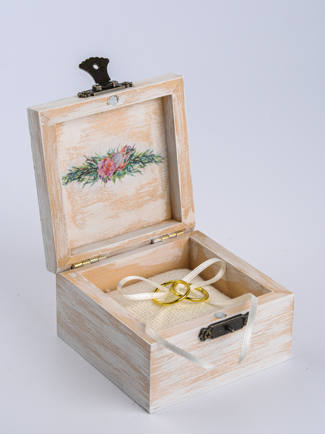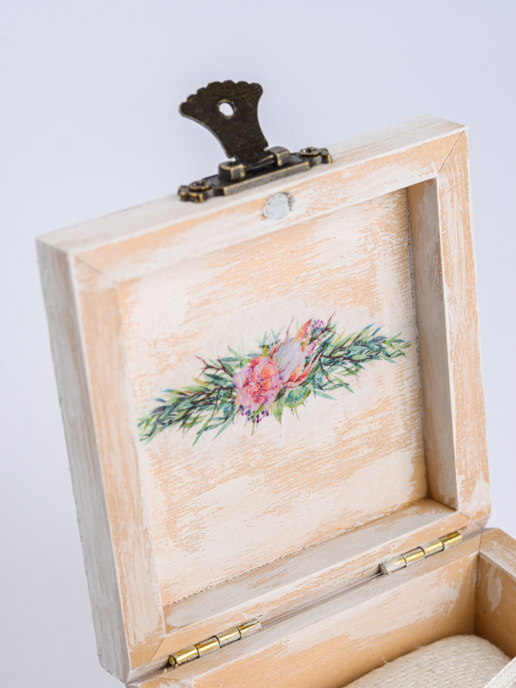 Свадебная шкатулка с замочком для обручальных колец "Эвкалипт" из дерева с растительным принтом и мягкой подушечкой