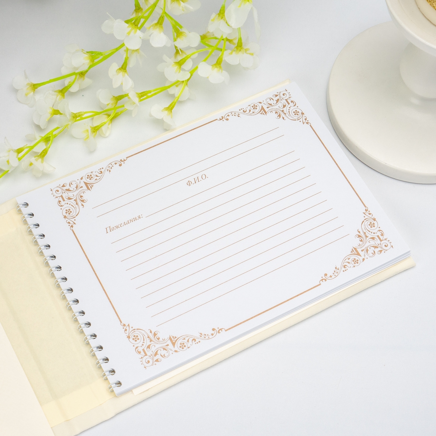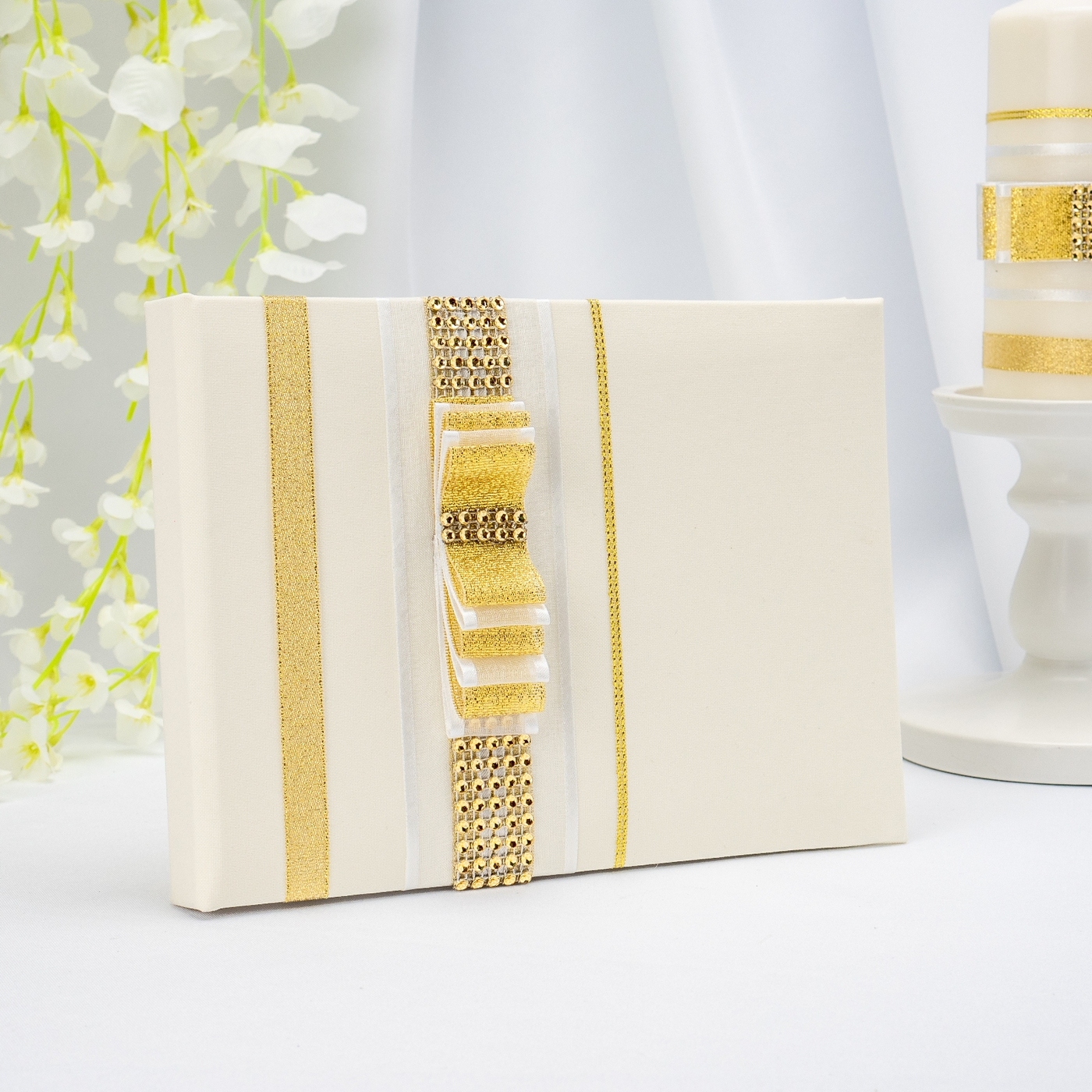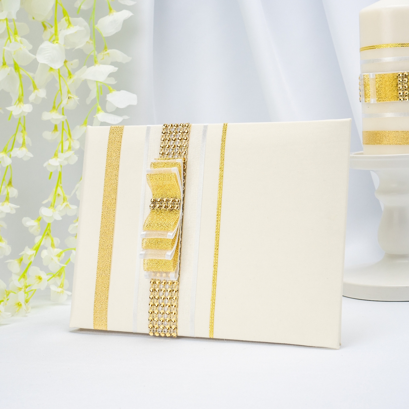 Роскошная книга для пожеланий жениху и невесте "Нефертити" с лентами из золотой органзы, сверкающими стразами и элегантным бантом