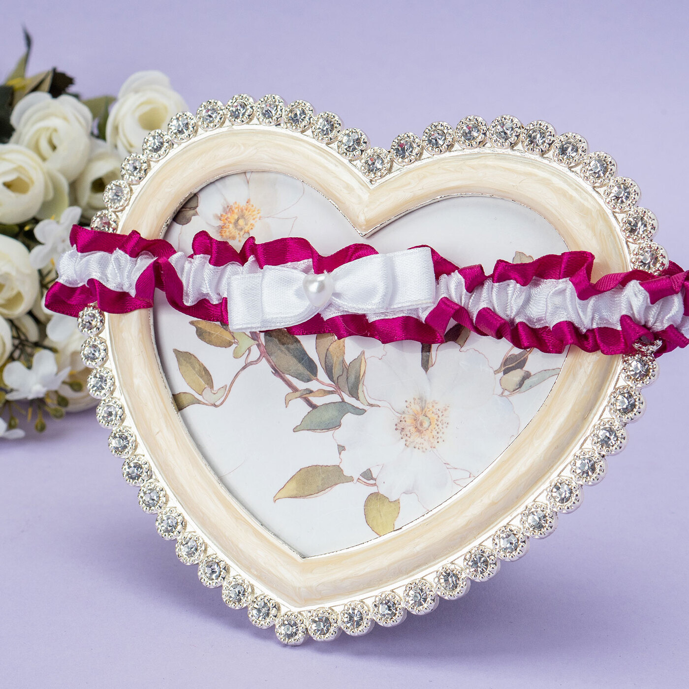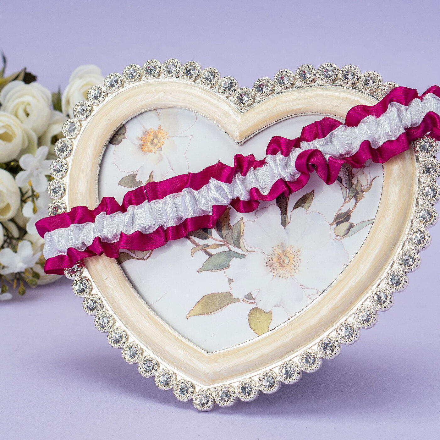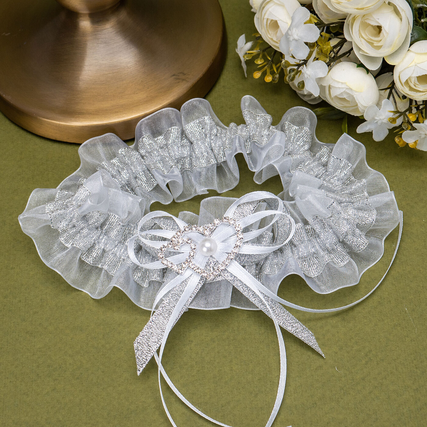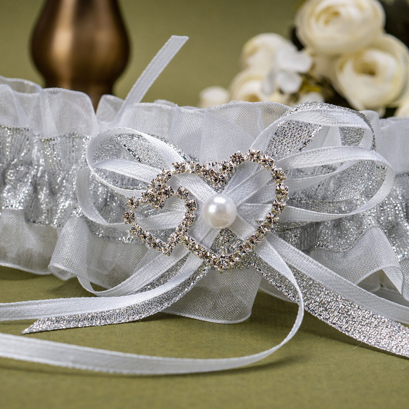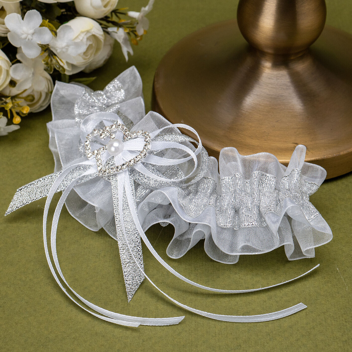 Свадебная подвязка для невесты "Снежная королева" с серебристой каймой и двойным сердцем из страз