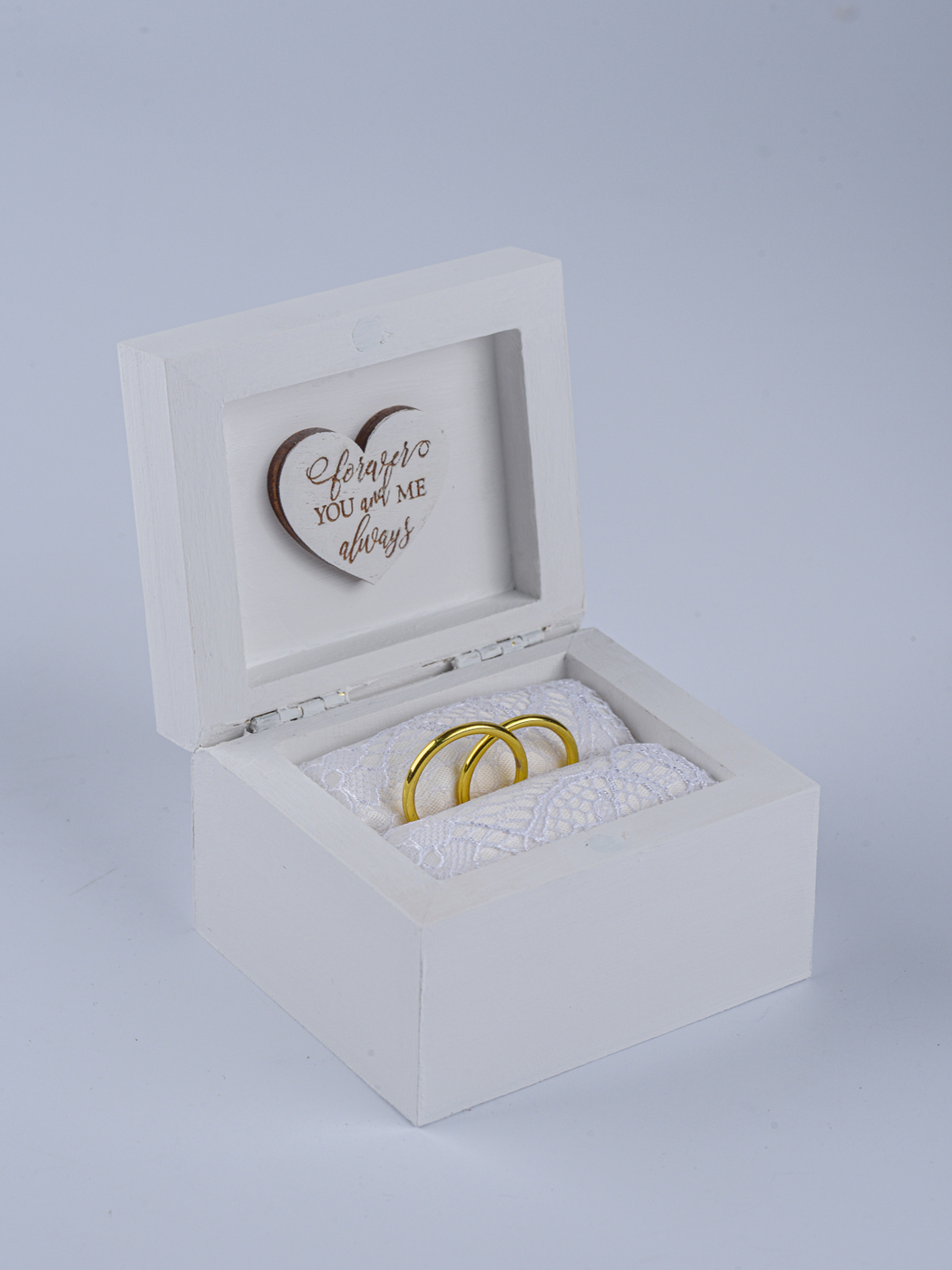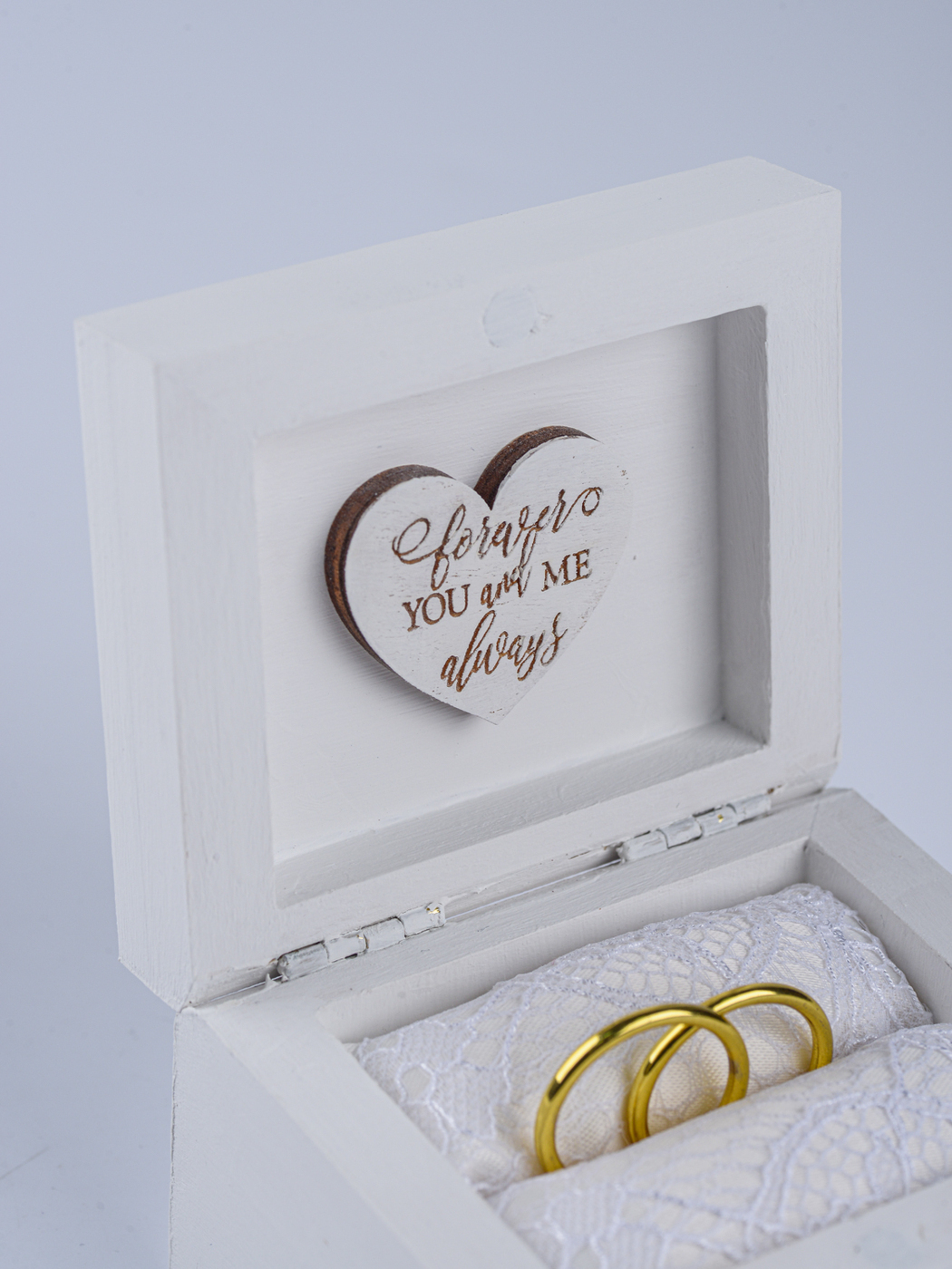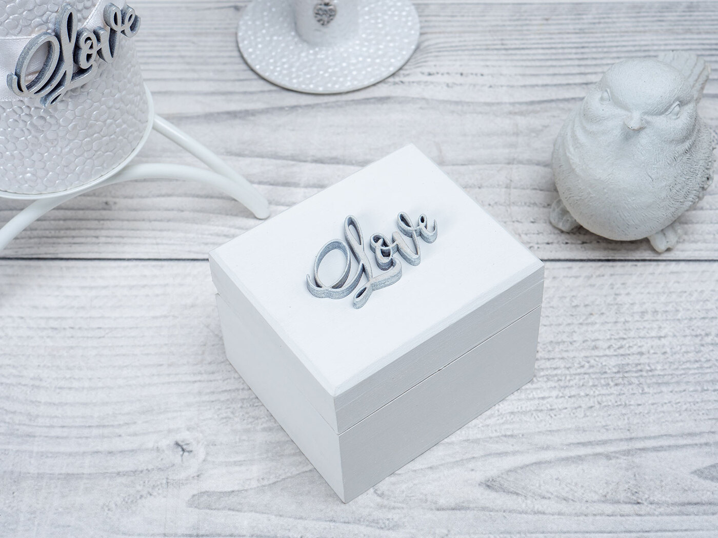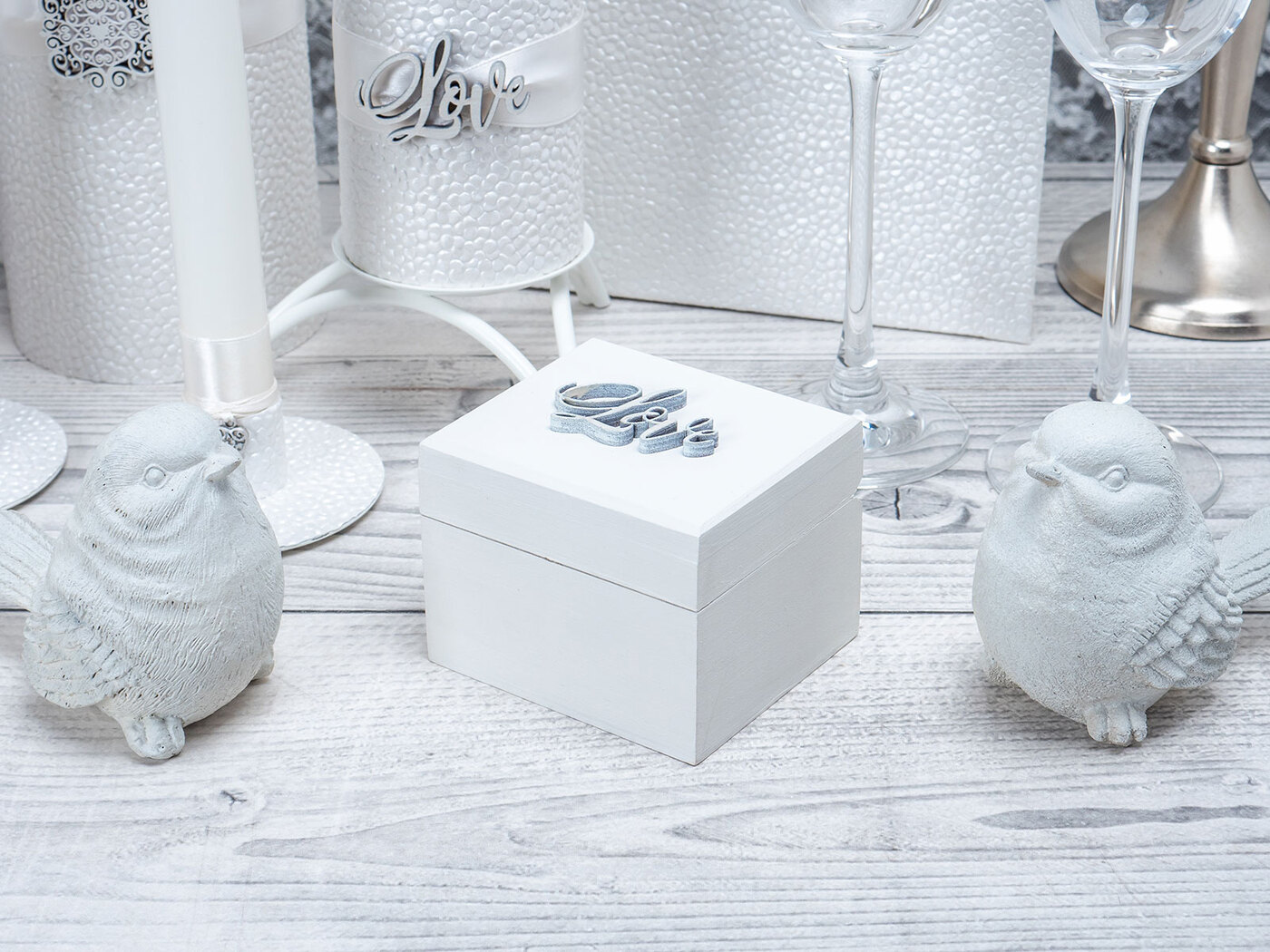 Свадебная шкатулка для обручальных колец "Диана" из дерева белого цвета с серебристой надписью Love