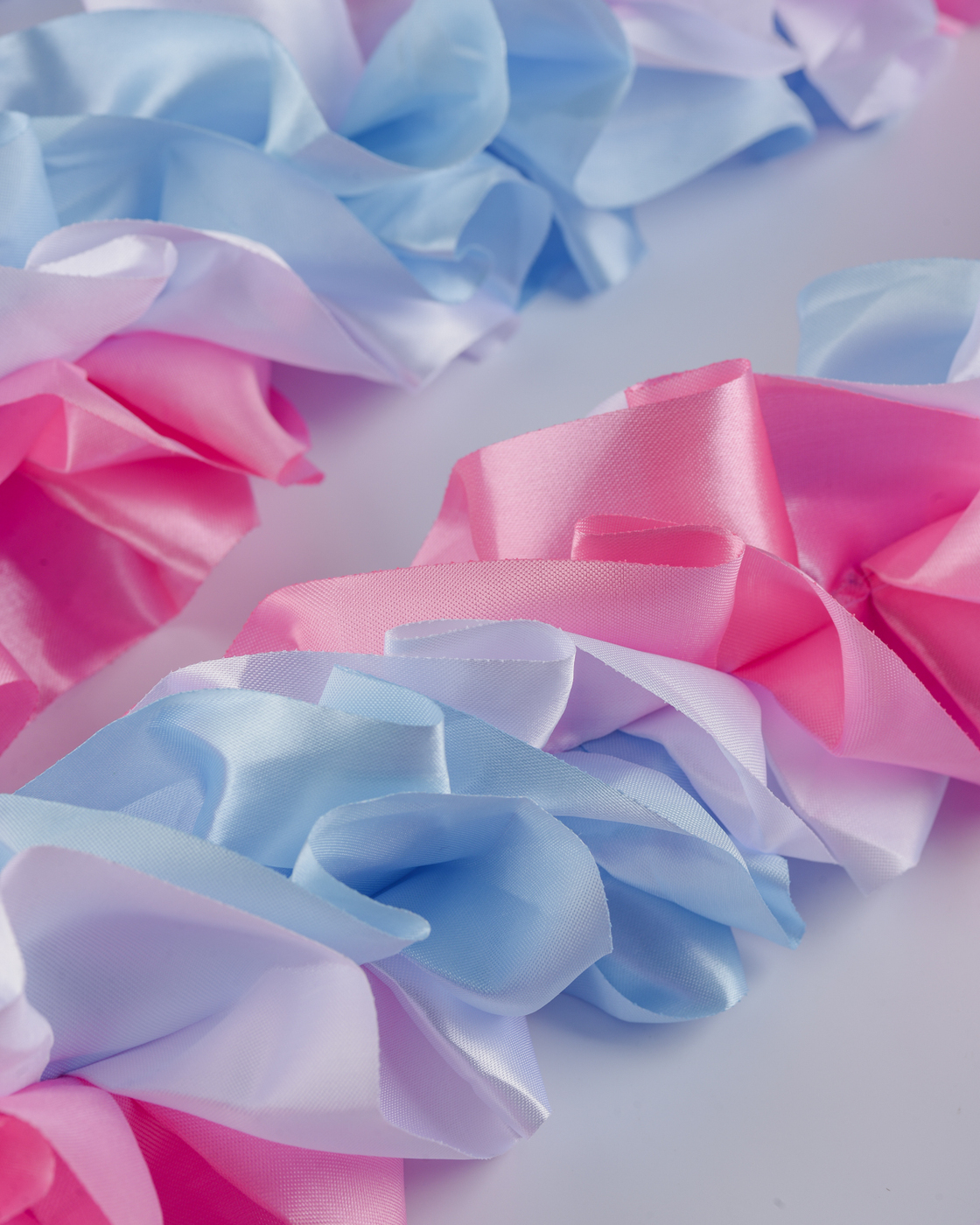 Трехцветная лента - рюш из атласной ленты на капот свадебного авто, белая, розовая, голубая, 3 метра