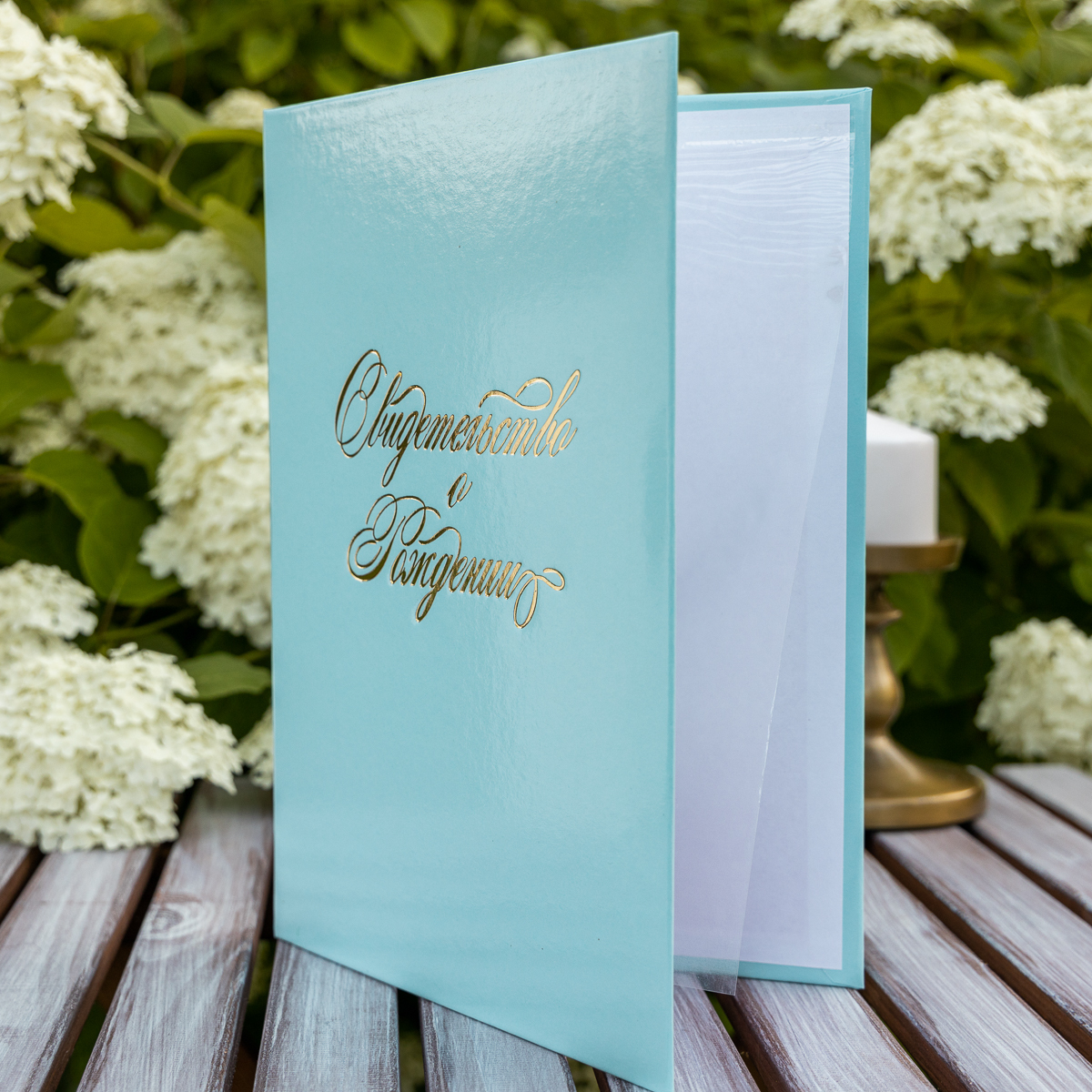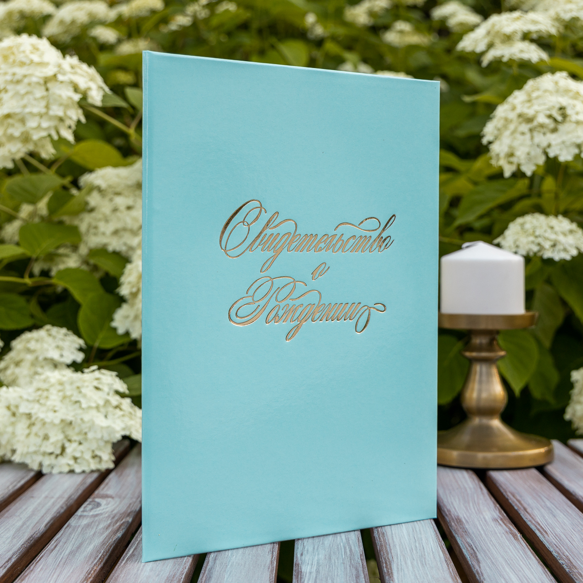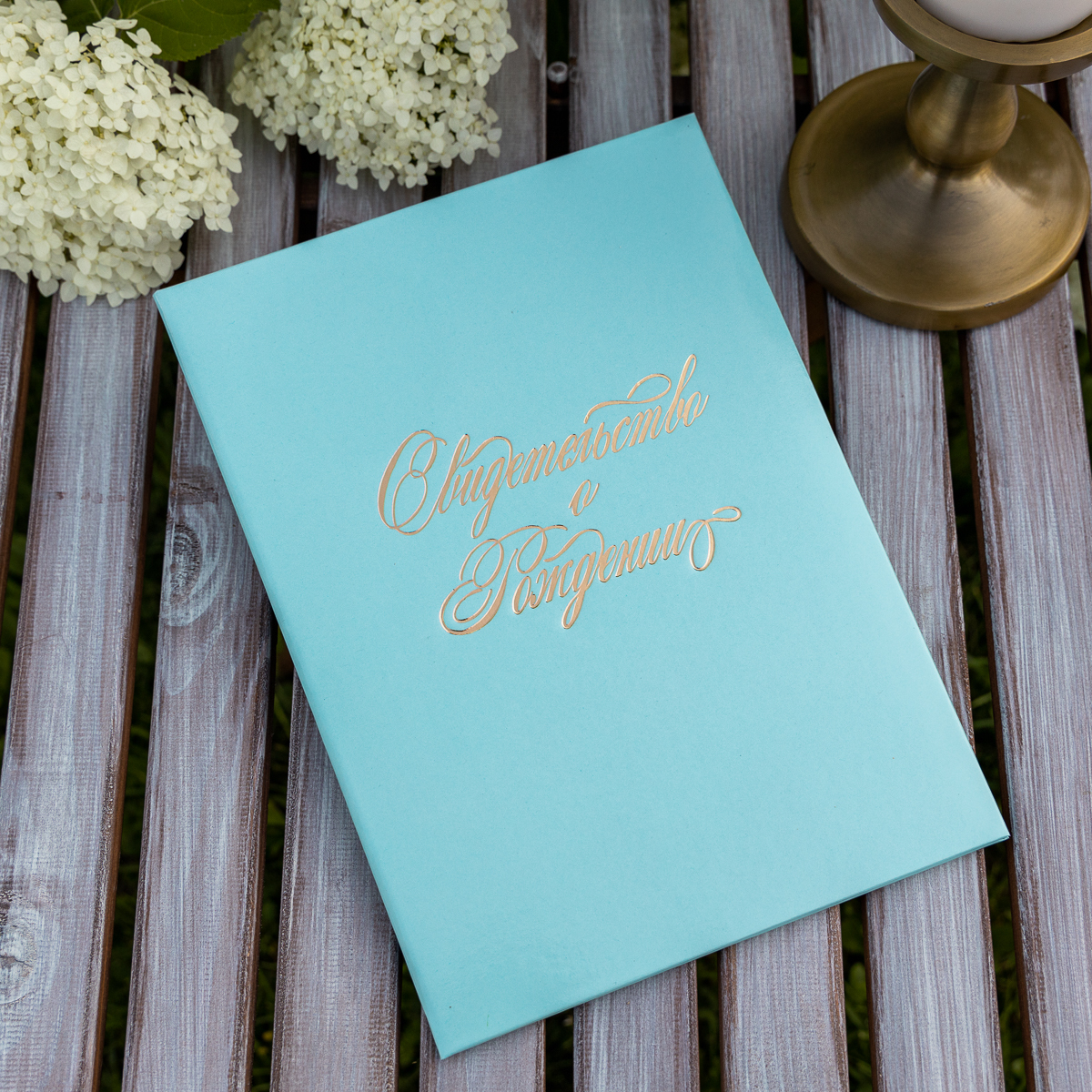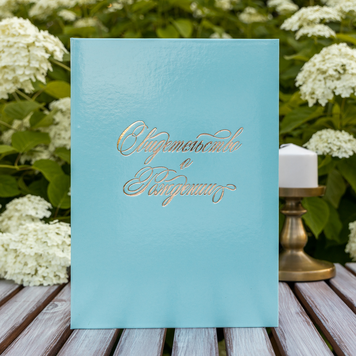 Папка для свидетельства о рождении ребенка голубого цвета с золотым тиснением, формат А4