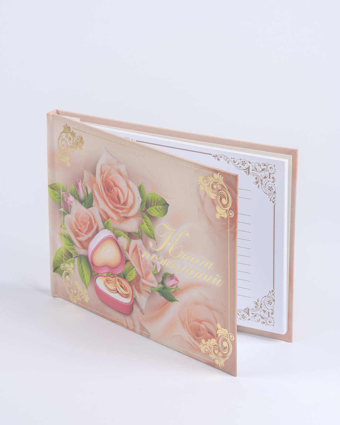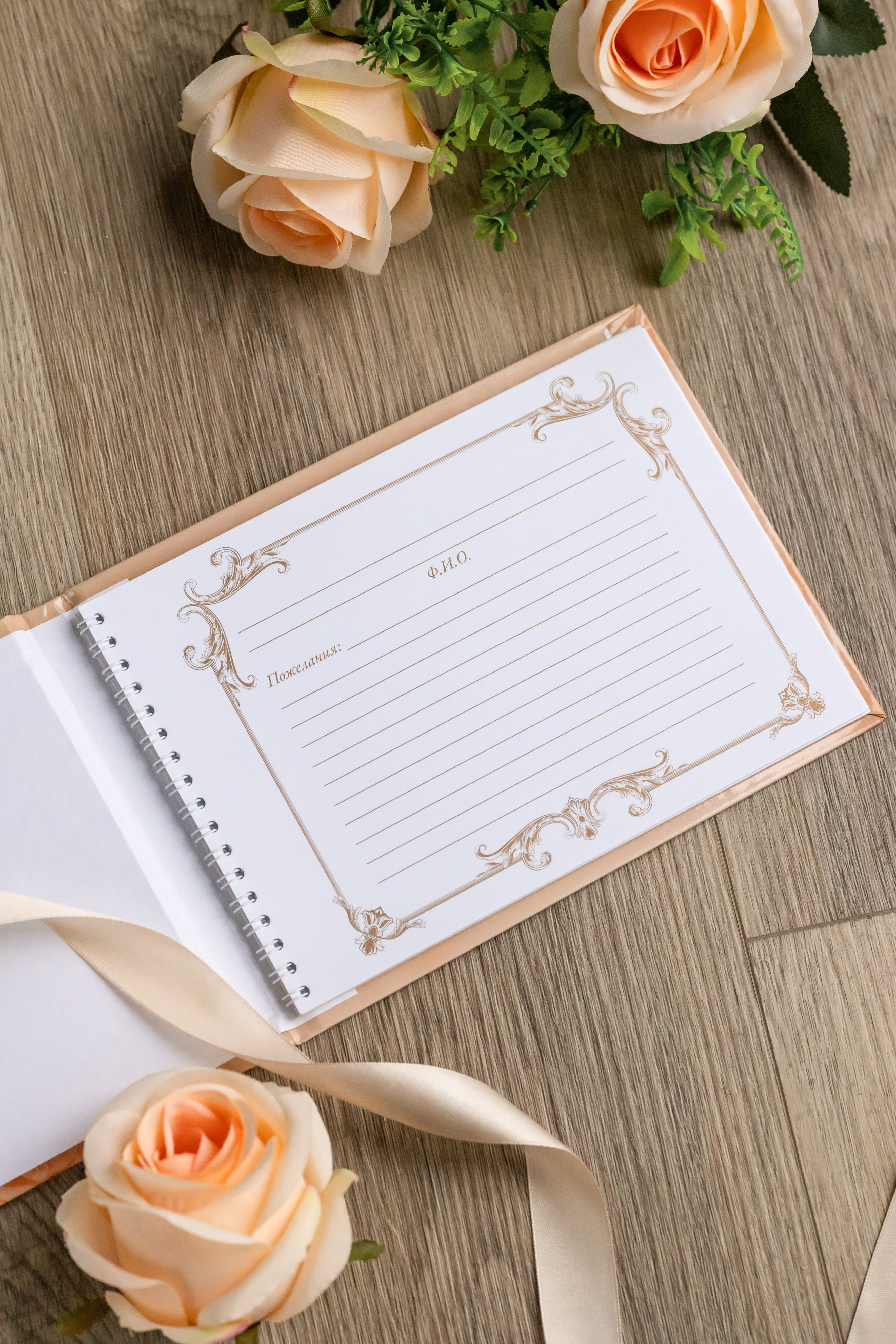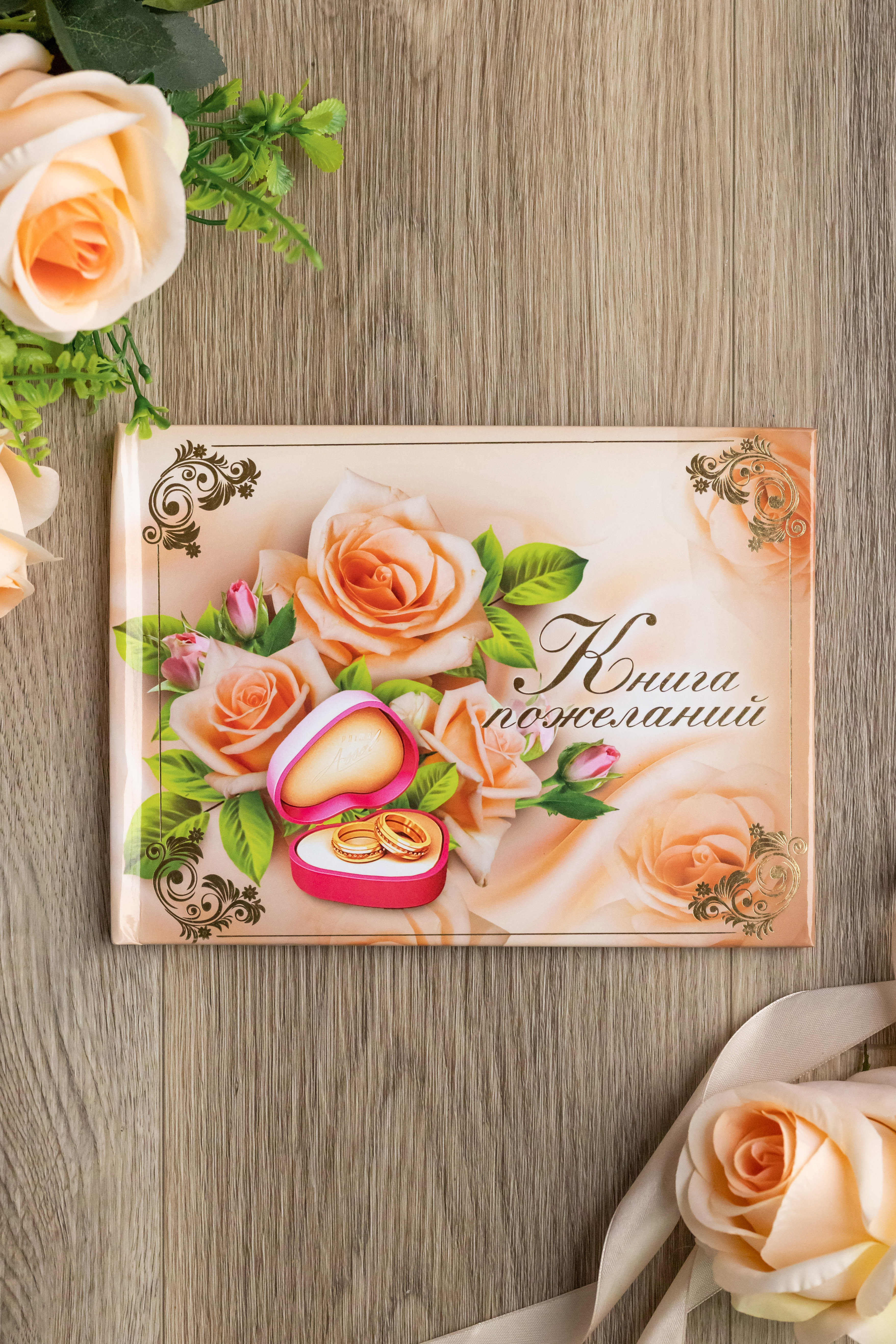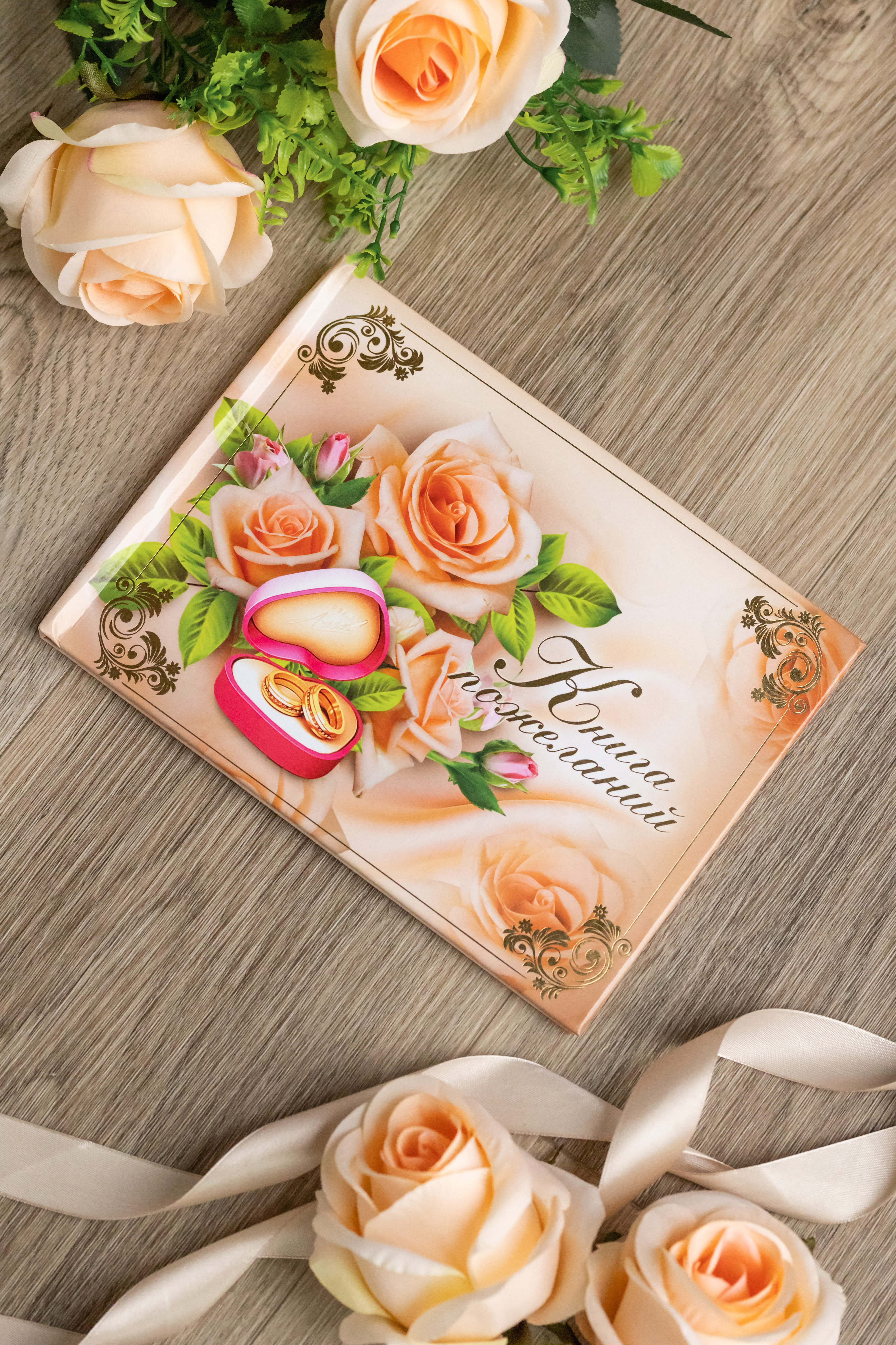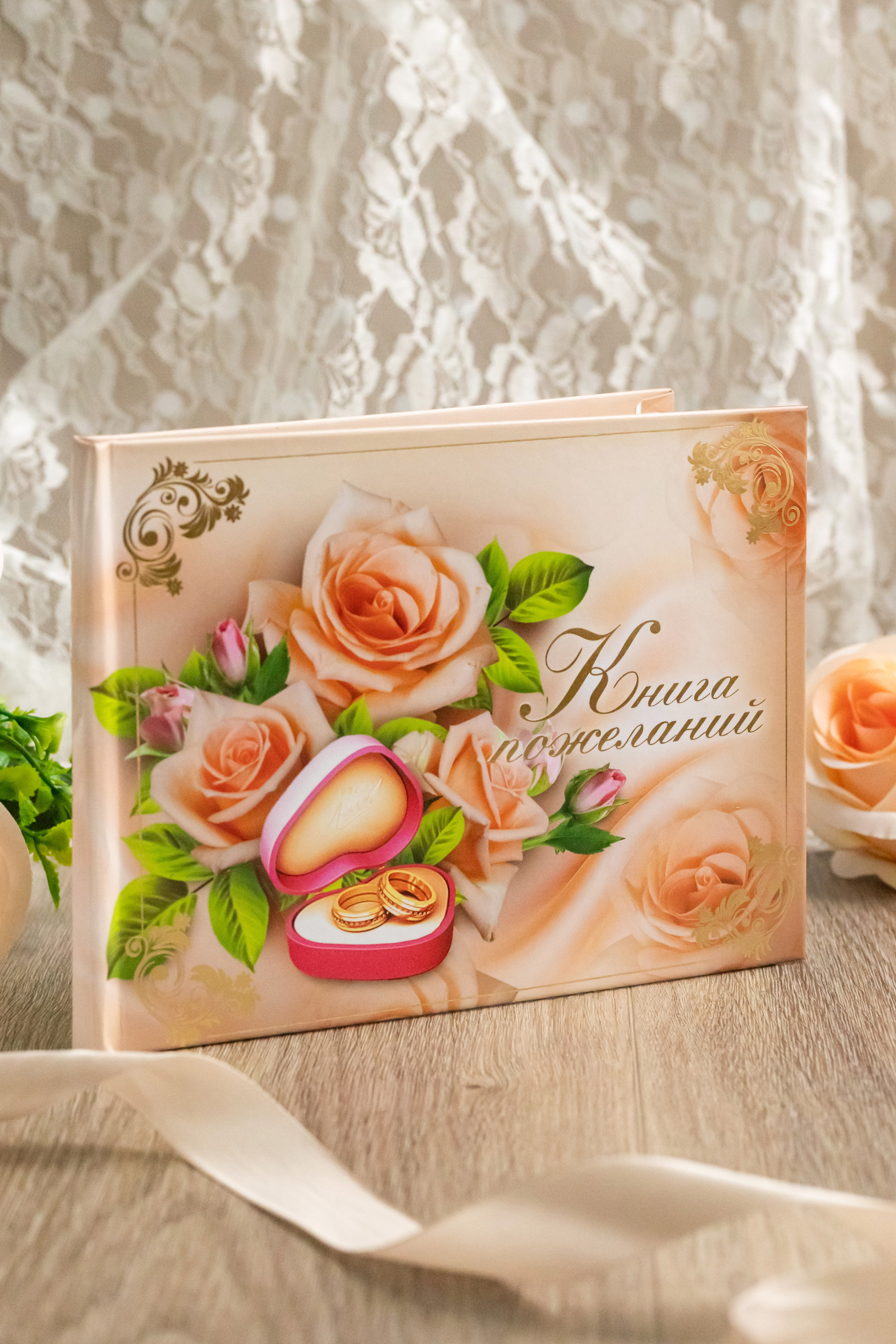 Яркий альбом для пожеланий на свадьбу "Обручальные кольца" с розами чайного цвета, золотыми колечками, вензелями и надписью