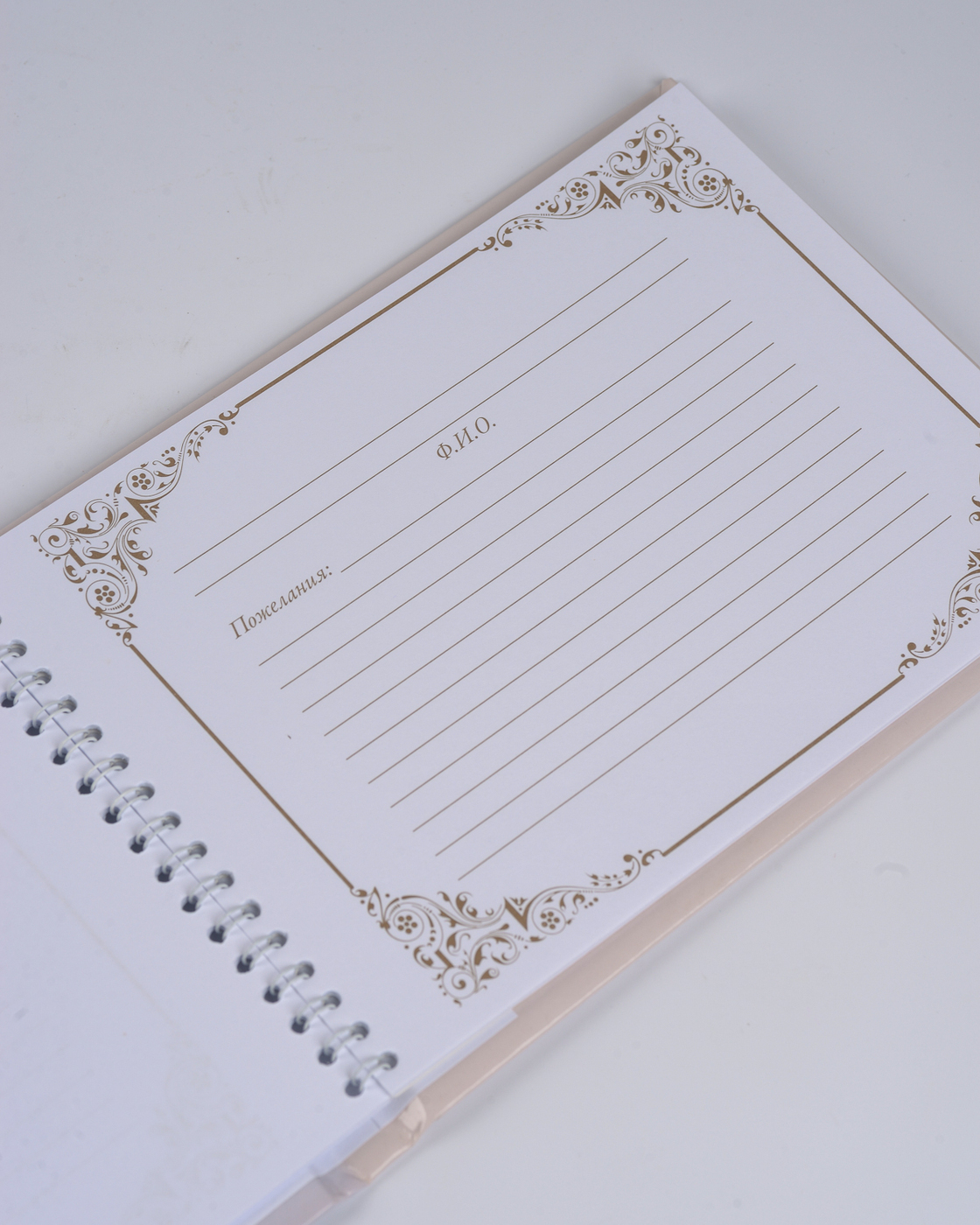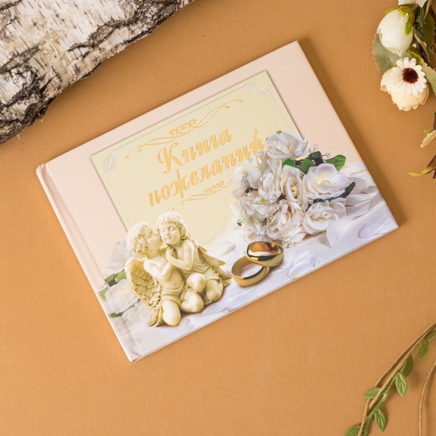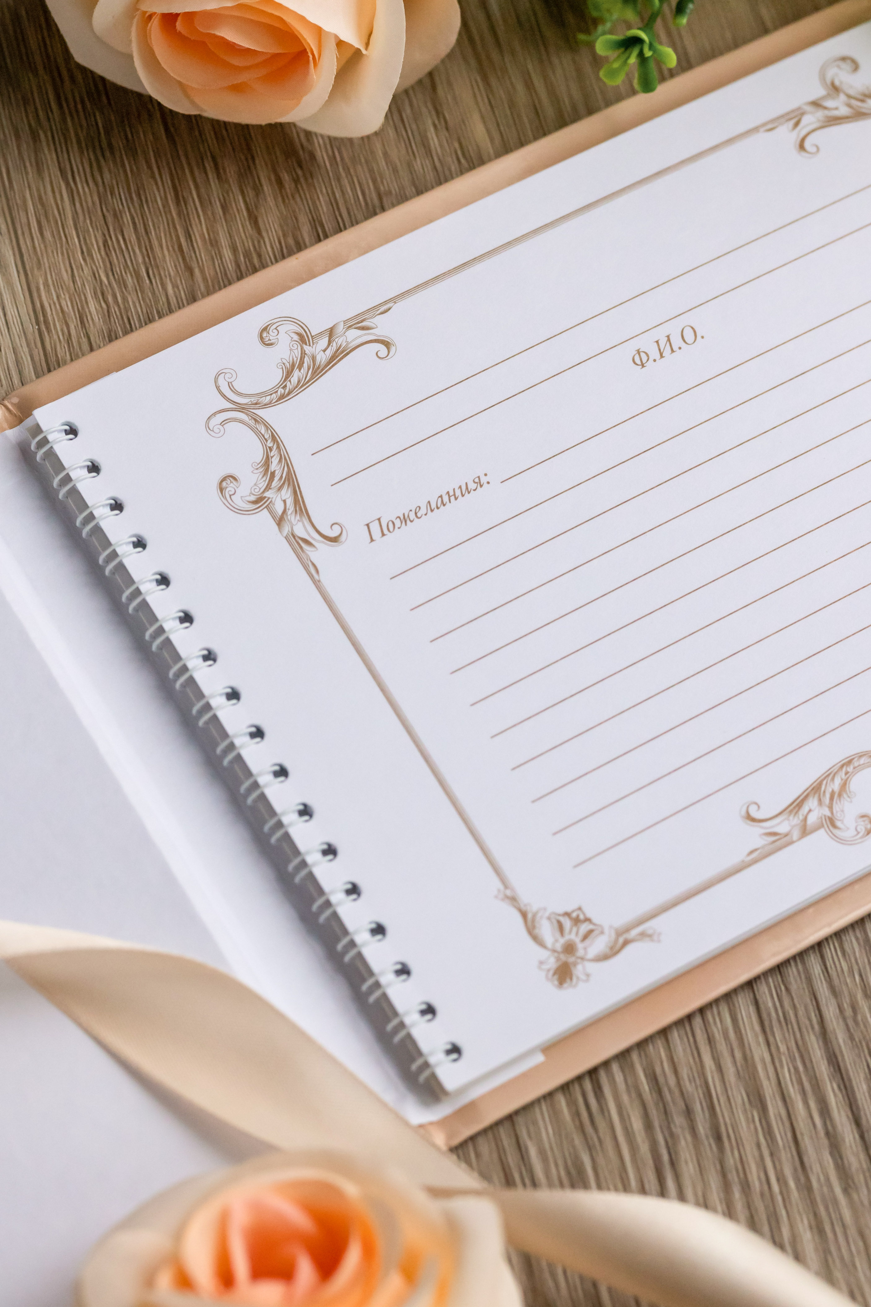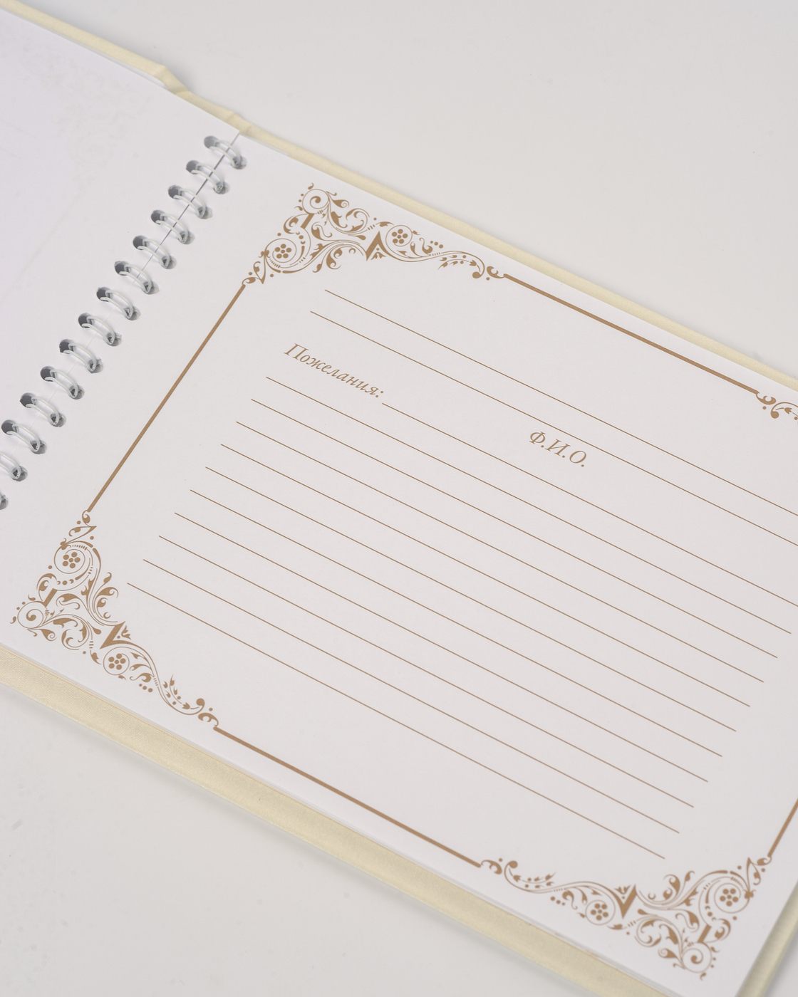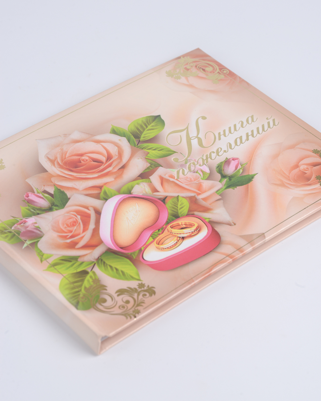 Яркий альбом для пожеланий на свадьбу "Обручальные кольца" с розами чайного цвета, золотыми колечками, вензелями и надписью