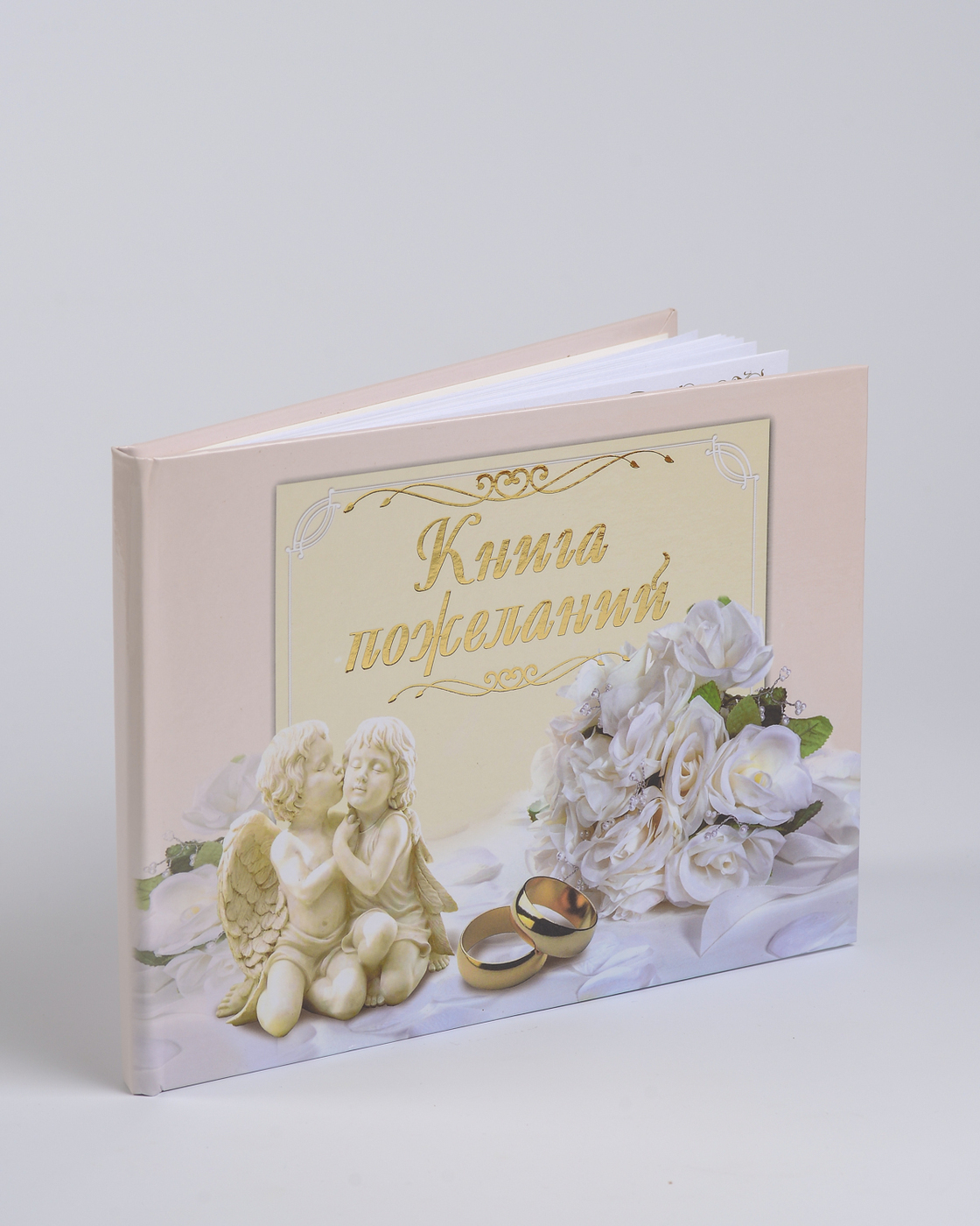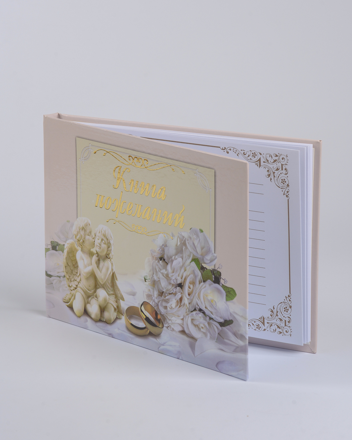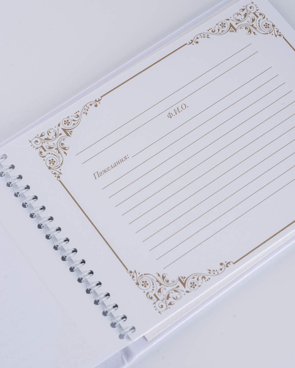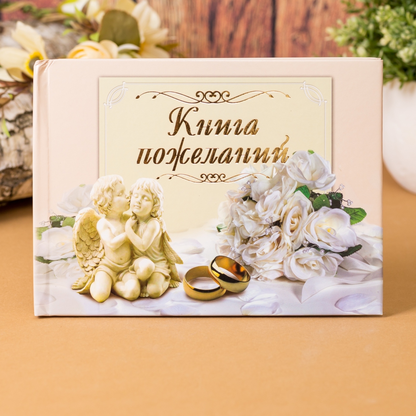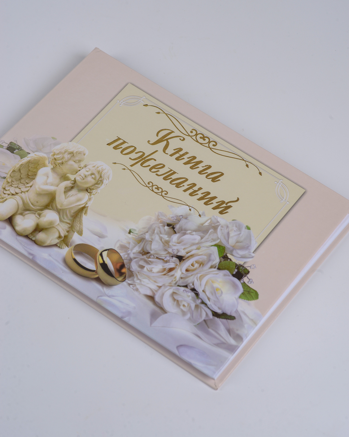 Яркий альбом для пожеланий на свадьбу "Обручальные кольца" с розами чайного цвета, золотыми колечками, вензелями и надписью