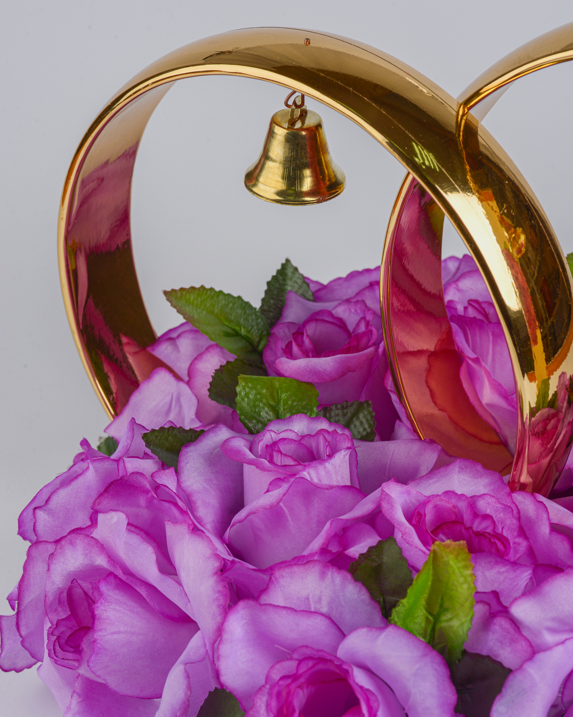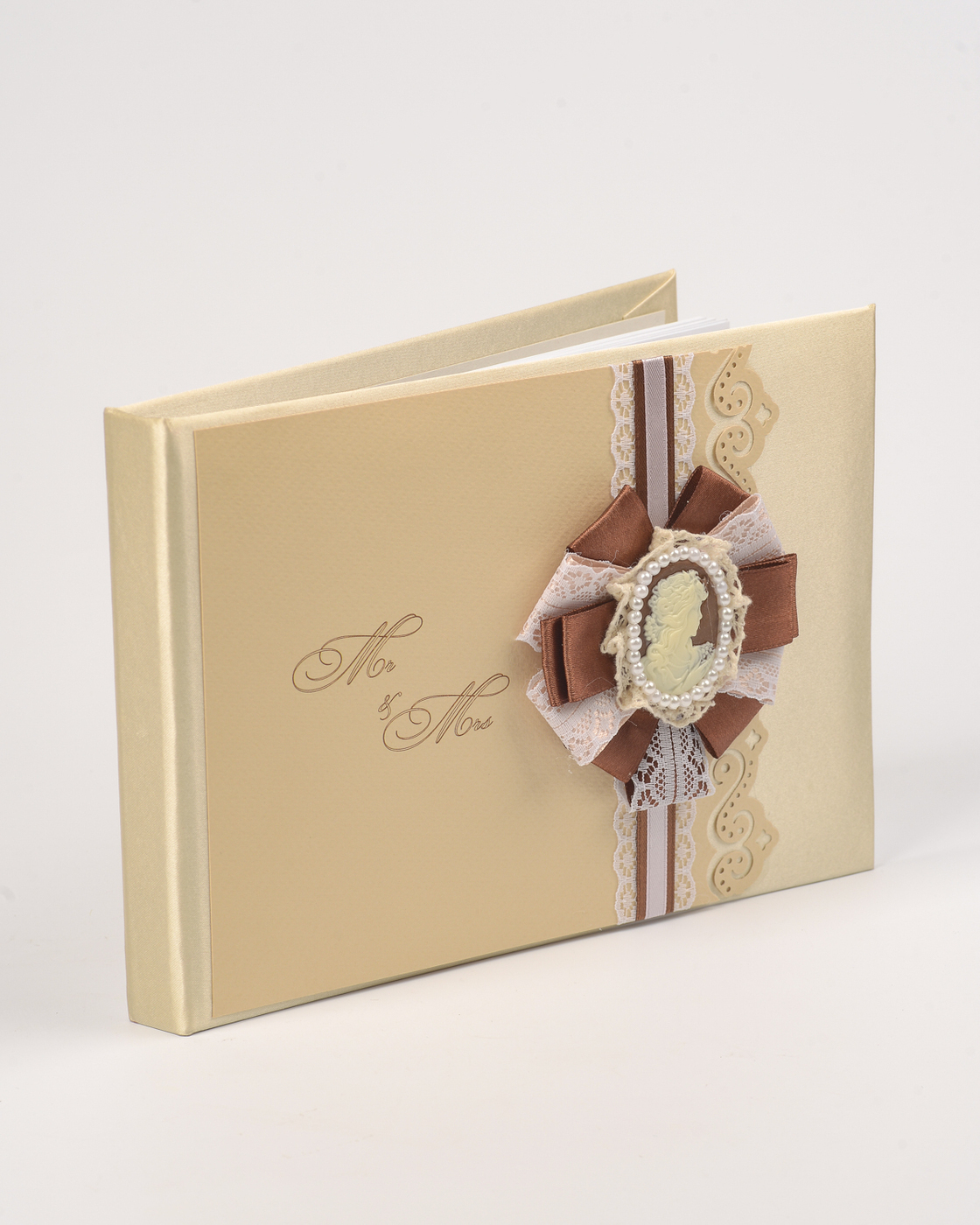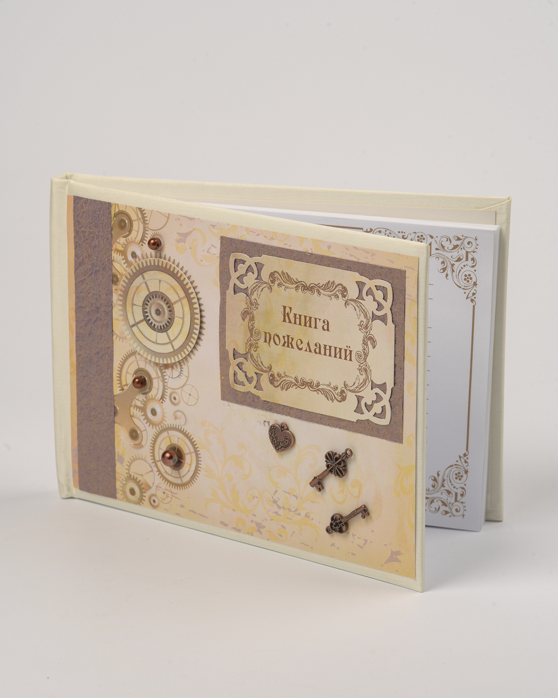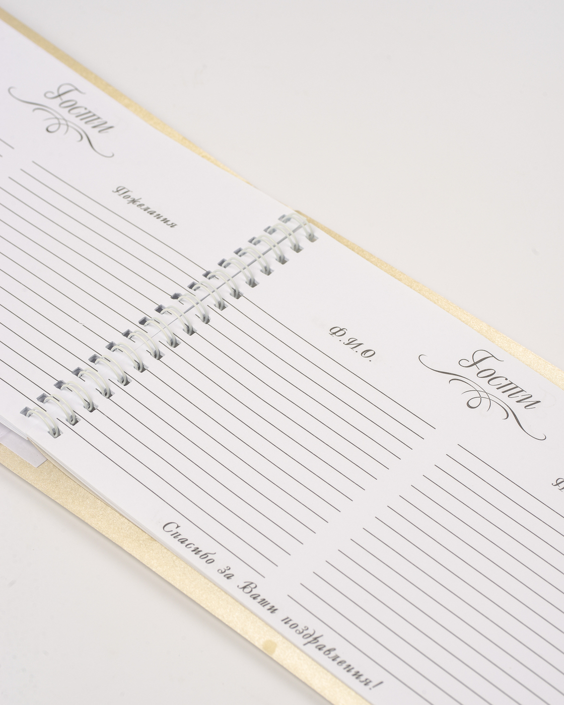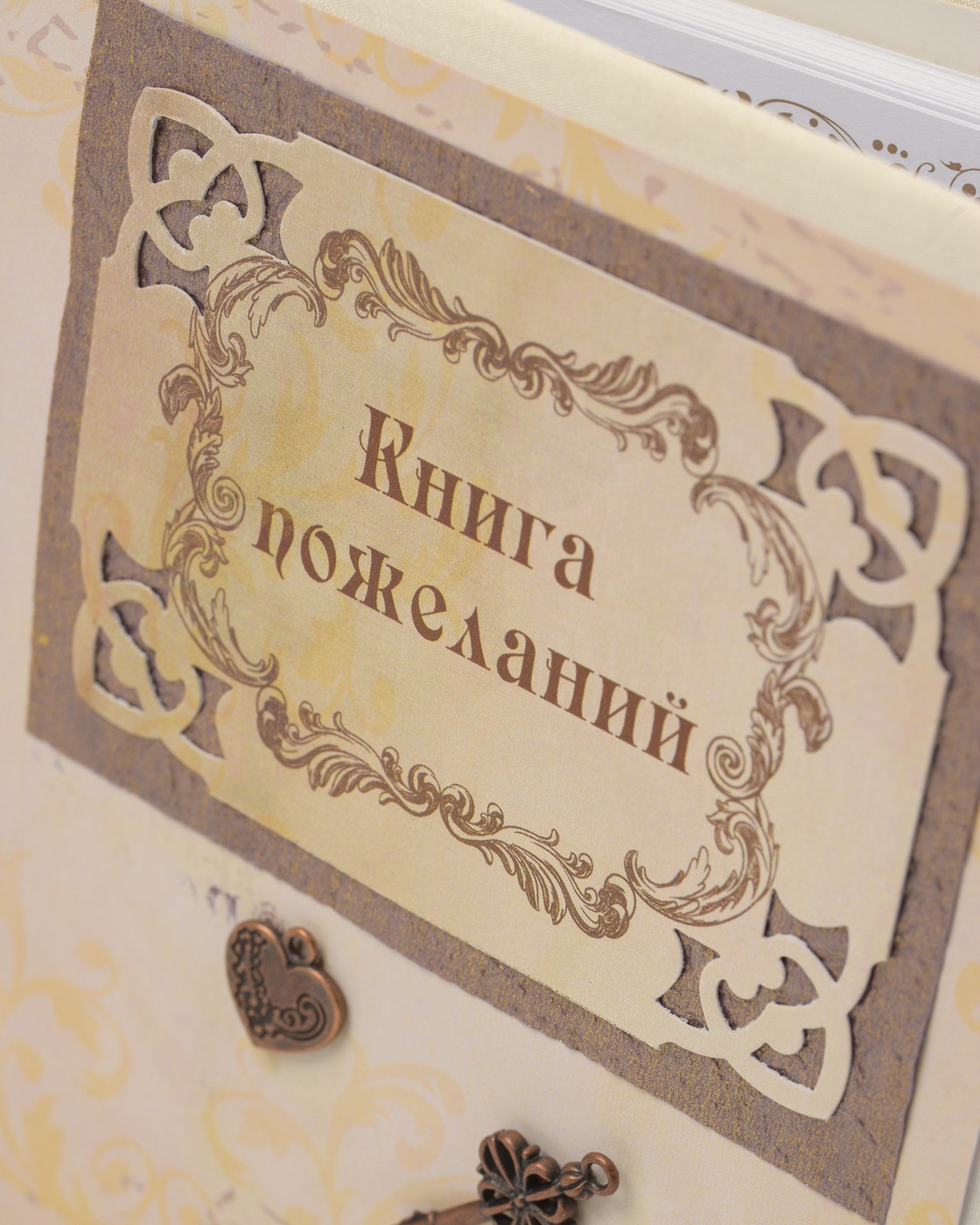 Яркий альбом для пожеланий на свадьбу "Обручальные кольца" с розами чайного цвета, золотыми колечками, вензелями и надписью