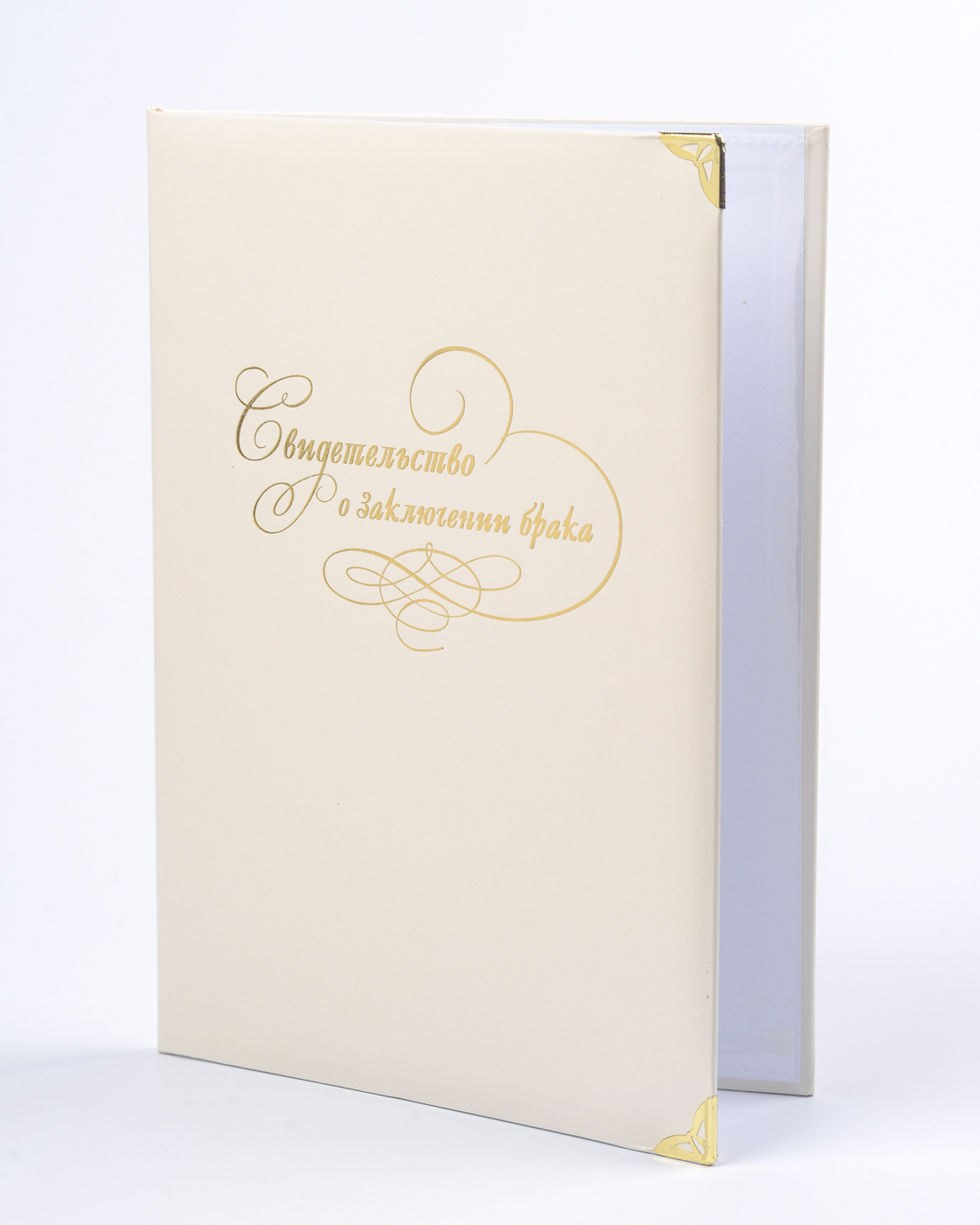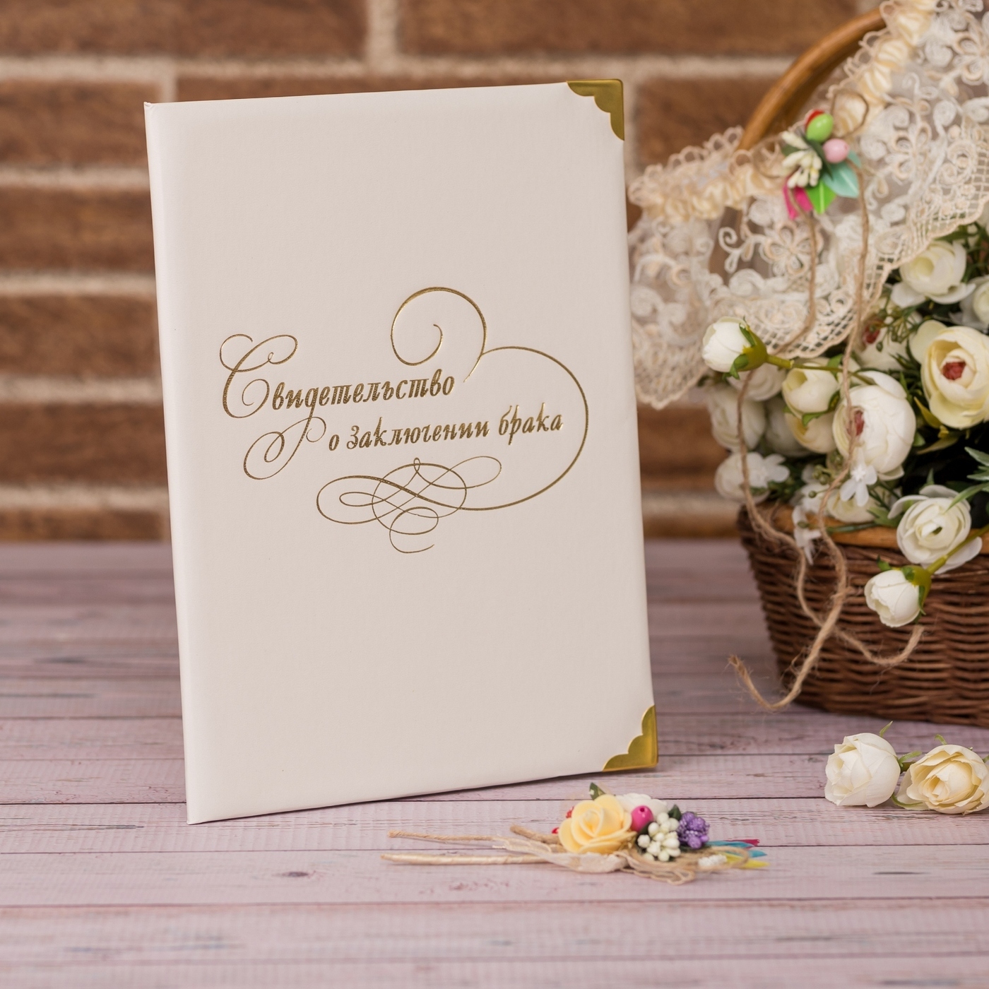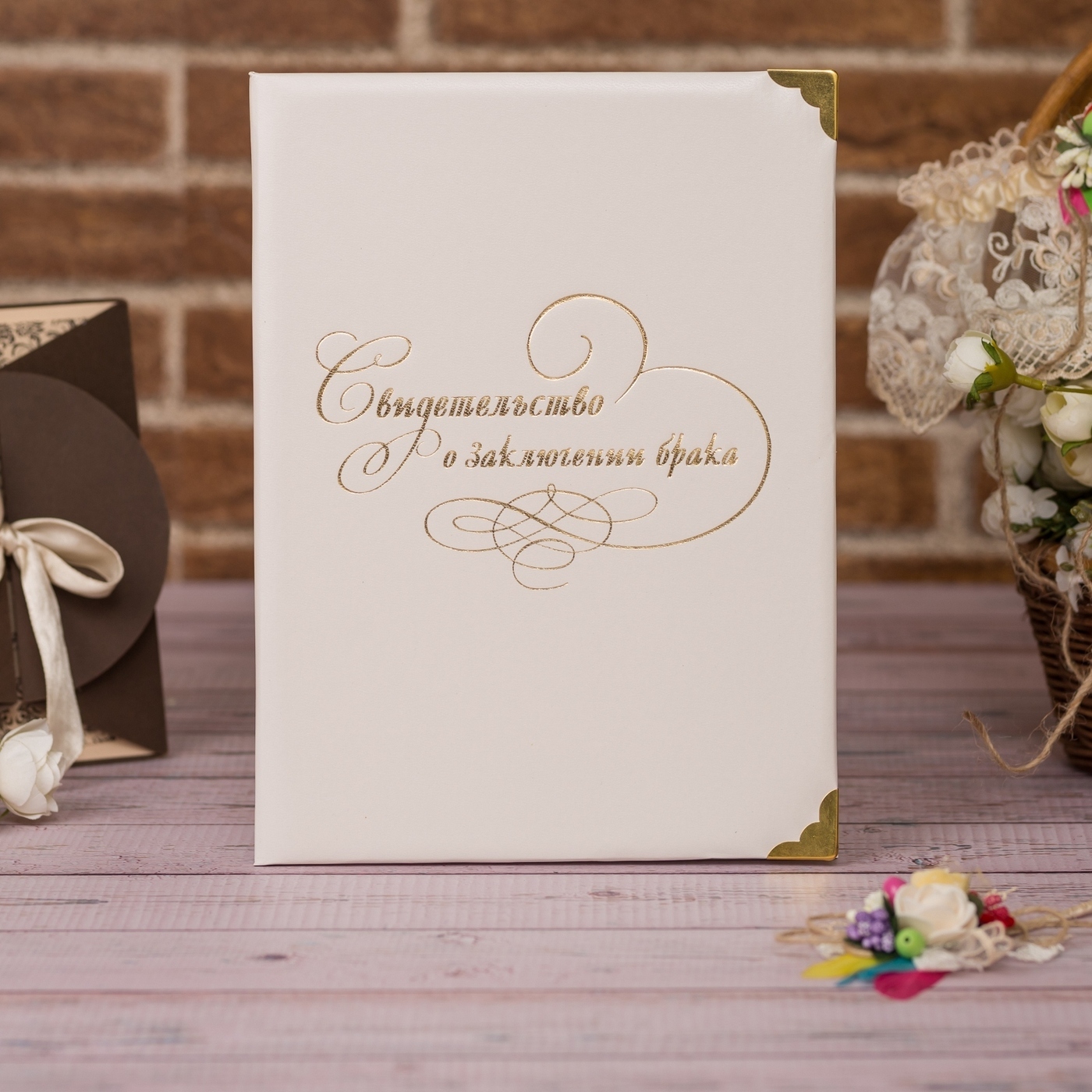 Классическая свадебная папка для свидетельства о заключении брака цвета айвори с золотой надписью, узором и металлическими уголками