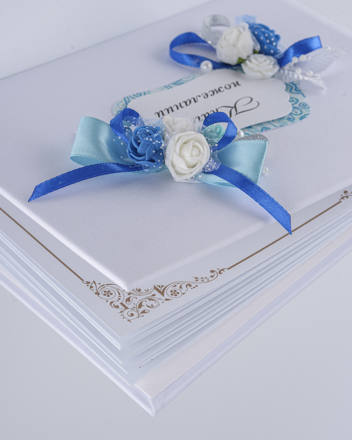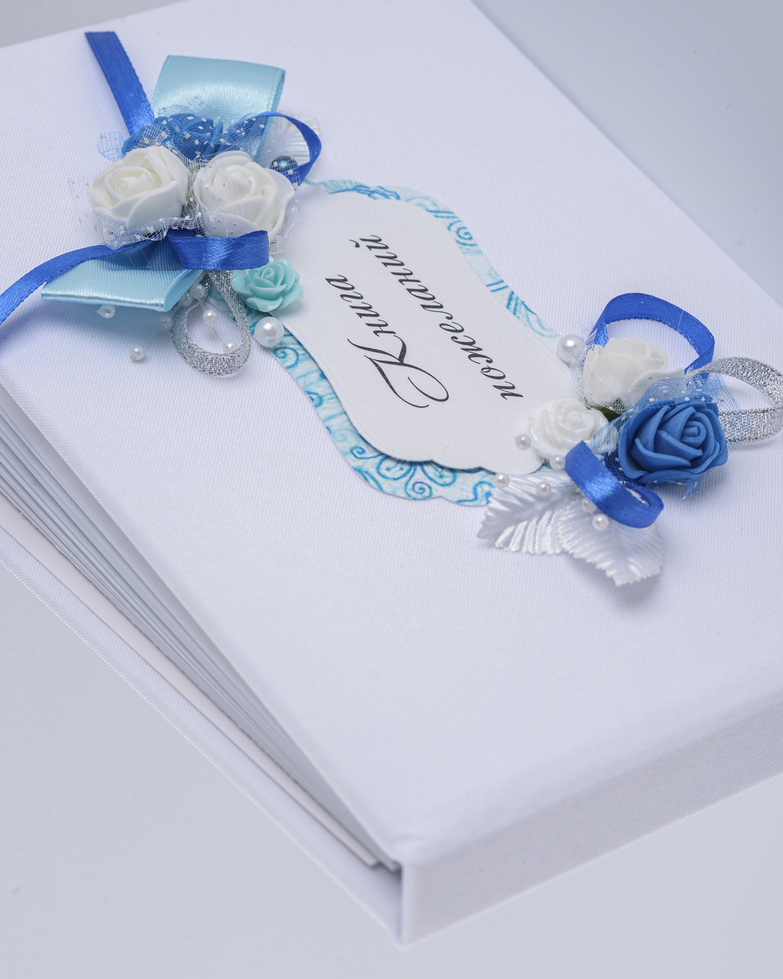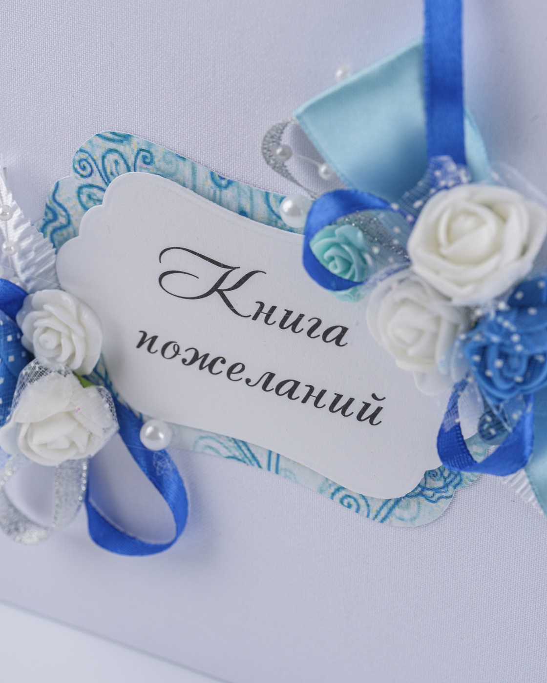 Свадебная книга пожеланий "Синие розы" с голубыми атласными лентами, белыми и синими розами из латекса, фигурной табличкой с надписью