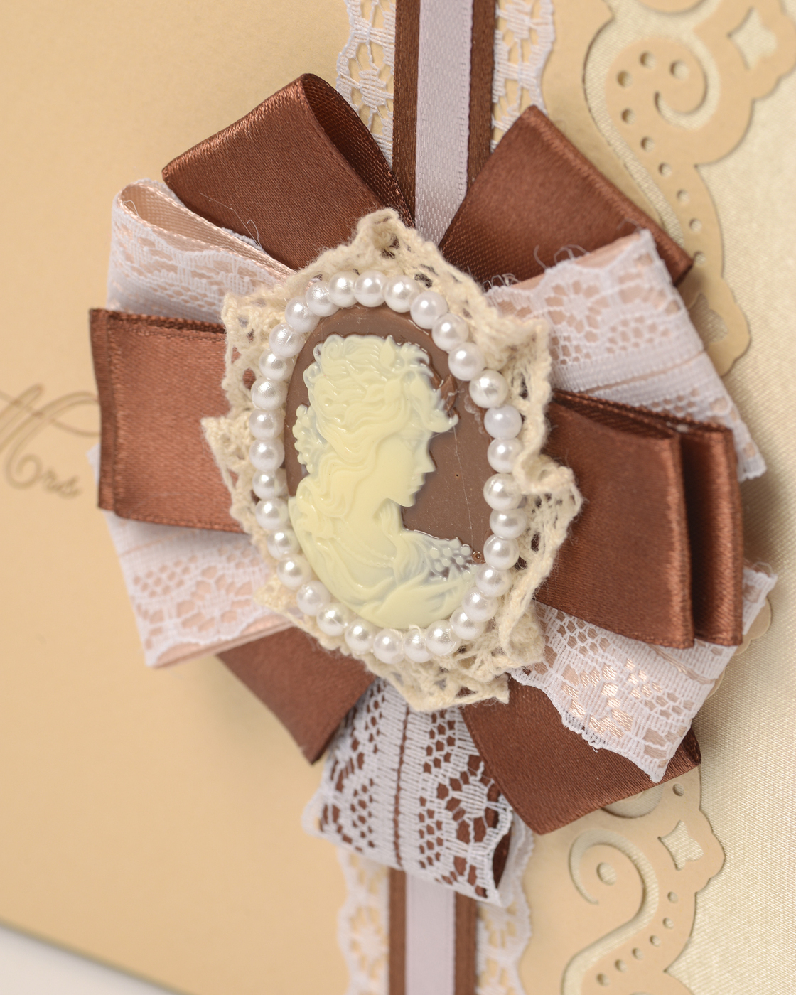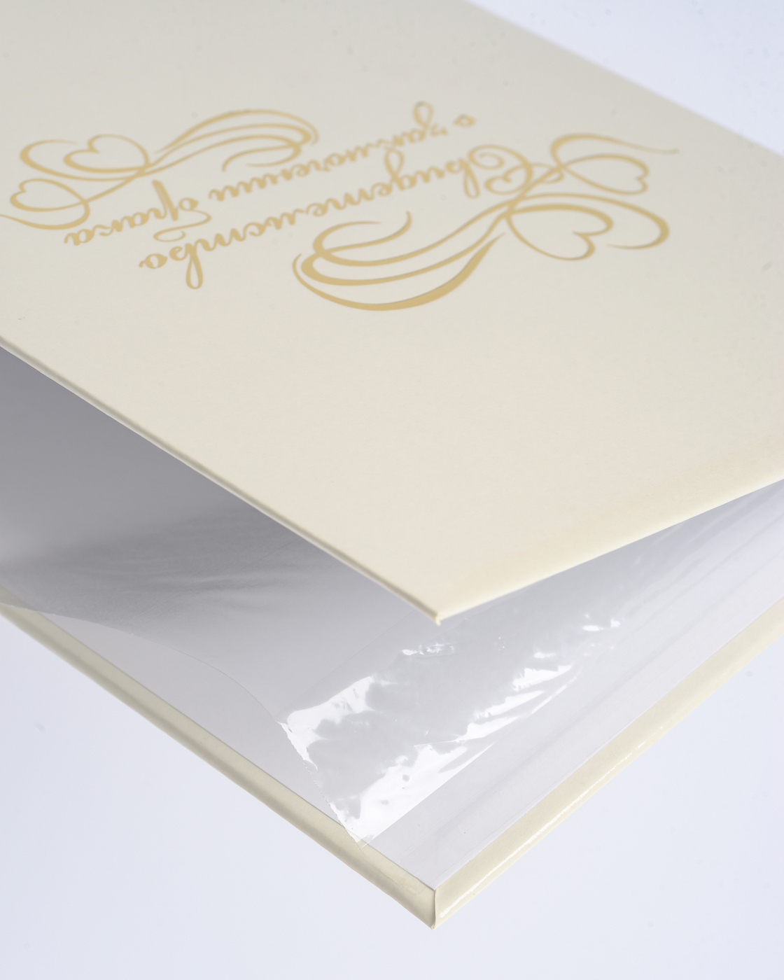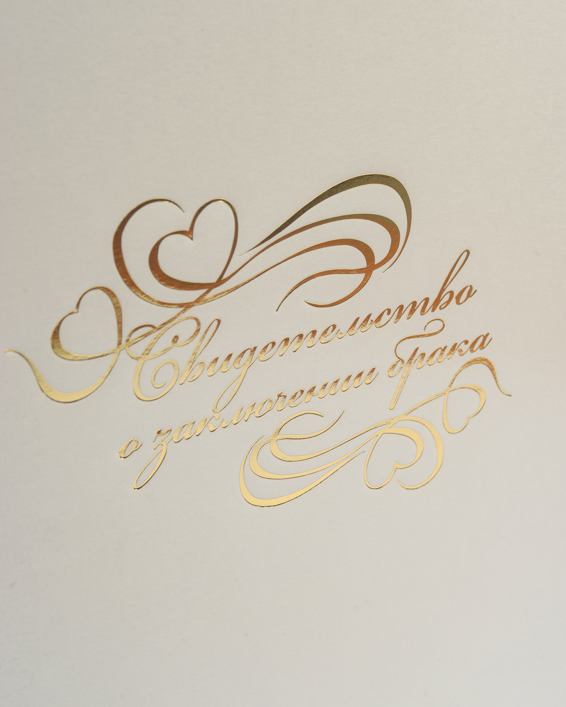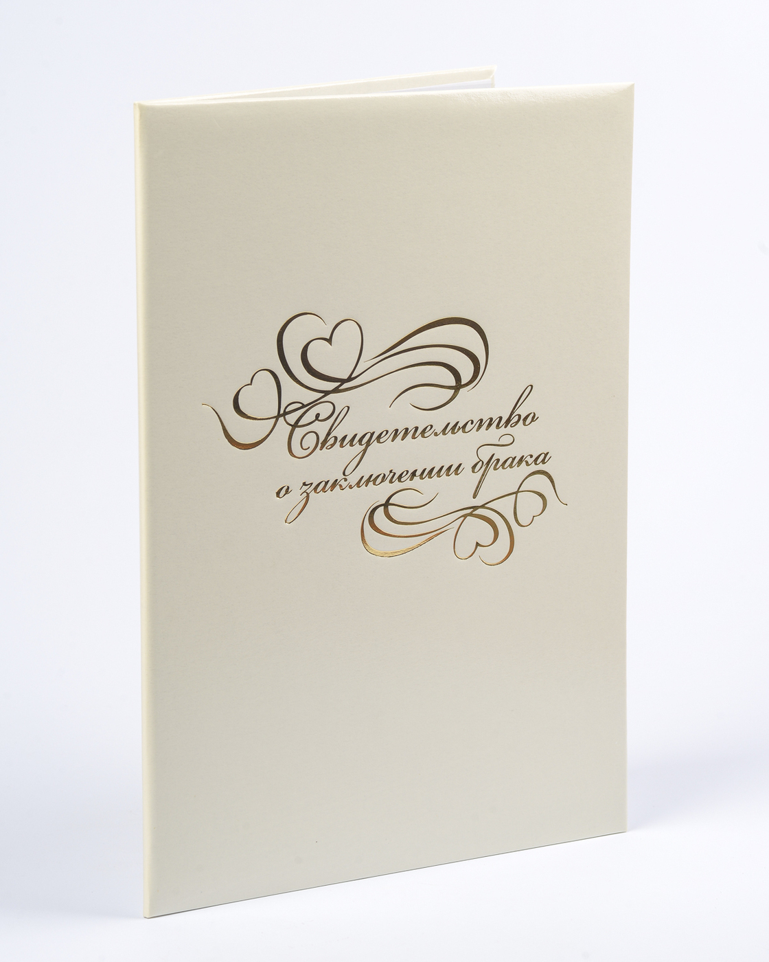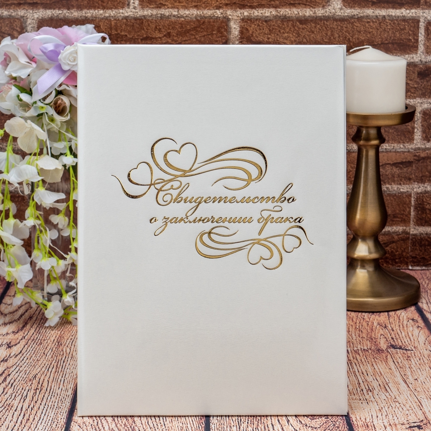 Папка для свидетельства о браке цвета айвори с золотым тиснением, надписью, сердцами и красивыми узорами