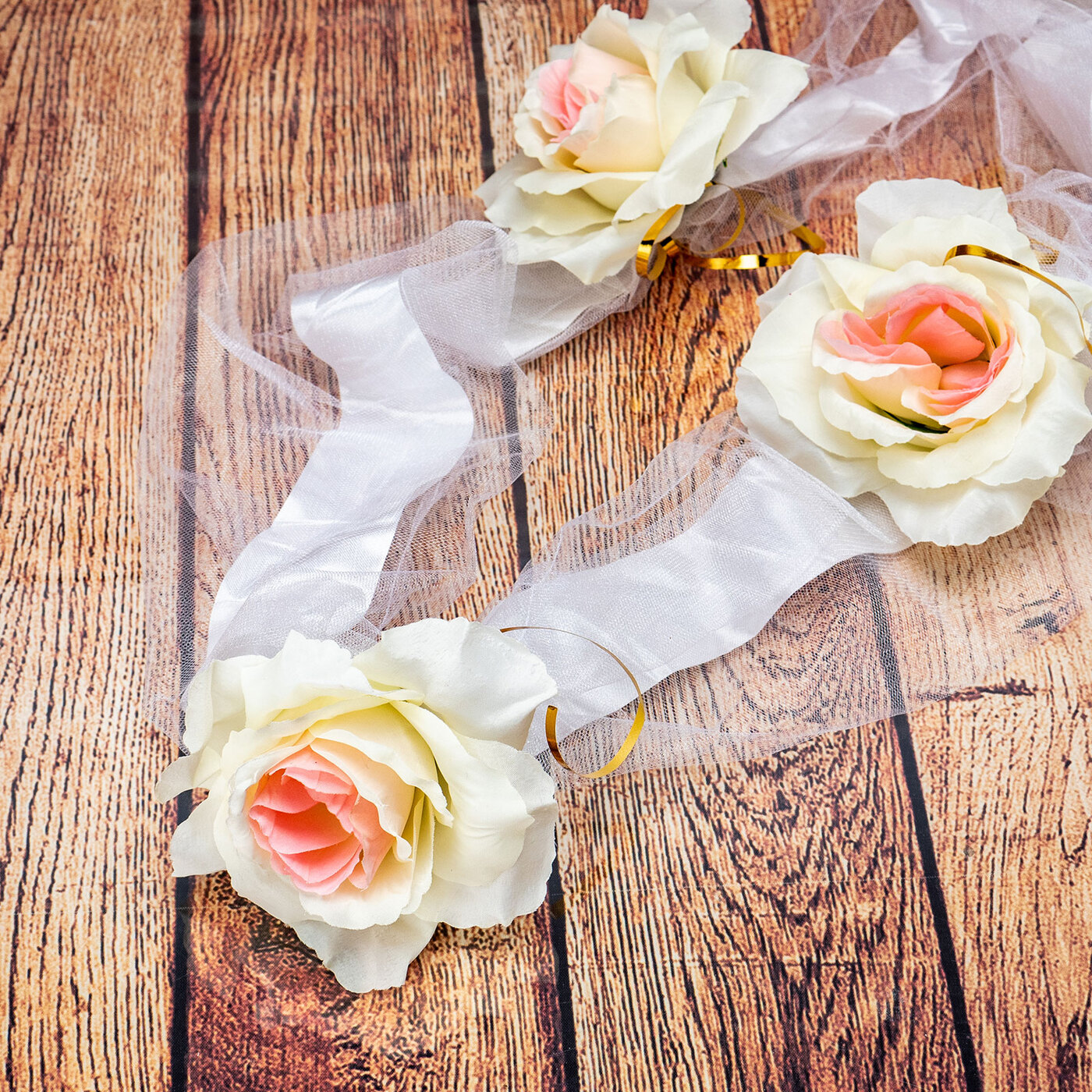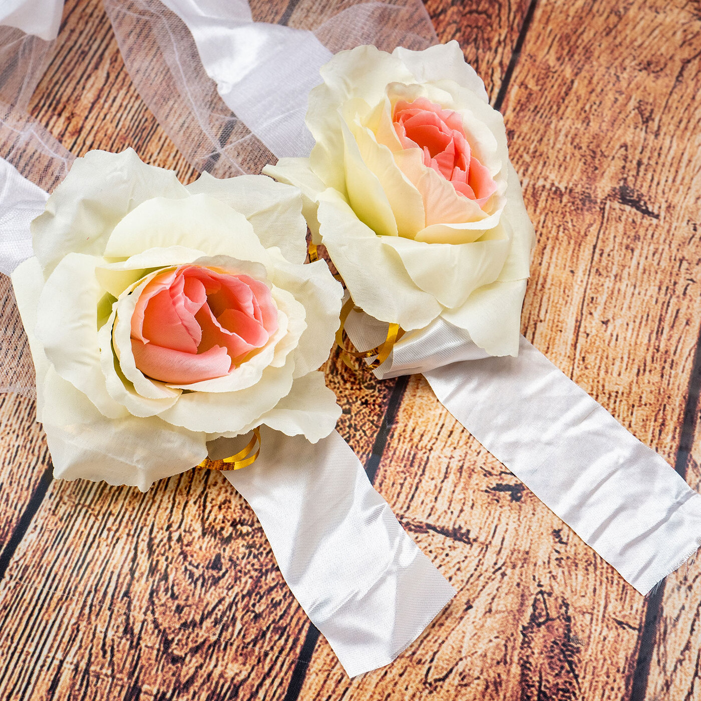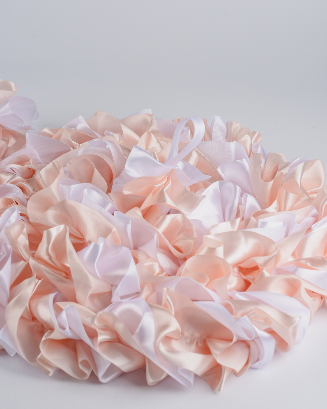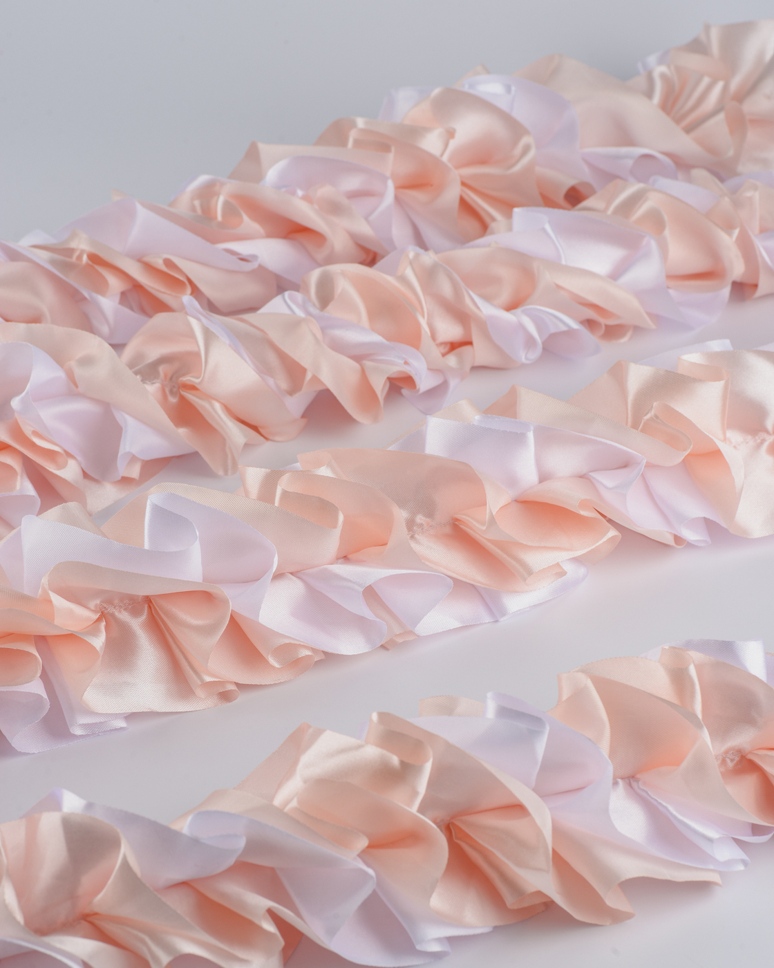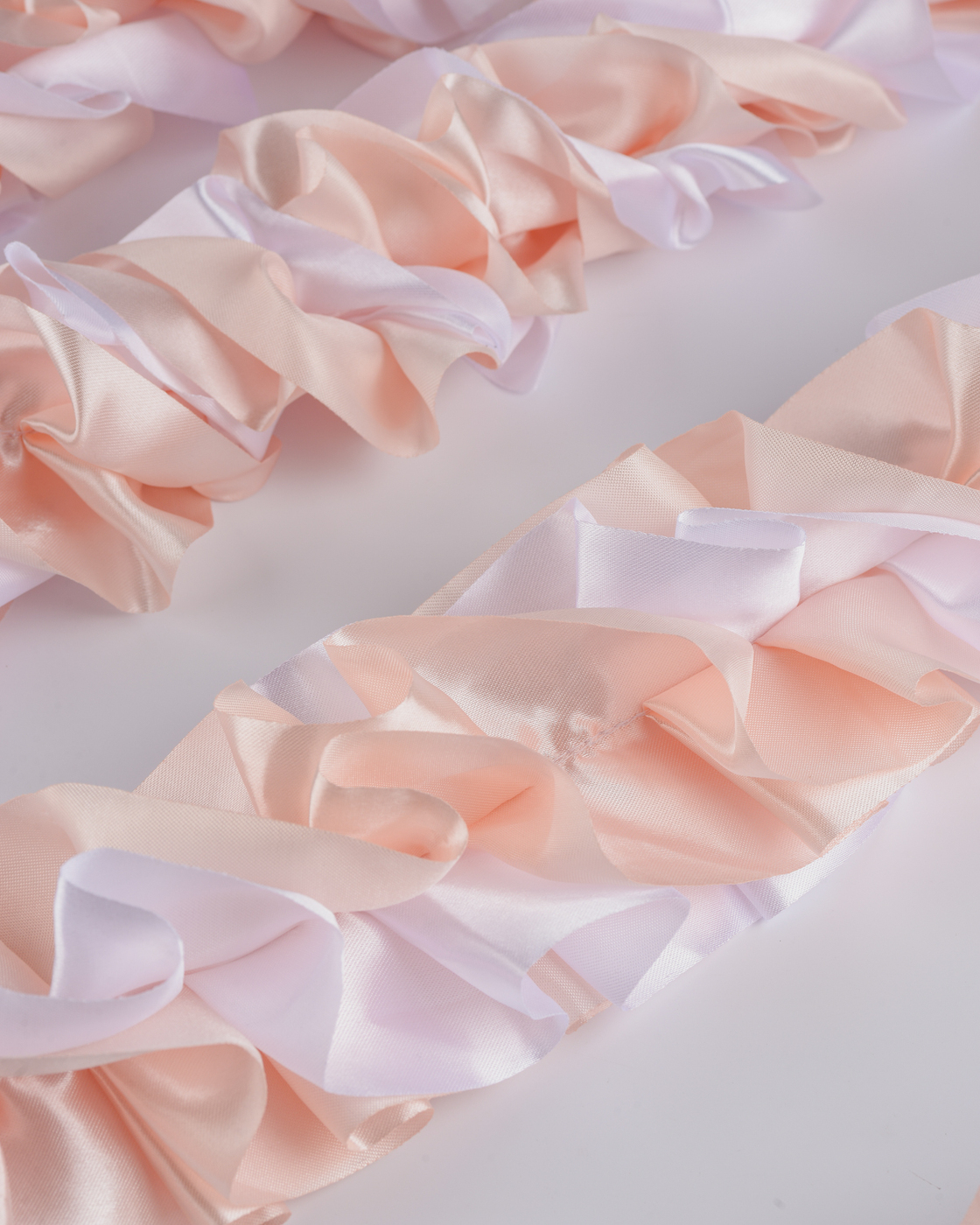 Двухцветная лента - рюш из атласной ленты на капот свадебного авто, белая и персиковая, 3 метра
