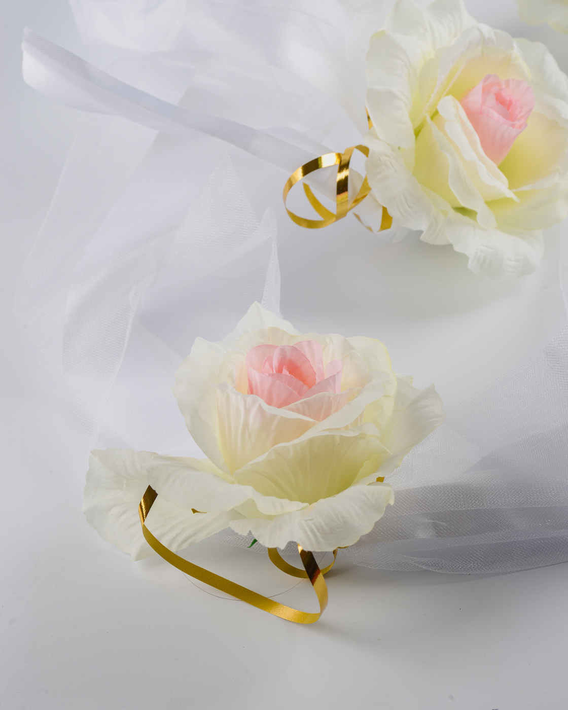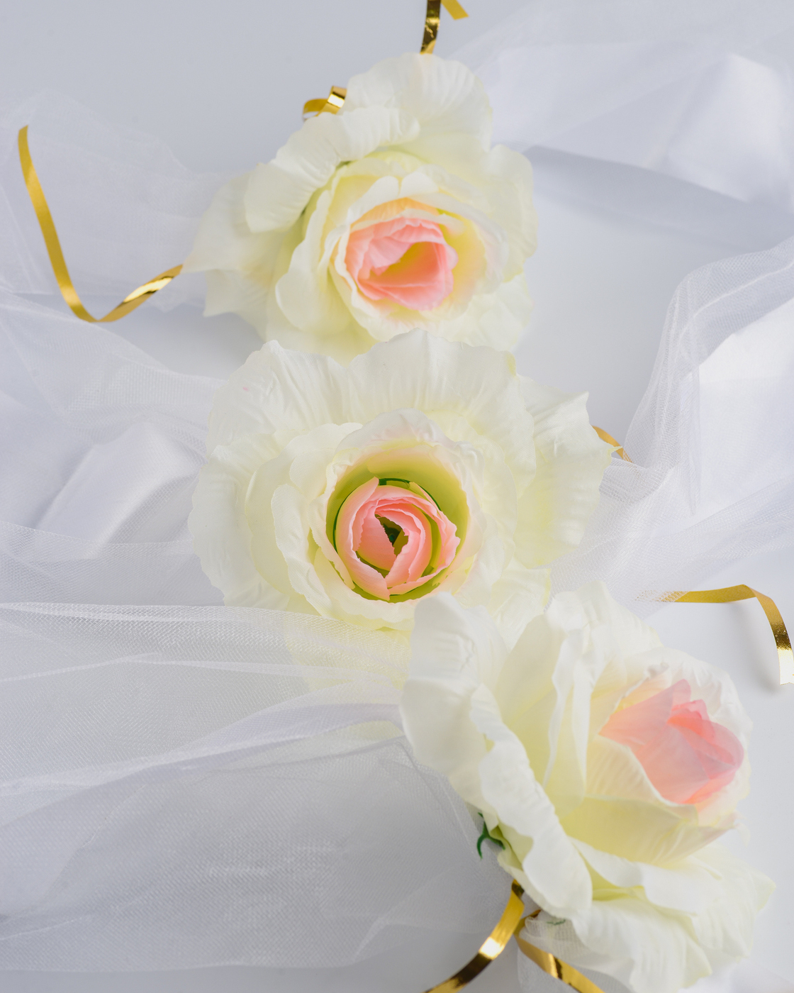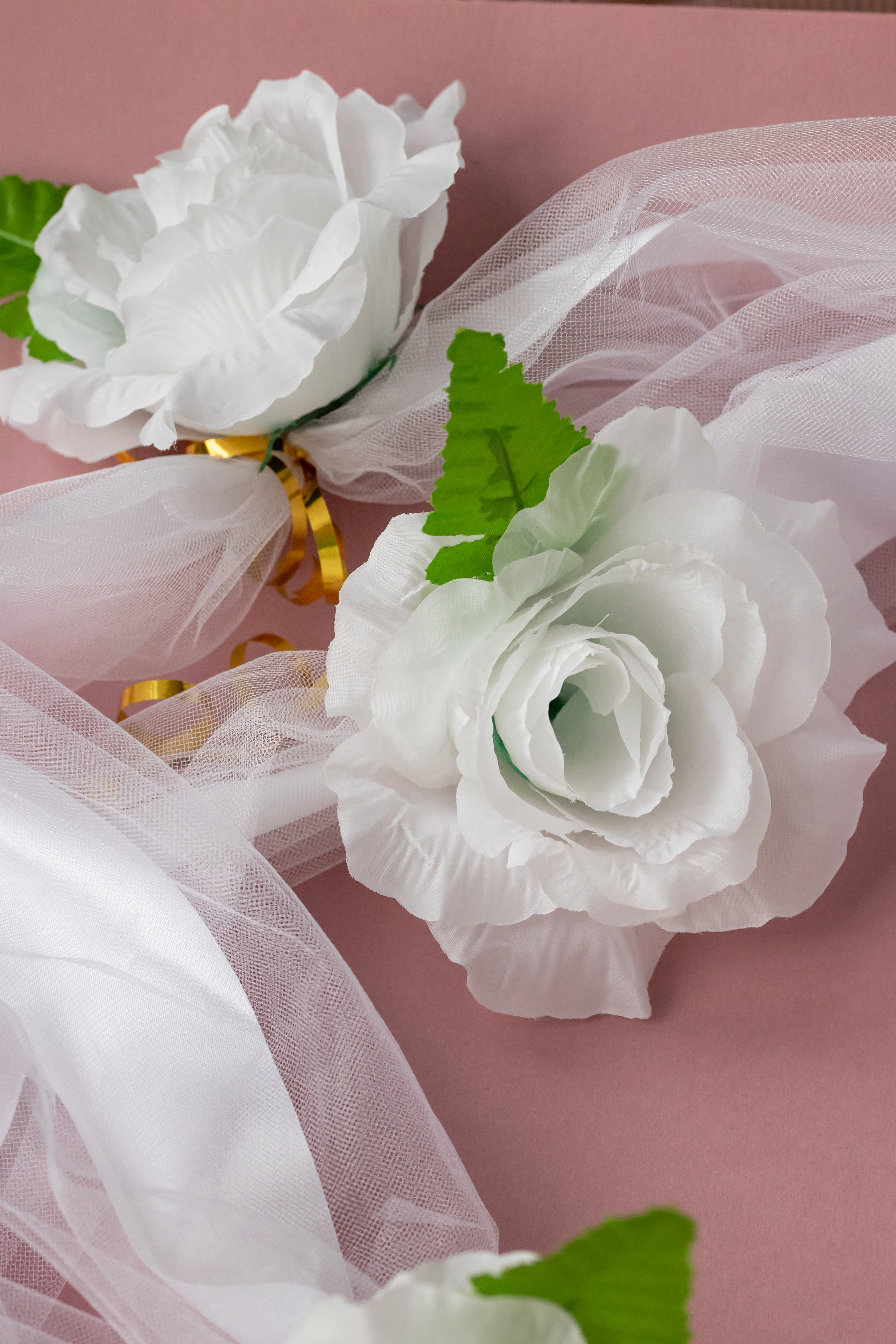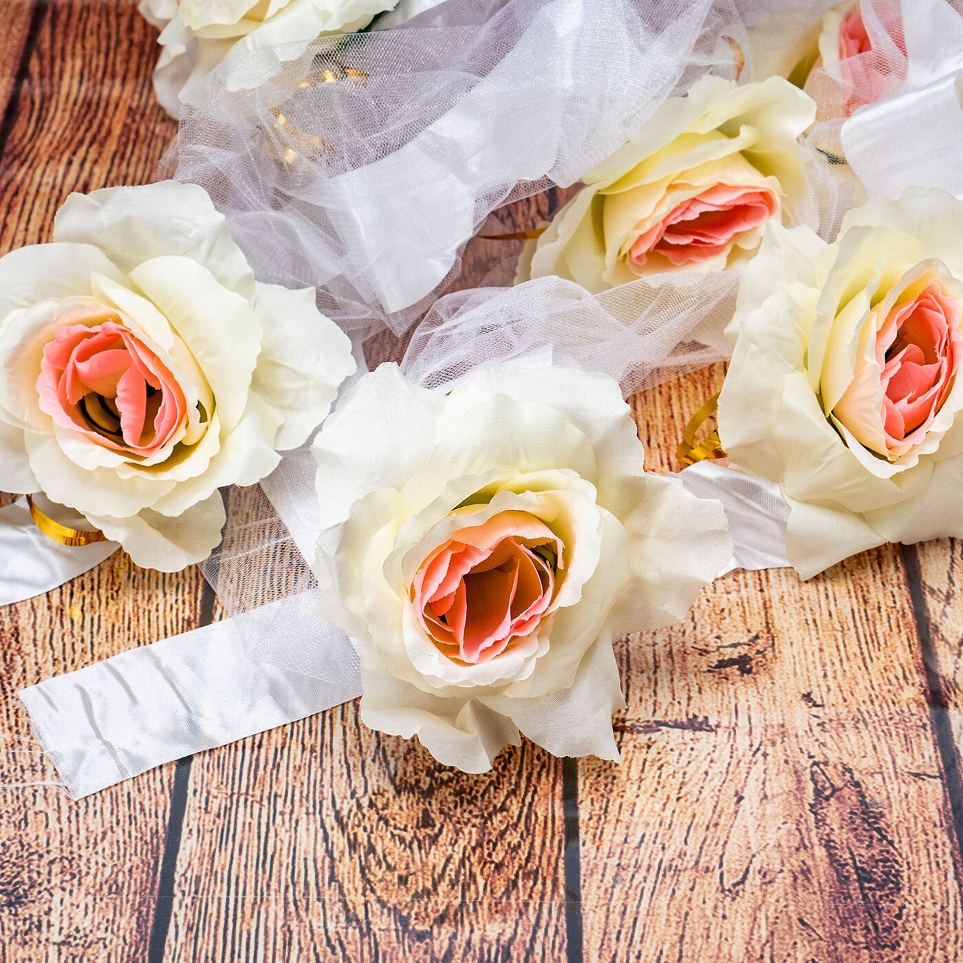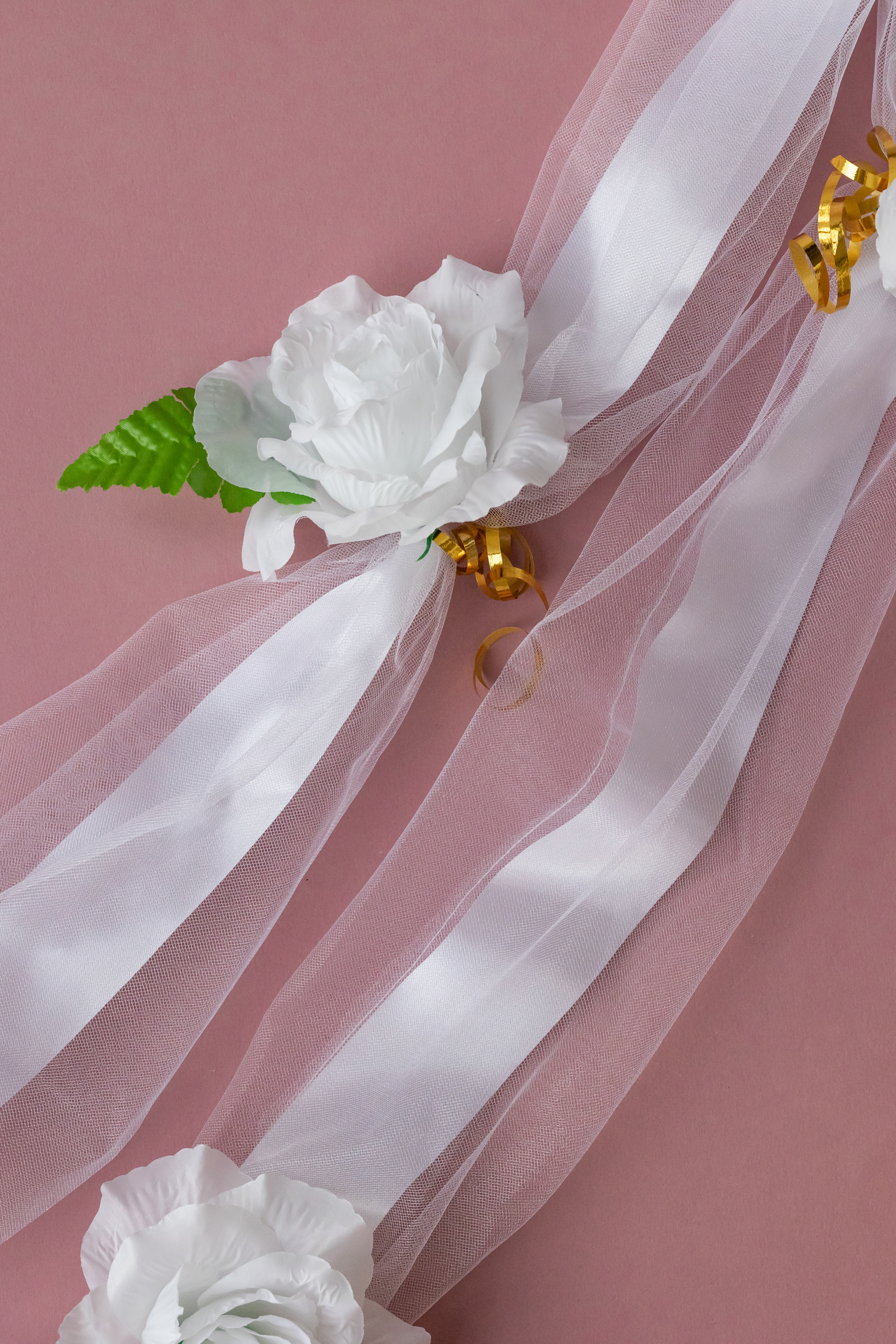 Двухцветная лента - рюш из атласной ленты на капот свадебного авто, белая и персиковая, 3 метра