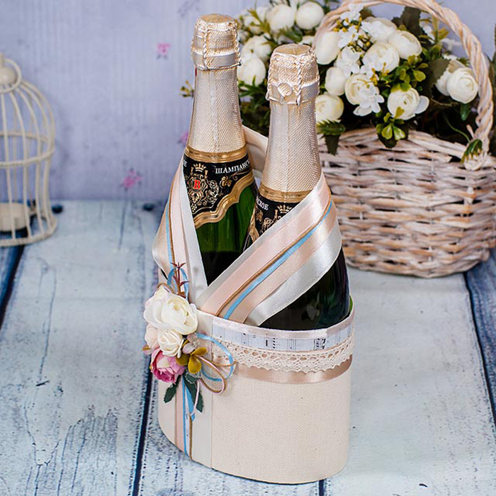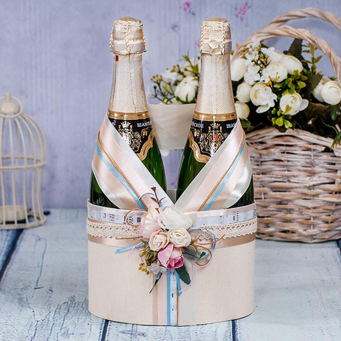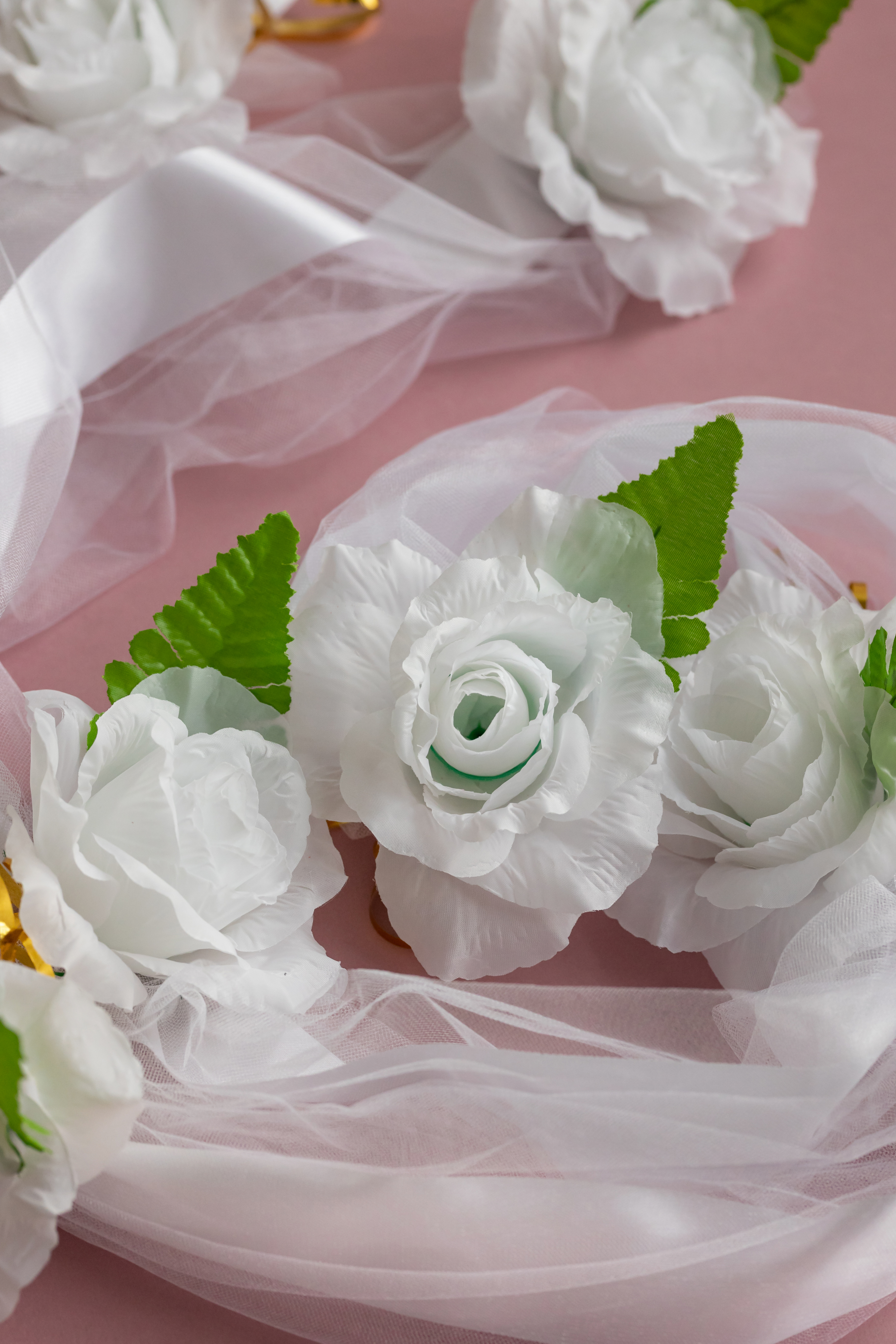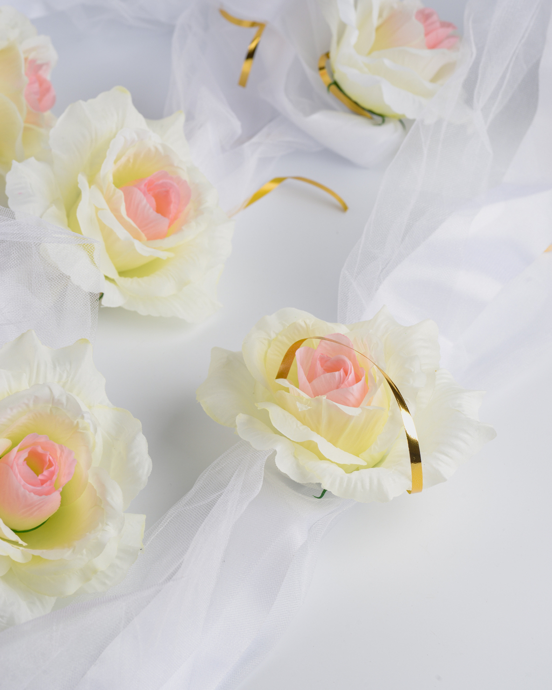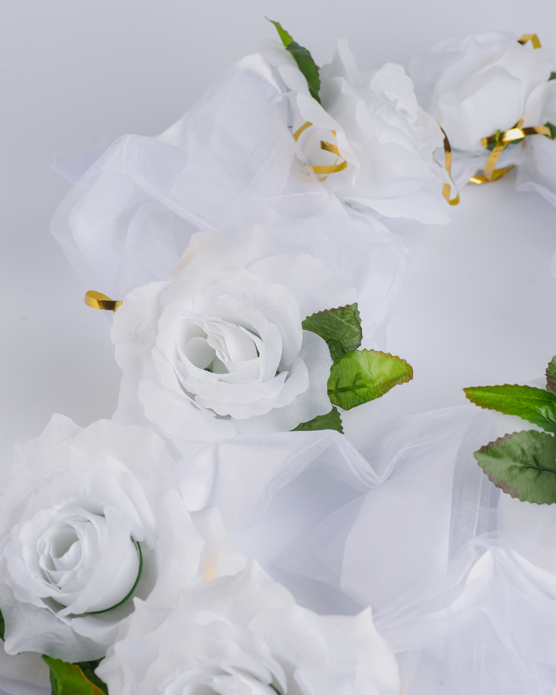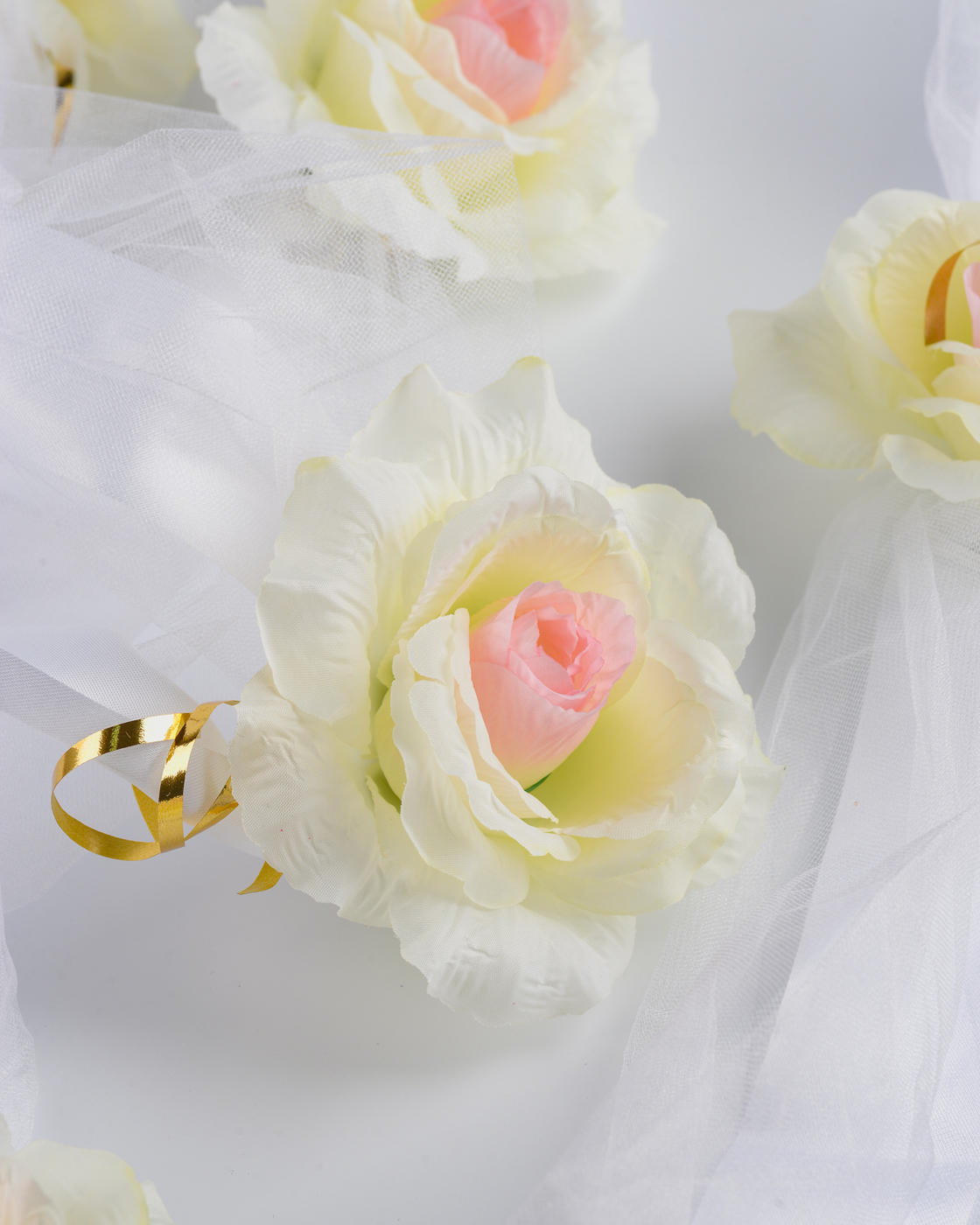 Двухцветная лента - рюш из атласной ленты на капот свадебного авто, белая и персиковая, 3 метра