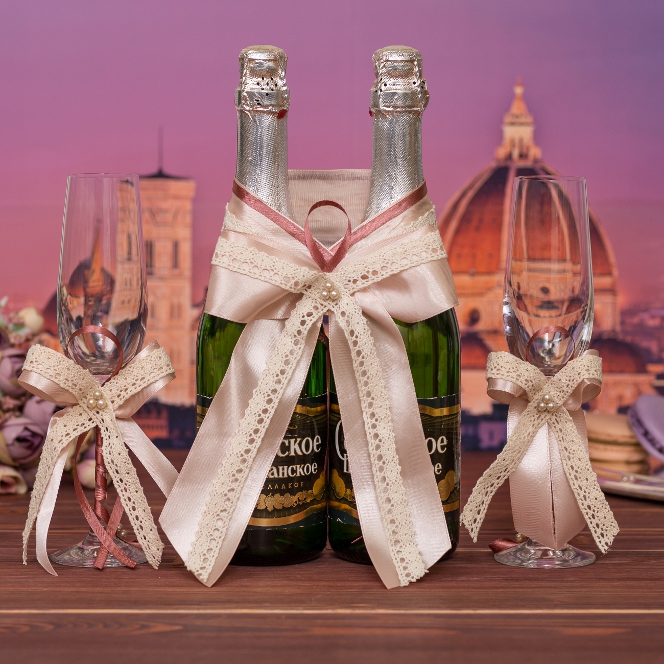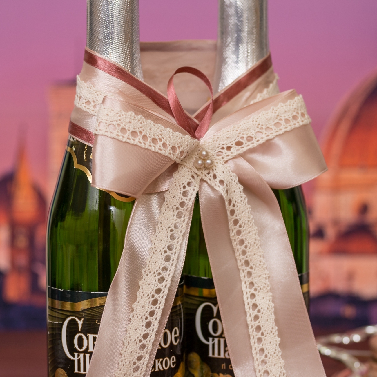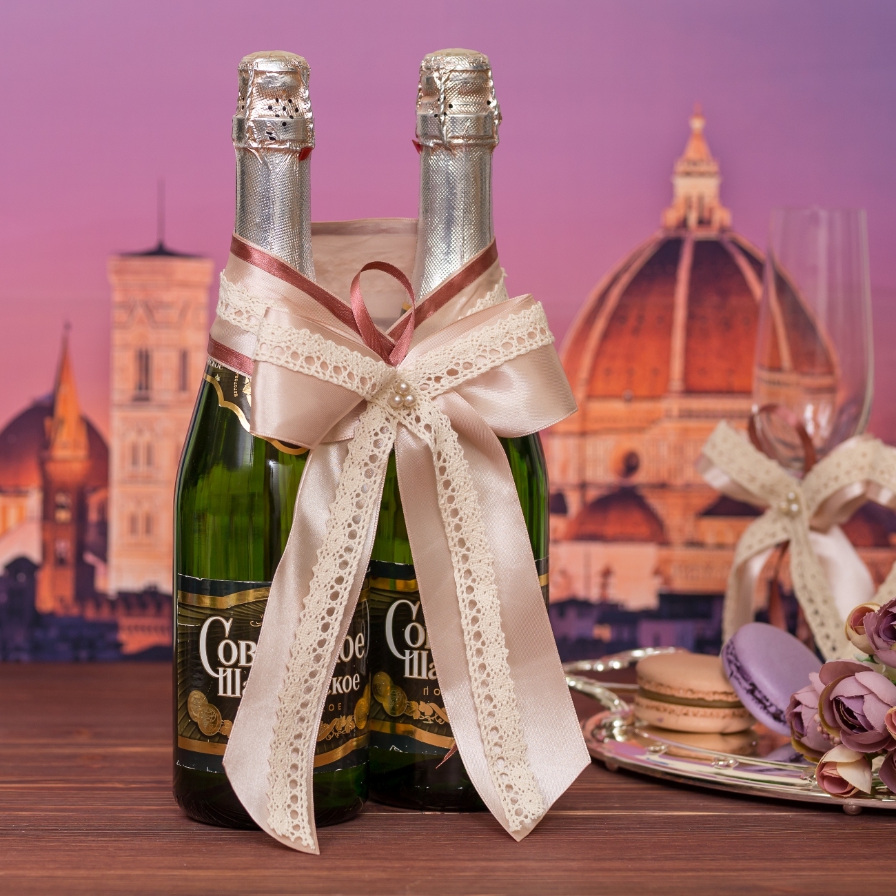 Украшение для свадебного шампанского "Бежевый декор" из атласной ленты кремового цвета, вязаного кружева и жемчужных бусин