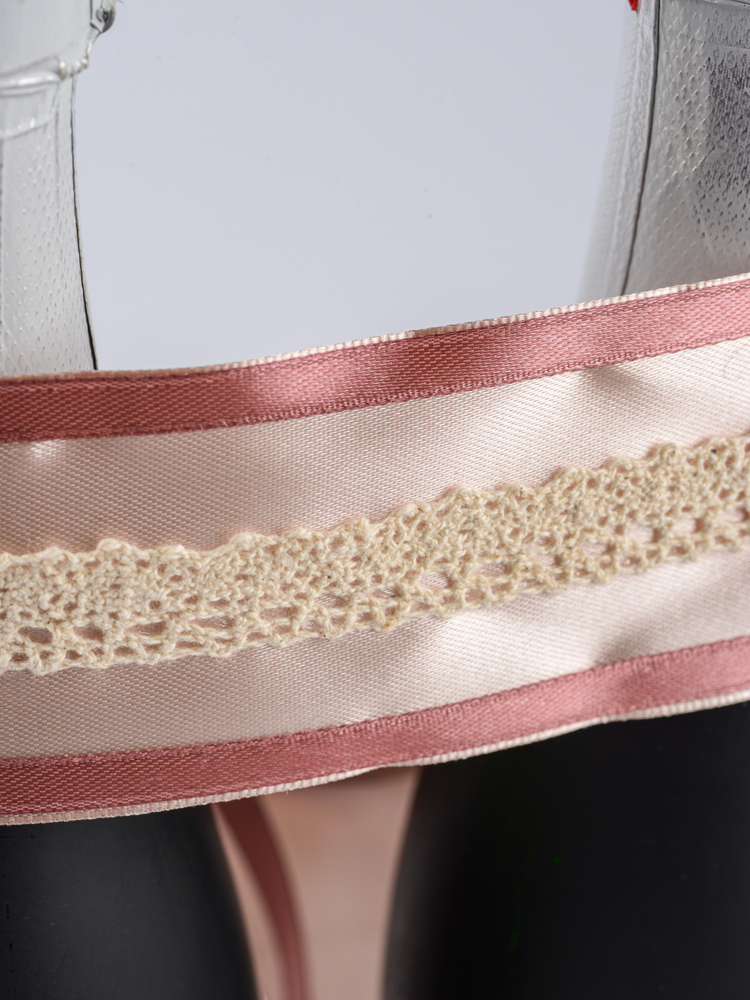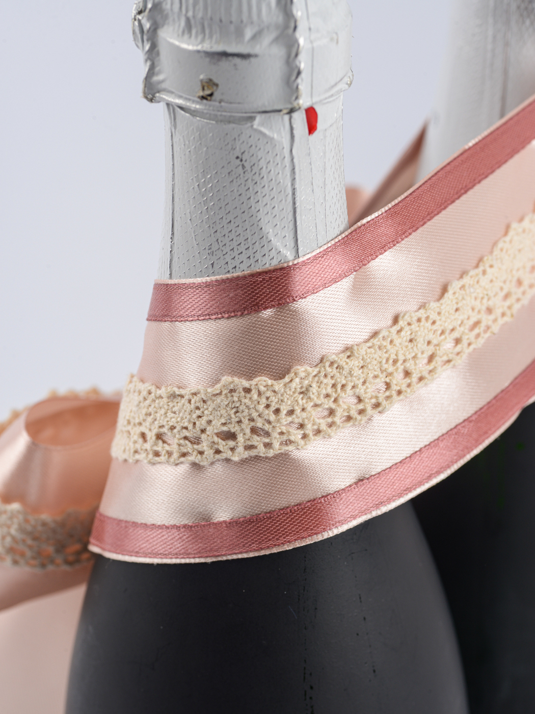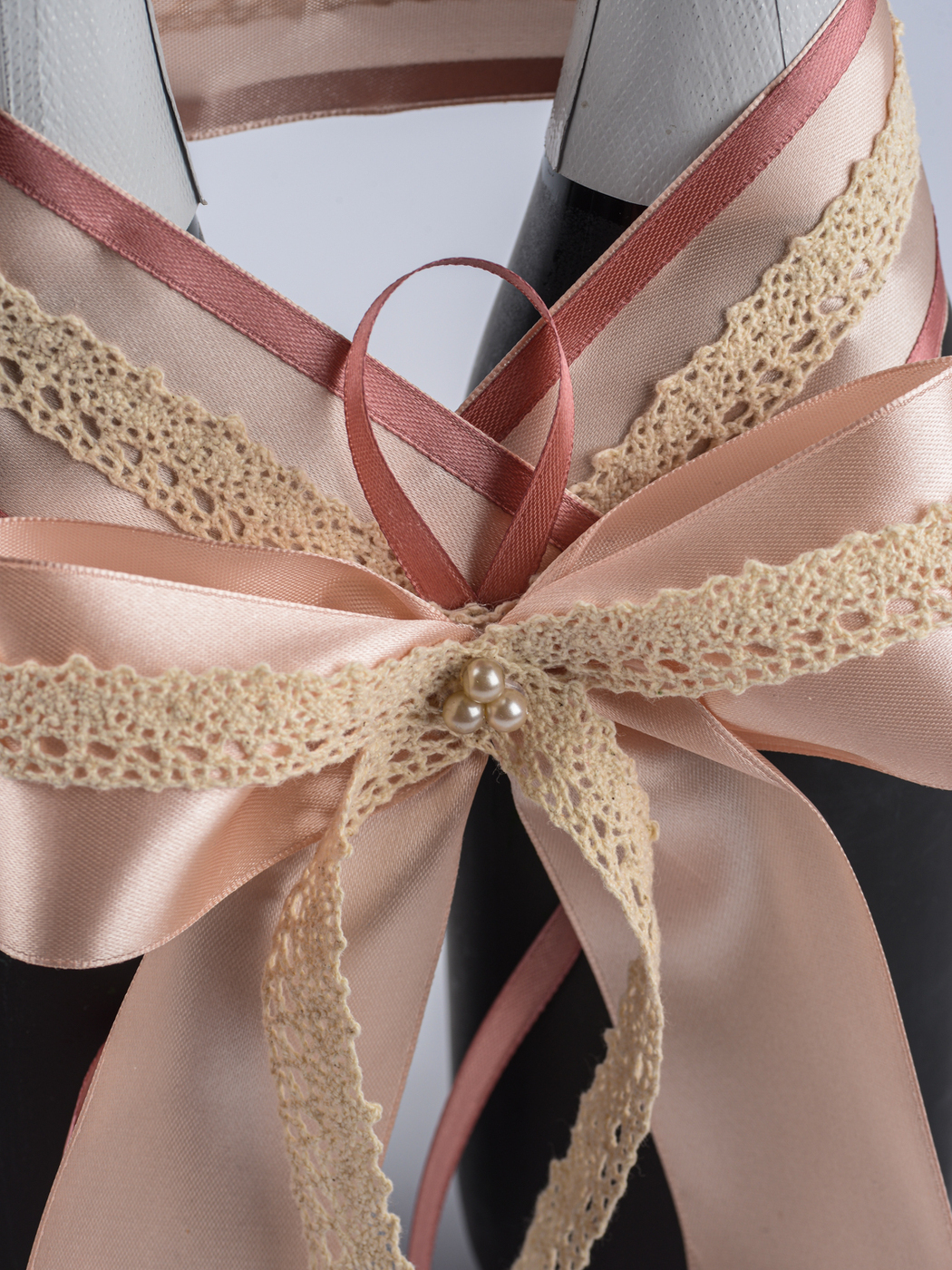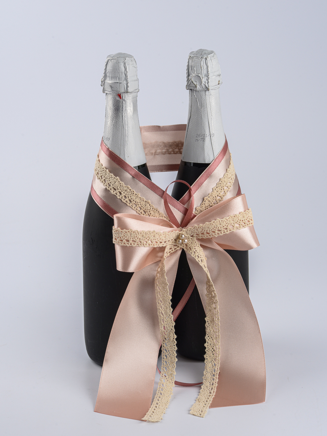 Украшение для свадебного шампанского "Бежевый декор" из атласной ленты кремового цвета, вязаного кружева и жемчужных бусин