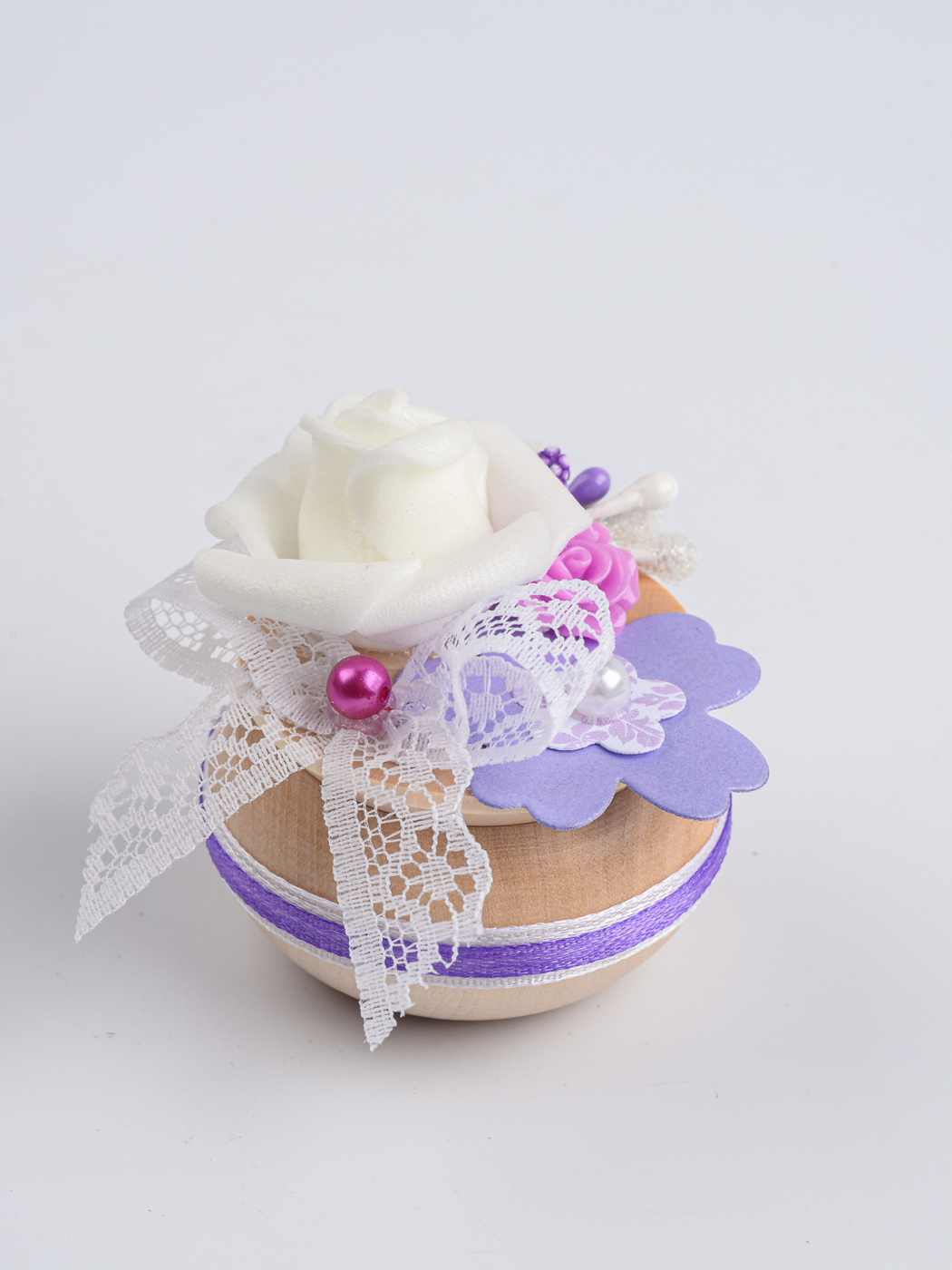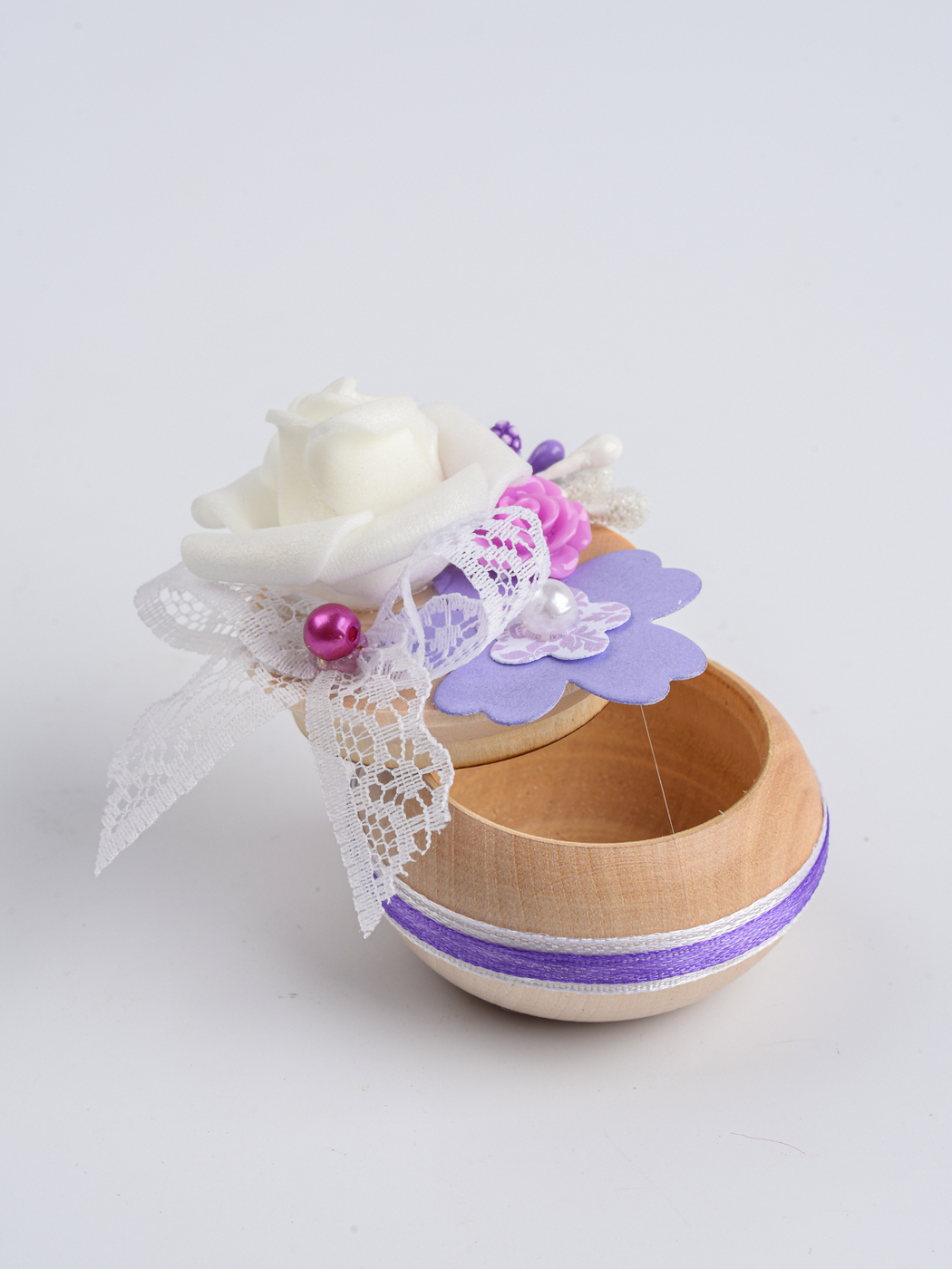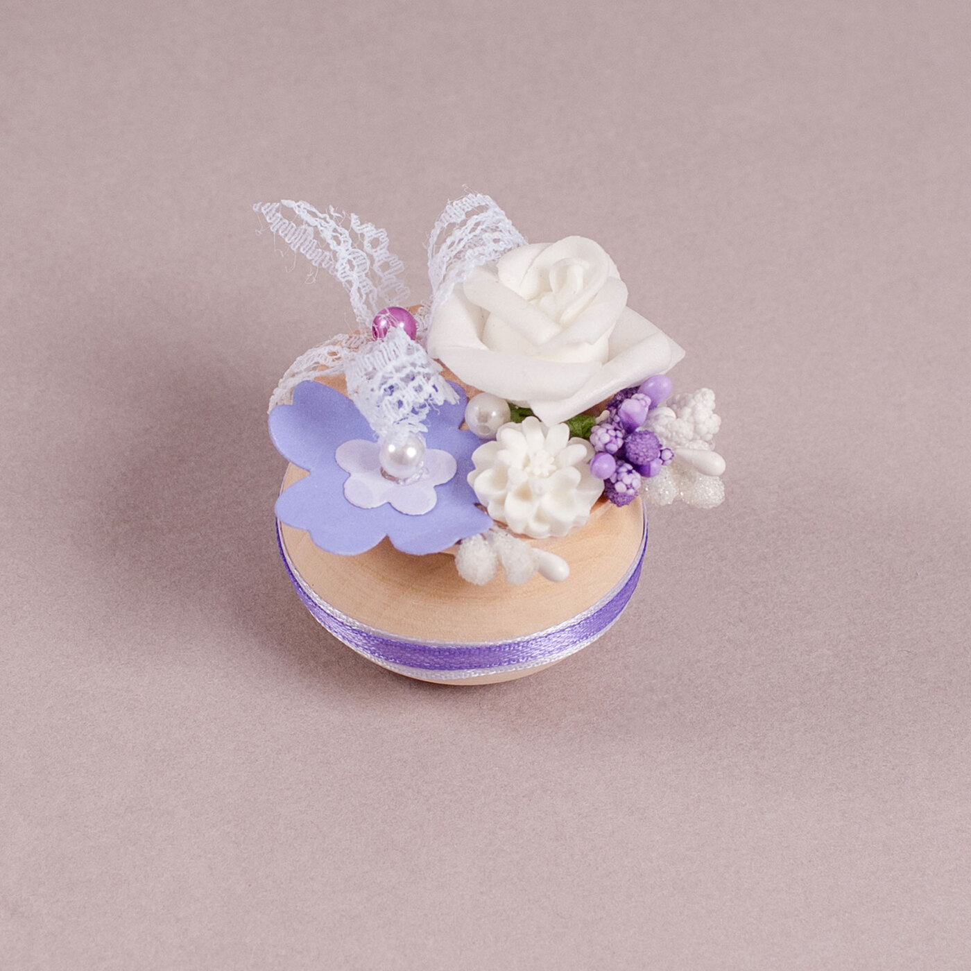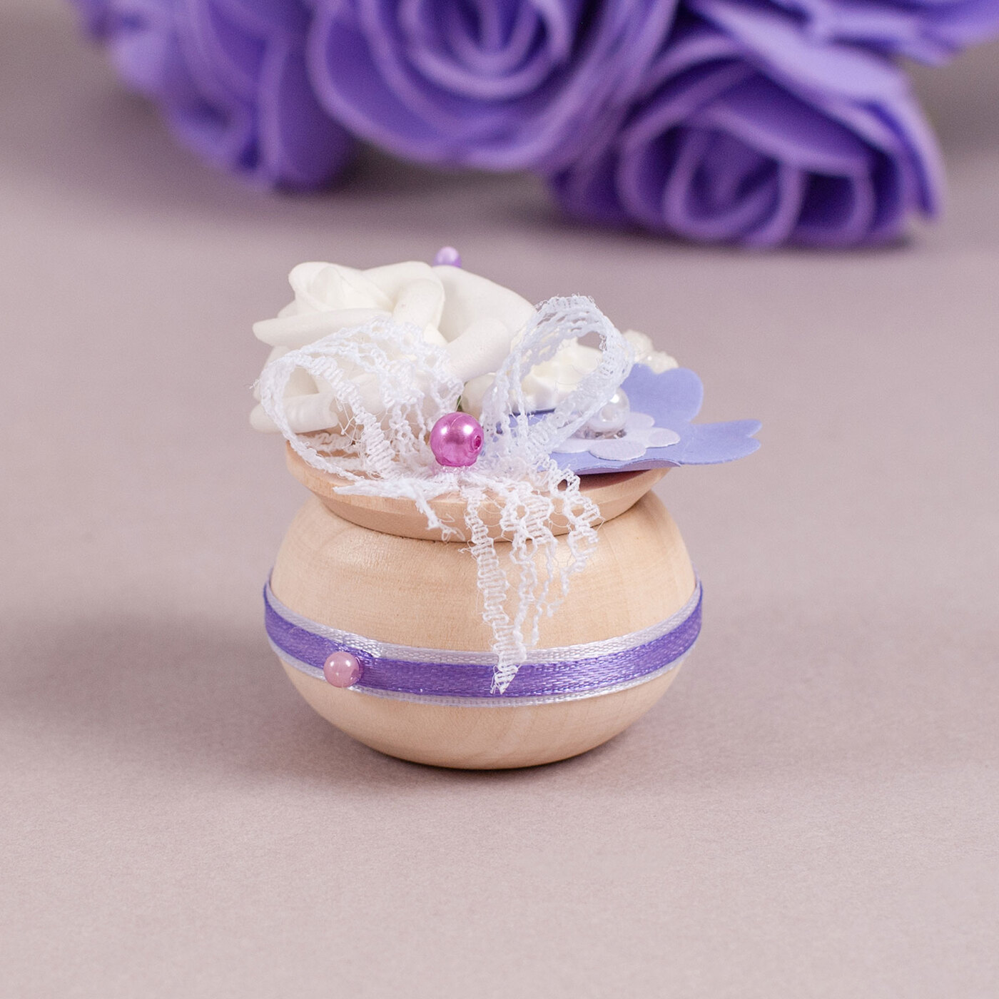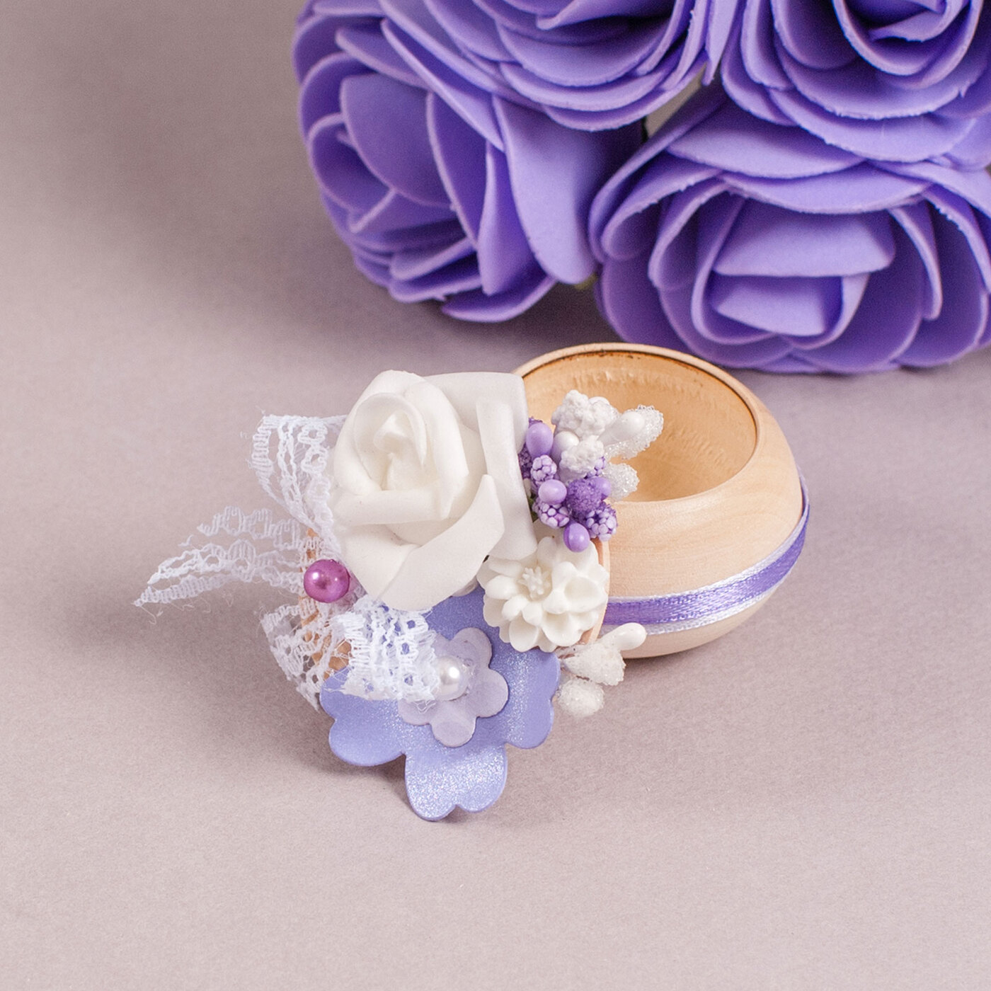 Маленькая свадебная солонка для встречи караваем "Сюита" из дерева с латексными розами, кружевом и атласным декором в белой и лиловой гамме
